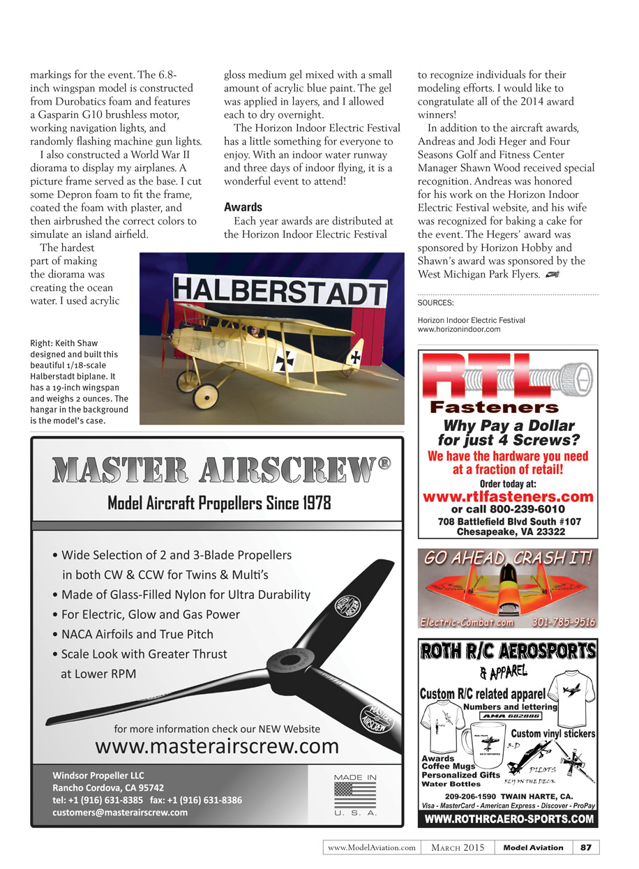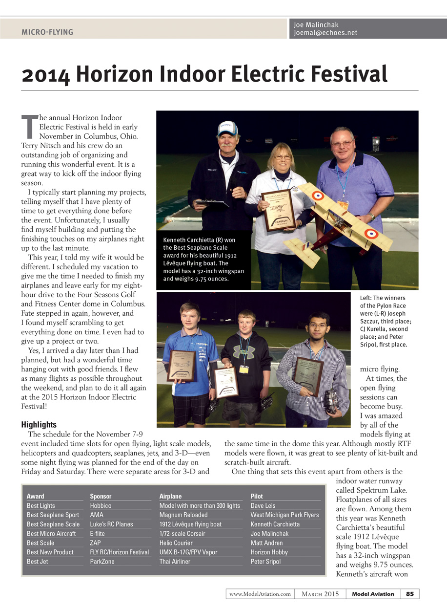 Each year awards are distributed at the Horizon Indoor Electric Festival to recognize individuals for their modeling efforts. I would like to congratulate all of the 2014 award winners!