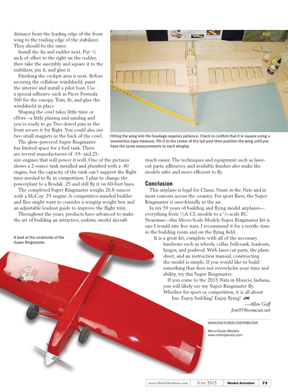 In my 59 years of building and flying model airplanes—everything from 1/2A CL models to a 1/3-scale RC Stearman—this Micro-Scale Models Super Ringmaster kit is one I would rate five stars. I recommend it for a terrific time in the building room and on the flying field.