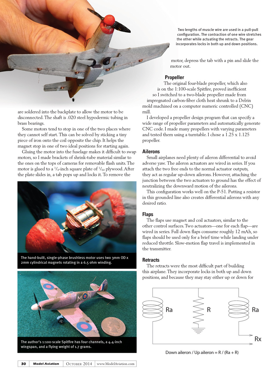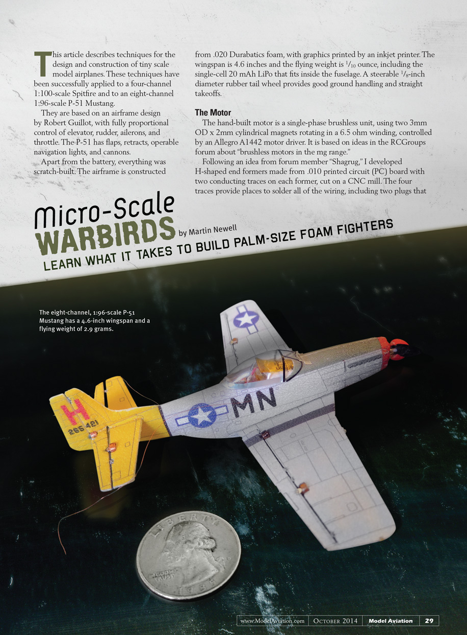 This article describes techniques for the design and construction of tiny scale model airplanes. These techniques have been successfully applied to a four-channel 1:100-scale Spitfire and to an eight-channel 1:96-scale P-51 Mustang.