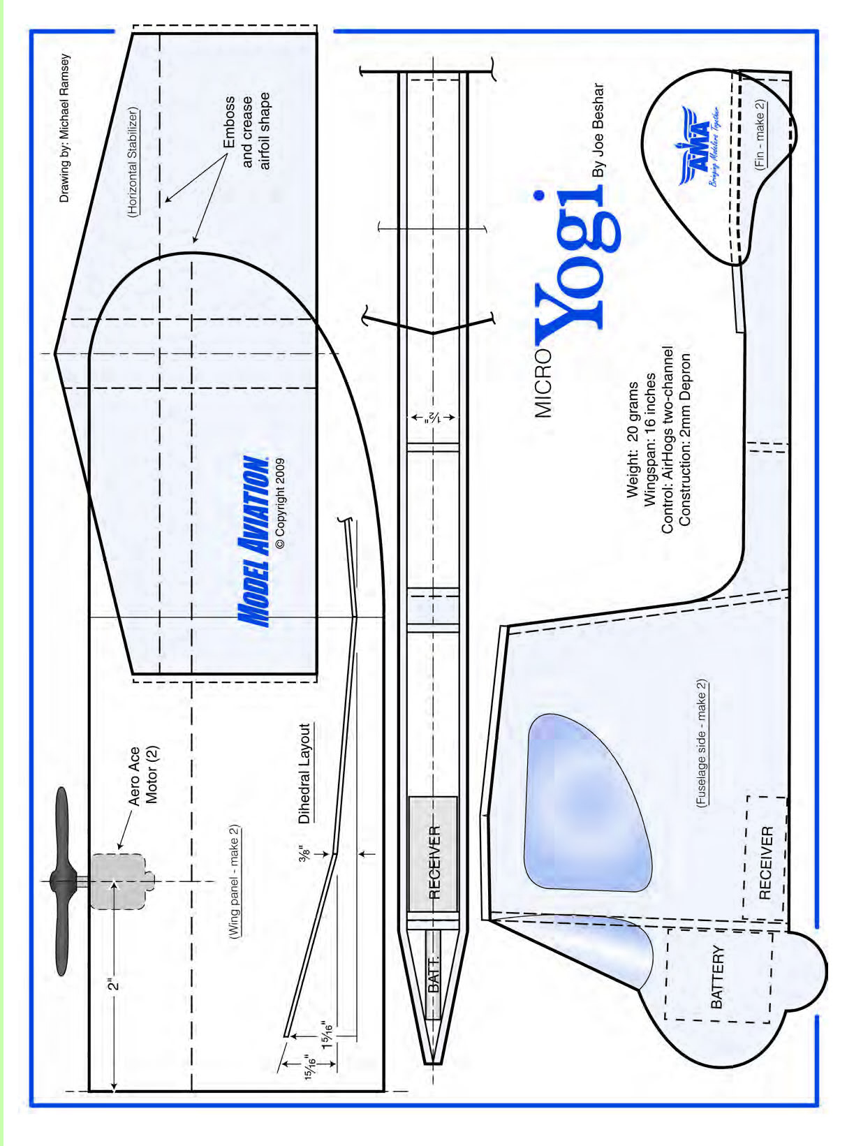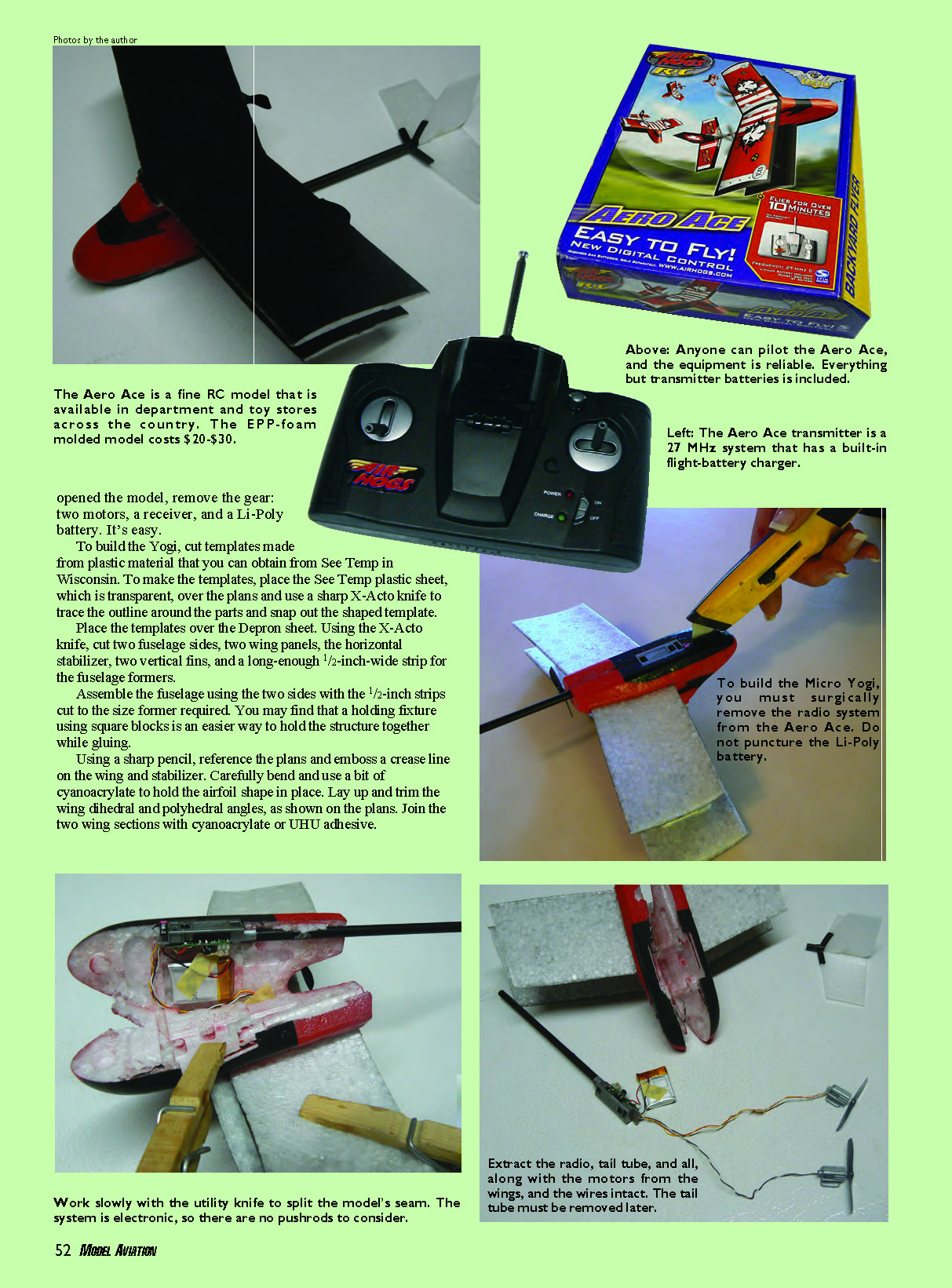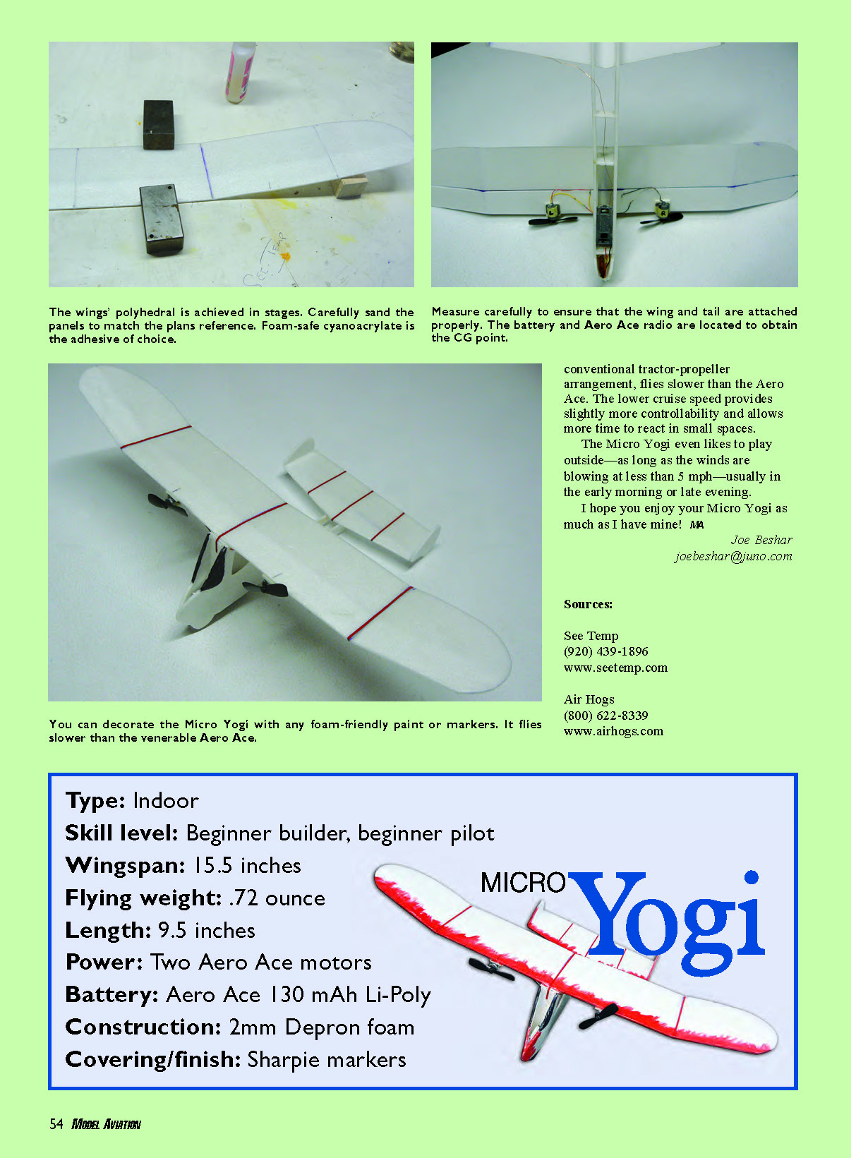 THANKS TO Air Hogs and the company’s toy-grade RC airplanes, many people of all ages have experienced basic flight. The models’ price point and availability are huge factors in allowing people to get a small taste of what RC has to offer. When you become proficient with these aircraft, you may find yourself looking for a new challenge and ways to build on the skills you have learned; you can do so with the Aero Ace from Air Hogs. It is formed completely from expanded foam and employs two cellular-type motors wired in a pusher configuration. The fuselage contains a receiver panel that has an on/off switch and a charging plug for the 130 mAh Li-Poly battery. The supplied cable from the transmitter is used connected to the charging plug to charge the onboard battery. The good news is that you can transform your Air Hogs Aero Ace biplane into a design I call the “Micro Yogi.” In the process, you will learn more about how the components work and experience the joy of building your own aircraft. As I mentioned, all the RC electronics for the Micro Yogi, including the transmitter, are from the Aero Ace biplane. It usually costs roughly $30 at Toys“R”Us, but I was lucky enough to get one on sale for $20 plus the cost of the six alkaline batteries for the transmitter/charger. Why the Yogi? It is a simple yet innovative model that Jerry Stoloff originally designed as an FF airplane in 1945. It proved to be both unique and successful. In 1994, the design was published again—that time as Loren Dietrich’s miniature FF version. Impressed with the cleanness of the mini version, I chose to adapt and build it for RC indoor flying. CONSTRUCTION You can purchase the materials used to construct the Micro Yogi at your local hobby shop or craft store. I used 2mm Depron sheet throughout the build. The adhesives are odorless cyanoacrylate and UHU Styrofoam craft glue. To start, cut the Aero Ace along the seam on its bottom. Once you have opened the model, remove the gear: two motors, a receiver, and a Li-Poly battery. It’s easy. To build the Yogi, cut templates made from plastic material that you can obtain from See Temp in Wisconsin. To make the templates, place the See Temp plastic sheet, which is transparent, over the plans and use a sharp X-Acto knife to trace the outline around the parts and snap out the shaped template. Place the templates over the Depron sheet. Using the X-Acto knife, cut two fuselage sides, two wing panels, the horizontal stabilizer, two vertical fins, and a long-enough 1/2-inch-wide strip for the fuselage formers. Assemble the fuselage using the two sides with the 1/2-inch strips cut to the size former required. You may find that a holding fixture using square blocks is an easier way to hold the structure together while gluing. Using a sharp pencil, reference the plans and emboss a crease line on the wing and stabilizer. Carefully bend and use a bit of cyanoacrylate to hold the airfoil shape in place. Lay up and trim the wing dihedral and polyhedral angles, as shown on the plans. Join the two wing sections with cyanoacrylate or UHU adhesive. Cautiously align the parts. When you are satisfied, glue the wing and tail sections in place. Now is a good time to add a little color to the Yogi. Using a felt-tipped pen, it is easy to customize the Yogi without adding weight. Sharpie-brand markers won’t melt Depron-type material. Check for compatibility on a scrap before marking on the model. Since the Aero Ace’s motors are installed in the pusher configuration and the Micro Yogi is a tractor, the motors’ rotating direction needs to be reversed and the propellers need to be turned around. Mark each motor left and right, as on the wing side of the Aero Ace. This is to identify the placement on the Yogi; the locations must remain the same for the radio to operate correctly. To change the motor rotation, use a soldering iron to carefully unsolder the plus and minus connection of each motor. Swap the leads and resolder for opposite polarity. Don’t forget to remove the propellers, which are a press fit. Use a pair of pliers to press the propellers back into place. Double-check the wiring and motor direction now; it will be more difficult later. Adhere each motor to its respective location on the wing. Install the battery and receiver with double-stick tape. Flying: The Air Hogs transmitter has two sticks. The one on the left controls motor speed for ascent and descent, and the one on the right is used for turning action by varying the relative motor speeds. To charge the battery, plug in the connector wire from the transmitter to the receiver port; watch for the blinking light to go out before disconnecting. Turn on the transmitter and the receiver, and do a quick check to make sure that the propellers are turning in the correct direction. Advance the throttle, launch the Micro Yogi gently, and away it goes. Trim for flight using the trim levers on the transmitter. Other adjustments can be made by twisting the control surfaces so that the model flies straight and level hands off. You will probably find that the Micro Yogi, with its combined light weight and conventional tractor-propeller arrangement, flies slower than the Aero Ace. The lower cruise speed provides slightly more controllability and allows more time to react in small spaces. The Micro Yogi even likes to play outside—as long as the winds are blowing at less than 5 mph—usually in the early morning or late evening. I hope you enjoy your Micro Yogi as much as I have mine! MA Joe Beshar joebeshar@juno.com Sources: See Temp (920) 439-1896 www.seetemp.com Air Hogs (800) 622-8339 You can decorate the Micro Yogi with any foam-friendly paint or markers. It flies www.airhogs.com Type: Indoor Skill level: Beginner builder, beginner pilot Wingspan: 15.5 inches Flying weight: .72 ounce Length: 9.5 inches Power: Two Aero Ace motors Battery: Aero Ace 130 mAh Li-Poly Construction: 2mm Depron foam Covering/finish: Sharpie ma
