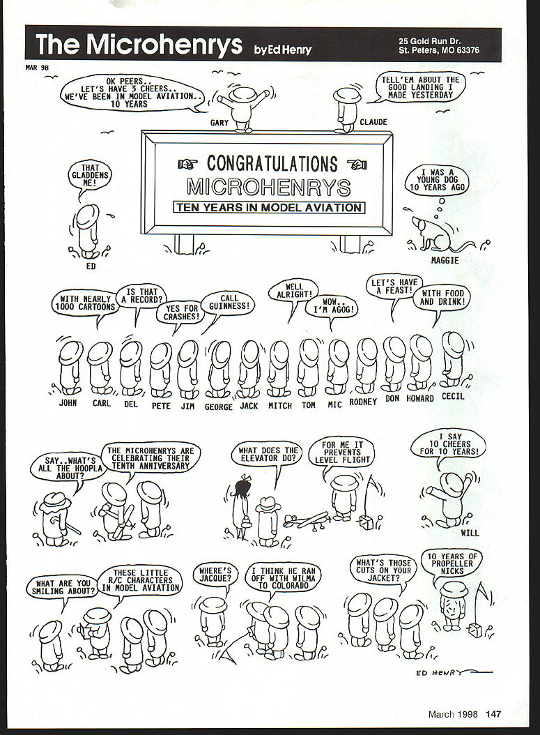 MAR 98 TELLEM ABOUT THE GOOD LANDING MADE YESTERDAY 11 CLAUDE OK PEERS. LETS HAVE 3 CHEERS. WEVE BEEN IN MODEL AVIATION. EARS GAR CONGRATULATIONS u oo r YEARS IN MODEL AVIATION 7 hi1 WAS YOUNG DOG 10 YEARS AGO 0 % 0 MAGGIE IS THAT WITH NEARLY RECORDCALL 1000 CARTOONSYES FOR GUINNESS CRASHES WELL ALRIGHT WOW. IM AGOG LETS HAVE FEAST WITH FOOD AND DRINK JOHN CARL DEL PETE JIM GEORGE JACK MITCH TOM NIC RODNEY DON HOWARD CECIL THE MICROHENRYS ARE SAY WHATS CELEBRATING THEIR ALL THE HOOPLATENTH ANNIVERSARY ABOUT THESE LITTLE WHAT ARE YOU R/C CHARACTERS SMILING ABOUT IN MODEL AVIATION WHAT DOES THE ELEVATOR DO WHERES THINK HE RAN ~JACOUE] OFF WITH WILMA TO COLORADO FOR ME IT PREVENTS LEVEL FLIGHT WHATS THOSE CUTS ON YOUR JACKET SAY 10 CHEERS FOR 10 YEARS FN5 WILL 10 YEARS OF PROPELLER NICKS C N E0 EWIY March 1998 147 THAT GLADDENS ME (2 o~$ct ED