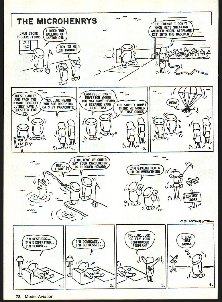 THE MICROHENRYS DRUG STORE PRESCRIPTIONS FY7 L7 INEEDTIO GALLONS OF CASTOR OIL TROUBLE hINKS DONT KNOW HES SNEAKING ANOThER MODEL AIRPLANE KIT INTO ThE BASEMENT o b z r I BELIEVE lEE COULD SAY YOUR CARBURETOR IS FLOODED HOWARD IM GIVING HER 10 ON EVERYTHING 1U2AN 0 NENq IM RESTLESS. IM DISPIRITED. IM GLOOMY. IM DOWNCAST. IM DEPRESSED. OK 0K GO FLY YOUR CONFOUNDED AIRPLANE 3 YUN C 4 78 Model Aviation ThESE LADIES ARE FROM ThE YES.JJE HEARD HUMANE SOCIETY YOU ARE DROPPING ThEY HAVE CATS BY PARACHUTE QUESTION FOR YOU
