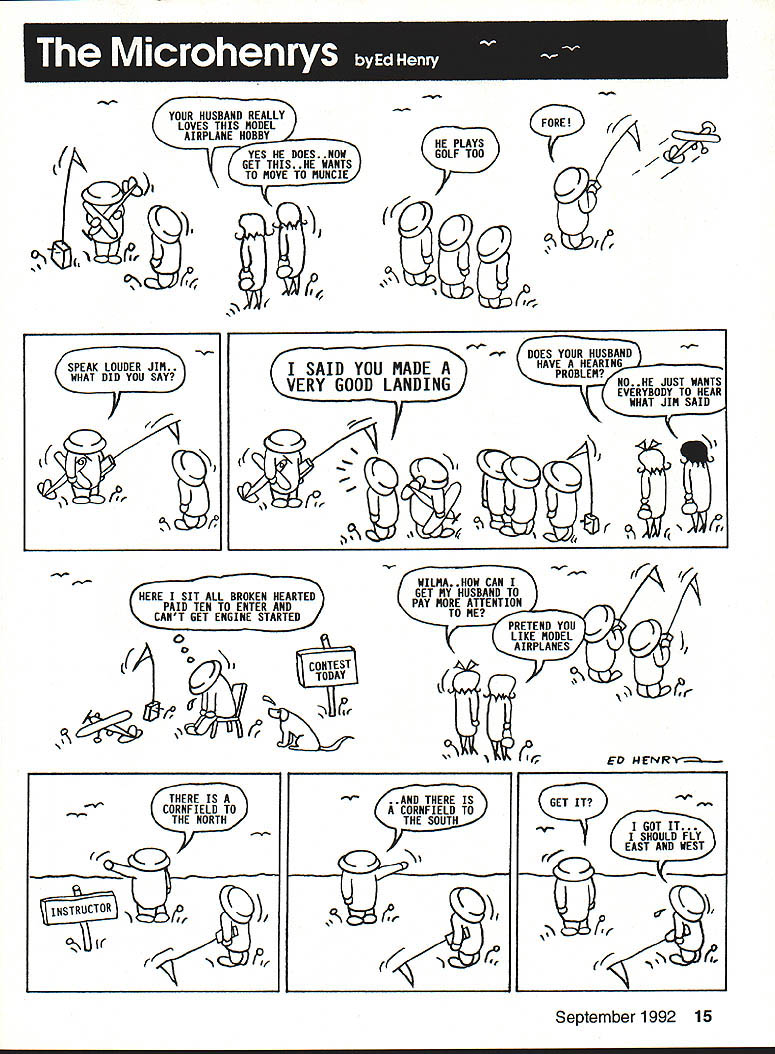 HE PLAYS GOLF TOO 7 SPEAK LOUDER JIM. WHAT DID YOU SAY 1/~ DOES YOUR HUSBAND SAID YOU MADE AHAVE HEARING PROBLEM NO. HE JUST WANTS VERY GOOD LANDINGEVERYBODY TO HEAR WHAT JIM SAID HERE SIT ALL BROKEN HEARTED PAID TEN TO ENTER AND CANT GET ENGINE STARTED otJ~ESTI WILMA. HOW CAN GET MY HUSBAND TO PAY MORE ATTENTION TO ME PRETEND YOU LIKE MODEL RPLANES 0 HENR.... THERE IS ____CORNFIELD TO THE NORTH v ucTORY AND THERE IS CORNFIELD TO THE SOUTH f GET IT GOT IT. SHOULD FLY EAST AND WEST September 1992 15