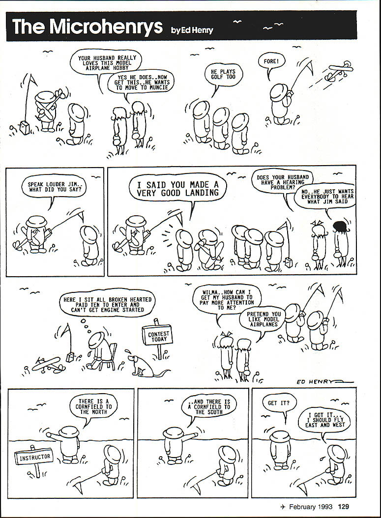 YOUR HUSBAND REALLY HE PLAYS GOLF TOO 6 SPEAK LOUDER JIM. WHAT DID YOU SAY 1 I SAID YOU MADE VERY GOOD LANDING DOES YOUR HUSBAND HEARING PROBLEM NO. HE JUST WANTS EVERYBODY TO HEAR WHAT JIM SAID -HERE SIT ALL BROKEN HEARTED PAID TEN TO ENTER AND CANT GET ENGINE STARTED EST 0 TODAY 0 HENR~ THERE IS ____CORNFIELD TO THE NORTH v 1% AND THERE IS CORNFIELD TO THE SOUTH N February 1993 129 K 7 GET IT GOT IT. SHOULD FLY EAST AND WEST A, K