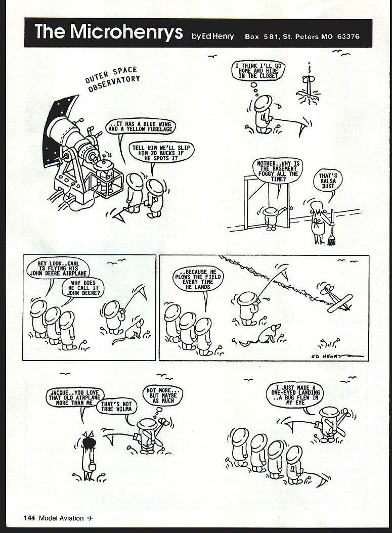 HAS BLUE WING AND YELLOW FUSELAGE AC E pr OR Y TELL HIM WELL SLIP HIM 20 BUCKS IF HE SPOTS IT 00 0 THINK ILL GO AND HIDE THE CLOSET 0 0 e MOTHER WHY IS THE BASEMENT FOGGY ALL THETHATS TIMEBALSA 17flF1DUST LIL HEY LOOK CARL FLYING HIS JOHN DEERE AIRPLANE DOES HE CALL IT DEERE 1 BECAUSE HE PLOWS THE FIELD EVERY TIME HE LANDS y *- V - OA LOVENOT MORE THAT OLD AIRPLANEBUT MAYBE MORE THAN ME THATS NOT AS MUCH TRUE WILMAp -9-. JUST MADE ONE-EYED LANDING BUG FLEW IN EYE 144 Model Aviation