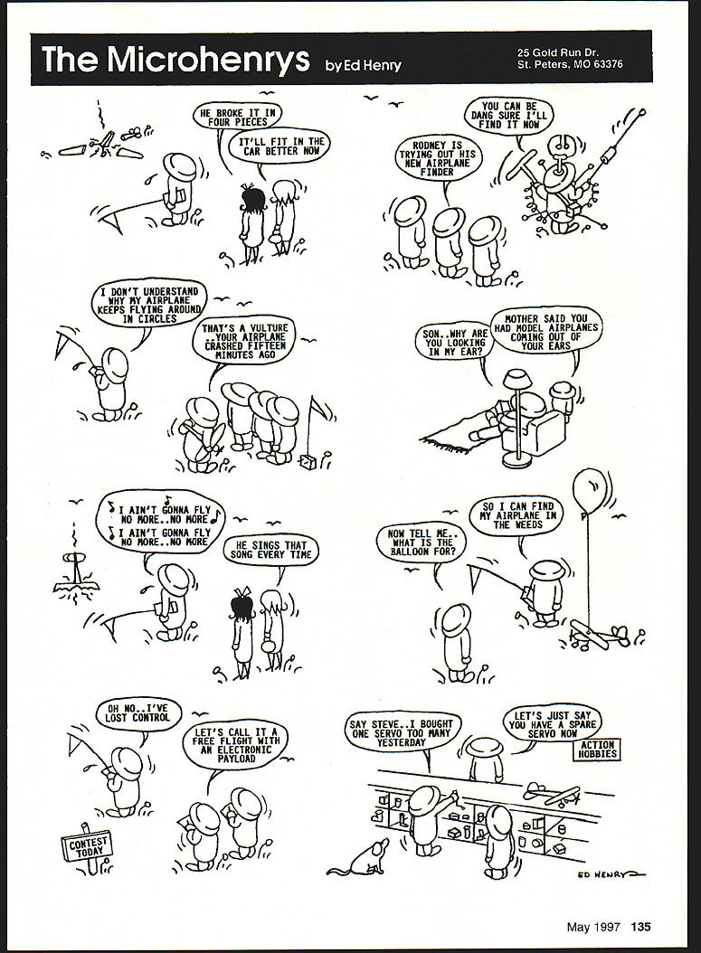 HE BROKE IT IN FIT IN THE NOW DONT UNDERSTAND WHY Y AIRPLANE KEEPS FLYING AROUN IN CIRCLES THATS VULTURE AIRPLANE HED FIFTEEN MINUTES AGO AINT GONNA FLY NO MORE.NO NOREt -I AINT GONNA FLY NO MORE NO MORE HE SINGS THAT SONG EVERY TIME OH NO IVE LOST CONTROL LETS CALL IT FREE FLIGHT WITH ELECTRONIC PAYLOADi YOU CAN BE DANG SURE ILL FIND IT NOW RODNEY IS1j TRYING OUT HIS/ NEW AIRPLANEI FINDER SO CAN FIND MY AIRPLANE IN THE WEEDS WHAT IS THE FOR 77 LETS JUST SAY SAY STEVE 1 BOUGHTYOU HAVE SPARE TOO MANYSERVO NOW 7YTACTIONI ~~1 WEu~ May1997 135 z