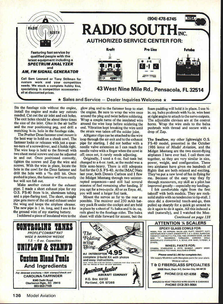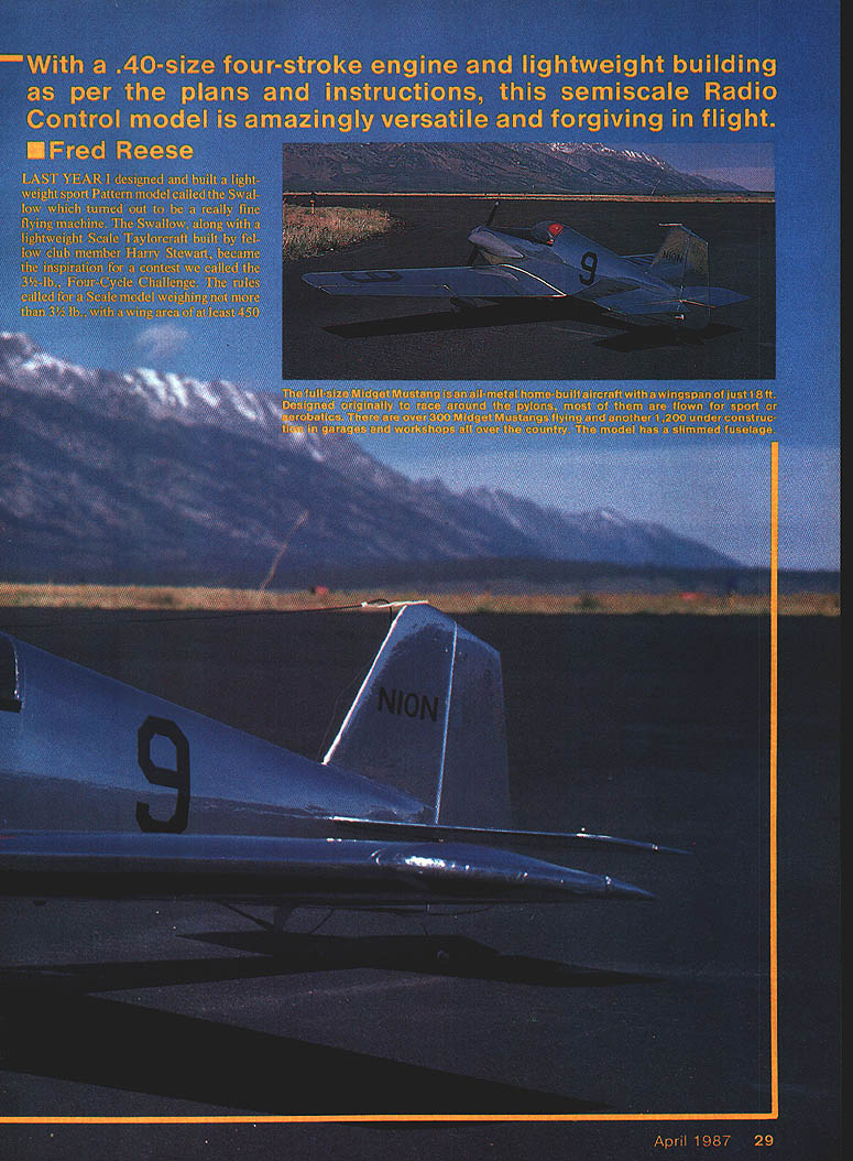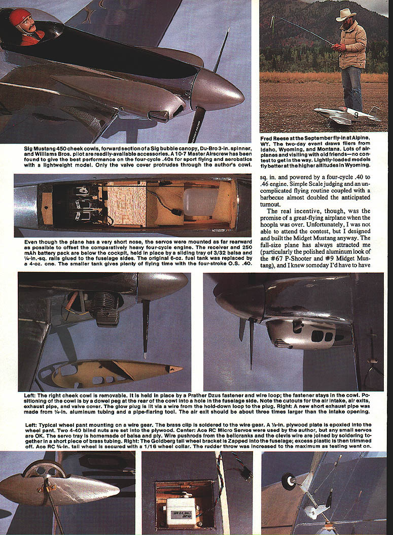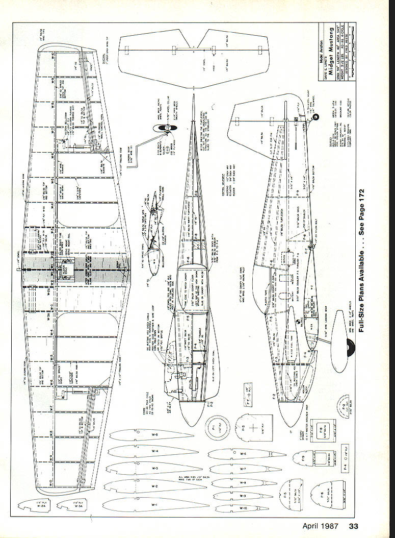 NO OCR TEXT NO OCR TEXT sq powered four-cycle 40 46 engine Simple Scale judging un complicated flying routine coupled barbecue almost doubled anticipated turnout real incentive though promise great-flying airplane hcopla over Unfortunately able attend contest designed built Midget Mustang anyway full-size plane has always attracted particularly polished aluminum lcok #67 P-Shcoter #9 Midget Mus tang knew someday Id have have Dzus fastener wire loop fastener stays cowl P0owl Isbyadowel p atthe rear cowl hole fuselage side Notethecutoutaforthesirintake airexits ..d valve cover glow plug lit via wire hold-down loop plug Right new short exhaust pipe made frc, -in aluminum tubing pipe-flaring tool air exit should about three times larger intake opening Left Typical wheel pant mounting wire gear brass clip soldered wire gear 1/a-ln plywood plate epoxied wheel pant Two 4-40 blind nuts set plywood Center Ace RC Micro Servos used author smali servos OK servo tray homemade baisa ply Wire pushrods belicranks clevis wire joined soldering gether short piece brass tubing Right Goldberg tail wheei bracket Zapped fuselage excess piastic trimmed off Ace RC -in tail wheel secured 1/16 wheel collar rudder throw Increased maximum testing went Sig Mustang 450 cheek cowls forward section Sig bubbie canopy Du-Bro 3-in spinner Williams Bros pilot readily-available accessories Al 0-7 MasterAlrscrew has found give best performance four-cycle 406 sport flying aerobatics lightweight model Only valve cover protrudes through authors cowl Fred Reese atthe Septemberfly-in atAlpine WY two-day event draws fliers Idaho Wyoming Montana Lots air planes visiting oid friendsno con test get way Lightly-loaded models fly betteratthe higheraititudes Wyoming vsn inougn ins piune nsa very anOrt nose servos mounieg Se iur reurwura possible offset comparatively heavy four-cycle engine receiver 250 mAh battery pack below cockpit held place sliding tray 3/32 balsa 1/4-ln-sq rails glued fuselage sides original 6-02 fuel tank replaced 4-oz smaller tank gives plenty flying time four-stroke 05 40 model original P-Shooter built 1948 David Long fellow pylon racer Luther Johnson plane raced then-new Goodyear class 1948 1949 National Air Races 1952 Schweitzer Aircraft Company decided produce Midget Mustang highperformance sport aircraft testing production prototype NiON modI z / 0 1J Lu At ~i Lu m/ Lu _/ jH /I / 0 ___Dv __0Lu _Sm-J / __U 00 -J m / Zm NN rori // m/ // /, 7/ / / / 7/ / 0 nz 0 0 -o z 0 0 o 00 -J b I0 z 00 0 0CD U C// JI / /1/ NI r/ N / / / 0 v CD \ \\ N \ Lu CD z 1 N S x S K 1U 0 0 CD 11 CD / C/ m -J m 0 S F X ZN / / j / 7 / / -A 0 elI chose engine quit pylon racing suffered great loss Davids para chute failed open Schweitzer abandoned plans sell Midget Mustang sold tooling parts Dr F Torrey eventually sold Robert Bushby Bushby Aircraft continues sell Midget Mustang plans parts kits full-scale airplane all-metal flush-riveted design has powered V \ \\\ - / /7 7 Lu CD 0 Lu CD z 5 Lu -J ci C S 0 C/ 0 CD foC/ 0 jLu CDCD CD z 1-0 U05 nz -J CD Lu N fi S C U U 0: Lu mW r 0Z X Lu -J 0 0-J 0 0 LI0 D Lu 1zoo Lu I~ April 1987 31 0 0 cnI jI cJO mm z C -J Lu Lu U SZ 4 Left As wing f 1st spar trailing edge can built flat workbench Balsa 1/s-in-sq strips notched wing ribs side aileron joint allow ailerons cut out breaking ribs Right Landing gear blocks glued before sheeting top wing Notch out bottom sheeting gear blocks using blocks rib notches guides vertical blocks short sections slotted gear blocks glued 1/16 plywood W2A Additional 1/16 balsa partial ribs glued place ahead behind vertical gear blocks shown W2B picture Study information before beginning engines 65 150 hp first 85-hp type popular over years trend has towards larger engines Stressed 9 Gs Mustang well suited aerobatics cruises 175 mph 135-hp engine Configurations have varied versions retracting landing gear tricycle land ing gears folding wings larger twoplace Mustang II also available home-built project approxi mately 300 Midget Mustangs flying another 1200 under construction ga rages workshops across country model almost quite quar ter scale wing exactly quarter scale fuselage little smaller closer fifth scale fuselage slimmed width height ize 3-in spinner instead 3-in Both Du-Bro CR make 3-in spinners object design produce Pattern-capable Scale model using either OS Enya four-cycle 40sengines very quiet obviously dont have power comparable size twocycle engine However bolted onto 3-lb airplane will deliver amazing performance course also Enya 46 its commanding 2000 rpm advantage could give model un limited vertical performance prefer model though its low noise mild manners 40 four-stroke Midget Mustang still happily flies IMAC Sportsman pattern does very pretty inside outside square loops figure eights. wing close symmetrical model requires just touch down elevator flying inverted large side area fuselage makes nice knife-edge flight very little aileron correction thing doesnt well snap rollsthe forgiving wing light wing loading wont allow quick-breaking stall necessary maneuver snap rolls can improved though sharpening leading edge wing out near tips pinned triangie stock stall strips leading edge helped balance point shown plan far forward should bebut can located far back spar rear location elevator bit sensitive snap rolls square corners im proved Another models strong suits its takeoffs takes just touch right rudder keep straight tail comes up stays main wheels until lift off will make realistic flat smcoth takeoffs can ripped off ground 10 ftwhatever suits flying style Landings take little getting used light wing loading keeps airplane flying very low speeds have start landing pattern farther out lower what seems right other models size Eventually will slow down make smoothest landings just cantrush season club has extended Four-Cycle Challenge allow greater diversity plane/engine configurations rules have further modified include manufactured kits well origi nal desi