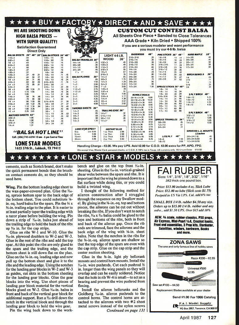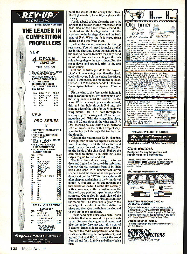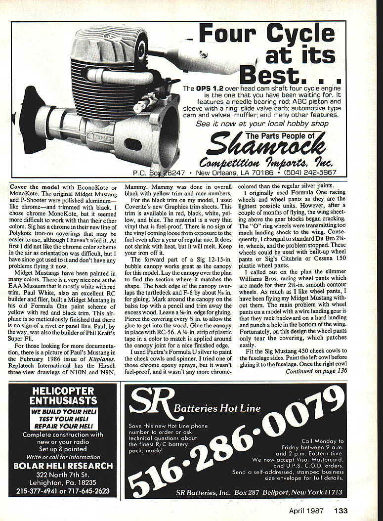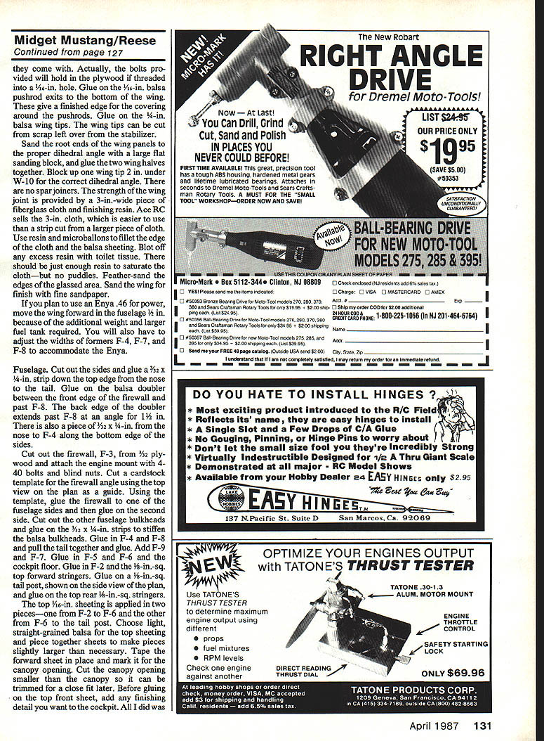 NO OCR TEXT NO OCR TEXT sq powered four-cycle 40 46 engine Simple Scale judging un complicated flying routine coupled barbecue almost doubled anticipated turnout real incentive though promise great-flying airplane hcopla over Unfortunately able attend contest designed built Midget Mustang anyway full-size plane has always attracted particularly polished aluminum lcok #67 P-Shcoter #9 Midget Mus tang knew someday Id have have Dzus fastener wire loop fastener stays cowl P0owl Isbyadowel p atthe rear cowl hole fuselage side Notethecutoutaforthesirintake airexits ..d valve cover glow plug lit via wire hold-down loop plug Right new short exhaust pipe made frc, -in aluminum tubing pipe-flaring tool air exit should about three times larger intake opening Left Typical wheel pant mounting wire gear brass clip soldered wire gear 1/a-ln plywood plate epoxied wheel pant Two 4-40 blind nuts set plywood Center Ace RC Micro Servos used author smali servos OK servo tray homemade baisa ply Wire pushrods belicranks clevis wire joined soldering gether short piece brass tubing Right Goldberg tail wheei bracket Zapped fuselage excess piastic trimmed off Ace RC -in tail wheel secured 1/16 wheel collar rudder throw Increased maximum testing went Sig Mustang 450 cheek cowls forward section Sig bubbie canopy Du-Bro 3-in spinner Williams Bros pilot readily-available accessories Al 0-7 MasterAlrscrew has found give best performance four-cycle 406 sport flying aerobatics lightweight model Only valve cover protrudes through authors cowl Fred Reese atthe Septemberfly-in atAlpine WY two-day event draws fliers Idaho Wyoming Montana Lots air planes visiting oid friendsno con test get way Lightly-loaded models fly betteratthe higheraititudes Wyoming vsn inougn ins piune nsa very anOrt nose servos mounieg Se iur reurwura possible offset comparatively heavy four-cycle engine receiver 250 mAh battery pack below cockpit held place sliding tray 3/32 balsa 1/4-ln-sq rails glued fuselage sides original 6-02 fuel tank replaced 4-oz smaller tank gives plenty flying time four-stroke 05 40 model original P-Shooter built 1948 David Long fellow pylon racer Luther Johnson plane raced then-new Goodyear class 1948 1949 National Air Races 1952 Schweitzer Aircraft Company decided produce Midget Mustang highperformance sport aircraft testing production prototype NiON modI z / 0 1J Lu At ~i Lu m/ Lu _/ jH /I / 0 ___Dv __0Lu _Sm-J / __U 00 -J m / Zm NN rori // m/ // /, 7/ / / / 7/ / 0 nz 0 0 -o z 0 0 o 00 -J b I0 z 00 0 0CD U C// JI / /1/ NI r/ N / / / 0 v CD \ \\ N \ Lu CD z 1 N S x S K 1U 0 0 CD 11 CD / C/ m -J m 0 S F X ZN / / j / 7 / / -A 0 elI chose engine quit pylon racing suffered great loss Davids para chute failed open Schweitzer abandoned plans sell Midget Mustang sold tooling parts Dr F Torrey eventually sold Robert Bushby Bushby Aircraft continues sell Midget Mustang plans parts kits full-scale airplane all-metal flush-riveted design has powered V \ \\\ - / /7 7 Lu CD 0 Lu CD z 5 Lu -J ci C S 0 C/ 0 CD foC/ 0 jLu CDCD CD z 1-0 U05 nz -J CD Lu N fi S C U U 0: Lu mW r 0Z X Lu -J 0 0-J 0 0 LI0 D Lu 1zoo Lu I~ April 1987 31 0 0 cnI jI cJO mm z C -J Lu Lu U SZ 4 Left As wing f 1st spar trailing edge can built flat workbench Balsa 1/s-in-sq strips notched wing ribs side aileron joint allow ailerons cut out breaking ribs Right Landing gear blocks glued before sheeting top wing Notch out bottom sheeting gear blocks using blocks rib notches guides vertical blocks short sections slotted gear blocks glued 1/16 plywood W2A Additional 1/16 balsa partial ribs glued place ahead behind vertical gear blocks shown W2B picture Study information before beginning engines 65 150 hp first 85-hp type popular over years trend has towards larger engines Stressed 9 Gs Mustang well suited aerobatics cruises 175 mph 135-hp engine Configurations have varied versions retracting landing gear tricycle land ing gears folding wings larger twoplace Mustang II also available home-built project approxi mately 300 Midget Mustangs flying another 1200 under construction ga rages workshops across country model almost quite quar ter scale wing exactly quarter scale fuselage little smaller closer fifth scale fuselage slimmed width height ize 3-in spinner instead 3-in Both Du-Bro CR make 3-in spinners object design produce Pattern-capable Scale model using either OS Enya four-cycle 40sengines very quiet obviously dont have power comparable size twocycle engine However bolted onto 3-lb airplane will deliver amazing performance course also Enya 46 its commanding 2000 rpm advantage could give model un limited vertical performance prefer model though its low noise mild manners 40 four-stroke Midget Mustang still happily flies IMAC Sportsman pattern does very pretty inside outside square loops figure eights. wing close symmetrical model requires just touch down elevator flying inverted large side area fuselage makes nice knife-edge flight very little aileron correction thing doesnt well snap rollsthe forgiving wing light wing loading wont allow quick-breaking stall necessary maneuver snap rolls can improved though sharpening leading edge wing out near tips pinned triangie stock stall strips leading edge helped balance point shown plan far forward should bebut can located far back spar rear location elevator bit sensitive snap rolls square corners im proved Another models strong suits its takeoffs takes just touch right rudder keep straight tail comes up stays main wheels until lift off will make realistic flat smcoth takeoffs can ripped off ground 10 ftwhatever suits flying style Landings take little getting used light wing loading keeps airplane flying very low speeds have start landing pattern farther out lower what seems right other models size Eventually will slow down make smoothest landings just cantrush season club has extended Four-Cycle Challenge allow greater diversity plane/engine configurations rules have further modified include manufactured kits well origi nal desi