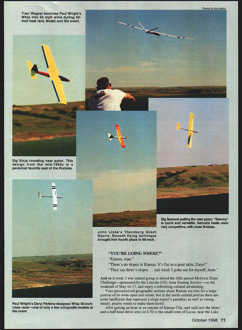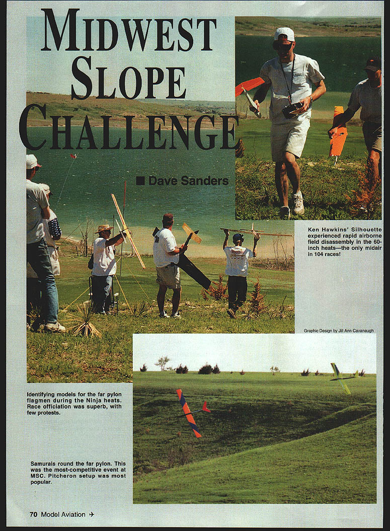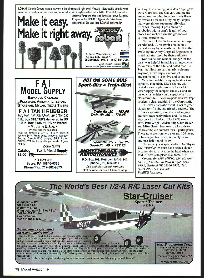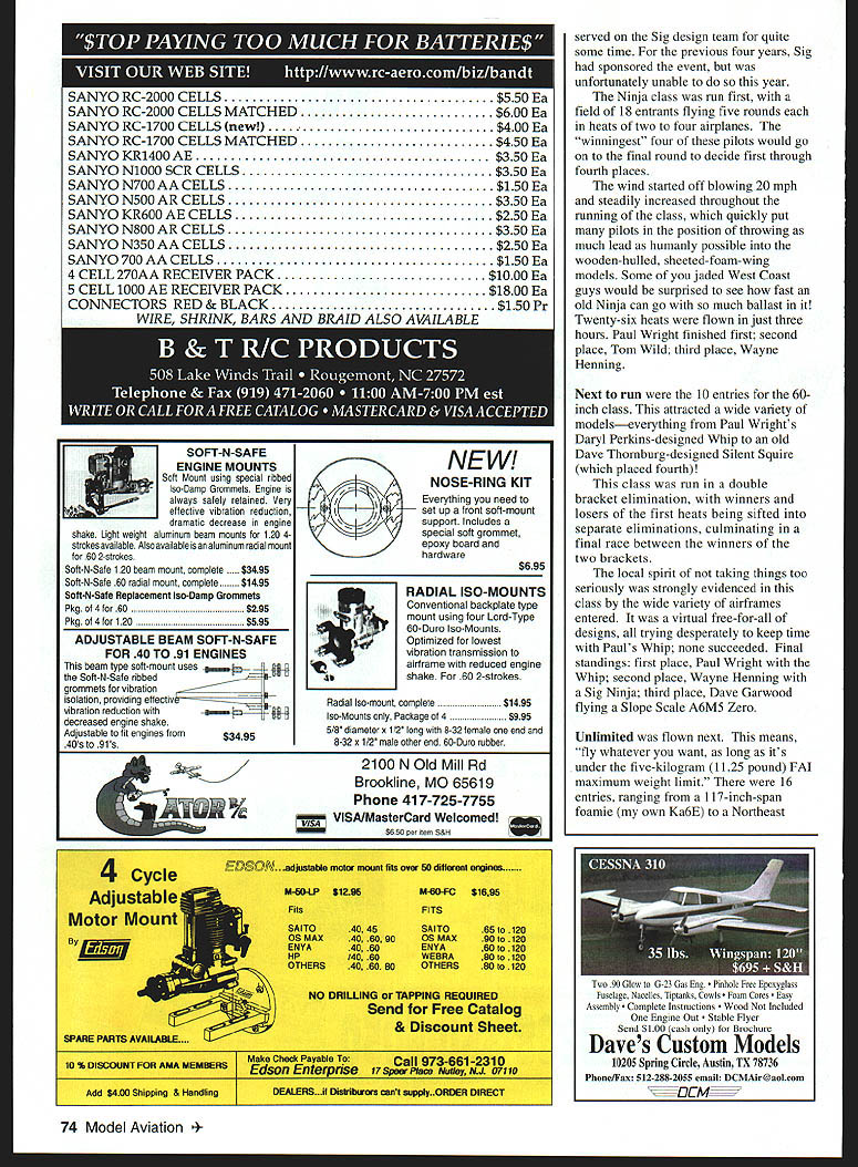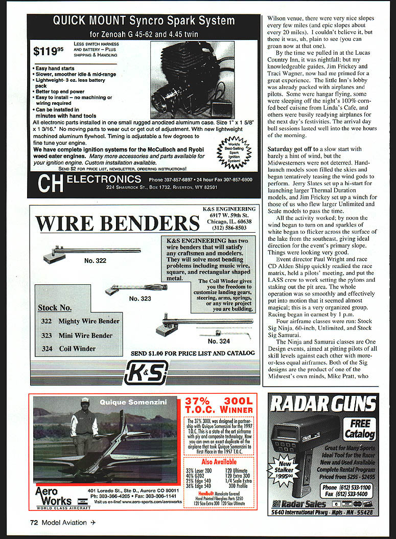 I Ken HA expel field inch ii 104 Graphic iAentlfylng medals tot mgmen during mce officiation u bw protests far NO OCR TEXT Easy hand starts Slower smoother idle & mid-range Ughtweight- 3 CL less battery pack Better top end power Easy Install achining wiring required Can Installed minutes hand tools electronic parts installed small ruggea anooizeu siuminum case ize x 1 5/8 x 1 3/16 No moving parts wear out get out adjustment new lightweight machined aluminum flywheel Timing adjustable few degrees fine tune engineWorkrs7 W have complete ignition systems MoCulloch Ryobi eHina weed eater engines accessories parts available ignitnn pnain Cfrm intnIIntinn nvnhlnhlA 72 Model Aviation on venue very nice slopes few miles epic slopes about 20 miles couldnt believe uh plain see can groan now time pulled Lucas Country Inn nightfall knowledgeable guides Jim Frickey Traci Wagner now primed great experience little Inns lobby already packed airplanes pilots Some hangar flying some sleeping off nights 100% cornfed beef cuisine Lindas Cafe others busily readying airplanes next days festivities arrival day bull sessions lasted well wee hours morning Saturday got off slow start barely hint wind Midwesterners deterred Handlaunch models soon filled skies began tentatively teasing wind gods perform Jerry Slates set up hi-start launching larger Thermal Duration models Jim Frickey set up winch us flew larger Unlimited Scale models pass time activity worked noon wind began turn sparkles white began flicker across surface lake southeast giving ideal direction events primary slope Things looking very good Event director Paul Wright race CD Alden Shipp quickly readied race matrix held pilots meeting put LASS crew work setting pylons staking out pit area whole operation smoothly effectively put motion seemed almost magical very organized group Racing began earnest 1 pm Four airframe classes run Stock Sig Ninja 60-inch Unlimited Stock Sig Samurai Ninja Samurai classes Design events aimed pitting pilots skill levels against other moreor-less equal airframes Both Sig designs product Midwests own minds Mike Pratt K&S ENGINEERING 6917 W 59th St Chicago IL 60638 WIRE BENDERS 312 586-8503 No 322 No 323 StoCli 322_ 323 No 324 324 Coil SEND $100 FOR PRICE LIST AND CATALOG 11 37% 300L TEOC WINNER 37% 300[ designed arlner ship Qaique Snmenzini lae 1991 TOC isa slate art airframe ply composite lechnology Now can own toad duplicate airplane Ihal took Quique Someozini First Place 1997 TOC Also Available 33%Laser 200120 Ullimate 40%G202120 Extra 300 25%Edge 5401/4 Scale Extra 36%Edge 540 300 Profile Handhailt Otanoknie Covarad Hand Painted Fihergiass Parts $350 120 Siza Extra 300 120 Siza Ililazia ero401 Lorado St Ste D Aurora CO 80011 Ph 303-366-4205 303-306-1141 oris Visit us on-line wwwaero-sportscom/aeroworks WUIILU ILRCS AIRCRAFT YU KL-2UUU CELLSha SANYO RC-2000 CELLS MATCHED$600 Ea SANYO RC-1700 CELLS new$400 Ea SANYO RC-1700 CELLS MATCHED$450 Ea SANYO KR1400 AE$350 Ea SANYO NIOOO SCR CELLS$350 Ea SANYO N700AACELLS$150 Ea SANYO N500 AR CELLS$350 Ea SANYO KR600 AE CELLS$250 Ea SANYO N800 AR CELLS$350 Ea SANYO N350 AA CELLS$250 Ea SANYO 700 AA CELLS$150 Ea 4 rrrj 2~\A RECEIVER PACK$1000 Ea S AE RECEIVER PACK$1800 Ea 2. BLAC$150 Pr SOFT-N-SAFE ENGINE MOUNTS Soft Mount using special ribbed Iso-Damp Grommets Engine always safely retained Very effective vibration reduction dramatic decrease engine shake Light weight aluminum beam mounts 120 4strokes available Also available aluminum radial mount 60 2-strokes Soft-N-Safe 120 beam mount complete 95 Soft-N-Safe 60 radial mount complete 495 Soft-N-Safe Replacement Iso-Damp Grommets Pkg 4 60$295 Pkg 4 120$595 ADJUSTABLE BEAM SOFT-N-SAFE FOR 40 TO 91 ENGINES beam type soft-mount sues Soft-N-Safe ribbed grommets vibration isolation providing effectiv vibration reduction decreased engine shake Adjustable fit engines 40s gi NEW NOSE-RING KIT Everything need set up front soft-mount support Includes special soft grommet epoxy board hardware ri LILW $695 RADIAL ISO-MOUNTS Conventional backplate type mount using four Lord-Type 60-Duro Iso-Mounts Optimized lowest vibration transmission airframe reduced engine shake 60 2-strokes Radial Iso-mount complete$1495 Iso-Mounts Package 4$995 5/8 diameters 1/2 long 8-32 female end 8-32 a 1/2 male other end 60-Duro rubber 2100 N Old Mill Rd Brookline MO 65619 Phone 417-725-7755 AR% VISA/MasterCard Welcomed super item 5&H W 4 Cycle EDSON.s jams d fits onr 60 SEared eofl AdjustableSitiS51696 Motor MountFITS SAITO40 46SAITO66 120 OSMAx40 -6090OSMAX9010120 ENYA40 60ENYA60 120 8y HP/40 60WEBRA80 120 OTHERS40 6080OThERS80 120 NO DRILLING lAPPING REQUIRED Send Free Catalog & Discount Sheet SPARE PARTS AVAILABLE.. -r 10% DISCOUNT FOR AMA MEMBERS j Make Check Payable Cail 973-661-2310 Enterprise 179w. PM. *aa tL onw DEALERS.H Otaterora canl aupg2ly.ORDER DIRECT served Sig design team quite some time previous four years Sig sponsored event unfortunately unable year Ninja class run first field 18 entrants flying five rounds heats two four airplanes winningest four pilots would go final round decide first through fourth places wind started off blowing 20 mph steadily increased throughout running class quickly put pilots position throwing much lead humanly possible wooden-hulled sheeted-foam-wing models Some jaded West Coast guys would surprised see fast old Ninja can go much ballast Twenty-six heats flown just three hours Paul Wright finished first second place Tom Wild third place Wayne Henning Next run 10 entries 60inch class attracted wide variety modelseverything Paul Wrights Daryl Perkins-designed Whip old Dave Thornburg-designed Silent Squire placed fourth class run double bracket elimination winners losers first heats being sifted separate eliminations culminating final race between winners two brackets local spirit taking things too seriously strongly evidenced class wide variety airframes entered virtual free-for-all designs trying desperately keep time Pauls