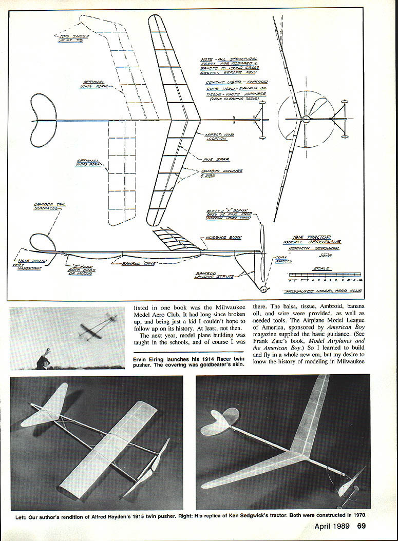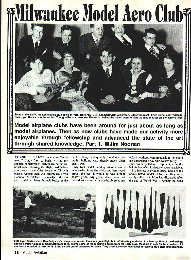 0 ilbiwaukee 31o dcl Aero Club Some MMAC members club social 1915 Back row L-R Ken Sedgwick Al Hayden Gilbert Counsell Ervin Eiring Ted Sedg wick Lynn Davies center Young ladies unknown Davies holding match used light fuse set off camera flash Model airplane clubs have around just about long model airplanes now clubs have made activity enjoyable through fellowship advanced state art through shared knowledge Part 1 EJim Noonan V AT AGE 10 IN 1927 became aero naut Lindy flew Paris visited adopted hometown Milwaukee na tional tour following flight before knew skies began fill planes Among Milwaukees own Hamilton Metalpiane Eventually discov ered model airplanes through books public library quickly found out model building already much older first model building attempt twin pusher kite sticks bent wood props best would poor power glide grandfather farmed oxen youth observed efforts comprehension could understand boy wanted fly De spite early failure kept using helpful often inadequate books available interest aviation grew Some books listed model clubs rarely still extant Most disbanded after end World War Among clubs Left Lynn Davies winds Ken Sedgwicks twin pusher model mode great flight unfortunately ended up treetop drawings shows tmctor model Sedgwlck 1915 RIght Some remaining props early days Most sets twin pushers period 1914 1916 carved out basswood belsa used advanced techniques achieve true pitch lightness 68 Model Aviation r~Li K4- K---_____ \ -i \ j- \--\ \ \ \ \\\\\ ALL p~rs C Zt AjUND CSS SC77CN p~re 45 Aer user — q15ID A47 /4MS Ls CLANN3 ns-A PPPLX W qr eA A1 C4N 9/gC7 AZ ~ ee7N ~kV/Ck rr 2~ 4 S * *-flt MILd A~IOeL listed book Milwaukee Model Aero Club long since broken up being just kid couldnt hope follow up its history least next year model plane building taught schools course Ervin Eiring launches 1914 Racer twin pusher covering goldbeaters skin balsa tissue Ambroid banana oil wire provided well needed tools Airplane Model League America sponsored American Boy magazine supplied basic guidance See Frank Zaics book Model Airplanes American Boy So learned build fly whole new era desire know history modeling Milwaukee Left authors rendition Alfred Haydens 1915 twin pusher Right replica Ken Sedgwicks tractor Both constructed 1970 April 1989 69 62 B4b1BO ~7L LL 3mc wii / / ________ Il 7PE 7 _________________ lI SPR/IC5 &4tSOo Q kV/N3 / c4/vs K/ X -vr P/Me L v/~S QZ /9/ 132 SC P4CA -197e never quite left search clubs history began Lynn Davies originaiiy built twin pusher like 1915 fine filer says author Milwaukee Public Museum some what disappointed though museum devoid reference aviation ex cept small display honoring Quentin RooseveltTeddy Roosevelts youngest Continued page 166 Lynn Davies 1916 twin push ers featured innovative bamboo Lynn kept improving modeis cans hold rubber place Canard 1916 reieases new lightweight version eievator covering goidbeaters skin 70 Model Aviation
