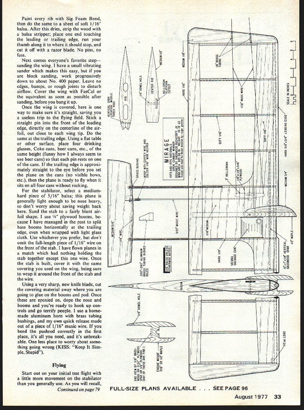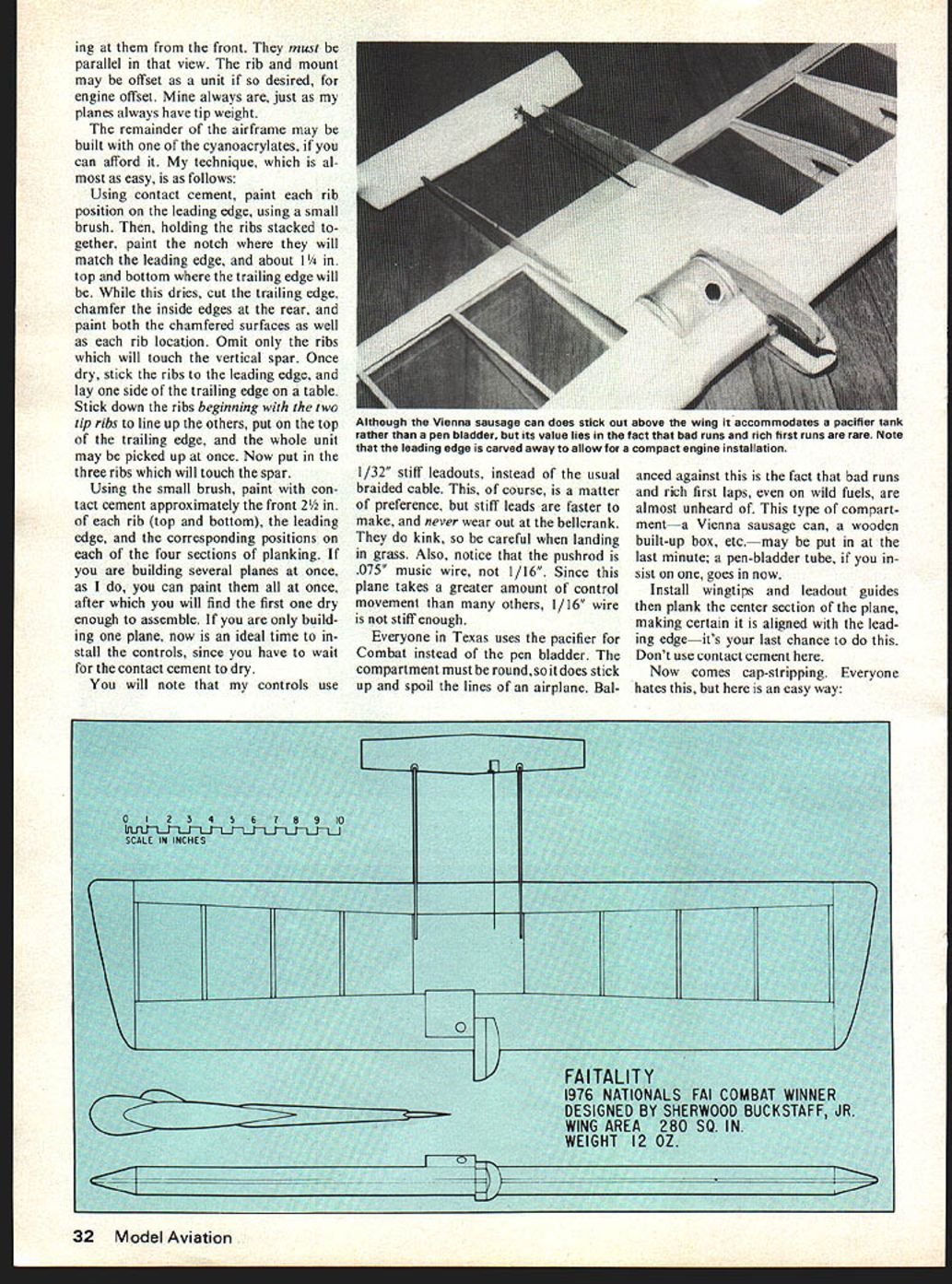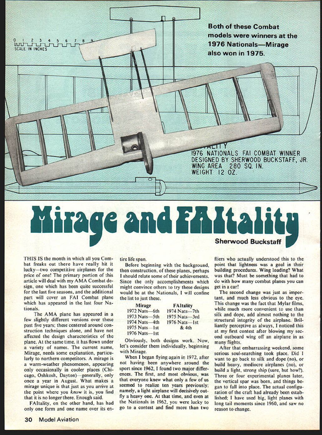 Sherwood Buckstaff THIS IS month Com bat freaks out have really hit luckytwo competitive airplanes price primary portion article will deal AMA Combat de sign has quite successful last five seasons additional part will cover FAT Combat plane has appeared last four Na tionals AMA plane has appeared few slightly different versions over past five years centered around con struction techniques alone have affected design characteristics plane same time has flown under variety names current name Mirage needs some explanation particu larly northern competitors mirage warm-weather phenomenon appearing occasionally cooler places Chi cago Oshkosh Daytongenerally once year August What makes mirage unique just arrive point know find no longer Enough said FAltality other hand has form name over its entire life span Before beginning background construction planes perhaps should relate some achievements Since accomplishments might convince others try designs would Nationals will confine list just Mirage 1972 Nats6th 1973 Nats5th 1974 Nats4th 1975 Natslst 1976 NatsIst FAltality 1974 Nats7th 1975 Nats3rd 1976 Natslst & 4th Obviously both designs work Now lets consider individually beginning Mirage began flying again 1972 after having anywhere around sport since 1962 found two major differ ences first obvious everyone knew what few us seemed realize ten years previously namely light airplane will decisively outfly heavy time Nationals 1962 lucky go contest find two fliers actually understood point lightness goal building procedures Wing loading What Must something combat planes can get car second change just impor tant much less obvious eye change fact Mylar films much convenient use silk dope add almost nothing structural integrity airplane Bril liantly perceptive always noticed first contest after blowing sec ond outboard wing off airplane flights After embarrassing weekend some serious soul-searching took place Did want go back silk dope no build heavy mediocre airplanes no build light strong ship sure Three four experimental planes later vertical spar born things gan fall place actual configu ration craft already estab lished have used big light planes long tail moments since 1960 saw no reason change 30 Model Aviation 16 first planes made its appearance 1972 Nationals general comment other omigod theyre light best expressed ard Rush excellent designer others wanted know plane does have currently popular much efficient high aspect ratio answer now follows have very strong motor plane perfectly built never bend airplane dirt high aspect ratio superior Lots ifs However occasionally build plane little crooked bend its quite right anymore still flyable have average motor real honker f fly hurricanes Dallas windier Chicago note wing-tip weight slip knee muddy circle primarily con cerned just staying air few seconds nice plane flying big light plane pull handle reacts also though has medium-lift airfoil combines low aspect ratio create easily flown stable forgiving aircraft plane reacts well large control move ment needed tight maneuvering because brilliant design concept because reasonably thought-out plane will same 18 oz 385 square inches Construction key ehtire construction plane vertical spar will note no full-span spars reason obvious plane breaks al invariably does near center slightly outboard center begin epoxy center rib dium-hard a vertical 1/8 bass wood spar motor mount unit prefer conventional builtup mount using maple mounts balsa may substituted run horizontal-grain center rib back spar fill verti cal-grain balsa front Either accepta ble Now cut slot bellcrank base insert epoxy rib Five-minute epoxy sufficient cause next step Drill hole insert /8 dowel running way through maple mount top bottom center rib hellcrank base used built-up mounts use another dowel near front Motor mount holes may drilled before thing else done may left until entire plane built covered ready motor mount pod stalled choose to aid balancing plane 12-in long drill bit comes very handy Glue /8 X /8 leading edge motor mount imperative leading edge spar lined up lookAugust1977 31 Two-time Nats winner Sherwood a Liking lots 0 line tension uses tip weight offset thrust asymmetrical panels ship performs just well equal panels Above Key structural design 5-part assembly Because breaks occur close center designer does use full-span spars Instead employs vertical basswood spar Below Diamond leading edge fits mount notch spar locked place thick center rib inserted mount belicrank base glues slot cut through center rib ing front must parallel view rib mount may offset unit desired engine offset Mine always just planes always have tip weight remainder airframe may built cyanoacrylates can afford technique al easy follows Using contact cement paint rib position leading edge using small brush holding ribs stacked gether paint notch will match leading edge about 1 bottom trailing edge will dries cut trailing edge chamfer inside edges rear paint both chamfered surfaces well rib location Omit ribs will touch vertical spar Once dry stick ribs leading edge lay side trailing edge table Stick down ribs beginning two tip ribs line up others put top trailing edge whole unit may picked up once Now put three ribs will touch spar Using small brush paint con tact cement approximately front 2 rib top bottom leading edge corresponding positions four sections planking building several planes once can paint once after will find first dry enough assemble build ing plane now ideal time stall controls since have wait contact cement dry will note controls use 1/32 stiff leadouts instead usual braided cable course matter preference stiff leads faster make never wear out bellcrank kink careful landing grass Also notice pushrod 075 music wire 1/16 Since plane takes greater amount control movement others 1/16 wire stiff enough Everyone Texas uses pacifier Combat instead pen bladder compartment must round does stick up spoil lines airplane Bal anced against f