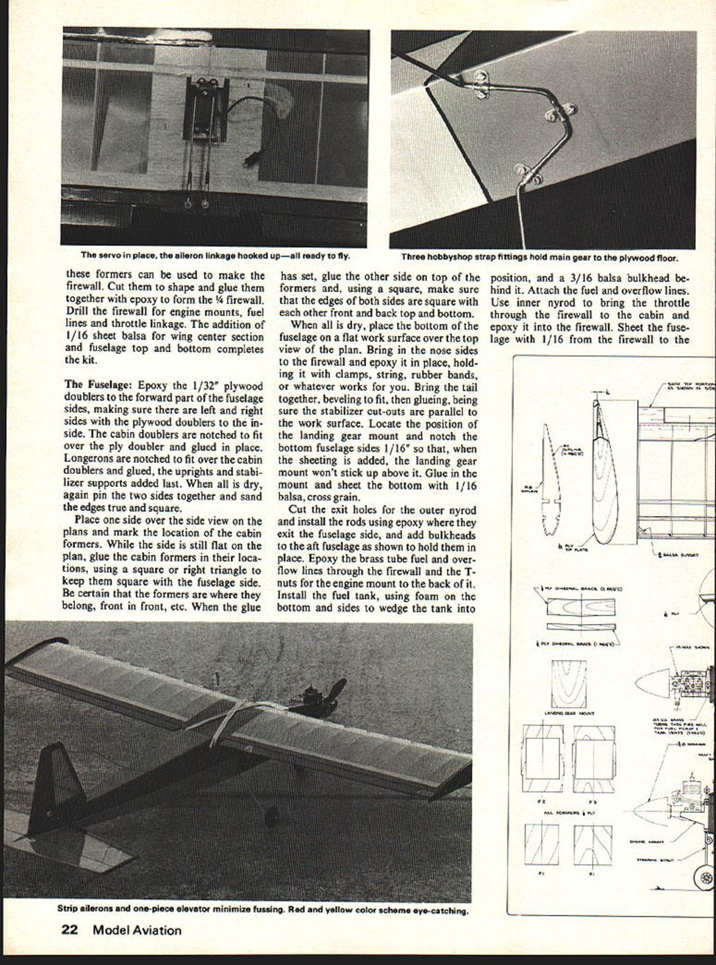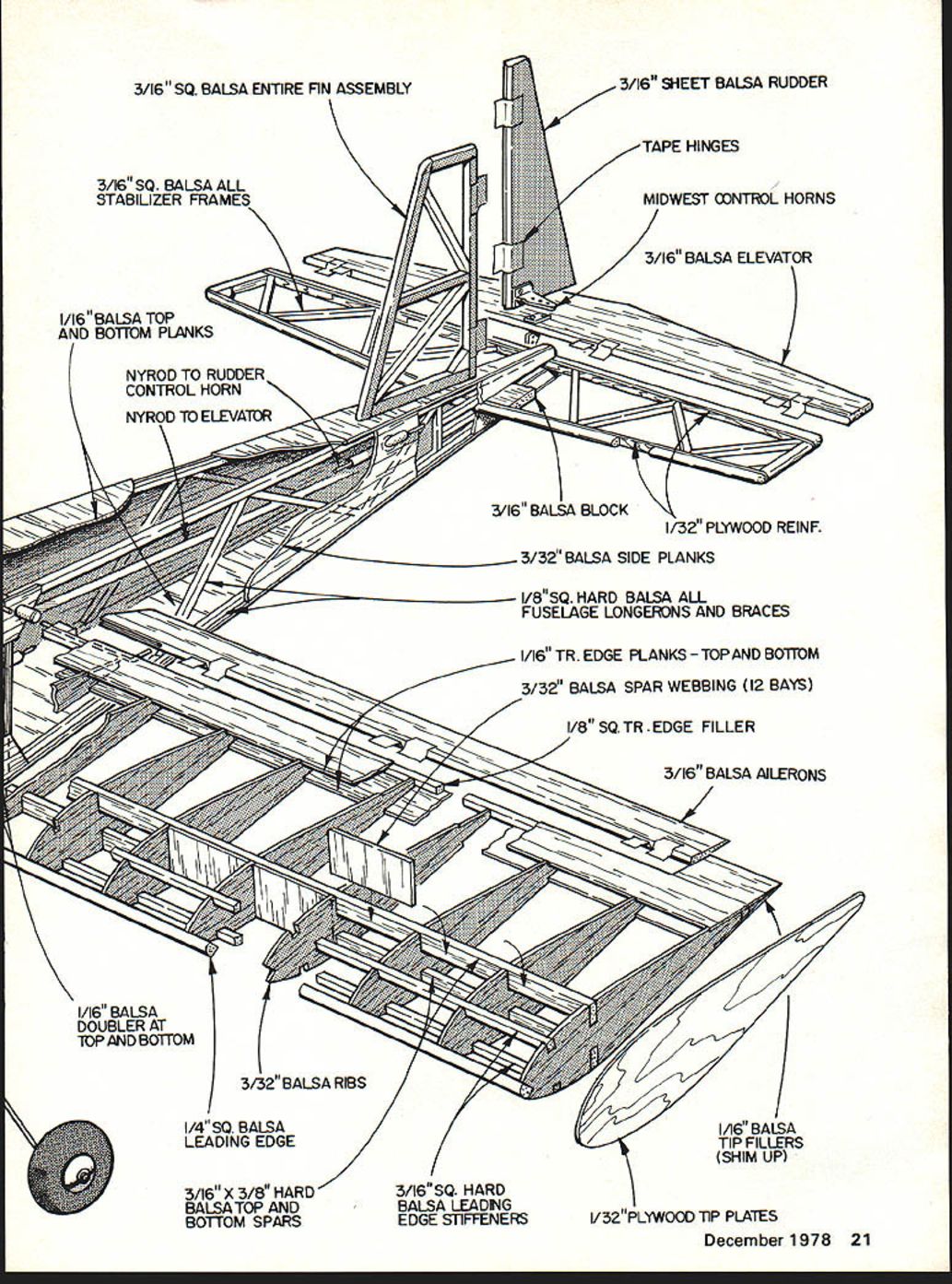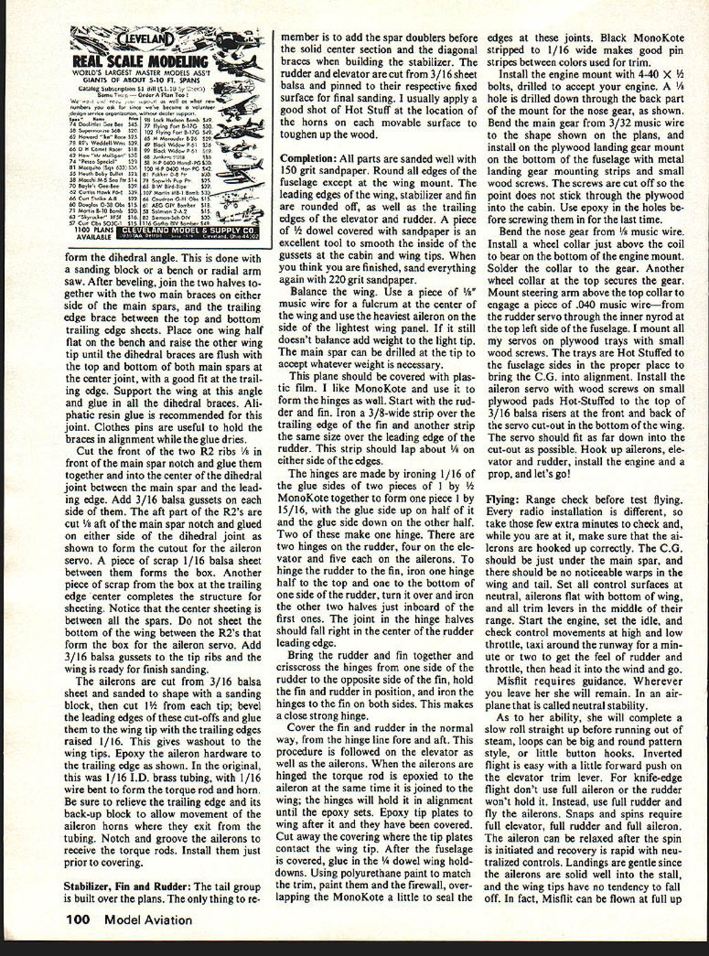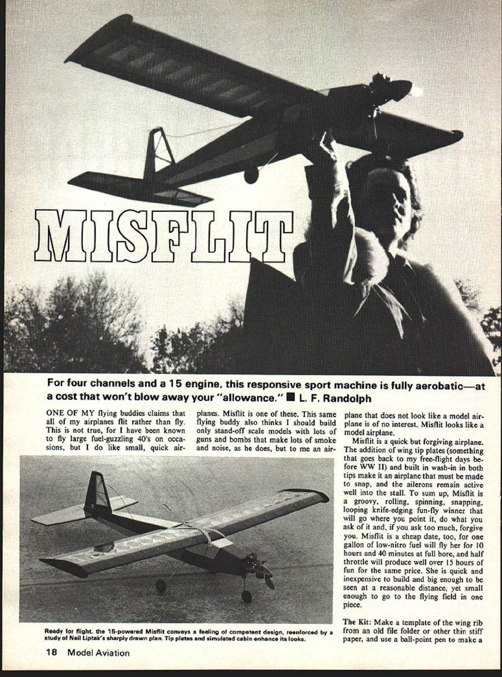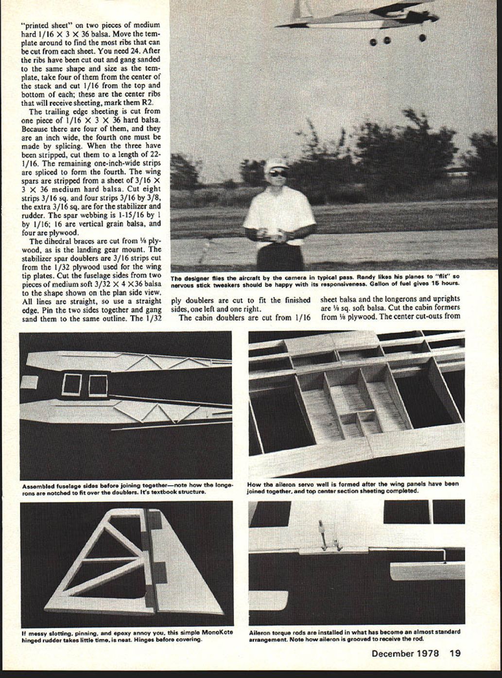 For four channels 15 engine responsive sport machine fully aerobaticat cost wont blow away allowance U 1 F Randolph ONE OF MY flying buddies claims airplanes flit rather fly true have known fly large fuel-guzzling 40s occa sions like small quick airplanes Misfit same flying buddy also thinks should build stand-off scale models lots guns bombs make lots smoke noise does airplane does look like model air plane no interest Misfit looks like model airplane Misfit quick forgiving airplane addition wing tip plates something goes back free-flight days fore WW II built wash-in both tips make airplane must made snap ailerons remain active well stall sum up Misfit groovy rolling spinning snapping looping knife-edging fun-fly winner will go point what ask ask too much forgive Misfit cheap date too gallon low-nitro fuel will fly 10 hours 40 minutes full bore half throttle will produce well over 15 hours fun same price quick inexpensive build big enough seen reasonable distance yet small enough go flying field piece Kit Make template wing rib old file folder other thin stiff paper use ball-point pen make 18 Model Aviation Ready flight 1 5-powered Misfit conveys feeling competent deaign reenforced study Neil Uptaks sharply drawn plan Tip plates simulated cabin enhance its looks printed sheet two pieces medium hard 1/16 X 3 X 36 balsa Move tem plate around find ribs can cut sheet need 24 After ribs have cut out gang sanded same shape size tem plate take four center stack cut 1/16 top bottom center ribs will receive sheeting mark R2 trailing edge sheeting cut piece 1/16 X 3 X 36 hard balsa Because four inch wide fourth must made splicing three have stripped cut length 221/16 remaining one-inch-wide strips spliced form fourth wing spars stripped sheet 3/16 X 3 X 36 medium hard balsa Cut eight strips 3/16 sq four strips 3/16 3/8 extra 3/16 sq stabilizer rudder spar webbing 1-15/16 1 1/16 16 vertical grain balsa four plywood dihedral braces cut 1/s ply wood landing gear mount stabilizer spar doublers 3/16 strips cut 1/32 plywood used wing tip plates Cut fuselage sides two pieces medium soft 3/32 X 4 X 36 balsa shape shown plan side view lines straight use straight edge Pin two sides together gang sand same outline 1/32 ply doublers cut fit finished sides left right cabin doublers cut 1 / 16 sheet balsa longerons uprights /t sq soft balsa Cut cabin formers /s plywood center cut-outs December1978 19 designer flies aircraft camera typical pass nandy likes planes flit nervous stick tweakers should happy its responsiveness Gallon fuel gives 15 hours Assembled fuselage sides before joining togethernote longe rona notched fit over doublers Its textbook structure aileron servo well formed after wing panels have joined together top center section sheeting completed messy slotting pinning epoxy annoy simple MonoOte hinged rudder takes little time neat Hinges before covering Aileron torque rods installed what has become almost standard arrangement Note aileron grooved receive rod 0 S / 1/8 PLYWOOD DIHEDRAL BRACES 1/4 SPRUCE DRILLED FOR AILERON LINKAGE ADJUSTABLE STEER 1/16 BALSA DECK FORMER BELLCRANK N 1 3/4 SPINNER 15 MAX ENGINE ON TATONE MOUNT 1/2 WHEELS 3 ALIKE-~ 20 Model Aviation SERA TRAY 3/32 BALSA SIDE I/32PLYMOD WALL DOUBLER TO F2 FI TWO PART FIREWALL FROM 1/8 PLYWOOD MIDWEST L G STRAPS SCREW UNDER 1/8 PLY PLATRWI 1 3/16 MUSIC WIRE 1/16 PLYWOOD WEBS 4 BAYS 1/4 DOWEL WING HOLD DOWNS 3/16 SQ BALSA ENTIRE FiN ASSEMBLY 3/16 SQ BALSA ALL STABILIZER FRAMES 1/16 BALSA TOP AND BOTIOM PLANKS NYROD TO RUDDER CONTROL HORN NYROD 10 ELEVAlOR II LI \4fl4 3/16 S4EET BALSA RUDDER TAPE HINGES MIDWEST WNTROL HORNS 3/16 BALSA ELEVATOR II 3i6 BALSA BLOCK 1/32 PLIWOOD REINF 3/32 BALSA SIDE PLANKS ________________________ I/8SQ HARD BALSA ALL FUSELAGE LONGERONS AND BRACES 1/16 TR EDGE PLANKS -TOP AND BOTTOM 3/32 BALSA SPAR WEBBING 12 BAY 1/8 SQ TR EDGE FILLER \l 3/16 BALSA AILERONS 1/16 BALSA DOUBLER AT lop AND BOTUOM BALSA RIBS I/4SQ BALSA LEADING EDGE 3/16 X 3/8 HARD BALSA TOP AND BOTTOM SPARS 3/16SQ HARD BALSA LEADIIG EDGE SliFFENERS 1/32 PLYWOOD liP PLATES December 1978 21 K / 9 ers can used make firewall Cut shape glue together epoxy form firewall Drill firewall engine mounts fuel lines throttle linkage addition 1 / 16 sheet balsa wing center section fuselage top bottom completes kit Fuselage Epoxy 1/32 plywood doublers forward part fuselage sides making sure left right sides plywood doublers side cabin doublers notched fit over ply doubler glued place Longerons notched fit over cabin doublers glued uprights stabi lizer supports added last dry again pin two sides together sand edges true square Place side over side view plans mark location cabin formers side still flat plan glue cabin formers loca tions using square right triangle keep square fuselage side certain formers belong front front etc glue has set glue other side top formers using square make sure edges both sides square other front back top bottom dry place bottom fuselage flat work surface over top view plan Bring nose sides firewall epoxy place hold ing clamps string rubber bands whatever works Bring tail together beveling fit glueing being sure stabilizer cut-outs parallel work surface Locate position landing gear mount notch bottom fuselage sides 1/16 sheeting added landing gear mount wont stick up above Glue mount sheet bottom 1 / 16 balsa cross grain Cut exit holes outer nyrod install rods using epoxy exit fuselage side add bulkheads aft fuselage shown hold place Epoxy brass tube fuel over flow lines through firewall T nuts engine mount back Install fuel tank using foam bottom sides wedge tank position 3/16 balsa bulkhead hind Attach fuel overflow lines Use inner nyrod bring throttle through firewall cabin epoxy firewall Sheet fuse lage 1/16 firewall LI P%X OONON&L SOOO CO OMOMOOr 80*00 Crooo- 22 Model Aviation servo place aileron linkage hooked upall ready fly nree nooysnop strap iittings noia main gear plywood floor L7iTVXtvmi1HOOTS 0 0800 OOON00N0N j0T Str