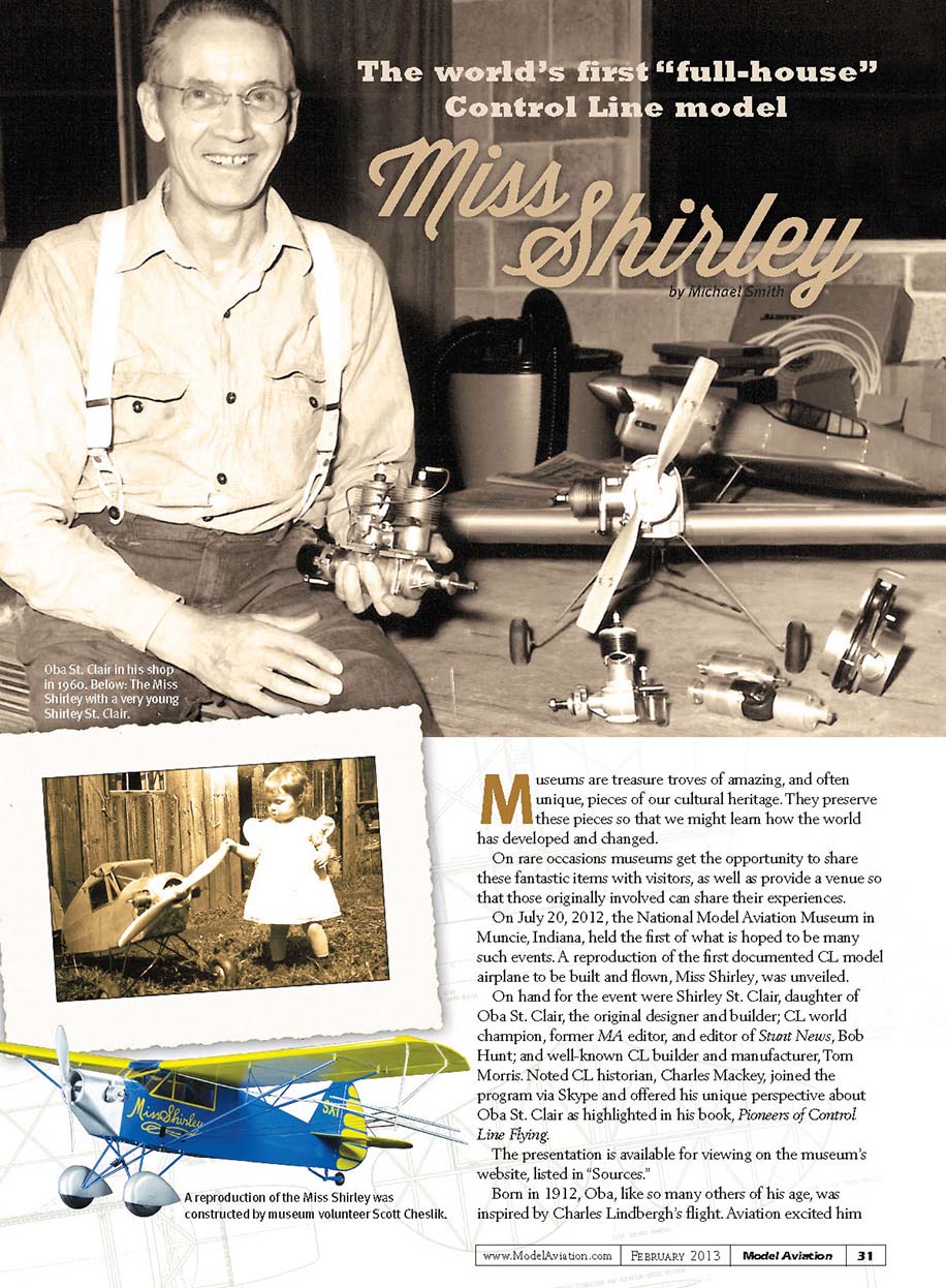 Oba St. Clair in his shop in 1960. Below: The Miss Shirley with a very young Shirley St. Clair.A Museums are treasure troves of amazing, and often unique, pieces of our cultural heritage. They preserve these pieces so that we might learn how the world has developed and changed. On rare occasions museums get the opportunity to share these fantastic items with visitors, as well as provide a venue so that those originally involved can share their experiences. On July 20, 2012, the National Model Aviation Museum in Muncie, Indiana, held the fi rst of what is hoped to be many such events. A reproduction of the fi rst documented CL model airplane to be built and fl own, Miss Shirley, was unveiled. On hand for the event were Shirley St. Clair, daughter of Oba St. Clair, the original designer and builder; CL world champion, former MA editor, and editor of Stunt News, Bob Hunt; and well-known CL builder and manufacturer, Tom Morris. Noted CL historian, Charles Mackey, joined the program via Skype and offered his unique perspective about Oba St. Clair as highlighted in his book, Pioneers of Control Line Flying. The presentation is available for viewing on the museum’s website, listed in “Sources.” Born in 1912, Oba, like so many others of his age, was inspired by Charles Lindbergh’s fl ight. Aviation excited him The world’s first “full-house” Control Line modelA reproduction of the Miss Shirley was constructed by museum volunteer Scott Cheslik.Flying by Michael Smith31Model Aviation FEBRUARY 2013www.ModelAviation.com031