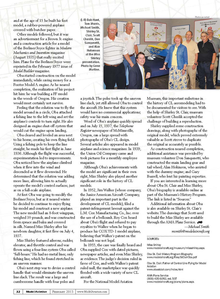 and at the age of 15 he built his fi rst model, a rubber-powered airplane covered with butcher paper. Other models followed, but it was an advertisement for a Brown Jr. engine and a construction article for a model of the Berliner/Joyce fi ghter in Modern Mechanics and Invention magazine (August 1935) that really excited him. Plans for the Berliner/Joyce were reprinted in the February 1977 issue of Model Builder magazine. Oba started construction on the model immediately, while saving money for a Forster Model A engine. As he neared completion, the realization of his project hit him: he was building a FF model in the woods of Oregon. His creation would most certainly not survive. Feeling that the solution was to fl y the model around in a circle, Oba attached a fi shing line to the left wing and set the airplane’s controls to turn right. He also designed an engine shut-off system that would cut the engine upon landing. Oba cleared and leveled an area next to his home, creating his own fl ying fi eld. Using a fi shing pole to keep the line straight, he made his fi rst fl ight in June 1936. Although the fl ight was successful, experimentation led to improvements. Oba noticed how the airplane climbed when it fl ew into the wind and descended as it fl ew downwind. He determined that the solution was adding more lines, allowing him to actually operate the model’s control surfaces, just as on a full-scale airplane. At fi rst Oba was going to modify the Berliner/Joyce, but as it neared winter he decided to continue to enjoy fl ying his model and construct a new airplane. The new model had an 8-foot wingspan, weighed 10 pounds, and was constructed from spruce and balsa and covered in silk. Named Miss Shirley after his newborn daughter, it fi rst fl ew on July 4, 1937. Miss Shirley featured ailerons, rudder, elevator, and throttle control and was fl own using a four-line system Oba called “full-house.” He had no metal lines, only fi shing line, which he found stretched in an uneven manner. Oba’s next step was to devise a control handle that would eliminate the uneven line slack. The result was a large and cumbersome handle with four poles and a joystick. The poles took up the uneven line slack, yet still allowed Oba to control the aircraft. He knew that this system would have no commercial applications; safety was his main concern. Word of Oba’s airplane quickly spread and on July 15, 1937, the Telephone Register newspaper of McMinnville, Oregon, ran a large spread with photographs of Oba’s CL design. Several articles also appeared in model airplane and science magazines. In 1939, the Union Oil Company came and took pictures for a monthly employee magazine. Although Oba’s achievements with the model are signifi cant in their own right, Miss Shirley also played another signifi cant role in the history of CL models. In 1952, Jim Walker (whose company, the Junior American Aircraft Company, played an important part in the development of CL models), fi led a patent-infringement lawsuit against the L.M. Cox Manufacturing Co., Inc. over the use of a bellcrank. Roy Cox heard about Oba’s fl ight and refused to pay royalties to Walker when he began to produce his COX TD-1 model airplane, believing that Walker’s patent on the bellcrank was not legal. In 1955, the case was fi nally heard and Oba supplied Cox with dated pictures, newspaper articles, and even Miss Shirley, as evidence. The judge’s decision ruled in favor of Cox, and with Walker’s patent ruled null, the marketplace was quickly fl ooded with a wide variety of new CL aircraft. For the National Model Aviation Museum, this important milestone in the history of CL aeromodeling had to be documented for visitors to see. With the help of Shirley St. Clair, museum volunteer Scott Cheslik accepted the challenge of building a reproduction. Shirley supplied some construction drawings, along with photographs of the original model, which proved extremely valuable as Scott strove to duplicate the original as accurately as possible. As construction neared completion, additional assistance was provided by museum volunteer Don Sanqunetti, who constructed the main landing gear and tail wheel; Alan Hokinson, who assisted with the dummy engine; and Gary Bussell, who lent his painting expertise. If you are interested in learning more about Oba St. Clair and Miss Shirley, Oba’s biography is available online as part of the Museum’s History Program. The link is listed in “Sources.” Additional information about Oba is also available on Shirley St. Clair’s website. The drawings that Scott used to build the Miss Shirley are available through the AMA Plans Service. —Michael Smithmsmith@modelaircraft.orgSOURCES:Miss Shirleywww.modelaircraft.org/museum/missshirley.aspxOba St. Clair History Program Biographywww.modelaircraft.org/fi les/StClairOba.pdfOba St. Clair: Father of Control Line Flying for Model Aviationwww.obastclair.com/index.htmlAMA Plans Service(800) 435-9262, ext. 507www.modelaircraft.org/plans/plans.aspx (L-R) Bob Hunt, Tom Morris, Michael Smith, Shirley St. Clair, Scott Cheslik, Don Sanqunetti, and Alan Hokenson at the Miss Shirley presentation. Photo by Gene Martine.Photos as noted32Model Aviation FEBRUARY 2013www.ModelAviation.com031