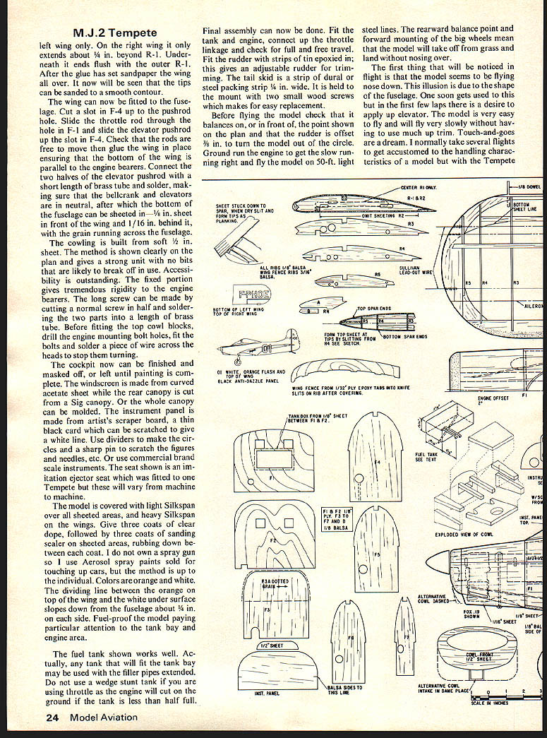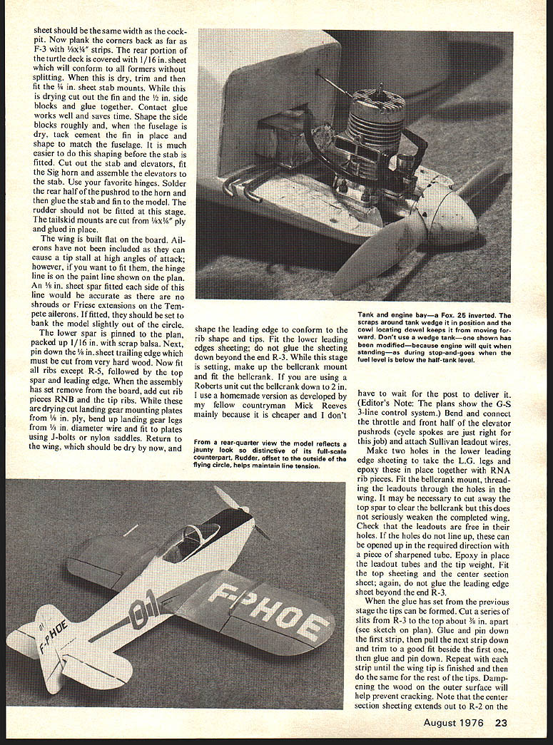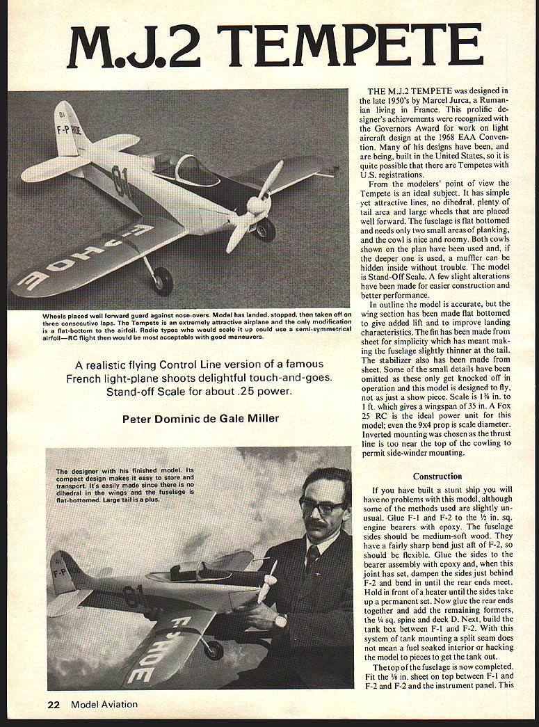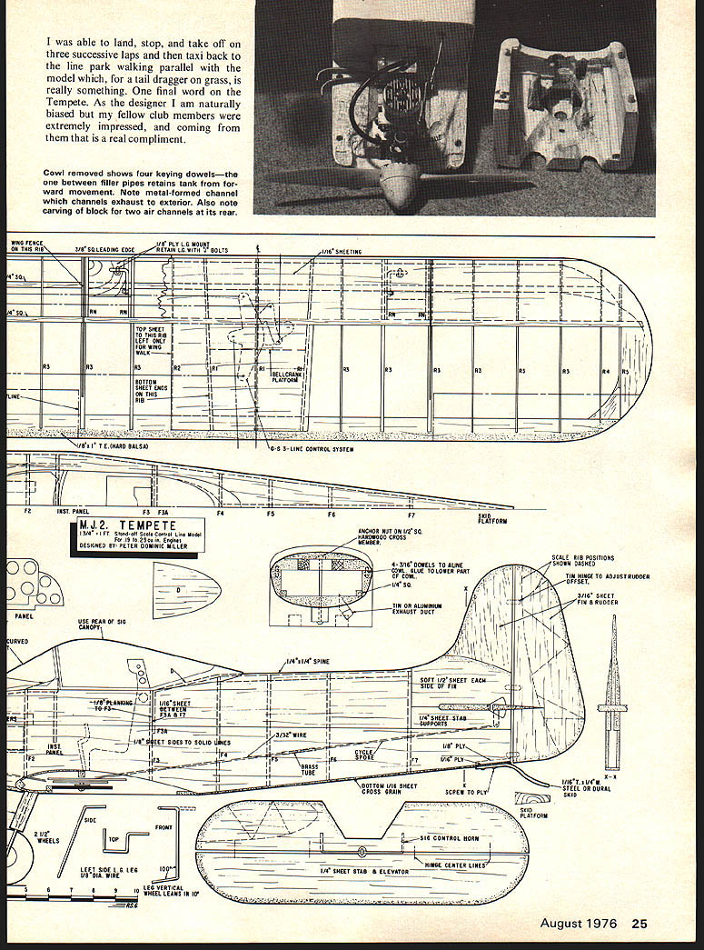MJ2 TEMPETE realistic flying Control Line version famous French light-plane shoots delightful touch-and-goes Stand-off Scale about 25 power Peter Dominic de Gale Miller THE MJ2 TEMPETE designed late 1950s Marcel Jurca Ruman ian living France prolific de signers achievements recognized Governors Award work light aircraft design 1968 EAA Conven tion designs have being built United States quite possible Tempetes US registrations modelers point view Tempete ideal subject has simple yet attractive lines no dihedral plenty tail area large wheels placed well forward fuselage flat bottomed needs two small areas planking cowl nice roomy Both cowls shown plan have used deeper used muffler can hidden inside trouble model Stand-Off Scale few slight alterations have made easier construction better performance outline model accurate wing section has made flat bottomed give added lift improve landing characteristics fin has made sheet simplicity has meant mak ing fuselage slightly thinner tail stabilizer also has made sheet Some small details have omitted get knocked off operation model designed fly just show piece Scale 1 1 ft gives wingspan 35 Fox 25 RC ideal power unit model 9x4 prop scale diameter Inverted mounting chosen thrust line too near top cowling permit side-winder mounting Construction have built stunt ship will have no problems model although some methods used slightly un usual Glue F-l F-2 ngine bearers epoxy fuselage sides should medium-soft wood have fairly sharp bend just aft F-2 should flexible Glue sides bearer assembly epoxy joint has set dampen sides just behind F-2 bend until rear ends meet Hold front heater until sides take up permanent set Now glue rear ends together add remaining formers /4 sq spine deck D Next build tank box between F-l F-2 system tank mounting split seam does mean fuel soaked interior hacking model pieces get tank out Thetop fuselage now completed Fit /8 sheet top between F-I F-2 F-2 instrument panel 22 Model Aviation vvneeis piaceo wen Torward guard against nose-avers Model has landed stopped taken off three consecutive laps Tempete extremely attractive airplane modification flat-bottom airfoil Radio types would scale up could use semi-symmetrical airfoilRc flight would acceptable good maneuvers sheet should same width cock pit Now plank corners back far F-3 Ax strips rear portion turtle deck covered 1/16 sheet will conform formers splitting dry trim fit t stab mounts drying cut out fin blocks glue together Contact glue works well saves time Shape side blocks roughly fuselage dry tack cement fin place shape match fuselage much easier shaping before stab fitted Cut out stab elevators fit Sig horn assemble elevators stab Use favorite hinges Solder rear half pushrod horn glue stab fin model rudder should fitted stage tailskid mounts cut /8xV6 ply glued place wing built flat board Ail erons have included can cause tip stall high angles attack however want fit hinge line paint line shown plan An /s sheet spar fitted side line would accurate no shrouds Friese extensions Tem pete ailerons fitted should set bank model slightly out circle lower spar pinned plan packed up 1/16 scrap balsa Next pin down sheet trailing edge must cut very hard wood Now fit ribs except R-5 followed top spar leading edge assembly has set remove board add cut rib pieces RNB tip ribs drying cut landing gear mounting plates ply bend up landing gear legs diameter wire fit plates using J-bolts nylon saddles Return wing should dry now shape leading edge conform rib shape tips Fit lower leading edges sheeting glue sheeting down beyond end R-3 stage setting make up bellcrank mount fit bellcrank using Roberts unit cut bellcrank down 2 use homemade version developed fellow countryman Mick Reeves mainly because cheaper dont rear-quarter view model reflects jaunty look distinctive its fulIscale counterpart Rudder offset outside flying circle helps maintain line tension have wait post deliver Editors Note plans show G-S 3-line control system Bend connect throttle front half elevator pushrods cycle spokes just right job attach Sullivan leadout wires Make two holes lower leading edge sheeting take LG legs epoxy place together RNA rib pieces Fit bellcrank mount thread ing leadouts through holes wing may necessary cut away top spar clear bellcrank does seriously weaken completed wing Check leadouts free holes holes line up can opened up required direction piece sharpened tube Epoxy place leadout tubes tip weight Fit top sheeting center section sheet again glue leading edge sheet beyond end R-3 glue has set previous stage tips can formed Cut series slits R-3 top about 3A apart see sketch plan Glue pin down first strip pull next strip down trim good fit beside first glue pin down Repeat strip until wing tip finished same rest tips Damp ening wood outer surface will help prevent cracking Note center section sheeting extends out R-2 August1976 23 Tank engine baya Fox 25 inverted scraps around tank wedge position cowl locating dowel keeps moving ward Dont use wedge tankone shown has modifiedbecause engine will quit standingas during stop-and-goes fuel level below half-tank level MJ2 Tempete left wing right wing extends about nd R-l Under neath ends flush outer R- 1 After glue has set sandpaper wing over now will seen tips can sanded smooth contour wing can now fitted fuse lage Cut slot F-4 up pushrod hole Slide throttle rod through hole F-l slide elevator pushrod up slot F-4 Check rods free move glue wing place ensuring bottom wing parallel engine bearers Connect two halves elevator pushrod short length brass tube solder mak ing sure bellcrank elevators neutral after bottom fuselage can sheeted in~i/o sheet front wing 1/16 behind grain running across fuselage cowling built soft t method shown clearly plan gives strong unit no hits likely break off use Accessi bility outstanding fixed portion gives tremendous rigidity engine bearers long screw can made cutting normal screw half solder ing two parts length brass