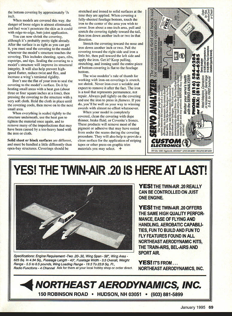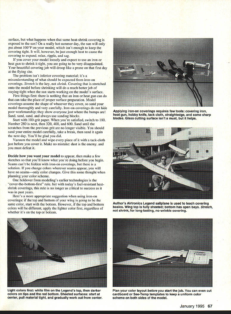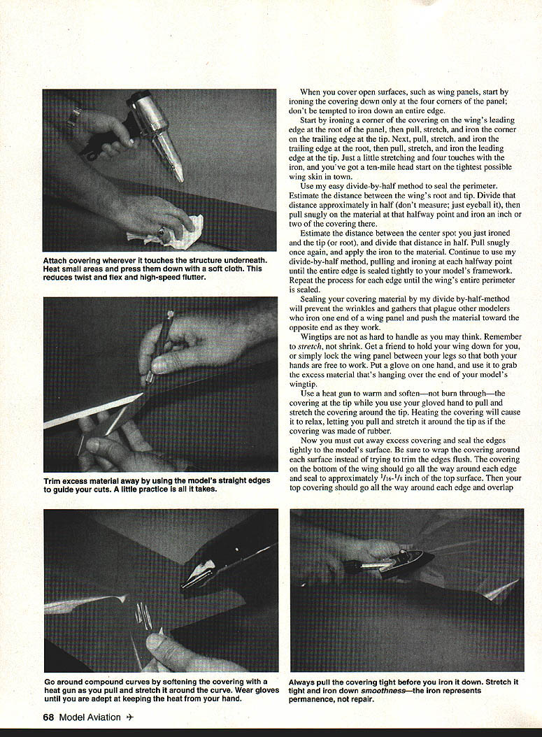 U Jeff Toy SOONER OR LATER aeromodeler must face task covering model airplane us find covering difficult doesnt have difficult Once understand basics model covering can quite pleasurable fact can artistically creative steps toward getting newest model airborne Most modelers think secret beautiful covering quality shrink Im going teach stretch before shrink Think about it. Science 101 says heat makes things expand shrink Sure heat-shrink covering will draw tight 2000F better applied its January 199565 lhlII 111W Easy I I I I Method surface what happens same heat-shrink covering exposed sun really hot summer day sun will put about 1000F model isnt enough keep covering tight will however just enough heat cause covering expand relax ripple sag cover model loosely expect use iron heat gun shrink tight going very disappointed beautiful covering job will droop like prune first day flying site problem isnt inferior covering material its misunderstanding what should expected iron-on coverings Stretch key shrink Covering stretched onto model before shrinking will much better job staying tight sun starts working models surface First things first nothing iron heat gun can can take place proper surface preparation Model coverings assume shape whatever cover sand model thoroughly very carefully Iron-on coverings hide poor workmanship show everyone just bumps Sand sand sand always use sanding blocks Start 100-grit paper youre satisfied switch 180 Number 280 next 320 400 600 Sand until scratches previous grit no longer visible should sand entire model carefully take break sand again next day Youll glad did Vacuum model wipe piece tack-cloth just before cover Make no mistake dust enemy must defeat Decide want model appear make few sketches youll know what youre doing before begin Seams cant hidden iron-on coverings solution change colors wherever seams appear will have no seamsonly color changes Give some thought planning color scheme holdover modelings earlier technologies cover-the-bottom-first rule todays fuel-resistant heatshrink coverings rule no longer critical success past years Heres appropriate suggestion using iron-on coverings top bottom wing going same color start bottom However top bottom colors will different apply lighter color first regardless whether its top bottom January1995 67 Applying iron-on coverings requires few tools covering iron heat gun hobby knife tack cloth straightedge some sharp blades Glass cutting surface isnt must helps Authors Airtronics Legend sailplane used teach covering basics Wing top fully sheeted bottom has open bays Stretch shrink long-lasting no-wrinkle covering Ligni colors tirst white turn Legends top darker colors tips red bottom Sheeted surfaces start center pull material tight gradually work out center Plan color layout before start job can cut cardboard See-Temp templates keep uniform color scheme both sides model cover open surfaces such wing panels start ironing covering down four corners panel dont tempted iron down entire edge Start ironing corner covering wings leading edge root panel pull stretch iron corner trailing edge tip Next pull stretch iron trailing edge root pull stretch iron leading edge tip Just little stretching four touches iron youve got ten-mile head start tightest possible wing skin town Use easy divide-by-half method seal perimeter Estimate distance between wings root tip Divide distance approximately half dont measure just eyeball pull snugly material halfway point iron inch two covering Estimate distance between center spot just ironed tip root divide distance half Pull snugly once again apply iron material Continue use divide-by-half method pulling ironing halfway point until entire edge sealed tightly models framework Repeat process edge until wings entire perimeter sealed Sealing covering material divide by-half-method will prevent wrinkles gathers plague other modelers iron end wing panel push material toward opposite end work Wingtips hard handle may think Remember stretch shrink Get friend hold wing down simply lock wing panel between legs both hands free work Put glove hand use grab excess material thats hanging over end models wingtip Use heat gun warm softennot burn throughthe covering tip use gloved hand pull stretch covering around tip Heating covering will cause relax letting pull stretch around tip covering made rubber Now must cut away excess covering seal edges tightly models surface sure wrap covering around surface instead trying trim edges flush covering bottom wing should go way around edge seal approximately 1/161/8 inch top surface top covering should go way around edge overlap 68 Model Aviation ch covering wherever touches structure underneath Heat small areas press down soft cloth reduces twist flex high-speed flutter Trim excess material away using models straight edges guide cuts lIttle practice takes Go around compound curves softening covering Always pull covering tight before iron down Stretch heat gun pull stretch around curve Wear gloves tight iron down smoothnessthe iron represents until adept keeping heat hand permanence repair bottom covering approximately 1/8 inch models covered way danger loose edges almost eliminated fuel wont penetrate skin could edge-to-edge butt-joint application can now shrink covering although its probably pretty tight already After surface tight can get must seal covering model wherever models structure touches covering includes sheeting spars ribs capstrips tips Sealing covering models structure will improve its structural integrity will also help prevent highspeed flutter reduce twist flex increase wings torsional rigidity Dont use flat iron seal covering models surface heating small areas heat gun about three four square inches time pressing covering structure very soft cloth Hold cloth place until covering cools move next small area everything sealed tightly structure underneath use heat gun tighten material once again remove imperfections may have caused too-heavy ha