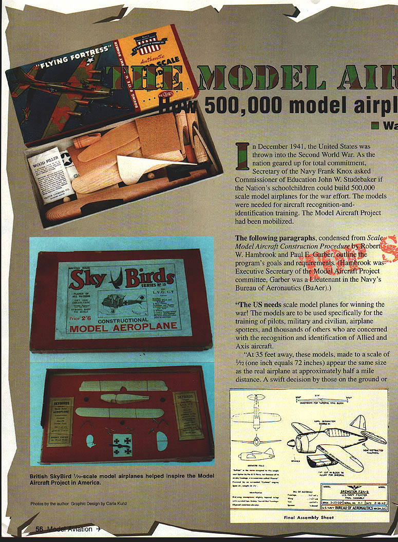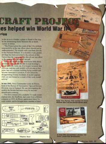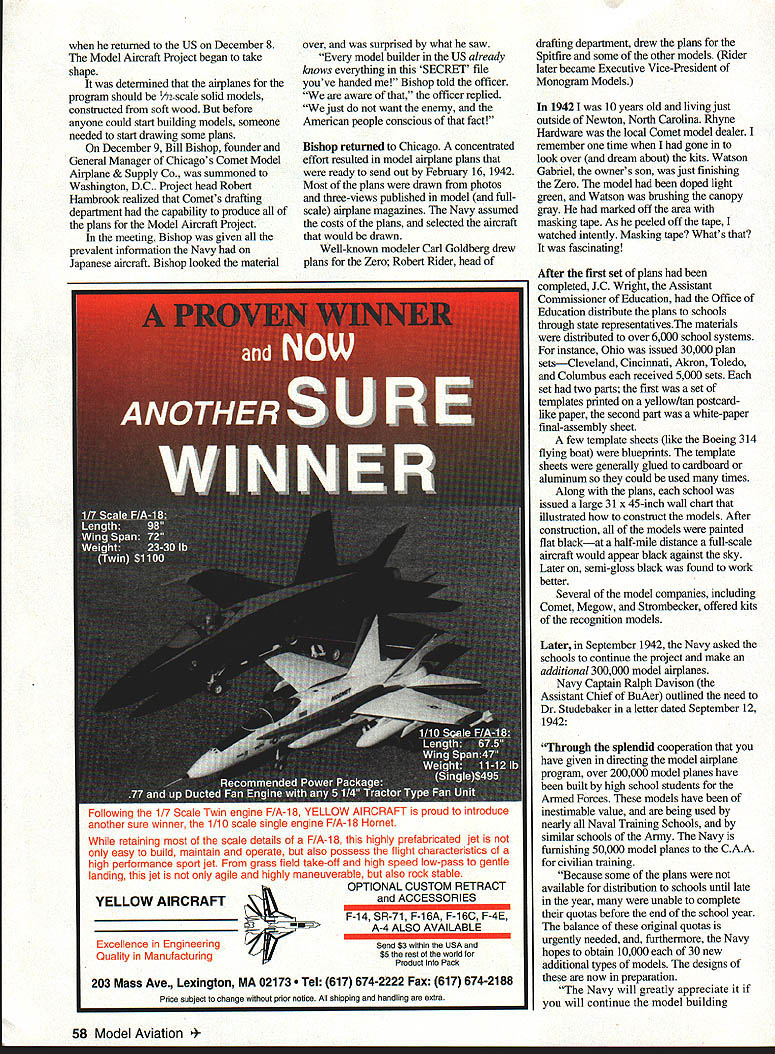 - -- * e war e OgnitlOll Model P s condensed Scal nPbe ok wa roject Navys Ae4 xlel planes winnin2 used specifi Lnd civili other LdeIItI r T Tm K e Final Assembly making point will become interestec disappointing n clubs forn activity late 1941 Nay Bui i [77] IUALOC1CMWNOAAFOLlI3/ V NoAT CENTER SC ION/ BREWSA BI EWST IA ASTER IFF FUSELAGEBUEFAL 2MPL2ILJ Template Sheet -i-i returned US December 8 Model Aircraft Project began take shape determined airplanes program should 1h2-scale solid models constructed soft wood before anyone could start building models someone needed start drawing some plans December 9 Bill Bishop founder General Manager Chicagos Comet Model Airplane & Supply Co summoned Washington DC. Project head Robert Hambrook realized Comets drafting department capability produce plans Model Aircraft Project meeting Bishop given prevalent information Navy Japanese aircraft Bishop looked material over surprised what saw model builder US already knows everything SECRET file youve handed Bishop told officer aware officer replied just want enemy American people conscious fact Bishop returned Chicago concentrated effort resulted model airplane plans ready send out February 16 1942 Most plans drawn photos three-views published model fullscale airplane magazines Navy assumed costs plans selected aircraft would drawn Well-known modeler Carl Goldberg drew plans Zero Robert Rider head drafting department drew plans Spitfire some other models Rider later became Executive Vice-President Monogram Models 19421 10 years old living just outside Newton North Carolina Rhyne Hardware local Comet model dealer remember time gone look over dream about kits Watson Gabriel owners son just finishing Zero model doped light green Watson brushing canopy gray marked off area masking tape As peeled off tape watched intently Masking tape Whats fascinating After first set plans completed JC Wright Assistant Commissioner Education Office Education distribute plans schools through state representativesThe materials distributed over 6000 school systems instance Ohio issued 30000 plan setsCleveland Cincinnati Akron Toledo Columbus received 5000 sets set two parts first set templates printed yellow/tan postcardlike paper second part white-paper final-assembly sheet few template sheets like Boeing 314 flying boat blueprints template sheets generally glued cardboard aluminum could used times Aiong plans school issued large 31 x 45-inch wall chart illustrated construct models After construction models painted flat blackat half-mile distance full-scale aircraft would appear black against sky Later semi-gloss black found work better Several model companies including Comet Megow Strombecker offered kits recognition models Later September 1942 Navy asked schools continue project make additional 300000 model airplanes Navy Captain Ralph Davison Assistant Chief BuAer outlined need Dr Studebaker letter dated September 12 1942 retaining scale details F/A-18 highly prefabricated let easy build maintain operate also possess flight characteristics ot high performance sport jet grass field take-off high speed low-pass gentle landing jet agile highly maneuverable also rock stable OPTIONAL CUSTOM RETRACT ACCESSORIES F-14 SR-71 F-16A F-16C F-4E ___________________ ALSO AVAILABLE Excellence Engineering Ounlity Manufacturing Send $3 within USA $5 rest ot world Product Pack 203 Mass Ave Lexington MA 02173 617 674-2222 Fax 617 674-2188 Price sublect change prior notice shipping handling extra Through splendid cooperation have given directing model airplane program over 200000 model planes have built high school students Armed Forces models have inestimable value being used nearly Naval Training Schools similar schools Army Navy furnishing 50000 model planes CAA civilian training Because some plans available distribution schools until late year unable complete quotas before end school year balance original quotas urgently needed furthermore Navy hopes obtain 10000 30 new additional types models designs now preparation Navy will greatly appreciate will continue model building 58 Model Aviation owing 1/7 Scale Twin engine I-/A-lB YLLLUVV Ail-tUt-IAI- i prouo mrouuce another sure winner 1/10 scale single engine F/A-18 Hornet YELLOW AIRCRAFT program during coming school year will have completed both planes remaining last years quota additional US foreign models inspection forms filled out shipment 10 models started local level Navy-furnished collection centers After models inspected Navy distributed armed forces model rated indicate difficulty level construction example single-engined Brewster Buffalo fighter plan number A-i rated star however four-engined Consolidated PB2Y-3 flying boat plan number A-7 rated three stars Ive always misgivings about system Martin PBM-l gull-winged twin-engined flying boat absolute beast buildand rated two stars After model completed accepted honor certificate given builder became Aircraftsman keeping military theme builder could earn higher rank building more difficult models rank requirements follows Cadet One model type Ensign Three models including scout bomber observation aircraft Lieutenant J G Five models two nations including twin-engined bomber Lieutenant Seven models including seaplane twin-fuselage fighter Lieutenant Commander Eight models three nations including torpedo airplane biplane Commander Nine models four nations including four-engined bomber Captain Ten models five nations following types fighter scout bomber biplane observation aircraft twinengined bomber seaplane twin-fuselage fighter torpedo bomber four-engined army bomber four-engined patrol bomber Whew friend Kent Henry 13year-old time living central Kentucky Kent built model A-l Brewster Buffaloit returned because barely recognizable Almost 20 years ago Kent careless enough give returned wooden sculpture probably now regrets Over years outcast model airplane has provided lot amusement Ive talked number men builders Model Aircraft Proje