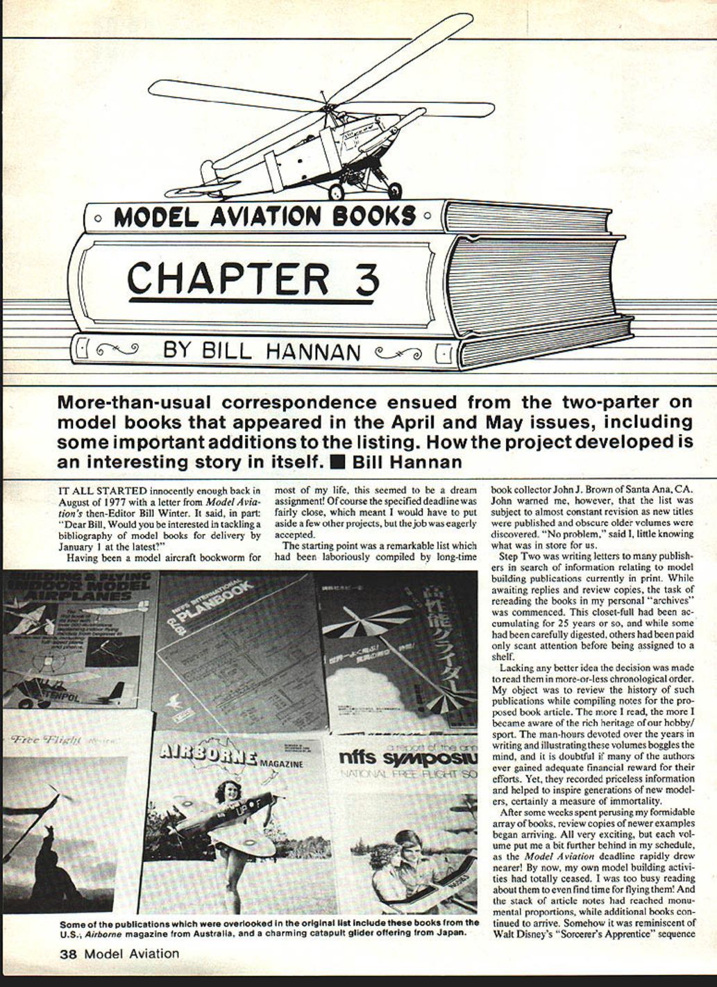 o MODEL AVIATION BOOKS CHAPTER 3 BY BILL HANNAN -than-usual correspondence ensued two-parter model books appeared April May issues including some important additions listing Howthe project developed interesting story itselfE Bill Hannan IT ALL STARTED innocently enough back August 1977 letter Model via tion s then-Editor Bill Winter said part Dear Bill Would interested tackling bibliography model books delivery January 1 latest Having model aircraft bookworm life seemed dream assignment course specified deadline fairly close meant would have put aside few other projects job eagerly accepted starting point remarkable list laboriously compiled long-time book collector John J Brown Santa Ana CA John warned however list subject almost constant revision new titles published obscure older volumes discovered No problem said little knowing what store us Step Two writing letters publish ers search information relating model building publications currently print awaiting replies review copies task rereading books personal archives commenced closet-full ac cumulating 25 years some carefully digested others paid scant attention before being assigned shelf Lacking better idea decision made read more-or-less chronological order object review history such publications compiling notes pro posed book article read became aware rich heritage hobby sport man-hours devoted over years writing illustrating volumes boggles mind doubtful authors ever gained adequate financial reward efforts Yet recorded priceless information helped inspire generations new model ers certainly measure immortality After some weeks spent perusing formidable array books review copies newer examples began arriving very exciting vol ume put bit further behind schedule Model Aviation deadline rapidly drew nearer now own model building activi ties totally ceased too busy reading about find time flying stack article notes reached monu mental proportions additional books con tinued arrive Somehow reminiscent Walt Disneys Sorcerers Apprentice sequence 38 Model Aviation ZIZIIZG c zz- Some publications overlooked original list Include books US Airborne magazine Australia charming catapult glider offering Japan movie Fantasia wherein Mickey Mouses brooms kept bringing buckets water endless procession appreciation hobby grew along manuscript until became obvious some arbitrary cutoff date needed During early 1978 after much soul-searching article condensing story photographs mailed Model Aviation slightly behind schedule editorial reaction predictable article much longer anticipated too cumbersome accommodated single issue Maybe two issues com plicate matters new books still being published suggesting very least revisions master list thing led another months dragged wondered efforts would ever see print During first part 1982 Carl Wheeley now occupying editors chair must have tired tripping over lumpy manuscript California needed storage space something else wrote about felt merit needed abridging updating own reactions somewhat mixed hand delightful news article might published long last conversely wasnt really sure wanted work again Eventually though article reworked giant paper stack slightly reduced resubmitted Carl next suggested new photographs John Brown go other illustrations True both aged bit since getting involved pro duction April 1982 edition Model via tion appeared could hardly believe eyes What relief What satisfaction would anyone else really care fringe benefits helps make awriters life interesting feedback readers Some articles draw very little response except perhaps authors patient mother Others elicit remarkable amount audience reaction Model Books definitely latter category mail gratifying Typical kind words written Bill Kee Twin Falls ID Enjoyed reading Model Books surprised quantity pub lished past me people miss lot life knowing history behind interests ircraft engineer Daniel Walton Liberal KS Am looking forward Part 2 Just goes prove history can interesting put proper perspec tive andflot just lot dates places People make hobby people make interesting Charlie Sotich Chicago IL reac tion article books dealing model planes Model Aviation good brought back memories about 40 years ago almost Saturday would walk mile public library see what books under 62913 . happy see include some nice comments about Model Aeronautics Made Painless Raul J Hoff man got know him slightly during high school college years think studied little harder some engineering courses because influence highly respected author/modeler Frank Zaic Appreciate mention Year Books especially Hoffmans book few really cared let us know tried explain what makes fly Complimentary phone calls also received editorial staff members two other model magazines making satisfaction complete basking warm glow praise burst flak arrived air mail Great Britain Ron Moulton prolific author model books Aero Modeller magazine executive understandably upset see name April alphabetical list since theoretically extended through 0 John Brown equally perplexed rushed apology letters off England next blast fired author/artist Bob Lopshire Bill Hannans article about modeling books April 1982 issue skipped right over Beginners Guide Building Flying Model Airplanes Next time find Peanut event find him competing think might just accidentally step plane ditor Carl Wheeley received letter three us sent regrets Bob now becoming somewhat squeam ish about entire presentation particularly discovered other authors missing Part 1 book list arrival Model Books Part 2 May Model Aviation cleared up few mysteries first read John Worth AMA HQ caught fact M authors missing Part 1 resurfaced Part 2 still out alphabetical sequence Soon received soothing letters Bob Lopshire mentioned having similar experiences himself Ron Moulton ModelAviation May arrives depart Calgary Honour satisfied list short few titles go again Ron several point out important omissions instance Cliff McBaine La Habra CA noted First