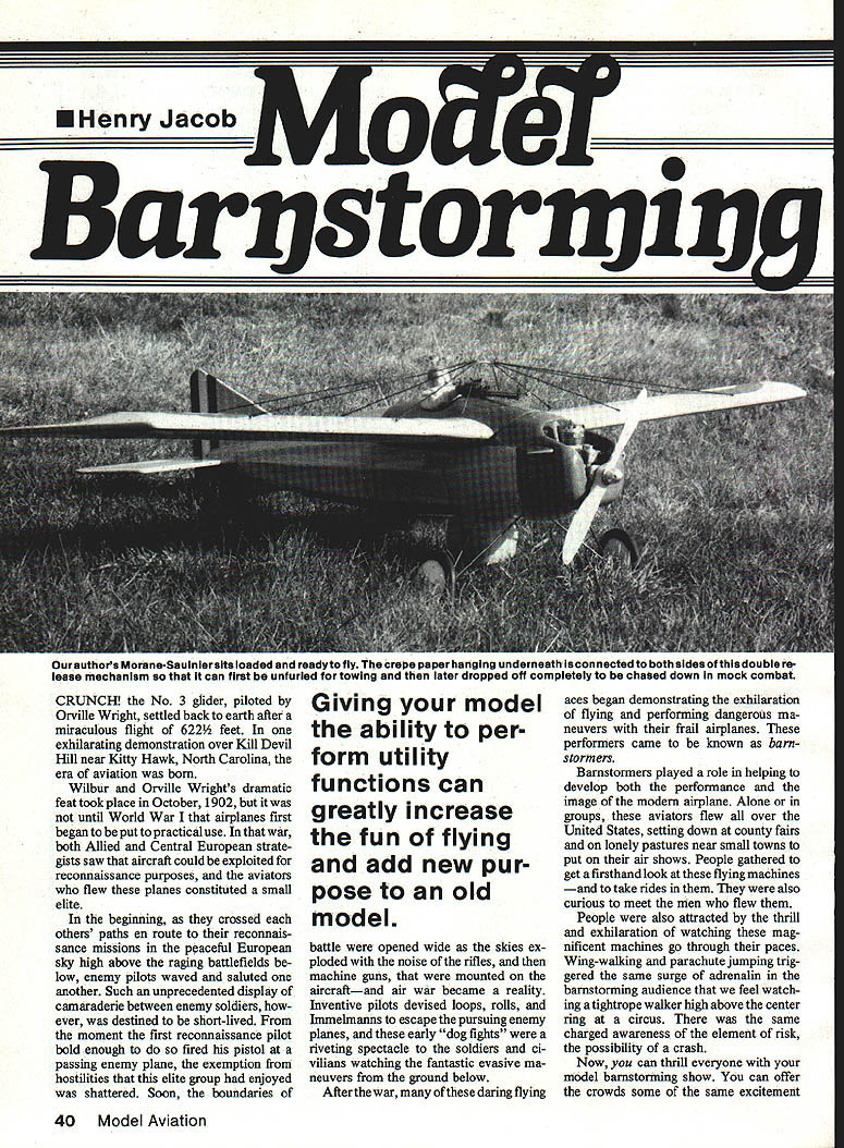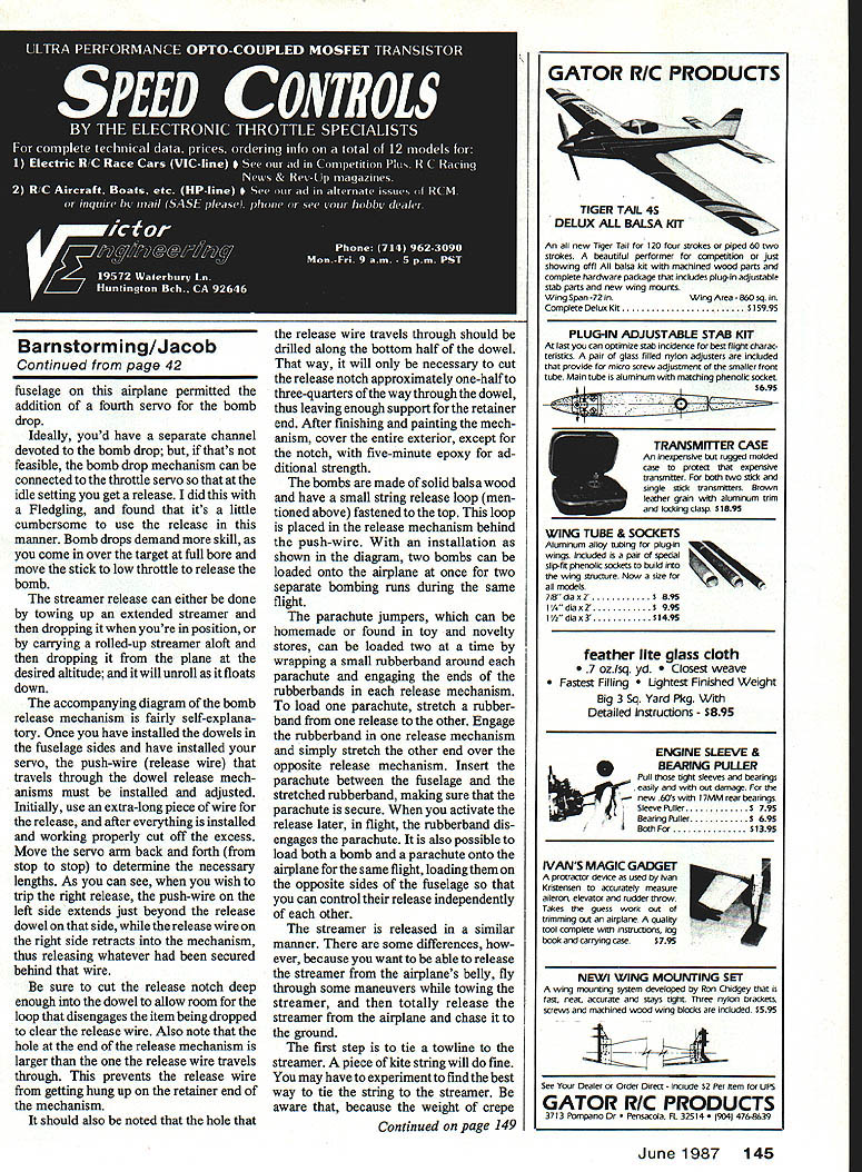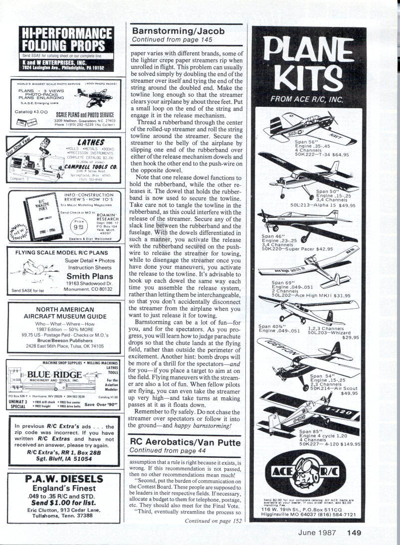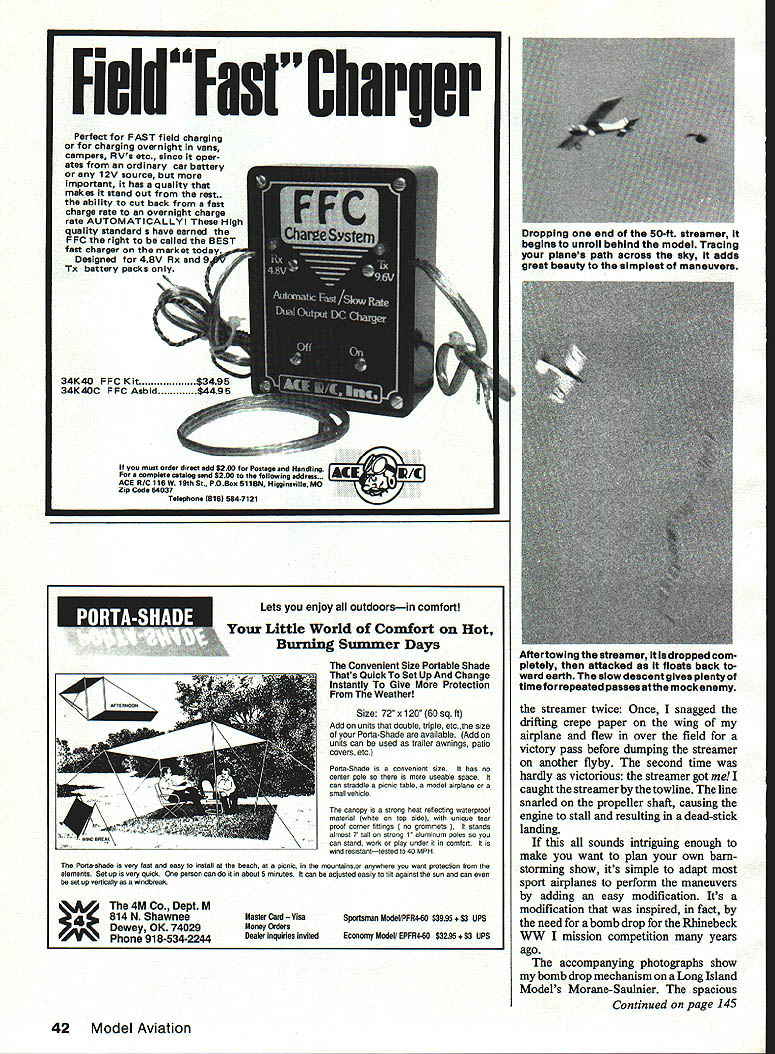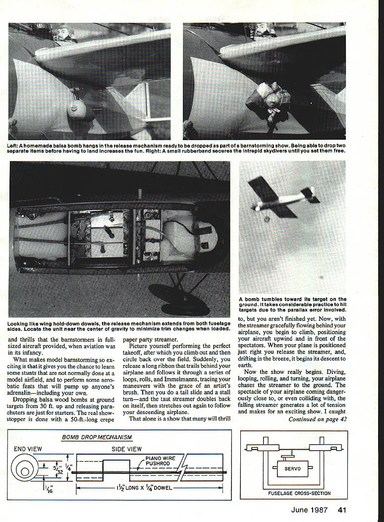 U Henry Jacob Ourauthos Morane-Saulnlerslts loaded readyto fly crepe paper hanging underneathis connected both sides double re lease mechanism can fIrst unfurled towIng later dropped off completely chased down mock combat CRUNCH No 3 glider piloted Orville Wright settled back earth after miraculous flight 622 feet exhilarating demonstration over Kill Devil Hill near Kitty Hawk North Carolina era aviation born Wilbur Orville Wrights dramatic feat took place October 1902 until World War airplanes first began put practical use war both Allied Central European strate gists saw aircraft could exploited reconnaissance purposes aviators flew planes constituted small elite beginning crossed others paths en route reconnais sance missions peaceful European sky high above raging battlefields low enemy pilots waved saluted another Such unprecedented display camaraderie between enemy soldiers ever destined short-lived moment first reconnaissance pilot bold enough fired pistol passing enemy plane exemption hostilities elite group enjoyed shattered Soon boundaries Giving model ability per form utility functions can greatly increase fun flying add new pur pose old model battle opened wide skies ex ploded noise rifles machine guns mounted aircraftand air war became reality InVentive pilots devised loops rolls Immelmanns escape pursuing enemy planes early dog fights riveting spectacle soldiers ci vilians watching fantastic evasive ma neuvers ground below After war daring flying aces began demonstrating exhilaration flying performing dangerous ma neuvers frail airplanes performers came known barn storm err Barnstormers played role helping develop both performance image modern airplane Alone groups aviators flew over United States setting down county fairs lonely pastures near small towns put air shows People gathered get firsthand look flying machines take rides also curious meet men flew People also attracted thrill exhilaration watching mag nificent machines go through paces Wing-walking parachute jumping trig gered same surge adrenalin barnstorming audience feel watch ing tightrope walker high above center ring circus same charged awareness element risk possibility crash Now can thrill everyone model barnstorming show can offer crowds some same excitement 40 Model Aviation thrills barnstormers fullsized aircraft provided aviation its infancy What makes model barnstorming ex citing gives chance learn some stunts normally done model airfield perform some aero batic feats will pump up anyones adrenalinincluding own Dropping balsa wood bombs ground targets 30 ft up releasing para chuters just starters real show stopper done 50-ft-long crepe paper party streamer Picture yourself performing perfect takeoff after climb out circle back over field Suddenly release long ribbon trails behind airplane follows through series loops rolls Immelmanns tracing maneuvers grace artists brush tail slide stall turnand taut streamer doubles back itself stretches out again follow descending airplane alone show will thrill arent finished yet Now streamer gracefully flowing behind airplane begin climb positioning aircraft upwind front spectators plane positioned just right release streamer drifting breeze begins its descent earth Now show really begins Diving looping rolling turning airplane chases streamer ground spectacle airplane coming danger ously close colliding falling streamer generates lot tension makes exciting show caught Continued page 42 June1987 41 Left homemade balsa bomb hangs release mechanism ready dropped part barnstorming show Being ableto drop two separate Items before having land increases fun Right small rubberband secures Intrepid skydivers until set free Looking like wing hoiddown dowels release mechanism extends both fuselage sides Locate unit near center gravity minimize trim changes loaded bomb tumbles toward its target ground takes considerable practice hit targets due parallax error Involved BOMB DROP MECFIANISM END VIEWSIDE VIEW IPIANOWiRE/f1 Q[1IjJsHRoD/LI % IILONG X 4DOWEL 16 FUSELAGE CROSS-SECTION U FieldFasr Charier Perfect FAST field charging charging overnight vans campers RVs etc since oper ates ordinary car battery 12V source important haa quality makes stand Out rest. ability cut back fast charge rate overnight charge rate AUTOMATICALLY High qua ilty standard have earned FFC right celied BEST fast charger market today Designed 4BV Fix end 9J Tx battery packs oniy f IN 34K40 FFC Kit 34K40C FFCAsbid Lets enjoy outdoorsin comfort Youx Little World Comfort Hot Burning Summer Days Convenient Size Portable Shade Thats Quick Set Up Change Instantly Give Protection Weather Size 72x 120 60 sq fi Add units double triple etcthe size Porta-Shade available lAdd units can used aa trailer awnings patio covers etcl Porta-Shade convenient size has ne center pole mere useable space can straddle picnic table model airplane small vehicle canopy strung heat reflecting waterproof material lwhite en tsp sidel unique tear proof corner fittings 1 nO grommets stands almost 7 tall strung t aluminum poles cur stand work play under comfort wind resistanttested 40MPH Porte-shade carp taut easy install beach picnic nountainsor anywhere yoa want protection elements 5et apis carp qaick pemon can about 5 minutes can udiusted easily tih against sun con set up vertically windbreak 4M Co Dept M Dewey OK 74029 814 N Shawnee Phone 918-534-2244 Master Card Visa Mosey Orders Dealer inquiries invited Sportsman ModOEPFR4-60 $3995 PS Economy Modell EPFR4-60 $3295 PS Aftertowing streamer lsdropped com pletely attacked floats back ward earthTheslowdescentglves plentyof time forrepeated passesatthe mockenemy streamer twice Once snagged drifting crepe paper wing airplane flew over field victory pass before dumping streamer another flyby second time hardly victorious streamer got caught streamer towline line snarled propeller shaft causing engine stall resulting dead-stick landing sounds intriguing enough make want plan own barn storming