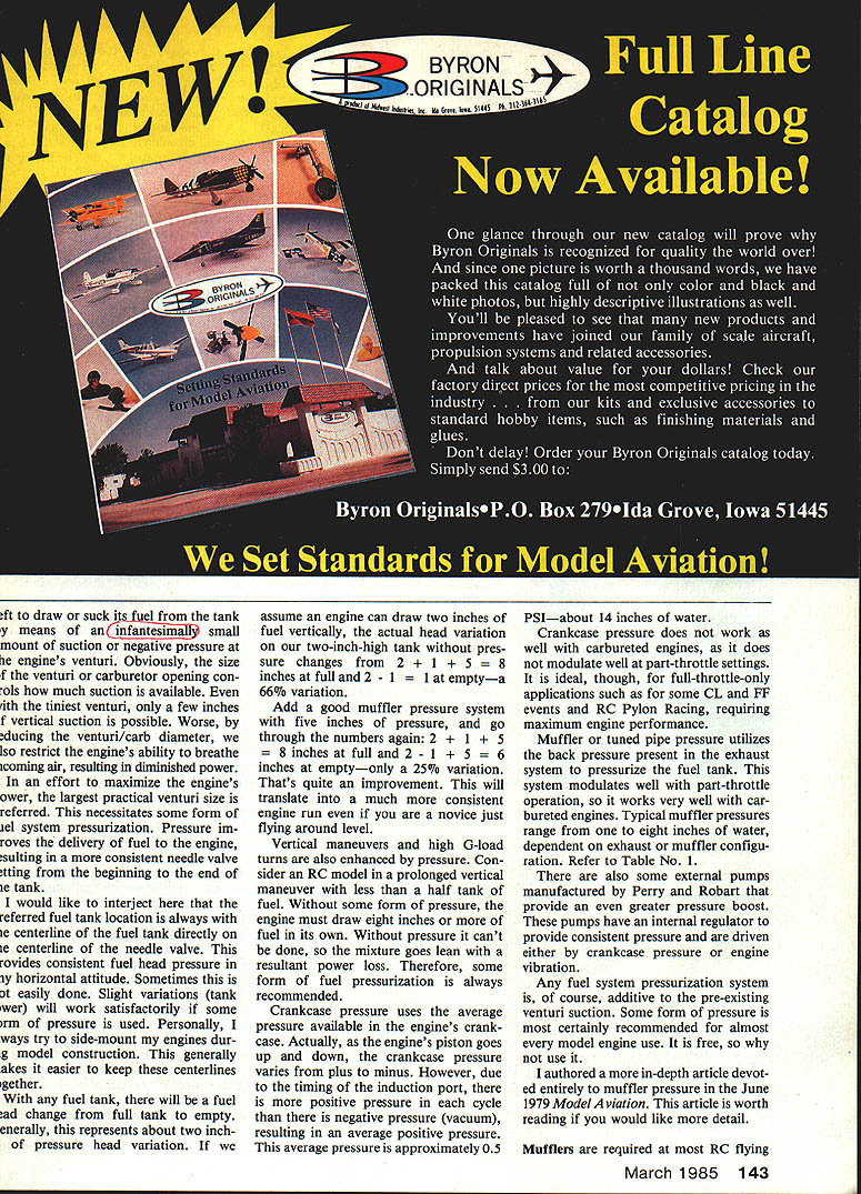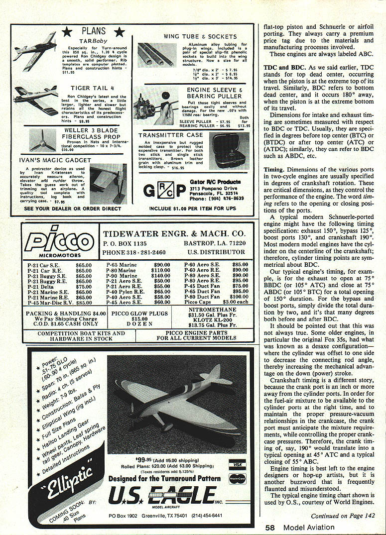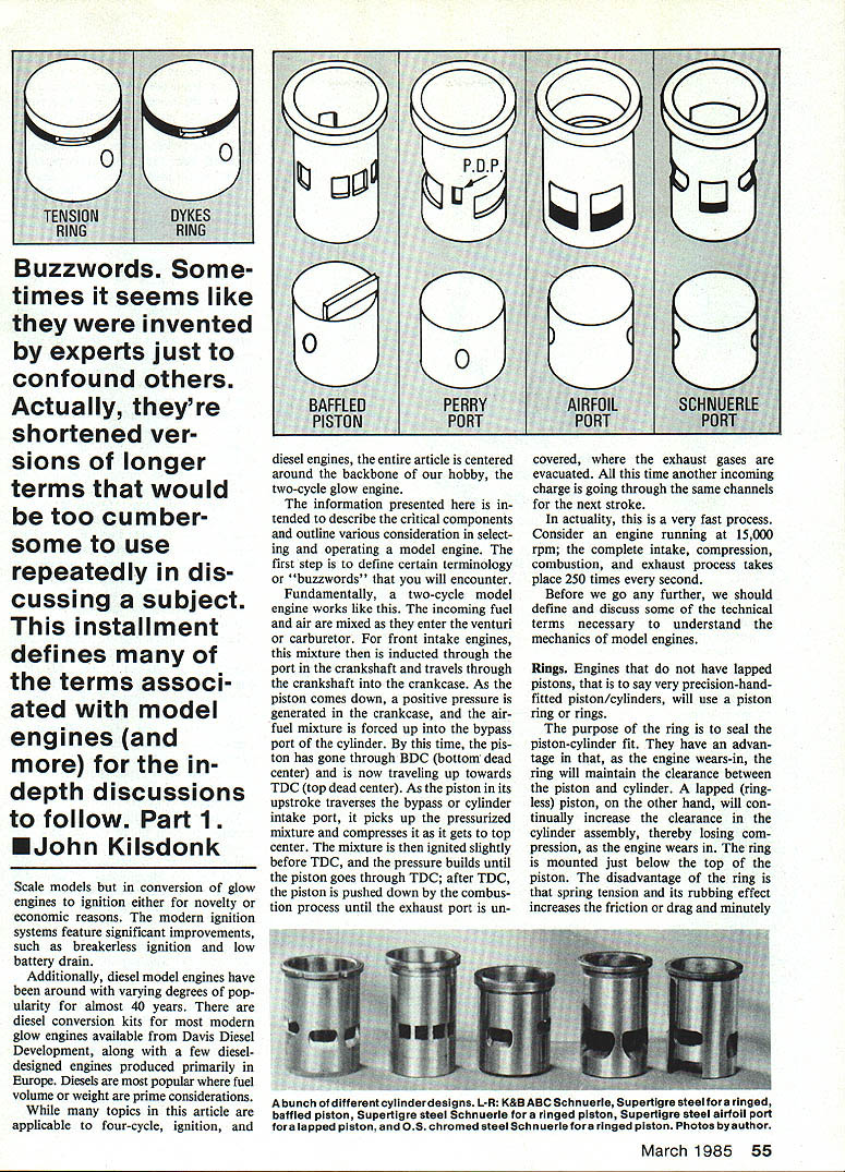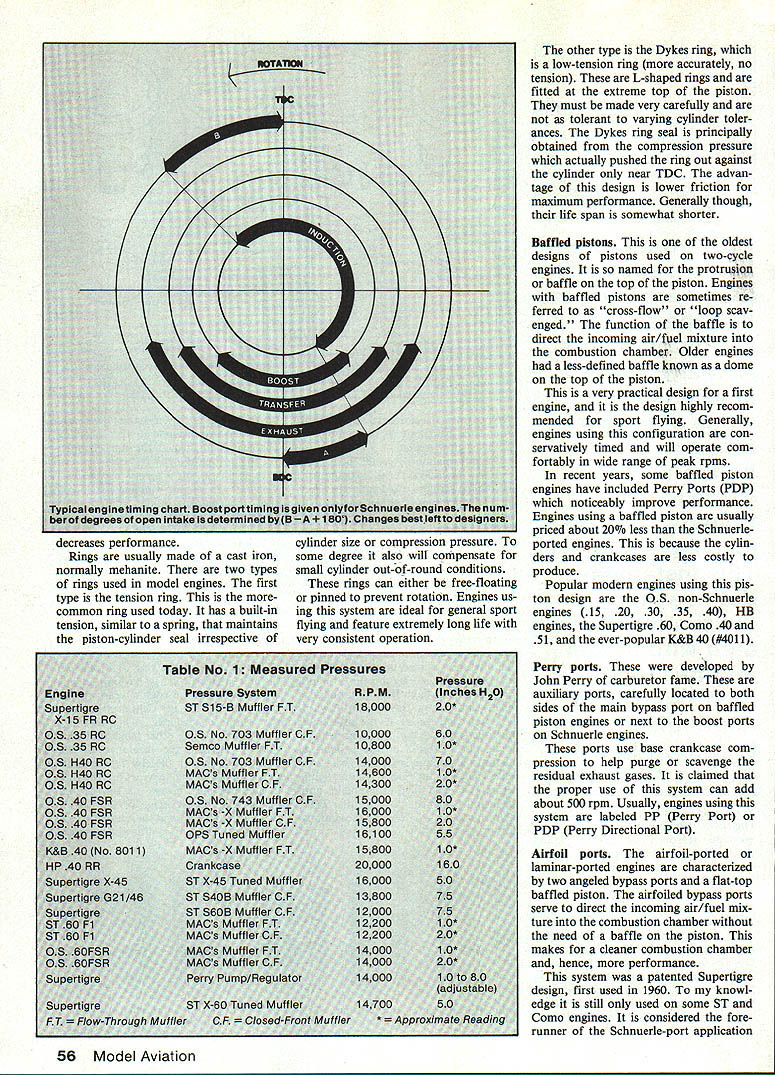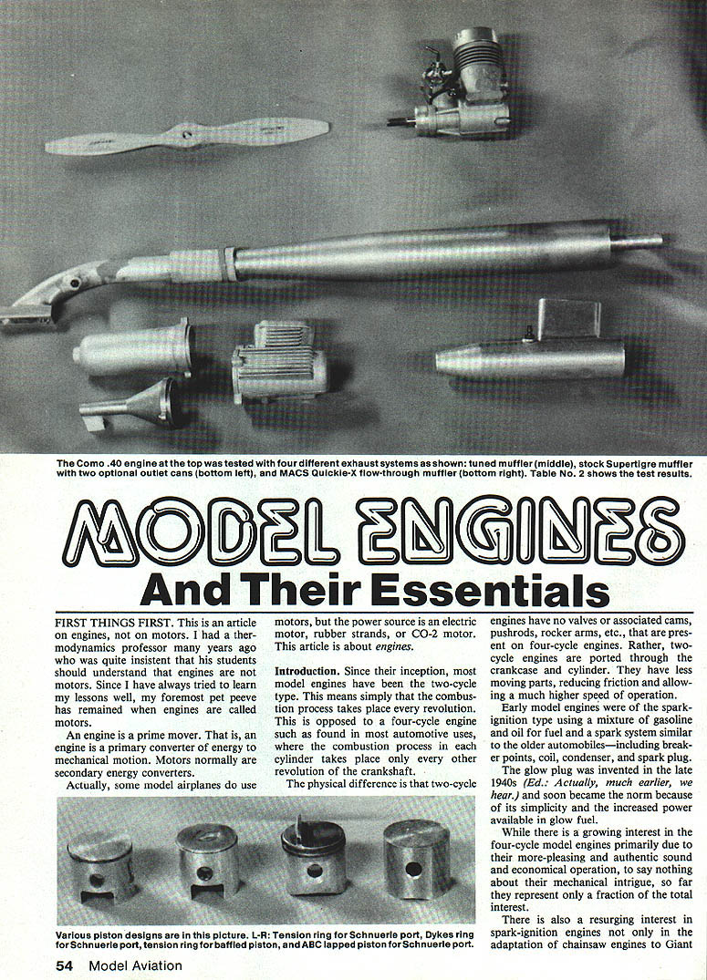 The Coma 40 engine top tested four different exhaust systems shown tuned muffler middle stock Supertigre muffler two optional outlet cans bottom left MACS Quickie-X flow-through muffler bottom right Table No 2 shows test results ~ Essentials FIRST THINGS FIRST article engines motors ther modynamics professor years ago quite insistent students should understand engines motors Since have always tried learn lessons well foremost pet peeve has remained engines called motors An engine prime mover engine primary converter energy mechanical motion Motors normally secondary energy converters Actually some model airplanes use motors power source electric motor rubber strands CO-2 motor article about engines Introduction Since inception model engines have two-cycle type means simply combus tion process takes place revolution opposed four-cycle engine such found automotive uses combustion process cylinder takes place other revolution crankshaft physical difference two-cycle engines have no valves associated cams pushrods rocker arms etc pres ent four-cycle engines Rather twocycle engines ported through crankcase cylinder have less moving parts reducing friction allow ing much higher speed operation Early model engines sparkignition type using mixture gasoline oil fuel spark system similar older automobilesincluding break er points coil condenser spark plug glow plug invented late 1940s Ed Actually much earlier hear soon became norm because its simplicity increased power available glow fuel growing interest four-cycle model engines primarily due more-pleasing authentic sound economical operation say nothing about mechanical intrigue far represent fraction total interest also resurging interest spark-ignition engines adaptation chainsaw engines Giant 54 Model Aviation Various piston designs picture L-R Tension ring Schnuerle port Dykes ring Schnuerle port tension ring baffled piston ABC lapped piston forSchnuerle port TENSiON RING DYKES RING Buzzwords Some times seems like invented experts just confound others Actually theyre shortened ver sions longer terms would too cumber some use repeatedly dis cussing subject installment defines terms associ ated model engines indepth discussions follow Part 1 John Kilsdonk Scale models conversion glow engines ignition either novelty economic reasons modern ignition systems feature significant improvements such breakerless ignition low battery drain Additionally diesel model engines have around varying degrees pop ularity almost 40 years diesel conversion kits modern glow engines available Davis Diesel Development along few dieseldesigned engines produced primarily Europe Diesels popular fuel volume weight prime considerations topics article applicable four-cycle ignition diesel engines entire article centered around backbone hobby two-cycle glow engine information presented tended describe critical components outline various consideration select ing operating model engine first step define certain terminology words' will encounter Fundamentally two-cycle model engine works like incoming fuel air mixed enter venturi carburetor front intake engines mixture inducted through port crankshaft travels through crankshaft crankcase As piston comes down positive pressure generated crankcase airfuel mixture forced up bypass port cylinder time pis ton has gone through BDC bottom dead center now traveling up towards TDC top dead center As piston its upstroke traverses bypass cylinder intake port picks up pressurized mixture compresses it gets top center mixture ignited slightly before TDC pressure builds until piston goes through TDC after TDC piston pushed down combus tion process until exhaust port un covered exhaust gases evacuated time another incoming charge going through same channels next stroke actuality very fast process Consider engine running 15000 rpm complete intake compression combustion exhaust process takes place 250 times second Before go further should define discuss some technical terms necessary understand mechanics model engines Rings Engines have lapped pistons say very precision-handfitted piston/cylinders will use piston ring rings purpose ring seal piston-cylinder fit have advan tage engine wears-in ring will maintain clearance between piston cylinder lapped ring less piston other hand will con tinually increase clearance cylinder assembly thereby losing com pression engine wears ring mounted just below top piston disadvantage ring spring tension its rubbing effect increases friction drag minutely March 1985 55 bunch different cylinderdesigns L-R K&B ABC Schnuerle Supertigre steel fora ringed baffled piston Supertigre steel Schnuerle fora ringed piston Supertigre steel airfoil port fora lapped piston OS chromed steel Schnuerlefora ringed piston Photos bysuthor etimi rees ope, decreases performance Rings usually made cast iron normally mehanite two types rings used model engines first type tension ring common ring used today has built-in tension similar spring maintains piston-cylinder seal irrespective rorsc Chu cylinder size compression pressure 1 0 some degree also will compensate small cylinder out-of-round conditions rings can either free-floating pinned prevent rotation Engines us ing system ideal general sport flying feature extremely long life very consistent operation es RPM 18000 other type Dykes ring low-tension ring accurately no tension L-shaped rings fitted extreme top piston must made very carefully tolerant varying cylinder toler ances Dykes ring seal principally obtained compression pressure actually pushed ring out against cylinder near TDC advan tage design lower friction maximum performance Generally though life span somewhat shorter Baffled pistons oldest designs pistons used two-cycle engines named protrusion baffle top piston Engines baffled pistons sometimes re ferred cross-flow loop scav enged function baffle direct incoming air/fuel mixture combustion chamber Older engines less-defined baffle known dome top piston very pract