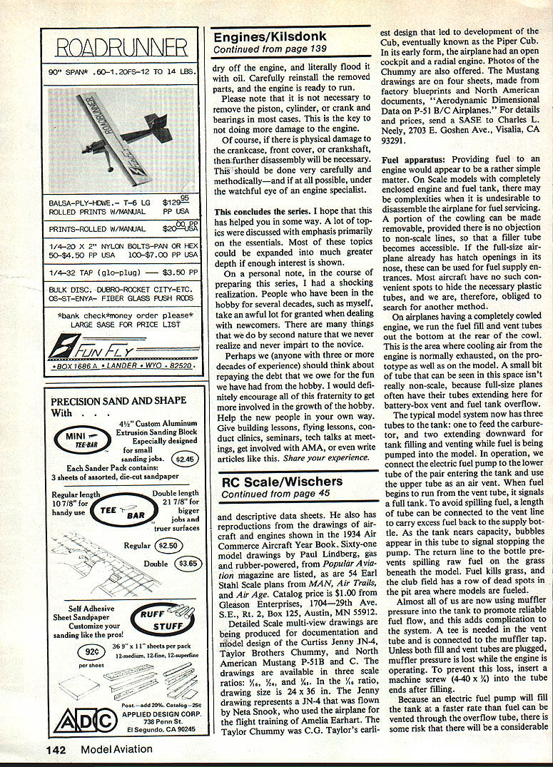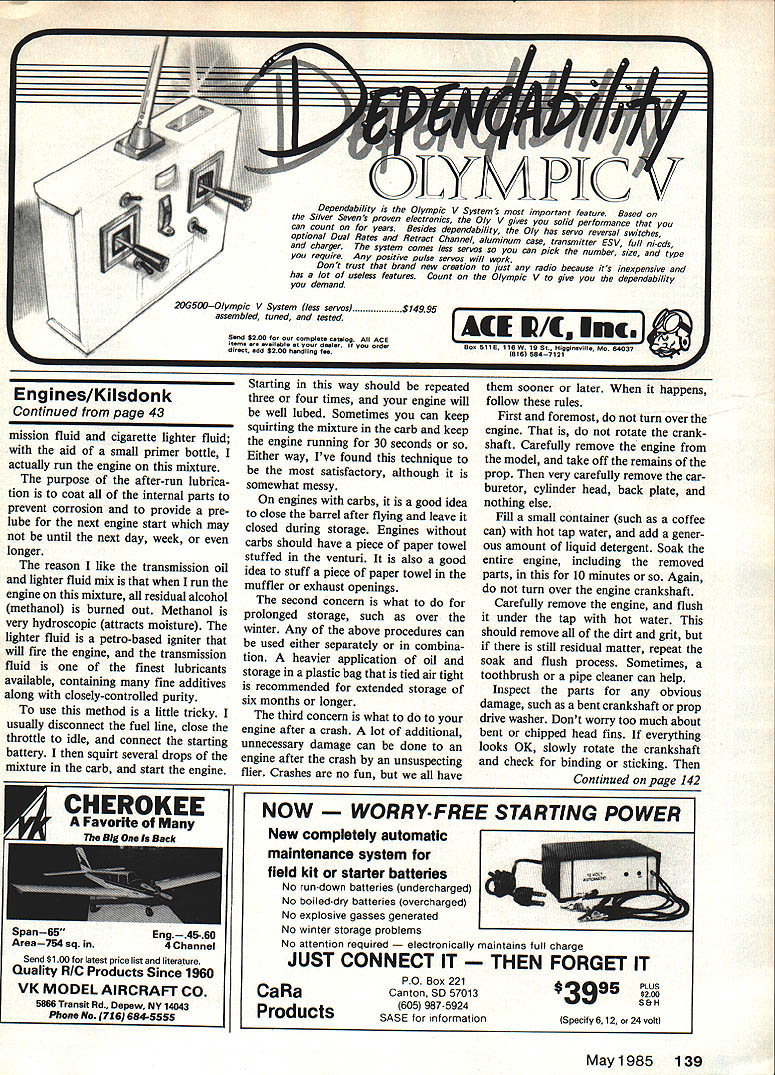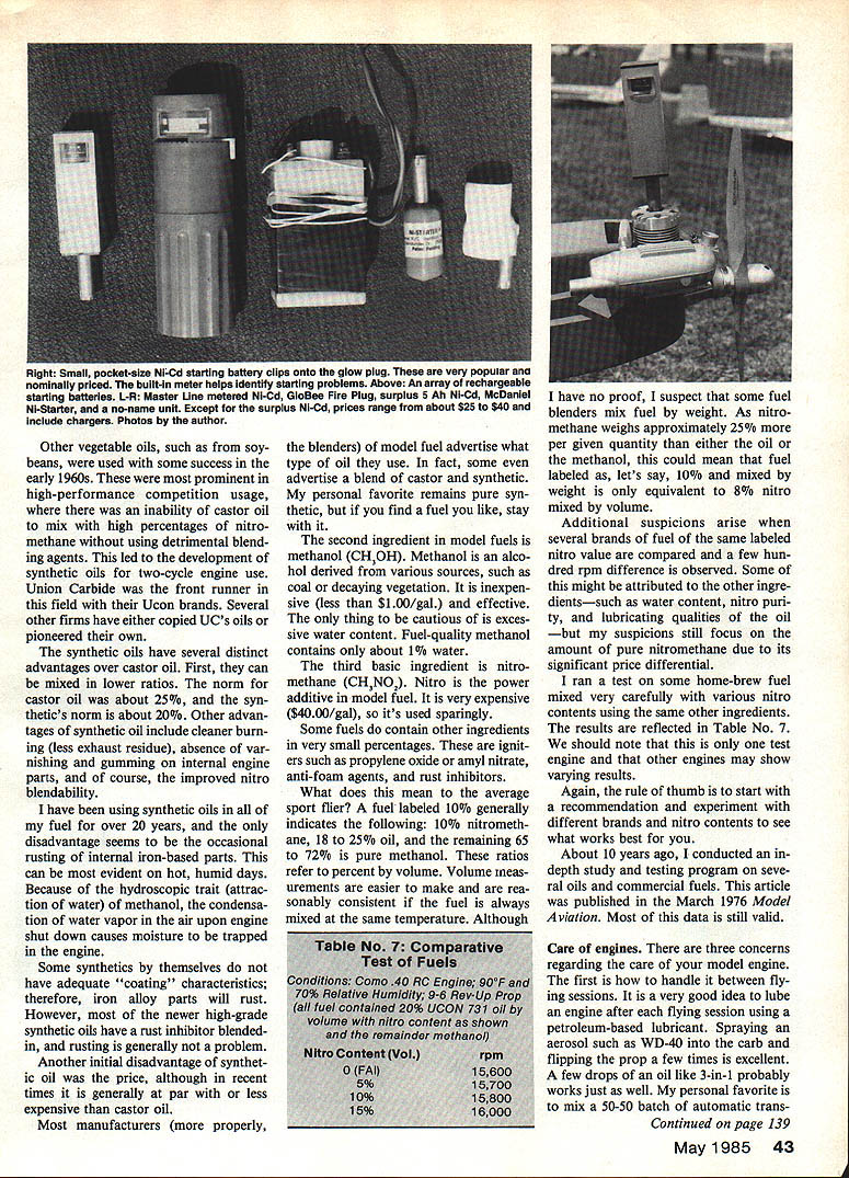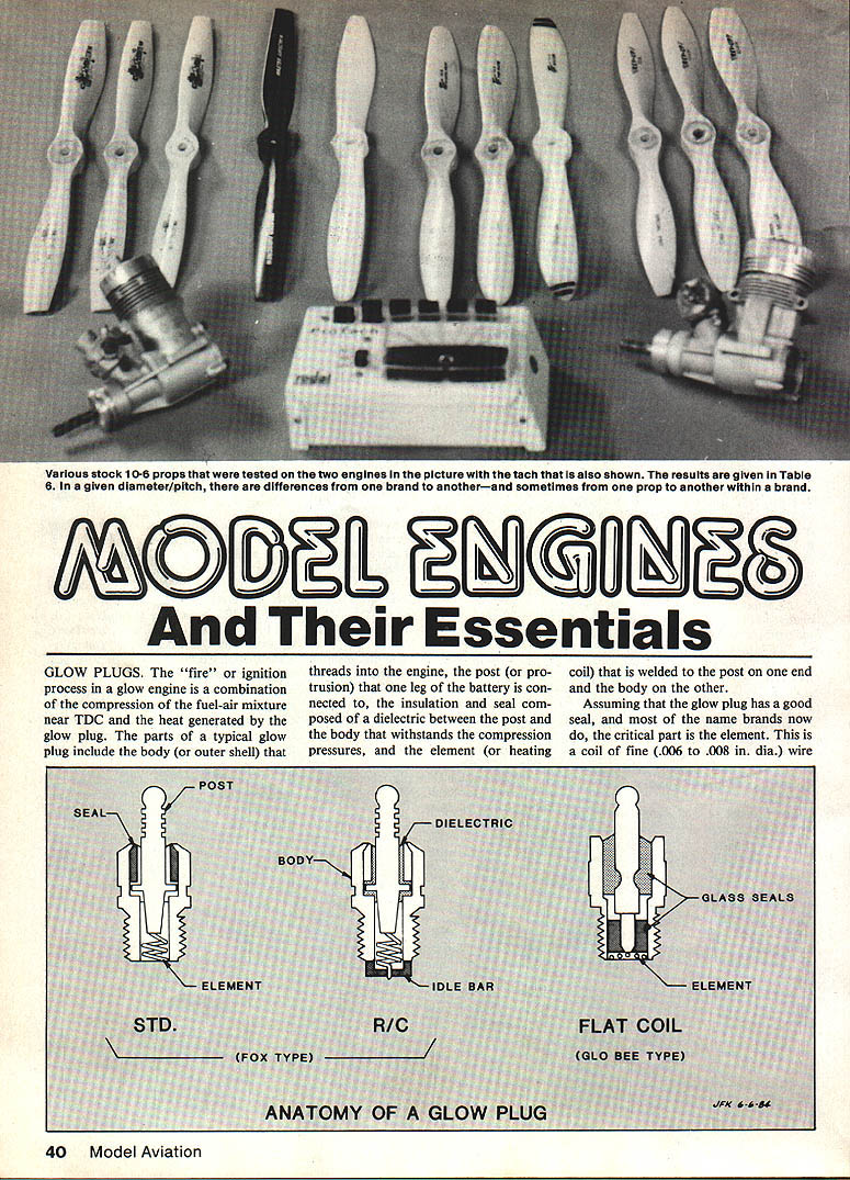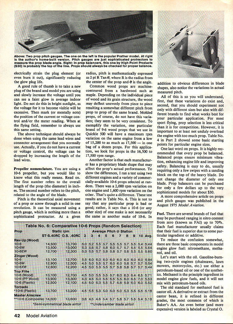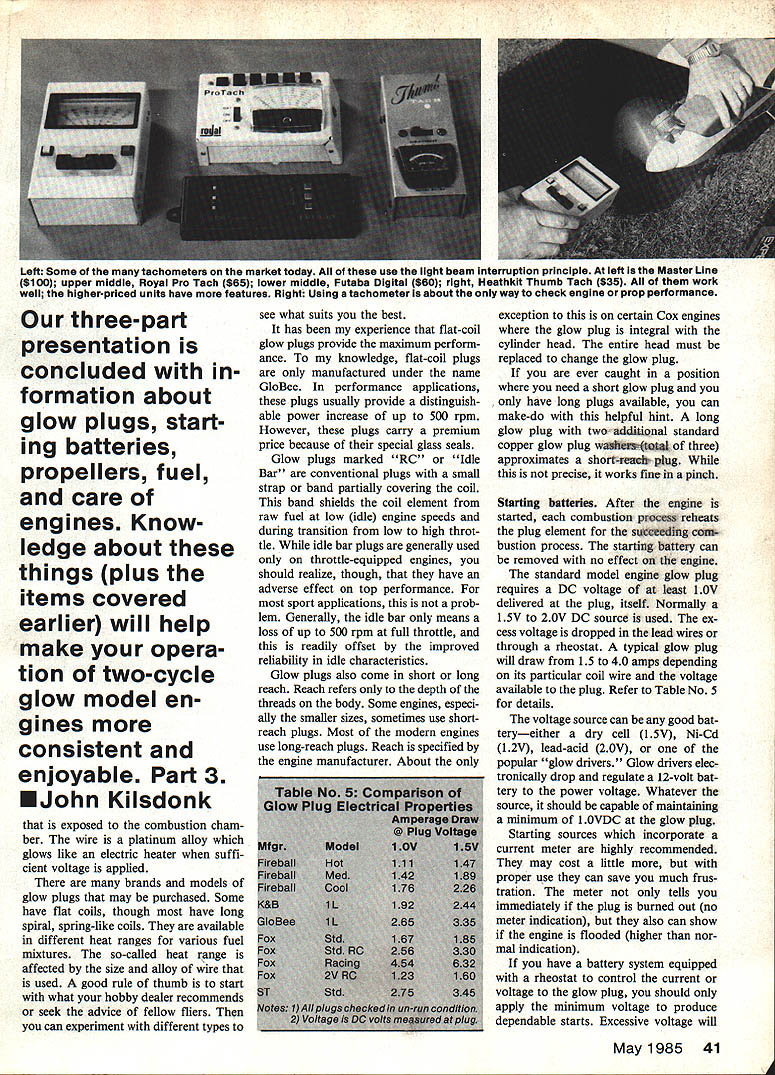 Various stock 10-6 props tested two engines picture tech also shown results given Table 6 In given diameter/pitch differences brand anotherand sometimes prop another within brand ntials GLOW PLUGS fire ignition threads engine post pro- coil welded post end process glow engine combination trusion leg battery con- body other compression fuel-air mixture nected insulation seal com- Assuming glow plug has good near TDC heat generated posed dielectric between post seal name brands now glow plug parts typical glow body withstands compression critical part element plug include body outer shell pressures element heating coil fine 006 008 dia wire 40 Model Aviation Left Some tachometers market today use light beam Interruption principle left lathe Master Line $100 upper middle Royal Pro Tach $65 lower middle Futaba Digital $60 right Heathkit Thumb Tach $35 work well higher-priced units have features Right Using tachometer about way check engine prop performance three-part presentation concluded formation about glow plugs start ing batteries propellers fuel care engines Know ledge about things plus items covered earlier will help make opera tion two-cycle glow model engines consistent enjoyable Part 3 John Kilsdonk exposed combustion cham ber wire platinum alloy glows like electric heater suffi cient voltage applied brands models glow plugs may purchased Some have flat coils though have long spiral spring-like coils available different heat ranges various fuel mixtures so-called heat range affected size alloy wire used good rule thumb start what hobby dealer recommends seek advice fellow fliers can experiment different types see what suits best has experience flat-coil glow plugs provide maximum perform ance knowledge flat-coil plugs manufactured under name GloBee performance applications plugs usually provide distinguish able power increase up 500 rpm However plugs carry premium price because special glass seals Glow plugs marked RC Idle Bar conventional plugs small strap band partially covering coil band shields coil element raw fuel low idle engine speeds during transition low high throt tle idle bar plugs generally used throttle-equipped engines should realize though have adverse effect top performance sport applications prob lem Generally idle bar means loss up 500 rpm full throttle readily offset improved reliability idle characteristics Glow plugs also come short long reach Reach refers depth threads body Some englnes especi ally smaller sizes sometimes use shortreach plugs Most modern engines use long-reach plugs Reach specified engine manufacturer About exception certain Cox engines glow plug integral cylinder head entire head must replaced change glow plug ever caught position need short glow plug have long plugs available can make-do helpful hint long glow plug two additiDnal standard copper glow plug w46~ three approximates shorr-vefr pang precise works fine pinch Starting batteries After engine started combustion pross reheats plug element stgteding ion process starting battery can removed no effect engine standard model engine glow plug requires DC voltage least 1 OV delivered plug itself Normally l5V 2OV DC source used ex cess voltage dropped lead wires through rheostat typical glow plug will draw 15 40 amps depending its particular coil wire voltage available plug Refer Table No 5 details voltage source can good bat teryeither dry cell 1 5V Ni-Cd l2V lead-acid 20V popular glow drivers Glow drivers elec tronically drop regulate 12-volt bat tery power voltage Whatever source should capable maintaining minimum 1 OVDC glow plug Starting sources incorporate current meter highly recommended may cost little proper use can save much frus tration meter tells immediately plug burned out no meter indication also can show engine flooded higher nor mal indication have battery system equipped rheostat control current voltage glow plug should apply minimum voltage produce dependable starts Excessive voltage will May 1985 41 electrically strain plug element burn out significantly reducing glow plug life good rule thumb take new plug brand model using slowly increase voltage until can see faint glow average indoor light bright sunlight voltage become visible will excessive mark mentally note position current voltage con trol and/or meter reading flying field remember always use same setting above technique should always done using same lead wires connector arrangement normally use Actually have current voltage control voltage can dropped increasing length lead wires Propeller nomenclature using 10-6 propeller would like know what really means Read first number refers overall length prop diameter inch es second number refers pitch related angle blade Pitch theoretical axial movement prop screw through solid revolution can measured using pitch gauge nothing sophisticated protractor given radius pitch mathematically expressed 2 pi R Tan 0 R radius center prop 0 angle Common wood props machinecontoured hardwood such maple Depending individual piece wood its grain structure wood may deflect unevenly piece piece resulting somewhat different pitch prop prop same brand Molded props course have varia tion seem very consistent exemplify variation particular brand 9-6 wood props use Quickie 500 will have maximum rpm variation same engine low 15200 much 17500 dozen props applica tion look props 16500 17500 rpm range Another factor manufactur er has proprietary blade shape may affect props actual performance show differences ran test using two different engines variety commer cially-available 10-6 props selected ran dom 2000 rpm variation engine 1600 rpm variation other Thats quite difference test results Table No 6 say particular prop bad good rather says 10-6 other size make necessarily same another make 10-6 C addition obvious differences blade shapes also notice variations actual measured pitch will understand first variations exist second should experiment different sizes also dif ferent brands find what w