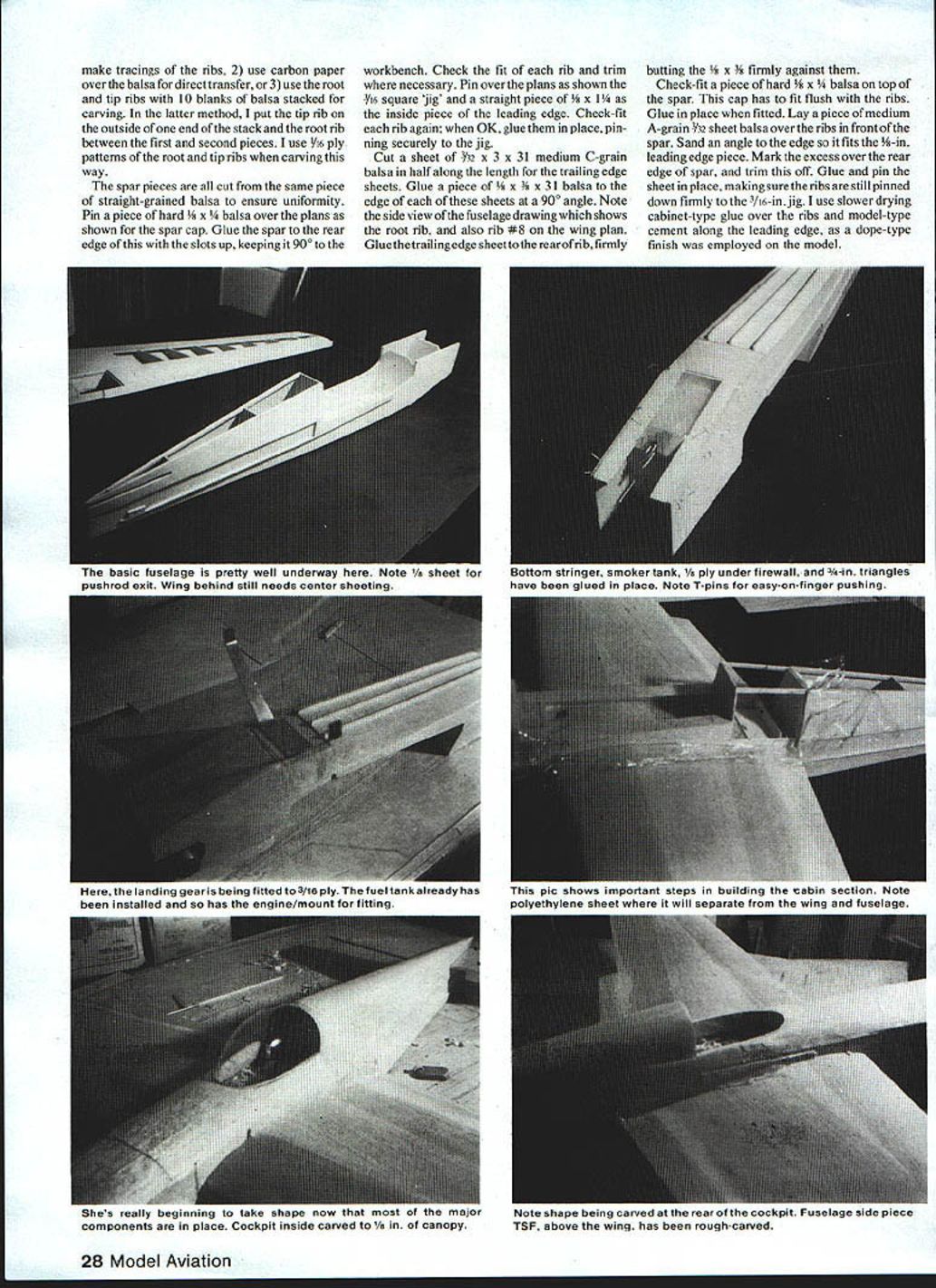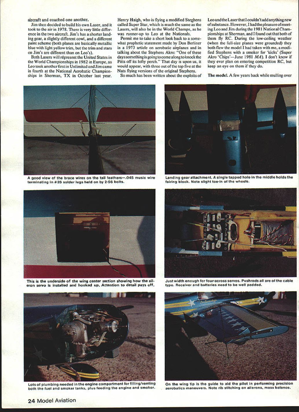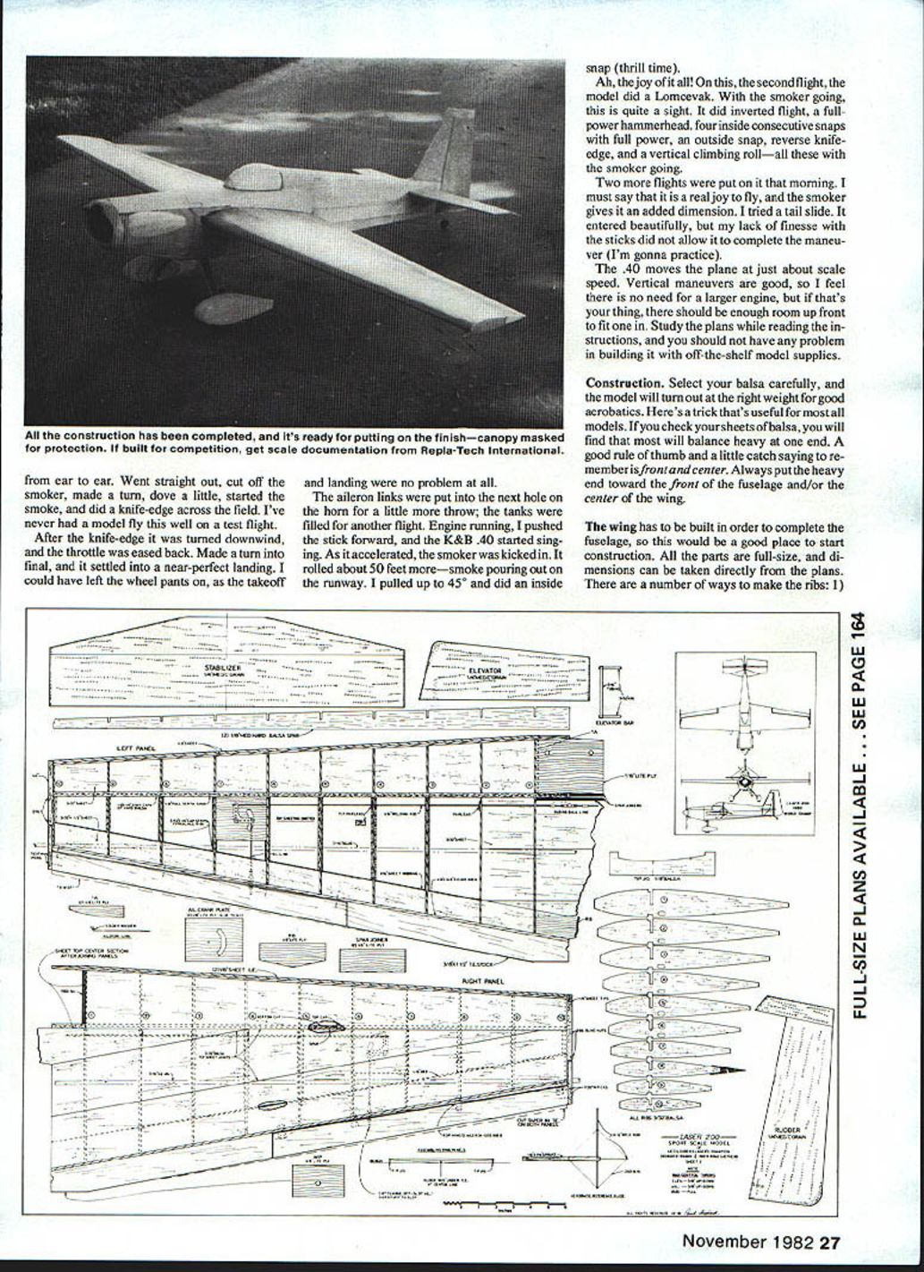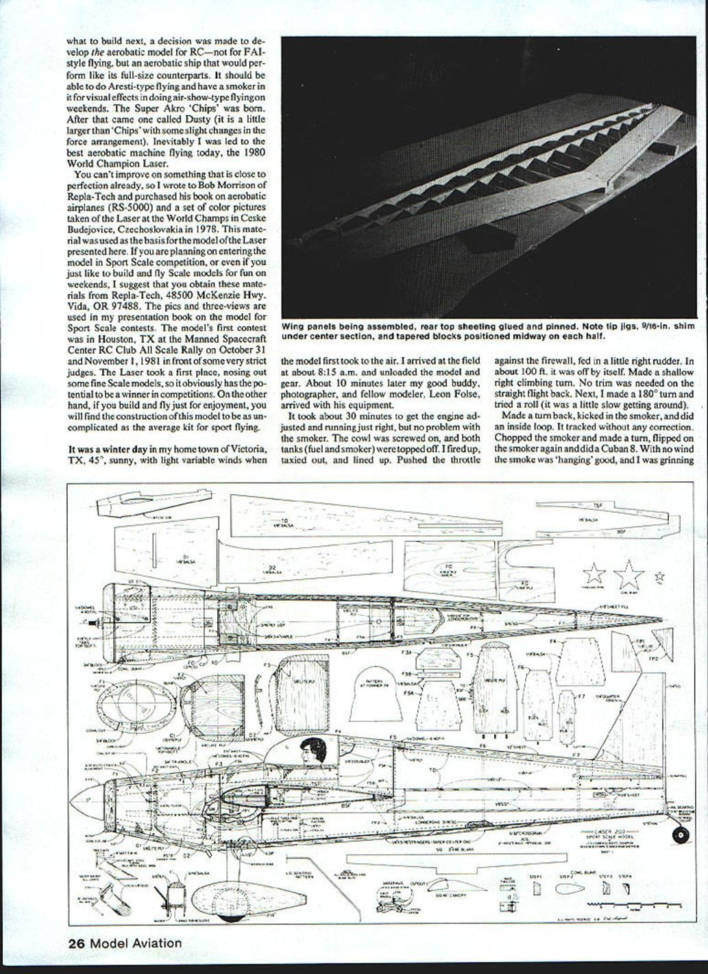 NO OCR TEXT NO OCR TEXT aircraft coached another Jim decided build own Laser took air 1978 very little differ ence two aircraft Jims has shorter land ing gear slightly different cowl different paint scheme both planes basically metallic blue light yellow trim trim stars Jims different Leos Both Lasers will represent United States World Championships 1982 Europe Leo took another first Unlimited Jim came fourth National Aerobatic Champion ships Sherman TX October last year Henry Haigh flying modified Stehens called Super Star much same Lasers will also World Champs runner-up Leo Nationals Permit take short look back some what prophetic statement made Don Berliner 1973 article aerobatic airplanes talking about Stephens Akro days something going come alongto knock Pitts off its lofty perch day upon us would appear three out top five Nats flying versions original Stephens So much has written about exploits Leo Laser couldnt add anything new substance However Ihadthe pleasure ofmeet ing Leo Jim during 1981 National Cham pionships Sherman found out both fly RC During low-ceiling weather full-size planes grounded both flew model taken modi fied Stephens smoker kicks Super Akro ChipsJune 1981 MA dont know ever plan entering competition RC keep eye model few years back mulling over ~ouu viuw urn Ln uri wr tail feathers045 music wire Landing gear attachment single tapped hole middle holds terminating #26 solder lugs held 2-56 bolts fairing block Note slight toe-in wheels Lots plumbing needed engine companment Tur TIIIIflyVflflW wing tip tne guiae aio piioi perlumlirig preurnalun both fuel smoker tanks plus feeding engine smoker aerobatics maneuvers Note rib stitching ailerons mass balance 24 Model Aviation underside wing center section showing eron servo installed hooked up Attention detail pays off Just width enough four-across servos Pushrods cable type Receiver batteries need well padded MY WI1ILLJjINb V ANUIM V lE-C tLII j IVjY I-tlNLr/ IILL Ht IPLIW BACK AFThP I6YRS AIRR71Y TO SOLO THE 15a-WTEP AAHLLBET HETALbDTI-E ME RIGHTOUTOF OF FLOAT r TOGLIAR - NE SWTF R GRT DOWNTO THE COCKP T I-fE FLYING NI 4k HEASNT r THE CUBE-f THEGROI*JD DDrYLP NEDDP DO / JULY22 2j 14HOURSYOU ~7I/\1/Ax HAVE rwOArn-fougAgjo 1-4 D BALSA FIN AND RUDDER 1/2 BALSA TJRTLE DEC TO FIN POST1/4 50 FIN POST iili / 3/32 WIRE INTO ________3/16 TUBING FOR ______________________________ELEVATOR TIE 3/32 SHEET PILOT DECK /2 BALSA COWL DECK I/B PLY AlL SERVO MOUNT 4-40 SCREWS HOLD REMOVE-ABLE COWL/8 PLYWCOD RERJFTSF FRONT AND BACK AT CENTER SECTION Fl INCUT F7 7 1/4 HARD BALSA STABILIZER AND ELEVAlOR / 3/Bx 11/2 T EDGE STOCK I/S OOfl PLATE MOUNTS AILERON BELLCRANK I/Bx 3/8 TEIX SPAR F2 I/4PLYVIUOD I- AWMINUM MOUNT F 1 1/8 LrTI PLY BACKS UP RING SiDE SHEET SPLICE 1/2 BALSA BC7IrON 3/4 BALSA SLOCK RING 7IA FOR NYLON SGREVVS 1/2 BLOCKSFP 1I/8PLYWCOD LG FILL 1/16 SHEET WEBS SIG 2 18 AWM BLANK 1 BLOCK PANTS TOP 4-40 FH SCREWS INTO TNUTS IN 1/4 PLY3/16 BALSA OUTBOARD LG MOUNT I/B Ply WCOD INBOARD WALLS ---- 7 R FROM I/4TO ZERO T-NUTS FOR SCREWS BALSA WING TIP DOUBLED I/B BALSA LEADING EDGE BUTT JOINTS OF 3/32 BALSA SKIN AILERON BEARING L4 WHEEL ON 1/16 MUSIC WIRE /850 STRINGERS 2 EACH SIDE 3/32 BOTTOM SHEET CROSS GRAIN ON 3/1650 LONGEFUNS I/B SHEET BALSA SIDES LOWER TD IS UPPER SIDES I/8X 3/B BOTTOM STRINGERS TAPER TO REAR I/B X 1/4 HARD BALSA TOP-BOTTOM SPAR CAPS 3/32BALSA RIBS I/B MED HARD SPAR HALF NOTCH OVERALLRIBS what build next decision made de velop aerobatic model RCnot FAI style flying aerobatic ship would per form like its full-size counterparts should able Aresti-type flying have smoker forvisual effects doing air-show-type flyingon weekends Super Akro Chips born After caine called Dusty little larger Chips some slight changes force arrangement Inevitably led best aerobatic machine flying today 1980 World Champion Laser cant improve something close perfection already wrote Bob Morrison Repla-Tech purchased book aerobatic airplanes RS-5000 set color pictures taken Laser World Champs Ceske Budejovice Czechoslovakia 1978 mate rial used basis forthe model ofthe Laser presented planning entering model Sport Scale competition just like build fly Scale models fun weekends suggest obtain mate rials Repla-Tech 48500 McKenzie Hwy Vida OR 97488 pics three-views used presentation book model Sport Scale contests models first contest Houston TX Manned Spacecraft Center RC Club Scale Rally October 31 November 1 1981 frontof some very strict judges Laser took first place nosing Out some fine Scale models soit obviously has po tentialtobe awinnerin competitions Ontheother hand build fly just enjoyment will find construction model un complicated average kit sport flying winter day home town Victoria TX 450 sunny light variable winds model first took air arrived field about 815 am unloaded model gear About 10 minutes later good buddy photographer fellow modeler Leon Folse arrived equipment took about 30 minutes get engine ad justed running just right no problem smoker cowl screwed both tanks fuel smoker topped off fired up taxied out lined up Pushed throttle against firewall fed littie right rudder about 100 ft off itself Made shallow right climbing turn No trim needed straight flight back Next made 1800 turn tried roll little slow getting around Made turn back kicked smoker did inside loop tracked correction Chopped smoker made turn flipped smoker again did Cuban 8 no wind smoke hanging good grinning 26 Model Aviation wing panels being assembled rear top sneeting gieo pinned Note tiP Ji95 wie-in snim under center section tapered blocks positioned midway half TSF 8SF B 02 TEUTOPLT*40410100 00 TOI sF-Fl F5A 4-0100p VS/Cr Fl1000006 ES0000F0*0F0IiI Fl4050*FTS00 78SF500 TTOLOTC0000S 1640400-4ASFR 2OO IC 00000 2048 03003 02 Coso3000030CAW.0kT000 4 00T 004004 snap thrill time Ah joy second flight model did Lomcevak smoker going quite sight did inverted flight fullpower hammerhead four inside consecutive snaps full power outside snap reverse knifeedge ve