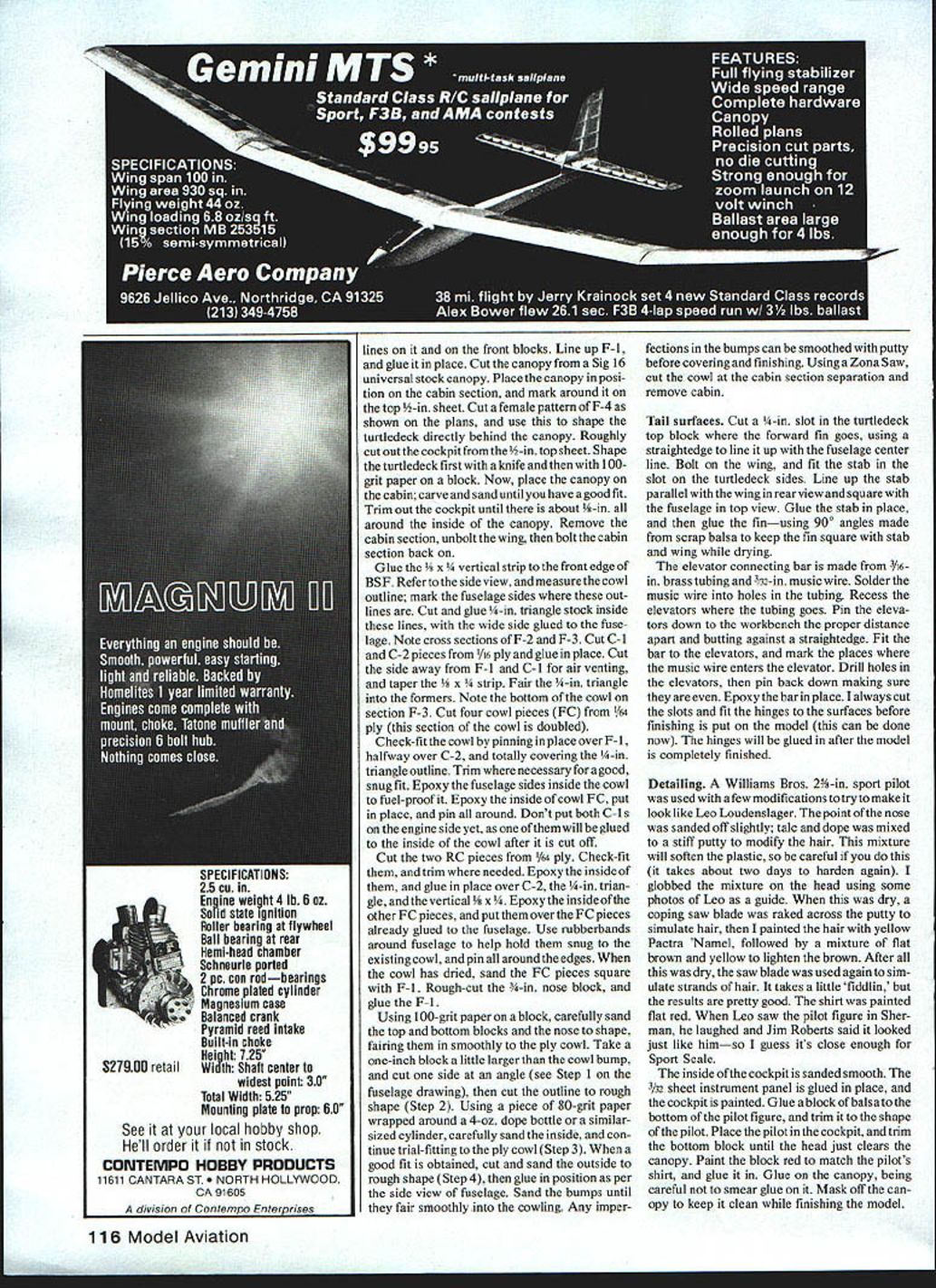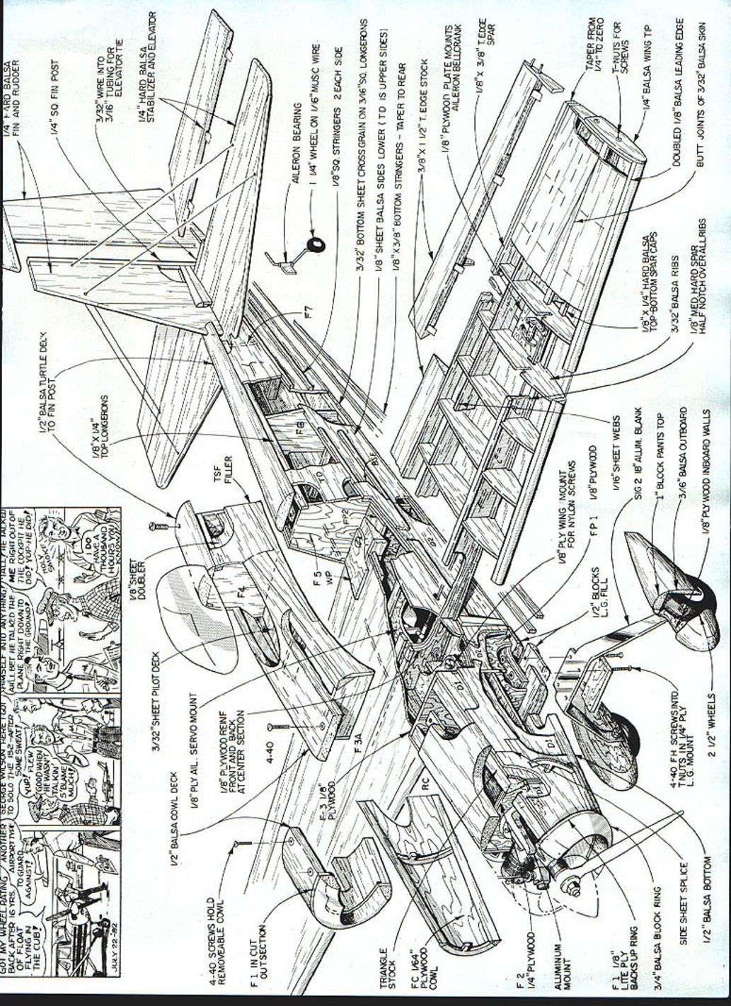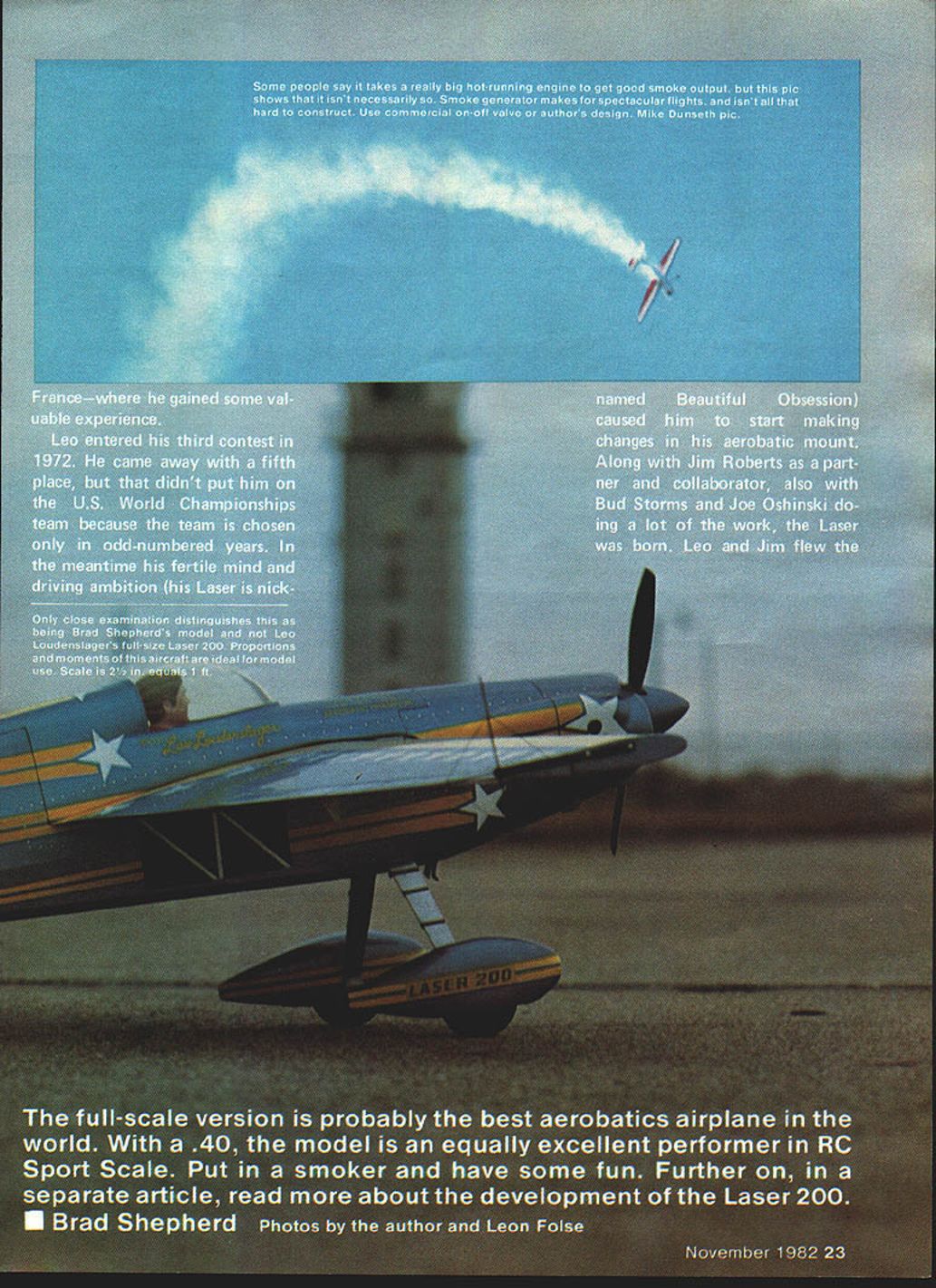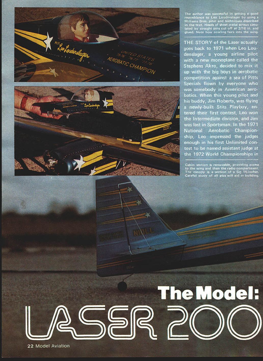 NO OCR TEXT NO OCR TEXT aircraft coached another Jim decided build own Laser took air 1978 very little differ ence two aircraft Jims has shorter land ing gear slightly different cowl different paint scheme both planes basically metallic blue light yellow trim trim stars Jims different Leos Both Lasers will represent United States World Championships 1982 Europe Leo took another first Unlimited Jim came fourth National Aerobatic Champion ships Sherman TX October last year Henry Haigh flying modified Stehens called Super Star much same Lasers will also World Champs runner-up Leo Nationals Permit take short look back some what prophetic statement made Don Berliner 1973 article aerobatic airplanes talking about Stephens Akro days something going come alongto knock Pitts off its lofty perch day upon us would appear three out top five Nats flying versions original Stephens So much has written about exploits Leo Laser couldnt add anything new substance However Ihadthe pleasure ofmeet ing Leo Jim during 1981 National Cham pionships Sherman found out both fly RC During low-ceiling weather full-size planes grounded both flew model taken modi fied Stephens smoker kicks Super Akro ChipsJune 1981 MA dont know ever plan entering competition RC keep eye model few years back mulling over ~ouu viuw urn Ln uri wr tail feathers045 music wire Landing gear attachment single tapped hole middle holds terminating #26 solder lugs held 2-56 bolts fairing block Note slight toe-in wheels Lots plumbing needed engine companment Tur TIIIIflyVflflW wing tip tne guiae aio piioi perlumlirig preurnalun both fuel smoker tanks plus feeding engine smoker aerobatics maneuvers Note rib stitching ailerons mass balance 24 Model Aviation underside wing center section showing eron servo installed hooked up Attention detail pays off Just width enough four-across servos Pushrods cable type Receiver batteries need well padded MY WI1ILLJjINb V ANUIM V lE-C tLII j IVjY I-tlNLr/ IILL Ht IPLIW BACK AFThP I6YRS AIRR71Y TO SOLO THE 15a-WTEP AAHLLBET HETALbDTI-E ME RIGHTOUTOF OF FLOAT r TOGLIAR - NE SWTF R GRT DOWNTO THE COCKP T I-fE FLYING NI 4k HEASNT r THE CUBE-f THEGROI*JD DDrYLP NEDDP DO / JULY22 2j 14HOURSYOU ~7I/\1/Ax HAVE rwOArn-fougAgjo 1-4 D BALSA FIN AND RUDDER 1/2 BALSA TJRTLE DEC TO FIN POST1/4 50 FIN POST iili / 3/32 WIRE INTO ________3/16 TUBING FOR ______________________________ELEVATOR TIE 3/32 SHEET PILOT DECK /2 BALSA COWL DECK I/B PLY AlL SERVO MOUNT 4-40 SCREWS HOLD REMOVE-ABLE COWL/8 PLYWCOD RERJFTSF FRONT AND BACK AT CENTER SECTION Fl INCUT F7 7 1/4 HARD BALSA STABILIZER AND ELEVAlOR / 3/Bx 11/2 T EDGE STOCK I/S OOfl PLATE MOUNTS AILERON BELLCRANK I/Bx 3/8 TEIX SPAR F2 I/4PLYVIUOD I- AWMINUM MOUNT F 1 1/8 LrTI PLY BACKS UP RING SiDE SHEET SPLICE 1/2 BALSA BC7IrON 3/4 BALSA SLOCK RING 7IA FOR NYLON SGREVVS 1/2 BLOCKSFP 1I/8PLYWCOD LG FILL 1/16 SHEET WEBS SIG 2 18 AWM BLANK 1 BLOCK PANTS TOP 4-40 FH SCREWS INTO TNUTS IN 1/4 PLY3/16 BALSA OUTBOARD LG MOUNT I/B Ply WCOD INBOARD WALLS ---- 7 R FROM I/4TO ZERO T-NUTS FOR SCREWS BALSA WING TIP DOUBLED I/B BALSA LEADING EDGE BUTT JOINTS OF 3/32 BALSA SKIN AILERON BEARING L4 WHEEL ON 1/16 MUSIC WIRE /850 STRINGERS 2 EACH SIDE 3/32 BOTTOM SHEET CROSS GRAIN ON 3/1650 LONGEFUNS I/B SHEET BALSA SIDES LOWER TD IS UPPER SIDES I/8X 3/B BOTTOM STRINGERS TAPER TO REAR I/B X 1/4 HARD BALSA TOP-BOTTOM SPAR CAPS 3/32BALSA RIBS I/B MED HARD SPAR HALF NOTCH OVERALLRIBS what build next decision made de velop aerobatic model RCnot FAI style flying aerobatic ship would per form like its full-size counterparts should able Aresti-type flying have smoker forvisual effects doing air-show-type flyingon weekends Super Akro Chips born After caine called Dusty little larger Chips some slight changes force arrangement Inevitably led best aerobatic machine flying today 1980 World Champion Laser cant improve something close perfection already wrote Bob Morrison Repla-Tech purchased book aerobatic airplanes RS-5000 set color pictures taken Laser World Champs Ceske Budejovice Czechoslovakia 1978 mate rial used basis forthe model ofthe Laser presented planning entering model Sport Scale competition just like build fly Scale models fun weekends suggest obtain mate rials Repla-Tech 48500 McKenzie Hwy Vida OR 97488 pics three-views used presentation book model Sport Scale contests models first contest Houston TX Manned Spacecraft Center RC Club Scale Rally October 31 November 1 1981 frontof some very strict judges Laser took first place nosing Out some fine Scale models soit obviously has po tentialtobe awinnerin competitions Ontheother hand build fly just enjoyment will find construction model un complicated average kit sport flying winter day home town Victoria TX 450 sunny light variable winds model first took air arrived field about 815 am unloaded model gear About 10 minutes later good buddy photographer fellow modeler Leon Folse arrived equipment took about 30 minutes get engine ad justed running just right no problem smoker cowl screwed both tanks fuel smoker topped off fired up taxied out lined up Pushed throttle against firewall fed littie right rudder about 100 ft off itself Made shallow right climbing turn No trim needed straight flight back Next made 1800 turn tried roll little slow getting around Made turn back kicked smoker did inside loop tracked correction Chopped smoker made turn flipped smoker again did Cuban 8 no wind smoke hanging good grinning 26 Model Aviation wing panels being assembled rear top sneeting gieo pinned Note tiP Ji95 wie-in snim under center section tapered blocks positioned midway half TSF 8SF B 02 TEUTOPLT*40410100 00 TOI sF-Fl F5A 4-0100p VS/Cr Fl1000006 ES0000F0*0F0IiI Fl4050*FTS00 78SF500 TTOLOTC0000S 1640400-4ASFR 2OO IC 00000 2048 03003 02 Coso3000030CAW.0kT000 4 00T 004004 snap thrill time Ah joy second flight model did Lomcevak smoker going quite sight did inverted flight fullpower hammerhead four inside consecutive snaps full power outside snap reverse knifeedge ve