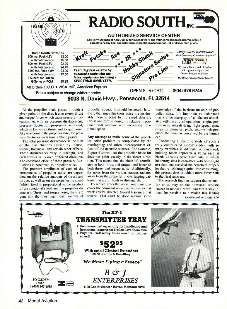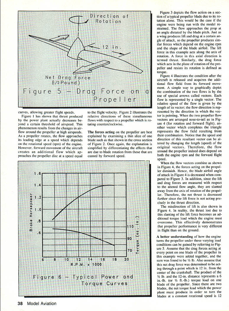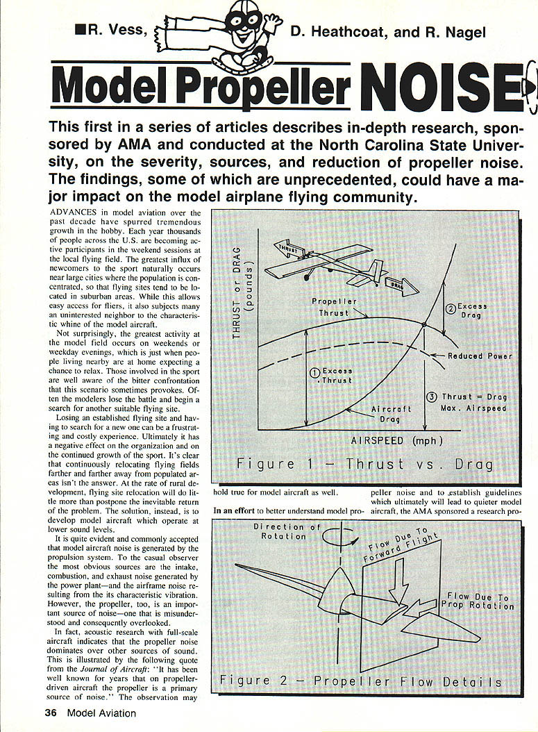 D Heathcoat R Nagel Model Propeller NOISEc first series articles describes in-depth research spon sored AMA conducted North Carolina State Univer sity severity sources reduction propeller noise findings some unprecedented could have ma jor impact model airplane_flying community ADVANCES model aviation over past decade have spurred tremendous growth hobby year thousands people across US becoming ac tive participants weekend sessions local flying field greatest influx newcomers sport naturally occurs near large cities population con centrated flying sites tend lo cated suburban areas allows easy access fliers also subjects uninterested neighbor characteris tic whine model aircraft surprisingly greatest activity model field occurs weekends weekday evenings just peo ple living nearby home expecting chance relax involved sport well aware bitter confrontation scenario sometimes provokes ten modelers lose battle begin search another suitable flying site Losing established flying site hav ing search new can frustrat ing costly experience Ultimately has negative effect organization continued growth sport Its clear continuously relocating flying fields farther farther away populated ar eas isnt answer rate rural de velopment flying site relocation will lit tle postpone inevitable return problem solution instead develop model aircraft operate lower sound levels quite evident commonly accepted model aircraft noise generated propulsion system casual observer obvious sources intake combustion exhaust noise generated power plantand airframe noise re sulting its characteristic vibration However propeller too impor tant source noiseone misunder stood consequently overlooked fact acoustic research full-scale aircraft indicates propeller noise dominates over other sources sound illustrated following quote Journal Aircraft has well known years propellerdriven aircraft propeller primary source noise observation may 36 Model Aviation gu hold true model aircraft well effort better understand model pro Di recti Ro tat peller noise establish guidelines ultimately will lead quieter model aircraft AMA sponsored research pro Table 1Selected Flight Test Data Prop Velocity RPM QASPI kmphdBA Group 1 11 x5180160001110 9x7519516400960 9x719016250934 Group 2 10x615013500878 11 x614312000990 Group 3 10x712011000840 9x7512011250810 10x612010800764 Group 4 11 x 5908500925 9 x 7908700830 gram conducted North Carolina State Uni versity principal investigators include Dr Robert T Nagel associate professor nearly 15 years research experience aeroacoustics Robert Vess aero space engineer six years experience coordinator NC State University aerospace laboratories 18 years activ ity Radio Control including Pattern Hel icopter fun fly competition David M Heathcoat received bachelors degree physics NC State University 1986 participated propeller noise research masters degree thesis article first series will describe tests performed explain results make recommendations toward reducing model aircraft noise Im proving noise problem means averting loss flying sites will depend largely having knowledgeable fliers Due technical nature mate rial will precede discussion test program details brief explanation basic propeller theory Introducing some important aspects propeller per formance section will lead better understanding both current study propellers general Since formulas scientific jargon tend limit interest type article effort has made avoid use Basic Propeller Theory order aircraft move through air propelling force must work propeller essentially small rotating wing produces required thrust speed aircraft level flight deter mined relating thrust available power plant total aircraft drag Note both forces vary signifi cantly airspeed depicted typi cal aircraft Figure 1 example moving left right along horizontal axis Figure 1 represents increasing airspeed notes aircraft drag increases eventually exceeds thrust Point 1 figure represents case air craft accelerating since thrust pro duced propeller much greater aircraft drag Conversely aircraft operating point 2 predominance drag over thrust causes decelerate cases airspeed will stabi lize point 3 thrust drag equal Since engine example full throttle point 3 represents maximum tainable airspeed aircraft/engine/ propeller combination level flight re duction power below full throttle ef fectively shifts thrust curve downward resulting reduction maximum airspeed see dashed curve Figure 1 Similarly anything can done pro duce thrust less drag will shift December 1989 37 Figu curves allowing greater flight speeds Figure 1 has shown thrust produced power plant actually decreases yond certain threshold airspeed phenomenon results changes air flow around propeller high airspeeds As propeller rotates flow approaches its leading edge speed depends rotational speed rpm engine However forward movement aircraft creates additional flow ap proaches propeller disc speed equal forces acting propeller best explained examining thin slice blade such shown cross section Figure 2 Once again explanation simplified differentiating effects due blade rotation caused forward speed Figure 3 depicts flow action sec tion typical propeller blade due its ro tation alone would case engine being run model re strained flow approaches prop angle dictated blade pitch Just wing produces lift drag certain gle attack propeller produces sim ilar forces depend engine rpm shape blade airfoil lift force example acts along axis rotation force axial direction termed thrust Similarly drag force acts plane rotation pro peller resists its rotation defined torque Figure 4 illustrates condition after aircraft released acquires addi tional flow field its forward move ment simple way graphically depict combination two flows use special arrows called vectors flow represented single vector relative speed flow given length its vector flow direction rep resented direction vec tor pointing two propeller flow vectors arranged nose-to-tail Fig ure