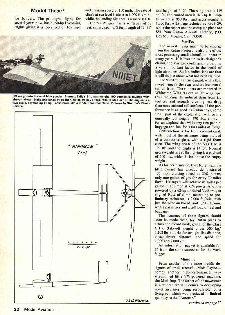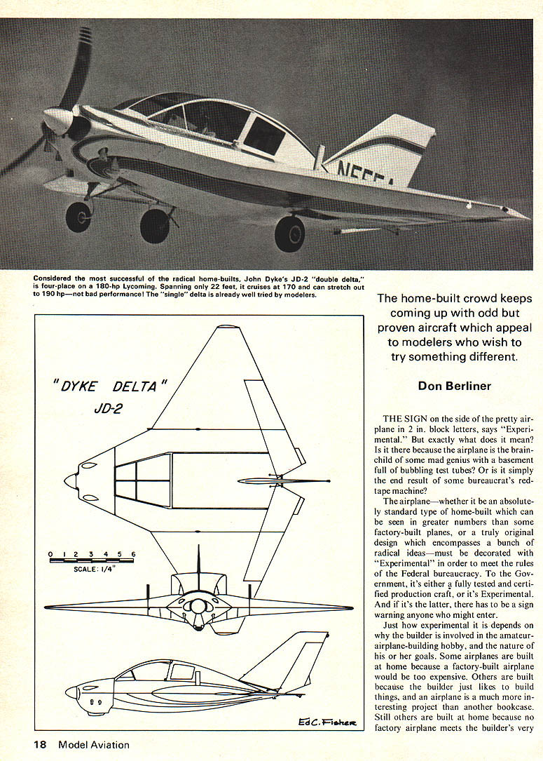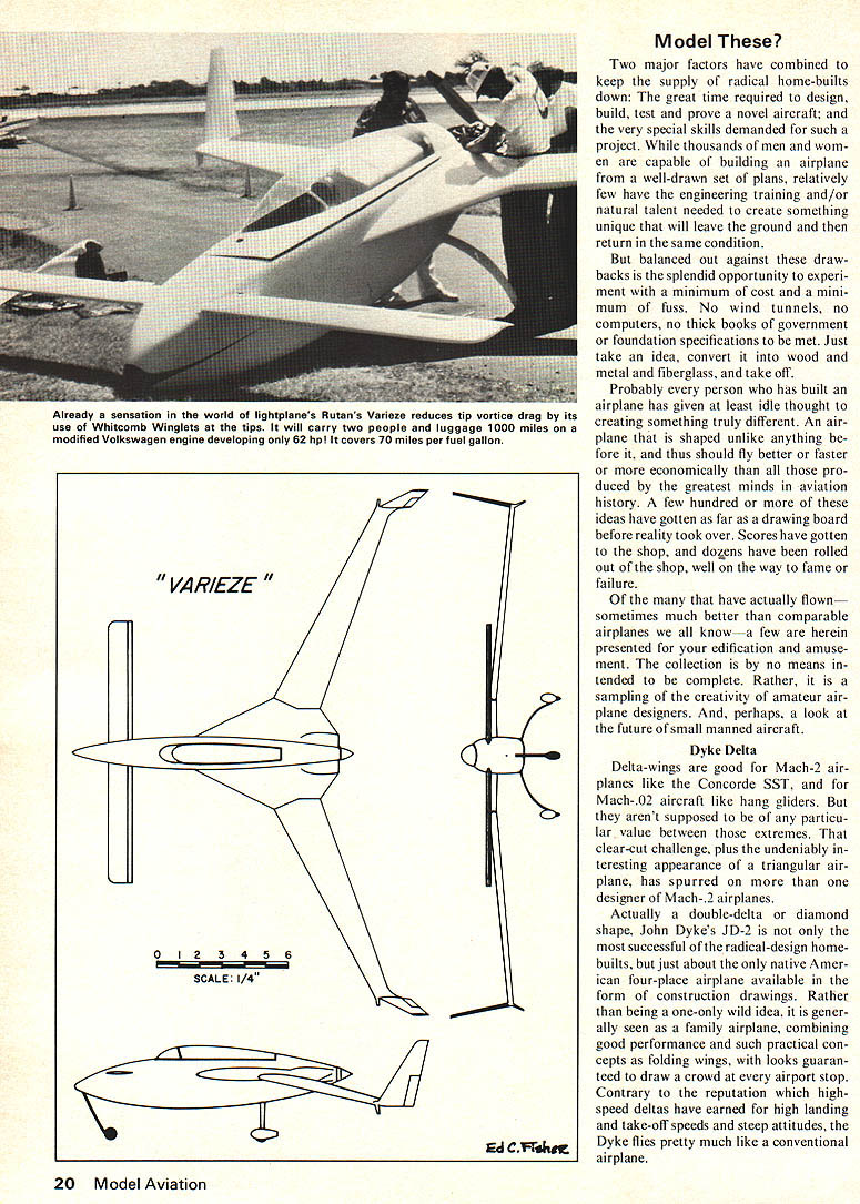Considered successful radical home-builts John Dykes JD-2 double delta four-place 180-hp Lycoming Spanning 22 feet cruises 170 can stretch out 190 hpnot bad performance single delta already well tried modelers home-built crowd keeps DYKE DEL TA U 0123456 C Fihaq coming up odd proven aircraft appeal modelers wish try something different Don Berliner THE SIGN side pretty air plane 2 block letters says Experi mental exactly what does mean because airplane brain child some mad genius basement full bubbling test tubes simply end result some bureaucrats redtape machine airplanewhether absolute ly standard type home-built can seen greater numbers some factory-built planes truly original design encompasses bunch radical ideasmust decorated Experimental order meet rules Federal bureaucracy Gov ernment its either fully tested certi fled production craft its Experimental its latter has sign warning anyone might enter Just experimental depends builder involved amateurairplane-building hobby nature goals Some airplanes built home because factory-built airplane would too expensive Others built because builder just likes build things airplane much teresting project another bookcase Still others built home because no factory airplane meets builders very 18 Model Aviation ese special needs few built because head designer/builder simply bursting unusual ideas can tried out genuinely Experimen tal flying machine give devil its due Federal Aviation Agency places fewer restrictions design construction use home-built airplanes does com parable agency other countrys gov ernment As long airplane built accepted standards using aircraft-quality materials used educational recreational purposes Feds wont get way true creativity fact dont have anything say about design home-built airplane some pilot willing risk neck flying airplane probably shouldnt leave ground thats business cause its neck course before hes allowed carry passengers take trip airplane must tested least 50 hours show flyable rea sonably safe fly weird-looking thing just takes eager pilot solid airframe Because scarcity foolhardy pilots airplane builders willing risk four five years work long shot chance success havent bad designs 20 years Experimental Aircraft Asso ciation have fair number radical designs created men women FAA percentage air planes having major new ideas has never very great now home-builts flying just 1% would amount lot unusual aircraft currently 4500 amateur-built aircraft licensed US double num ber active airliners turn page VA RIVIGGEN czccIzzzD LU 7Th 0123456 SCALE 1/4 J II February 1976 19 Burt Rutans Variviggen variation delta theme exemplified Swedish SAAB Viggen Mach-2 fighter canard-delta combo stable model real plane cannot spinor stahl Model Two major factors have combined keep supply radical home-builts down great time required design build test prove novel aircraft very special skills demanded such project thousands men wom en capable building airplane well-drawn set plans relatively few have engineering training and/or natural talent needed create something unique will leave ground return same condition balanced out against draw backs splendid opportunity experi ment minimum cost mini mum fuss No wind tunnels no computers no thick hooks government foundation specifications met Just take idea convert wood metal fiberglass take off Probably person has built airplane has given least idle thought creating something truly different An air plane shaped unlike anything fore thus should fly better faster economically pro duced greatest minds aviation history few hundred ideas have gotten far a drawing board before reality took over Scores have gotten shop doens have rolled out shop well way fame failure have actually flown sometimes much better comparable airplanes know few herein presented edification amuse ment collection no means tended complete Rather sampling creativity amateur air plane designers perhaps look future small manned aircraft Dyke Delta Delta-wings good Mach-2 air planes like Concorde SST N4ach-02 aircraft like hang gliders arent supposed particu lar value between extremes clear-cut challenge plus undeniably teresting appearance triangular air plane has spurred designer Mach-2 airplanes Actually double-delta diamond shape John Dykes JD-2 successful radical-design home builts just about native Amer ican four-place airplane available form construction drawings Rather being one-only wild idea gener ally seen family airplane combining good performance such practical con cepts folding wings looks guaran teed draw crowd airport stop Contrary reputation highspeed deltas have earned high landing take-off speeds steep attitudes Dyke flies pretty much like conventional airplane 20 Model Aviation Already sensation world Iightplanes Rutans Varieze reduces tip vortice drag its use Whitcomb Winglets tips will carry two people luggage 1000 miles modified Volkswagen engine developing 62 hp covers 70 miles per fuel gallon VA RIEZE 0123456 SCALE 1/4 Ed CFlha may easiest airplane build loaded strangely-shaped parts construction welded steel tubing covered fiberglass just like alot airplanes ordinary shapes Powered standard 180-hp Lycoming engine will cruise 170 mph top out 190 mph land about 70 mph Cruis ing range 75% power 700 miles service ceiling 14000 feet Dyke Delta has wingspan 22 feet length 19 feet height 6 feet wing area 180 sq ft Empty weight 1000 lbs gross weight 1750 lbs will carry 41 gallons fuel An informa tion packet $3 full plans $125 J Dyke 2840 Old Yellow Springs Road Fairborn Ohio 45234 VariViggen Another variation delta theme Burt Rutans two-seat VariViggen based sensational-performing Swedish SAAB Viggen Mach-2 fighter Like big fast Rutans home-built canard-delta thats about end similarity turbojet Viggen designed maximum performance VariViggen shines brightest low end speed range Its handling character istics slow 50 mph truly remark able Rutans demonstrations maneu verability low speed air shows sure w