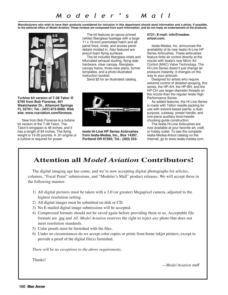 columns, “Focal Point” submissions, and “Modeler’s Mall” product releases. We will accept these in