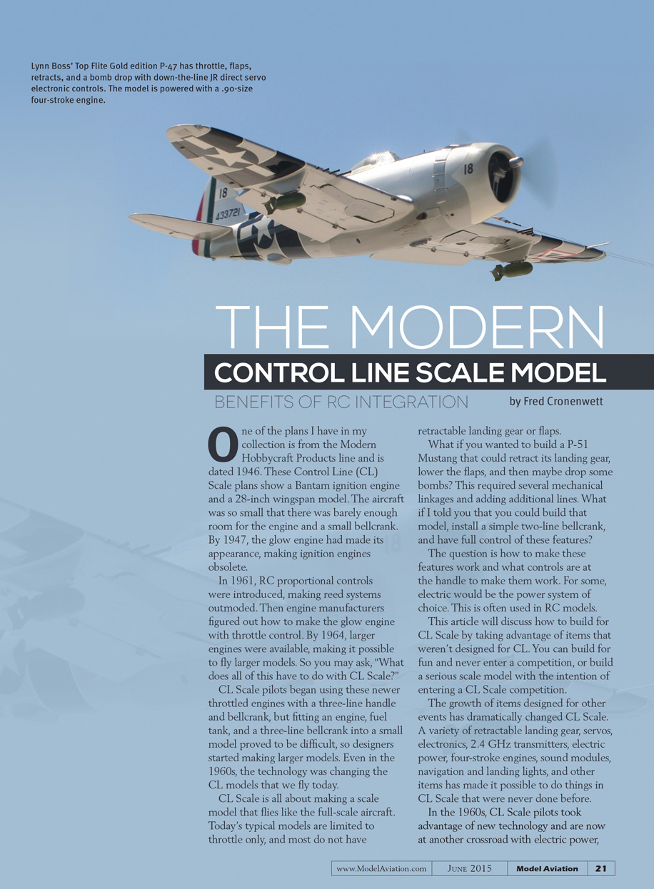 The growth of items designed for other events has dramatically changed CL Scale. The variety of retractable landing gear, servos, electronics, 2.4 GHz transmitters, electric power, four-stroke engines, sound modules, navigation and landing lights, and other items have made it possible to do things in CL Scale that were never done before.
