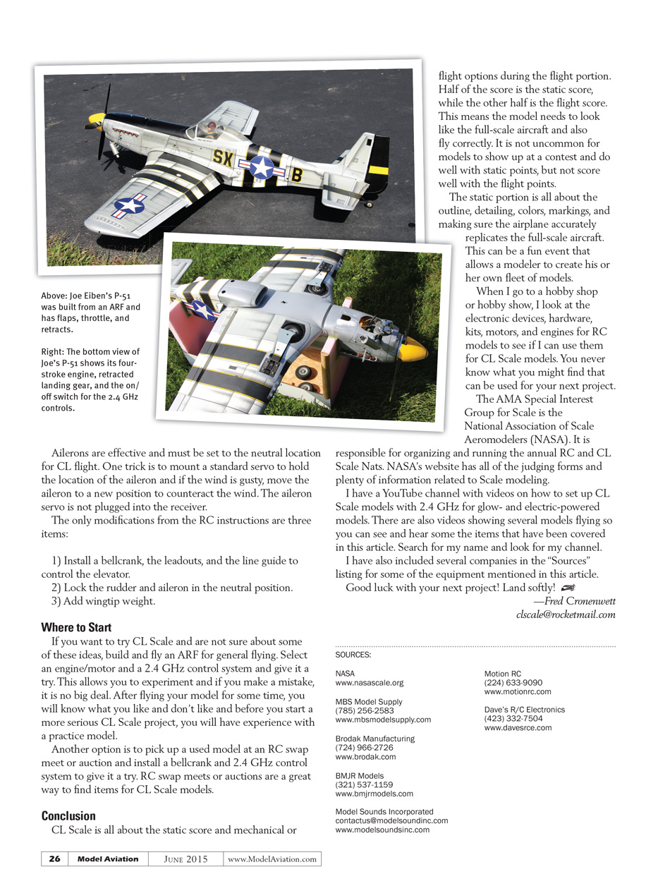 I have a YouTube channel with videos on how to set up CL Scale models with 2.4 GHz for glow and electric-powered models. There are also videos showing several models flying so you can see and hear some the items that have been covered in this article. Search for my name and look for my channel.