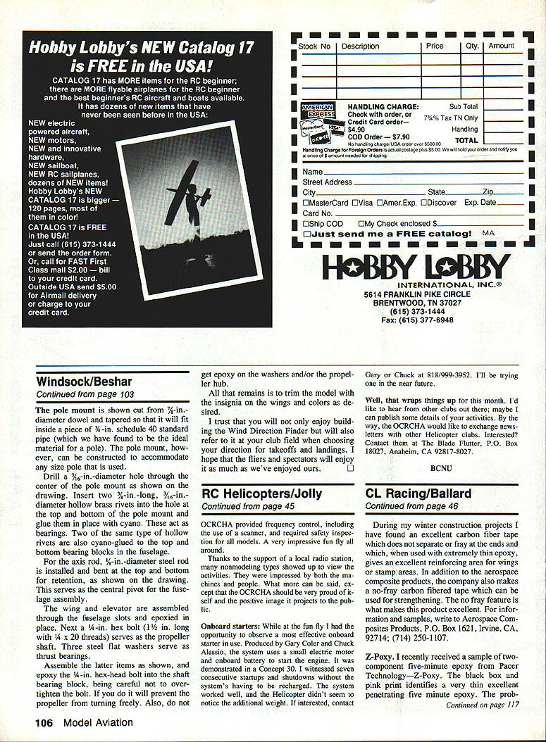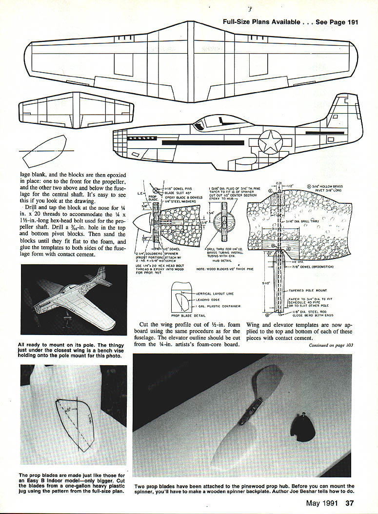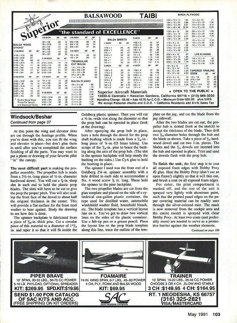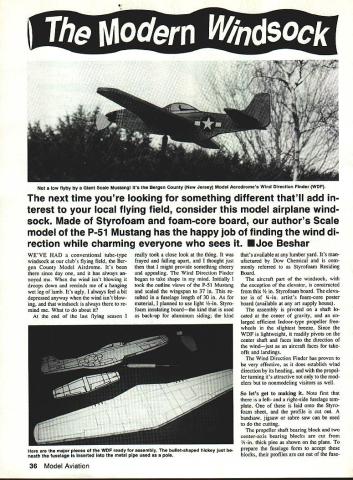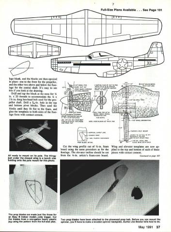 The next time youre looking something different thatll add terest local flying field consider model airplane wind sock Made Styrofoam foam-core board authors Scale model P-51 Mustang has happy job finding wind di rection charming everyone sees EJoe Beshar WEVE HAD conventional tube-type windsock clubs flying field Ber gen County Model Airdrome Its since day has always noyed wind isnt blowing droops down reminds hanging wet leg lamb Its ugly always feel bit depressed anyway wind isnt blow ing windsock always re mind What about end last flying season really took close look thing frayed falling apart thought just might provide something cheery appealing Wind Direction Finder began take shape mind Initially took outline views P-5 1 Mustang scaled wingspan 37 re sulted fuselage length 30 As material planned use light /2-in Styro foam insulating boardthe kind used back-up aluminum siding kind thats available lumber yard Its man ufactured Dow Chemical com monly referred Styrofoam Residing Board aircraft part windsock exception elevator constructed /2 Styrofoam board eleva tor A-in artists foam-core poster board available art supply house assembly pivoted shaft lo cated center gravity en larged efficient Indoor-type propeller freewheels slightest breeze Since WDF lightweight readily pivots center shaft faces direction windjust aircraft faces take offs landings Wind Direction Finder has proven very effective does establish wind direction its heading propel ler turning its attractive mod elers nonmodeling visitors well So lets get making Note first left- right-side fuselage tem plate laid onto Styro foam sheet profile cut out bandsaw jigsaw sabre saw can used cutting propeller shaft bearing block two center-axis bearing blocks cut -in thick pine shown plans prepare fuselage form accept blocks profiles cut out fuse36 Model Aviation low flyby Giant Scale Mustang Its Bergen County New Jersey Model Aerodromes Wind Direction Finder WDF major pieces WDF ready assembly bullet-shaped hickey just neath fuselage inserted metal pipe used pole Full-Size Plans Available Page 191 uzi~u lage blank blocks epoxied place front propeller other two above below fuse lage central shaft Its easy see look drawing Drill tap block nose x 20 threads accommodate x 1 /2-in-long hex-head bolt used pro peller shaft Drill Y16-in hole top bottom pivot blocks sand blocks until fit flat foam glue templates both sides fuse lage form contact cement ready mount its pole thingy just under closest wing bench vise holding onto pole mount photo prop blades made just like Easy B indoor modelonly bigger Cut blades one-gallon heavy plastic jug using pattern full-size plan jI/I6 DOWEL PINSI I3/IR GIA PLUS OF 7/IA TH PINE LE BLADE SLOT 45TAPER TO FIT ID OF SPINNER PR~1GUT OUT I/D CENTER SECTION EPOST BLADE B DOWELSEPOXY TO HUB \BLADEI/4STEE WNSHERS 1-Y I 3/4 S/B 2- NA PORTIONPATTACH WI WITH OTA T7 lID DOWEDRHRIJ FOR I/A 10 GOLDBERGGPINNERTUBING INSTALL 4 S/B WDSCREWHUB DETAIL USE I/4 DO HEX HEAD BOLT THREAD B EPOXY INTO WOOD FOR PROP NUT NOTE WOOD BIflORS lID THICK PINE VERTICAL LAYOUT LINE LEADING EDGE SAL PLASTIC CONTAINER PROP BLADE DETAIL Cut wing profile out h-in foam board using same procedure fuselage elevator outline should cut A-in artistss foam-core board OG131 3/I6 HOLLOW BRASS RIVET 3IB LONG i 442 i-3/IR LGA DRILLTI4RU 1lI DI/rh 00 -6 ID DIA 7/B DOWEL BROOMSTICK II II S 1/2 II TAPERED POLE MOUNT TAPER TO 3/4 DIA TO FIT ORISUIT OTHER POLE SCHEDULE 40 PIPE DIA STEEL ROD BEND BOTH ENDS Wing elevator templates now ap plied top bottom of pieces contact cement Two prop blades have attached pinewood prop hub Before can mount spinner youll have make wooden spinner backplate Author Joe Beshar tails May 1991 37 7 Continued page 103 BALSA WOOD TAIBI iT2iIIIm~wI LW ~i/6-INCH 1/8 1/8 BALSA WOOD1/6 3/16 STICKS1/6 1/4 1/6 3/8 1/16-INCH3648 1/8 1/2 1/181/16061/8 3/4 1/163/32073/16-INCH 1/16 1/809121/16 3/161014 3/16 3/16 1/16 1/41116 3/16 1/4 1/16 3/61418 3/163/8 1/16 1/21701 3/16 1/2 1/16 3/42230 3/163/4 3/32-INCH3648 1/4-INCH 3/323/3009121/4 1/4 3/32 1/610141/43/6 3/323/1611161/41/2 3/32 1/41417 1/4 3/4 3/32 3/81020 3/32 722 5/16-INCH 3/32 3/42533 5/165/16 Dorrole Raise Wod5/16 3/8 P,cs Sprrrce 5/161/2 cod 6a,r,d SIre,5/16 3/4 3648 0912 1216 1416 1722 1826 2635 3648 14 16 15 20 17 22 21 27 30 41 36 48 1722 1927 2231 3446 3646 23 29 25 32 30 39 42 56 3/6-INCH 3/6 3/6 1/2 3/6 3646 29 40 33 44 47 64 1/2-INCH3648 1/2 052 1/2 3/45675 TRIANGULAR CUT BALSA 1/41/43627 3/9 36 31 1/2 1/236 40 3/4 36 50 113665 BALSA PLANKS 3/4336190 1236175 1336246 1436324 2236246 2336352 2436496 3336524 3436726 BALSA SHEETS 1-INCH 1/16 1 3/32 1 3/16 4 3/6 2 1 2-INCH 3-INCH 36481/32 /163 29 393/32 431/63 35473/16 521/43 44 615/163 57773/8 941/23 36484-INCH 3646 4357 4662 56 75 64 66 77 102 90 120 110 143 126 171 161214 3648 BIRCH PLY WOOD 1/64 12 12195 1/641224369 1/641246601 1/644646 3254 1/3261264 1/32 12 12127 1/32 24257 1/321246506 1/16612 63 1/161212125 1/161224250 1/16 1246550 3/3261297 3/32 12 12194 3/32 4367 3/32 6774 1/66 12107 1/6 122 13 1/6 24425 1/6 1246650 3/16612 79 3/16 12 12156 3/161224314 3/16 1246626 1/461277 1/4 2156 1/4 1224314 1/41249626 3/61212193 3/6 4365 3/6 1246770 1/2 2216 1/21224433 1/2 1246665 LIrE PLYWOOD 1/6121262 1/6 1224164 1/6 326 1/32 43 1/32 93TAPERED TRAILING 1/14239 511/164 76106EDGE3646 3/322 44563/324 86117 1/6249641/641021351/61/2 2432 3/16256773/164122 1623/16 3/43143 1/4267901/44145 2071/414256 3/6262 1103/64195 2905/16 11/44765 1/221211611/24234 3463/911/25677 Superior Aircraft Materials * OPEN TO THE PUBLIC * 12020-G Centralia iian Gardens California 90716 865-3220 Handling Charge $500 $375 COD mum Order $2000 plus UPS accept Personal checks COD fornia Residents add 6Vz% Sales Tax Wi ndsocklBeshar Continued page 37 point wing elevator slots Cut through fuselage profile youre done can fit wing elevator placebut dont glue until after youve completed surface finishing parts may want put photo drawing favorite pilot canopy difficult 