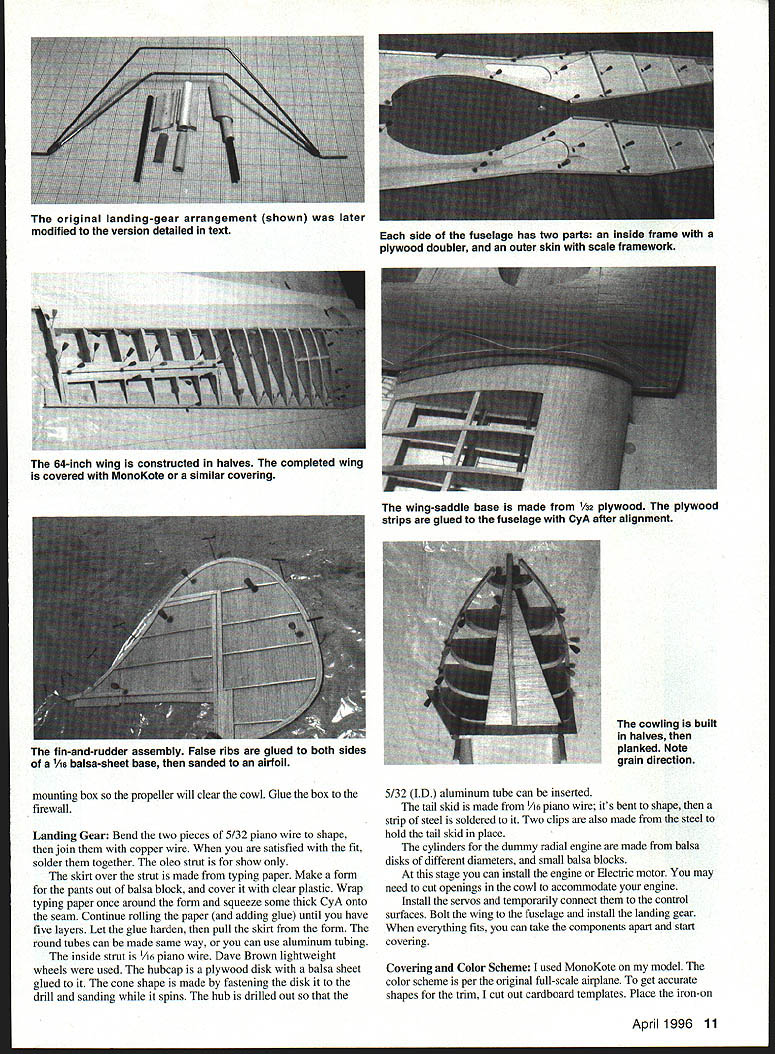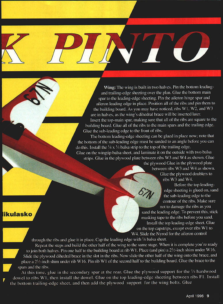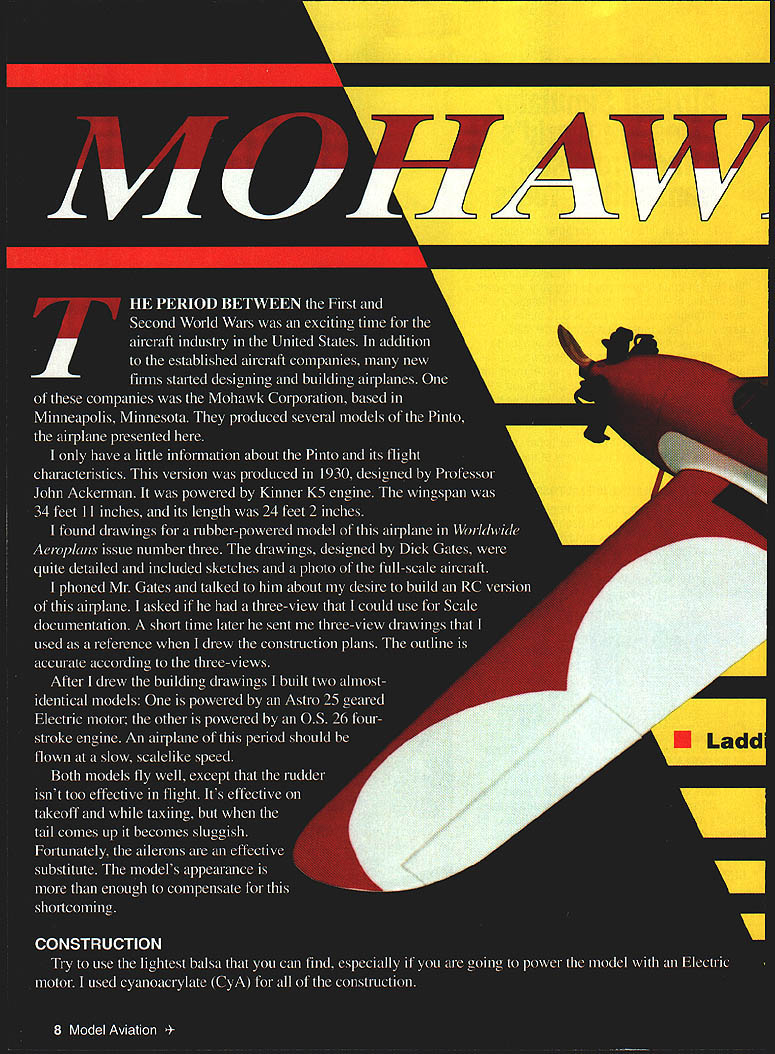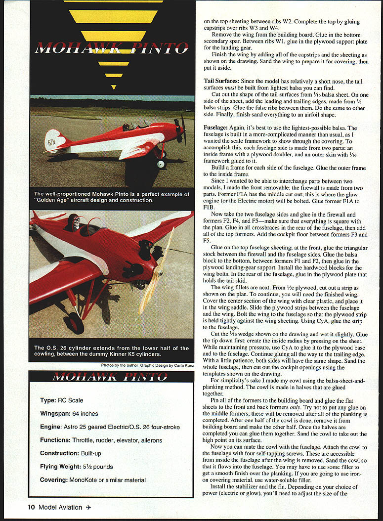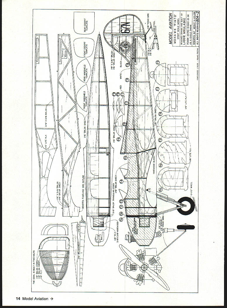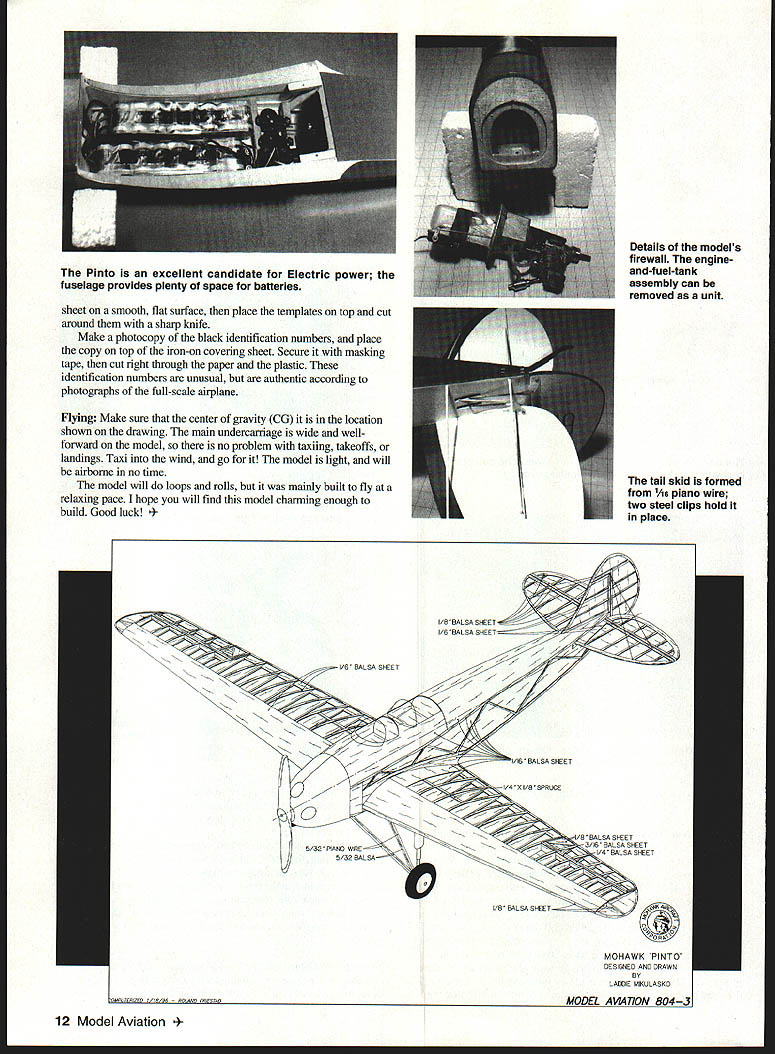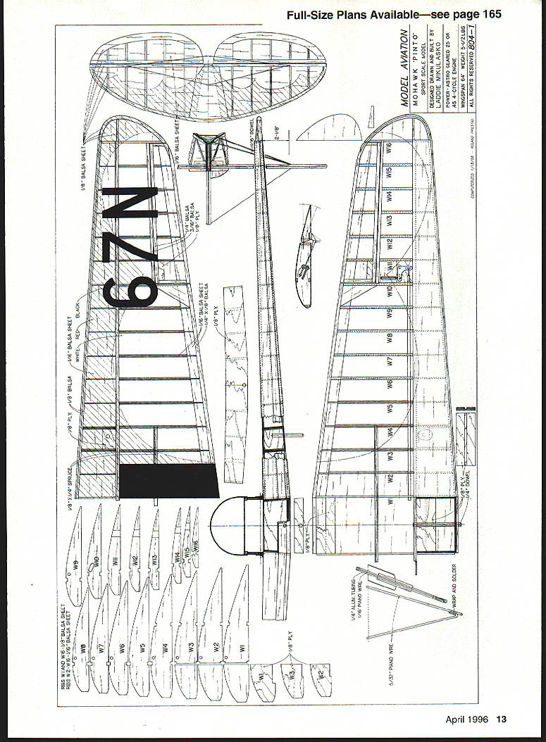 NO OCR TEXT NO OCR TEXT Type RC Scale Wingspan 64 inches Engine Astro 25 geared Electric/OS 26 four-stroke Functions Throttle rudder elevator ailerons Construction Built-up Flying Weight 5 pounds Covering MonoKote similar material top sheeting between ribs W2 Complete top gluing capstrips over ribs W3 W4 Remove wing building board Glue bottom secondary spar Between ribs W 1 glue plywood support plate landing gear Finish wing adding capstrips sheeting shown drawing Sand wing prepare covering put aside Tail Surfaces Since model has relatively short nose tail surfaces must built lightest balsa can find Cut out shape tail surfaces /6 balsa sheet side sheet add leading trailing edges made /s balsa strips Glue false ribs between same other side Finally finish-sand everything airfoil shape Fuselage Again its best use lightest-possible balsa fuselage built more-complicated manner usual wanted scale framework show through covering accomplish fuselage side made two parts inside frame plywood doubler outer skin 46 framework glued Build frame side fuselage Glue outer frame inside frame Since wanted able interchange parts between two models made front removable firewall made two parts Former FlA has middle cut out glow engine Electric motor will bolted Glue former FlA FlB Now take two fuselage sides glue firewall formers F2 F4 P5make sure everything square plan Glue crossbraces rear fuselage add top formers Add cockpit floor between formers P3 F5 Glue top fuselage sheeting front glue triangular stock between firewall fuselage sides Glue balsa block bottom between formers Fl F2 glue plywood landing-gear support Install hardwood blocks wing bolts rear fuselage glue plywood plate holds tail skid wing fillets next /32 plywood cut out strip shown plan continue will need finished wing Cover center section wing clear plastic place wing saddle Slide plywood strips between fuselage wing Bolt wing fuselage plywood strip held tightly against wing sheeting Using CyA glue strip fuselage Cut 1A6 wedge shown drawing wet slightly Glue tip down first create inside radius pressing sheet maintaining pressure use CyA glue plywood base fuselage Continue gluing way trailing edge little patience both sides will have same shape Sand whole fuselage cut out cockpit openings using templates shown drawing simplicitys sake made cowl using balsa-sheet-andplanking method cowl made halves glued together Pin formers building board glue flat sheets front back formers Try put glue middle formers will removed after planking completed After half cowl done remove building board make other half Once halves completed can glue together Sand cowl take out high point its surface Now can mate cowl fuselage Attach cowl fuselage four self-tapping screws accessible inside fuselage after wing removed Sand cowl flows fuselage may have use some filler get smooth finish over planking going use ironon covering material use water-soluble filler Install stabilizer fin Depending choice power electric glow youll need adjust size 10 Model Aviation ing built halves planked Note grain direction mounting box propeller will clear cowl Glue box firewall Landing Gear Bend two pieces 5/32 piano wire shape join copper wire satisfied fit solder together oleo strut show skirt over strut made typing paper Make form pants out balsa block cover clear plastic Wrap typing paper once around form squeeze some thick CyA onto seam Continue rolling paper adding glue until have five layers Let glue harden pull skirt form round tubes can made same way can use aluminum tubing inside strut 1A6 piano wire Dave Brown lightweight wheels used hubcap plywood disk balsa sheet glued cone shape made fastening disk drill sanding spins hub drilled out 5/32 ID aluminum tube can inserted tall skid made 1A6 piano wire its bent shape strip steel soldered Two clips also made steel hold tail skid place cylinders dummy radial engine made balsa disks different diameters small balsa blocks stage can install engine Electric motor may need cut openings cowl accommodate engine ffistall servos temporarily connect control surfaces Bolt wing fuselage install landing gear everything fits can take components apart start covering Covering Color Scheme used MonoKote model color scheme per original full-scale airplane get accurate shapes trim cut out cardboard templates Place iron-on April 1996 11 original landing-gear arrangement shown later modified version detailed text side fuselage has two parts inside frame plywood doubler outer skin scale framework 64-inch wing constructed halves completed wing covered MonoKote similar covering wing-saddle base made V32 plywood plywood strips glued fuselage CyA after alignment fin-and-rudder assembly False ribs glued both sides /16 balsa-sheet base sanded airfoil Details models firewall engineand-fuel-tank assembly can removed unit sheet smooth flat surface place templates top cut around sharp knife Make photocopy black identification numbers place copy top iron-on covering sheet Secure masking tape cut right through paper plastic identification numbers unusual authentic according photographs full-scale airplane Flying Make sure center gravity CG location shown drawing main undercarriage wide wellforward model no problem taxiing takeoffs landings Taxi wind go model light will airborne no time tail skid formed model will loops rolls mainly built fly afrom 1/16 piano wire relaxing pace hope will find model charming enough totwo steel clips hold build Good luck place I/BBALSASHEET I/A BALSA____ I/l6 BALSA SHEET ALSA SHEET 3/16 BALSA SHEET 5/3D PIANO WkREI/4 BALSA SHEET BALSA SHEET MOHAWK PINTO DESIGNED AND DRAWN BY LAIE MIULASKO 1/896 80L8//D LASS/ADMODEL AV1A7ON 8043 12 Model Aviation o excellent candidate Electric power fuselage provides plenty space batteries RIBS WIAND WIB-I/BBALSA SHEET RIBS W2-WI6-I/I6 BALSA SHEETCiiBS I/A SPRUCEI/B PLYI/A BALSAI/16 BALSA SHEET Wa 0 W7 -f W6 W5 0 WI oI/IS BALSA SHEET W5-3/IGBALSA 0 W2 0 Wr I/B PLY N CD -u I/4ALLMTLSINGV 1/16 PIANO W
