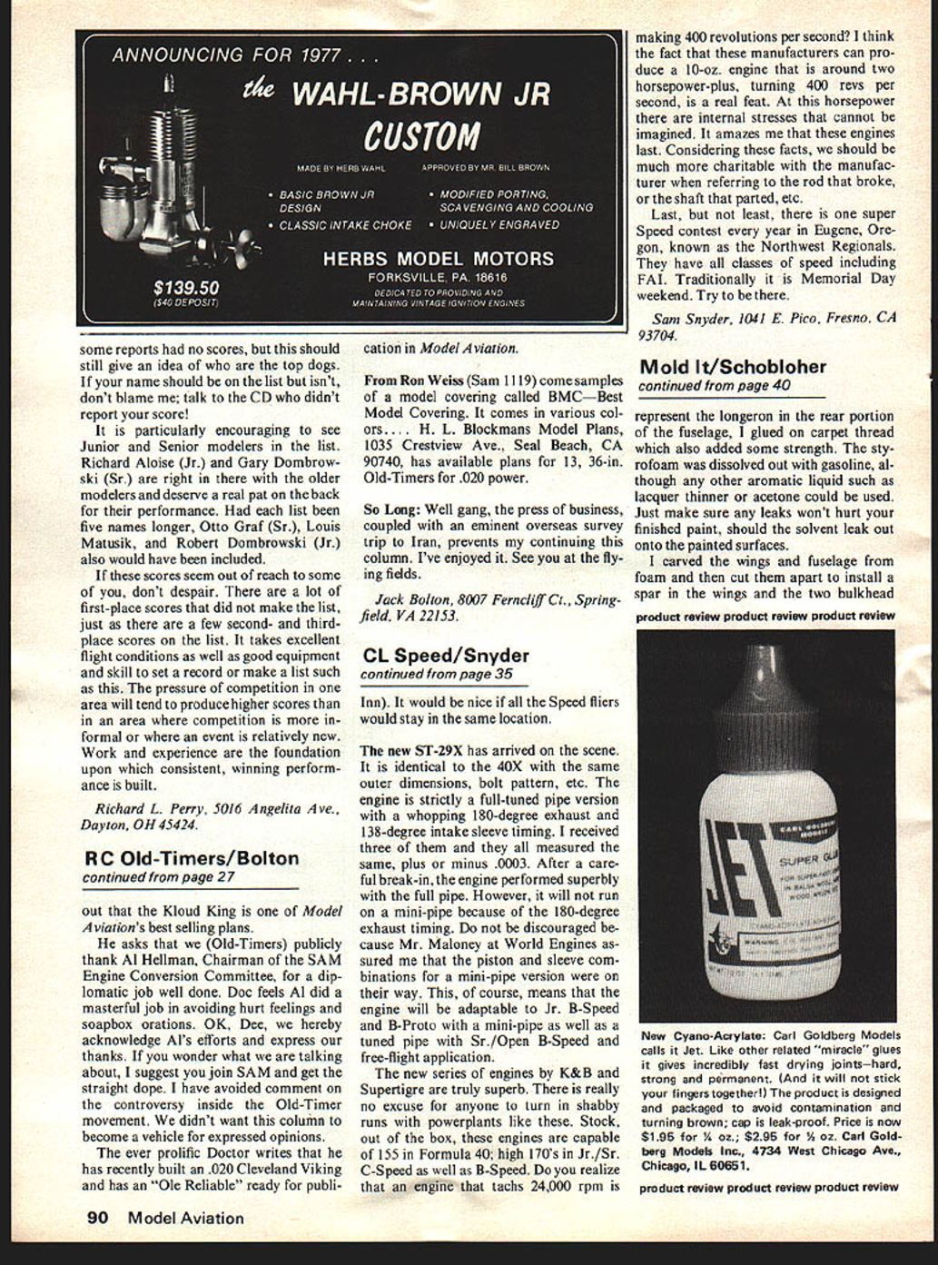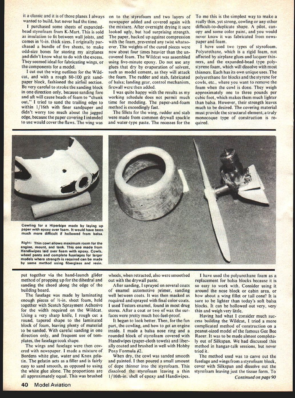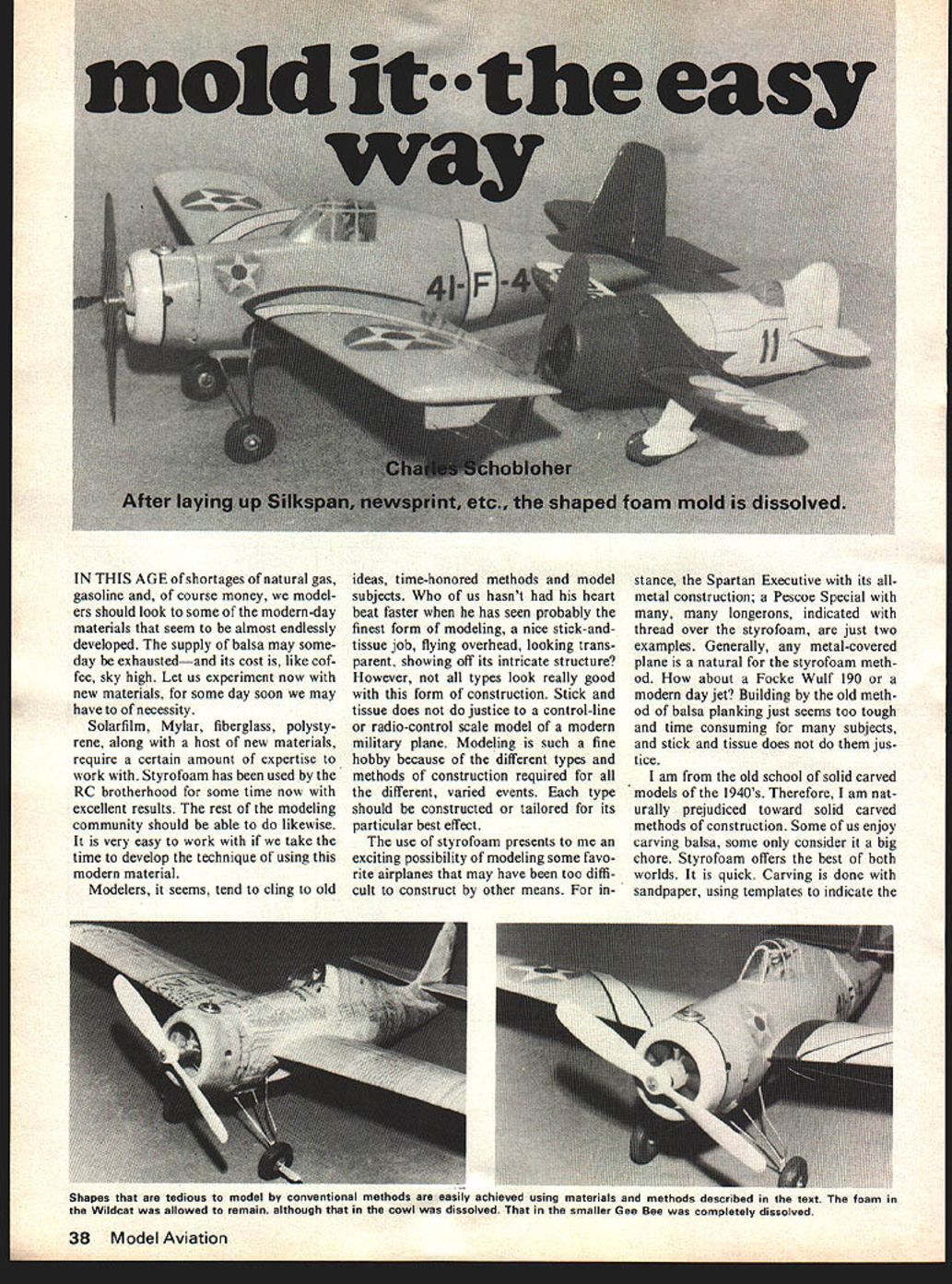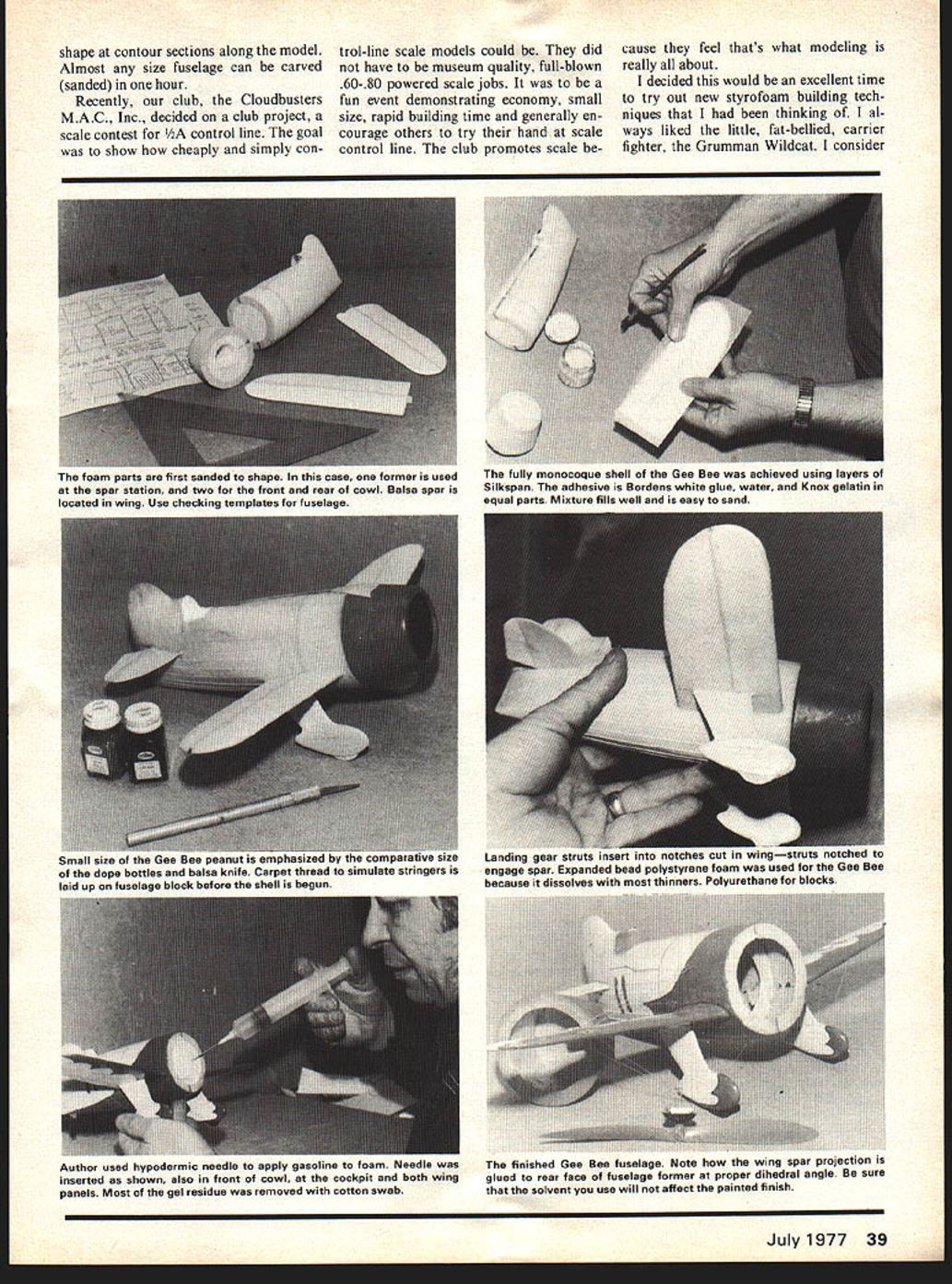 IN THIS AGE shortages natural gas gasoline course money model ers should look some modern-day materials seem almost endlessly developed supply balsa may some day exhaustedand its cost like cof fee sky high Let us experiment now new materials some day soon may have necessity Solarfilm Mylar fiberglass polysty rene along host new materials require certain amount expertise work Styrofoam has used RC brotherhood some time now excellent results rest modeling community should able likewise very easy work take time develop technique using modern material Modelers seems tend cling old ideas time-honored methods model subjects us hasnt heart beat faster has seen probably finest form modeling nice stick-andtissue job flying overhead looking trans parent showing off its intricate structure However types look really good form construction Stick tissue does justice control-line radio-control scale model modern military plane Modeling such fine hobby because different types methods construction required different varied events type should constructed tailored its particular best effect use styrofoam presents exciting possibility modeling some favo rite airplanes may have too diffi cult construct other means instance Spartan Executive its allmetal construction Pescoe Special many longerons indicated thread over styrofoam just two examples Generally metal-covered plane natural styrofoam meth od about Focke WuIf 190 modern day jet Building old meth od balsa planking just seems too tough time consuming subjects stick tissue does jus tice am old school solid carved models 1940s Therefore am nat urally prejudiced toward solid carved methods construction Some us enjoy carving balsa some consider big chore Styrofoam offers best both worlds quick Carving done sandpaper using templates indicate 38 Model Aviation Shapes tedious model conventional methods asny achieved using materials methods described text foam Wildcat allowed remain although cowl dissolved smaller Gee Bee completely dissolved shape contour sections along model Almost size fuselage can carved sanded hour Recently club Cloudbusters MAC Inc decided club project scale contest control line goal show cheaply simply control-line scale models could did have museum quality full-blown 60-80 powered scale jobs fun event demonstrating economy small size rapid building time generally en courage others try hand scale control line club promotes scale because feel thats what modeling really about decided would excellent time try out new styrofoam building tech niques thinking al ways liked little fat-bellied carrier fighter Grumman Wildcat consider Author used hypodermic needle apply gasoline foam Needle inserted shown also front cowl cockpit both wing panels Most gel residue removed cotton swab finished Gee Bee fuselage Note now wing spar projection glued rear face fuselage former proper dihedral angle sure solvent use will affect painted finish July1977 39 loam parts nrst sanded shape tnis case former used spar station two front rear cowl Balsa spar located wing Use checking templates fuselage fully monocoque shell Gee Bee achieved using layers Silkspan adhesive Bordens white glue water Knox gelatin equal parts Mixture fills well easy sand phasized compar e size dope bottles balsa knife Carpet thread simulate stringers laid up fuselage block before shell begun Landing gear struts inseri irno I1uun .ing. engage spar Expanded bead polystyrene foam used Gee Bee because dissolves thinners Polyurethane blocks classic planes always wanted build never time purchased some sheets expandedbead styrofoam K-Mart sold insulation fit between wall joists comes -in thick sizes originally pur chased bundle five sheets make odd-size boxes storing airplanes didnt know what excess seemed ideal fabricating wings components model cut out wing outlines Wild cat rough 80-100 grit sand paper block fashioned airfoil section very careful stroke sanding block direction because sanding fore aft will cause beads foam chunk out tried sand trailing edge within 1/16th finer sandpaper didnt worry too much about jagged edge because paper covering intended use would cover flaws wing styrofoam two layers newspaper added covered again mixture After overnight drying sure looked ugly surprising strength paper backed up against compression foam prevented twist whatso ever weights cured pieces now about four times heavier un covered foam Wildcat assembled using five-minute epoxy use glues dry evaporation solvent such model cement will attack foam rudder stab fabricated balsa landing gear control mechanism firewall added quite happy results working schedule does permit much time modeling paper-and-foam method exceedingly fast fillets wing rudder stab made common drywall spackle water-type paste recesses simplest way make really thin yet strong cowling other difficult-to-duplicate shape pilot can opy some color paint would never know fabricated news paper foam have used two types styrofoam Polyurethane rigid foam affected airplane glues lacquer thin ners expanded-bead type poly styrene foam will dissolve thinners has its own unique uses polyurethane blocks styrene cowls etc want remove foam cowl done weigh approximately three pounds per cubic foot makes much lighter balsa However strength leaves much desired covering material must provide structural element truly monocoque type construction re quired Right Thin cowl allows maximum room engine mount tank made Handiwipes laid over foam epoxy Cowls wheel pants complete fuselages larger models strength required can made same method using fiberglass resin put together via hand-launch glider method propping up dihedral sanding chord along edge building board fuselage made laminating enough pieces -in sheet foam held together Scotch Sprayment Adhesive width required Wildcat Using very sharp knife rough cut round tapered shape laminated block foam leaving plenty material sanded careful sanding direction frequent use tem plates fuselage took shape wings fusela