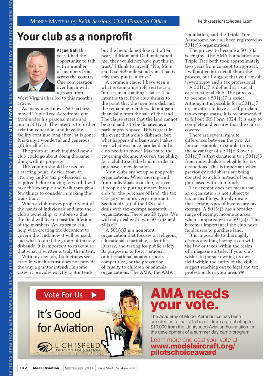 A 501(c)3 is a nonprofit organization that focuses on religious, educational, charitable, scientific, literary, and testing for public safety. Its purpose is to foster National or International Amateur Sports competition or the prevention of cruelty to children or animal organizations. The AMA, the AMA Foundation, and the Triple Tree Aerodrome have all been registered as 501(c)3 organizations.