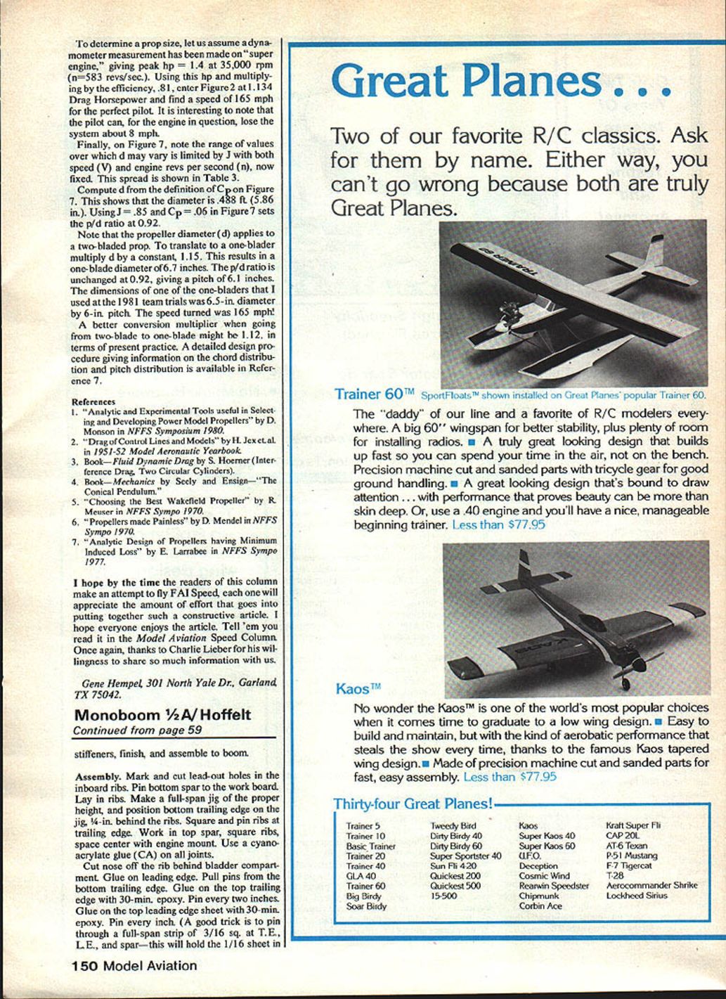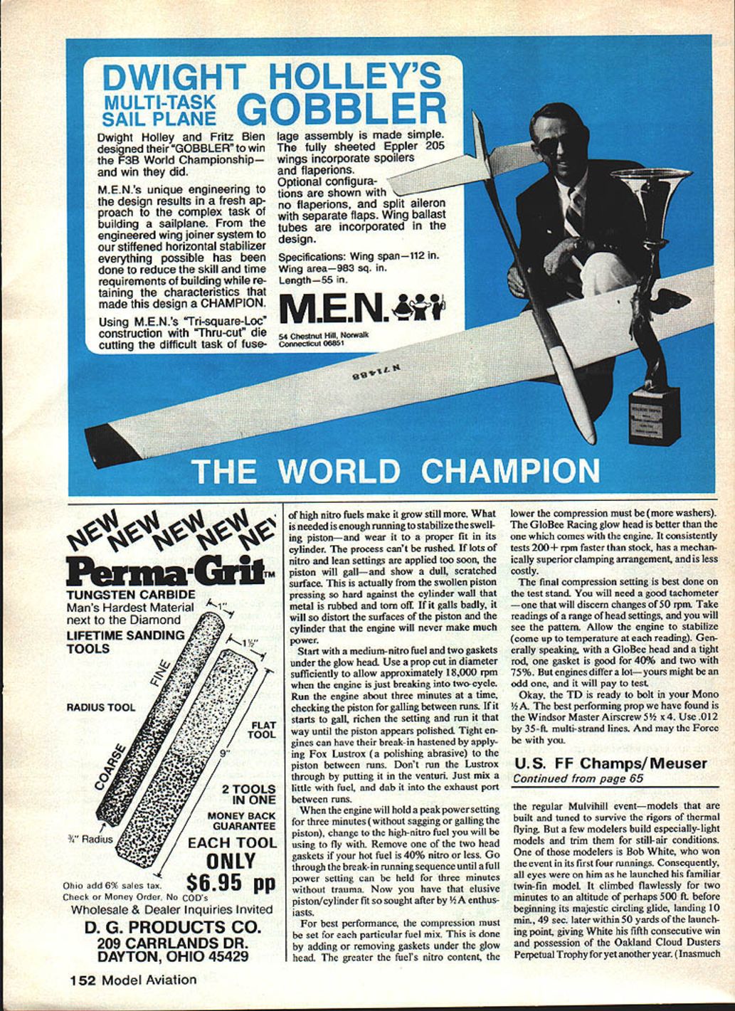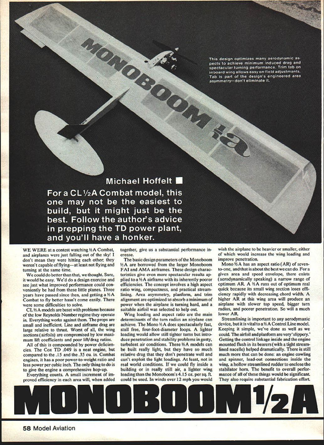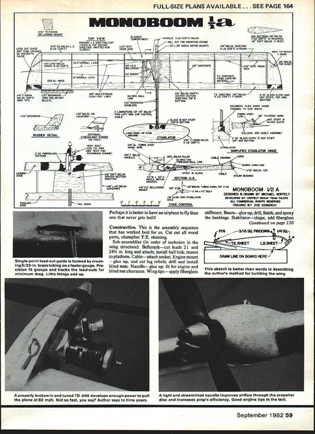WE WERE contest watching Combat airplanes just falling out sky dont mean hitting other werent capable flyingat least flying turning same time could better thought Sure would easy Wed design exercise see just what improved performance could con veniently little planes Three years have passed since getting at fly better hasnt come easily some difficulties solve CL ls beset problems because low Reynolds Number regime operate Everything works against props small inefficient Line airframe drag large relative thrust Worst wing sections airfoils compromised low maidmum lift coefficients poor lift/drag ratios compounded power deficien cies Cox TD 049 neat engine compared 15 35 cu Combat engines has poor power-to-weight ratio less power per cubic inch thing to give engine comprehensive hop-up Everything counts small increment im proved efficiency area will added together give us substantial performance crease basic design parameters Monoboom borrowed larger Monoboom FAI AMA airframes design charac teristics give spectacular results ap plied rame its inherently poorer efficiencies concept involves high aspect ratio wing compactness practical stream lining Area asymmetry planform trim alignment optimized absorb minimum power airplane turning hard suitable airfoil selected help out Wing loading aspect ratio main determinants turn radius airplane can achieve Mono does spectacularly fast stall free four-foot-diameter loops lighter loading would allow still tighter turns intro duce penetration stability problems gnsty turbulent air conditions models can built really light have much relative drag dont penetrate well cant exploit light loadings least real world conditions could fly inside building really still air lighter wing loading Monobooms 415 oz per sq ft could used winds over 12 mph would wish airplane heavier smaller either would increase wing loading improve penetration Mono aspect ratio AR seven to-one about best can given area speed envelope exists aerodynamically speaking narrow range optimum AR out optimum real quick because its small wing section loses effi ciency rapidly decreasing chord width higher AR wing area will produce airplane slower top speed bigger turn radius poorer penetration So will much lower AR Streamlining important aerodymanic device vital rol Line modeL Keeping simple weve done well could airfoil planform veryslippery Getting control linkage inside engine mounted flush its bearers tight stream lined nacelle helped dramatically still much can done engine cowling spinner lead-out connections inside wing hollow streamlined rudder enclose stabilator horn benefit overall perfor mance of things would significant also require substantial fabrication effort Iz 58 Model Aviation FULL-SIZE PLANS AVAILABLE. SEE PAGE 164 bIUFIU BOOM I& I/I6 PLYWOOD BELICRANK MOUNT BLADDER TOP VIEWcDWARTNENT INBOARD LE SHEETINACAP JTRIPS B TOP CENTER 3/16 SO BALSA L ESHEETING OMITTED FORI/32VERT LEAD OUT GUIDEB LB SOFTCLARITYGRAB WEB 3/WnjnernItrn I/B 3A6 BALSA24 5OVSRALL LG SPARS ALB SOFT-----GIG V2A 2IOVERALL LGTH 005 AL HINGE____________ ________________ TRIM TAB DO MOT DELETE 1/ 01B MILTISTBAND/L.A LEAD-OUT LINESDUBAO BALL UNK V52 BASSWOOD DOBEERS V32 BALSA OR OPTIONAL STREAMLAFO RUDDER INO NEWEl VERY FAST .COX TD 045 -GEE TEXT FOR REWORKING ENGINE 2 LAABNATIO@B OF Ar BALSA TRIM LEFT BEE FOR CONTROL CABLE DENIER GECTION NEETING 1A6 I/4BBLSA CAPAYRFA VTAIL BOOM RUDDER DETAIL 202 FIBERGLASS PATTEAPI 7r7k LEKMID TRUNG-/ EDGE NACELLE 5 LA SOFT BALSA MILL OUT FOR MOUNTING ENABlE 35 S MAPLE MOTOR MOLBYS czz SILGR!EAN-VW BALSA 5 LB SOFT 10 REWIRED VB SOFT BALSA 2 REOD 1A6 BALSA SHEETING LB SOFT A-GRAB7 -4-Ziil7 _ El IjIB CAPSTBIPS ViA BALSA SOFT CENTER SECTION SHEETINGTOP BOTTOM IllII/ IIV32 VERY DENI4 WEB FROM CAPSYRIP YE SUPPORTS MATERIAL WING TlP WEIGI4T N\IIGRAM YE VRA BALSA B BOY YE GREETING lAB BALSAI2 CE / GLASS CLOTh MID LB ISOFTI C-GRAINHOT STIFF lOP ARE BOTIOM GOLDBERG FLEX POINT HINGE TRAINFD TO GAB WIOTH LINK\ PLYWOOD Hl OUBRO RUBSTIFF S 3ILNI*4 030 CAINE ASSENRY 2 CE GLASS cAmH HOT STIFF TOP MID BOTTOM STABILATOR RIMPUFD STARLATE MHGF GLASS B HOT STIFF TOP B BOTTOIA LONG PANEL OF STAB __ reOABO~ ILATOR — BACELLE2AMED BALSA FIlER CR-ABlEk-vBmqASS TImIG HORNTAP 2 56 MOLINTTAP OLT DRAd mcsEi I4OPELT ISA ALIAI ROD STARILATORnfWIp5n BY MOPPELE GROUP TEAM PLUIS 2AXLE—I counci moms se ISTAB CONTROL OEIMRCO Perhaps better have airplane fly never gets built Construction assembly sequence has worked best us Cut out wood parts champher TE sheeting Sub-assemblies order inclusion wing structure Bellcrankcut leads 21 24 long attach install ball link mount platform Cable attach socket Engine mount glue up cut lug reliefs drill install blind nuts Nacelleglue up fit engine blind nut clearance Wing tipsapply fiberglass properly broken-in tuned TO 049 develops enough power pull plane 82 mph fast say Author says time yours stiffeners Boomglue up drill finish andepoxy bushings Stabilatorshape add fiberglass Continued page 150 j-PlN---3/lesQ~jSQzj LIE ON BOARD IfRE/i sketch better words describing authots method bulidina wino September 1982 59 ON 019 DEPTh SAUGE/ / lAB C-GRAIN BALSA IGOFfl WING TIPS single-point lead-out guide formed crush ing5/32-in brasstubing feelergauge Pr cision fit groups tracks lead-outs minimum drag Litti things add up tlgnT ana streaminea naceiie improves airnow snrougn propeller disc increases props efficiency Good engine tips text determine prop size let us assume dyna mometer measurement has made super engine giving peak hp 5000 rpm n583 revs/sec Using hp multiply ing efficiency 81 enter Figure 2 1134 Drag Horsepower find speed 165 mph perfect pilot interesting note pilot can engine question lose system about 8 mph Finally Figure 7 note range values over d may vary limited J both speed V engine revs per second n now fixed spread shown Table 3 ComputedfromthedefinitionofCponFigure 7 shows diameter 488 ft 586 UsingJ 85 Cp06 inFigure7 sets Wd ratio 092 Note propeller diameterd appli