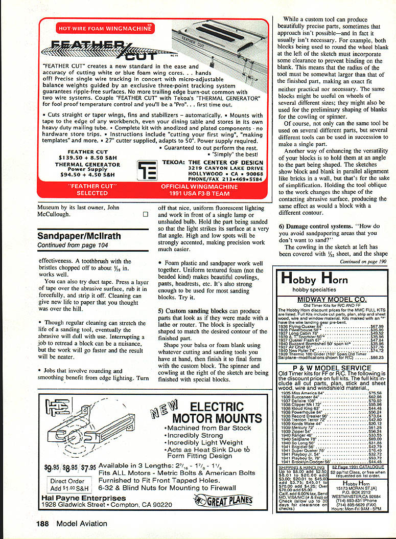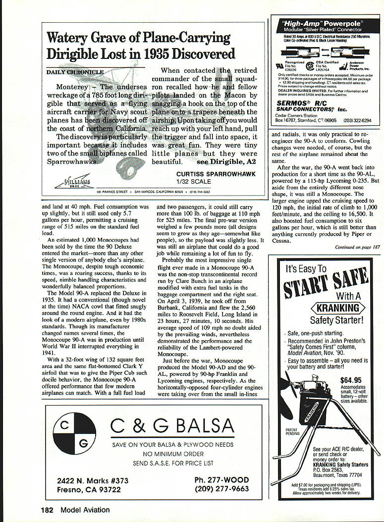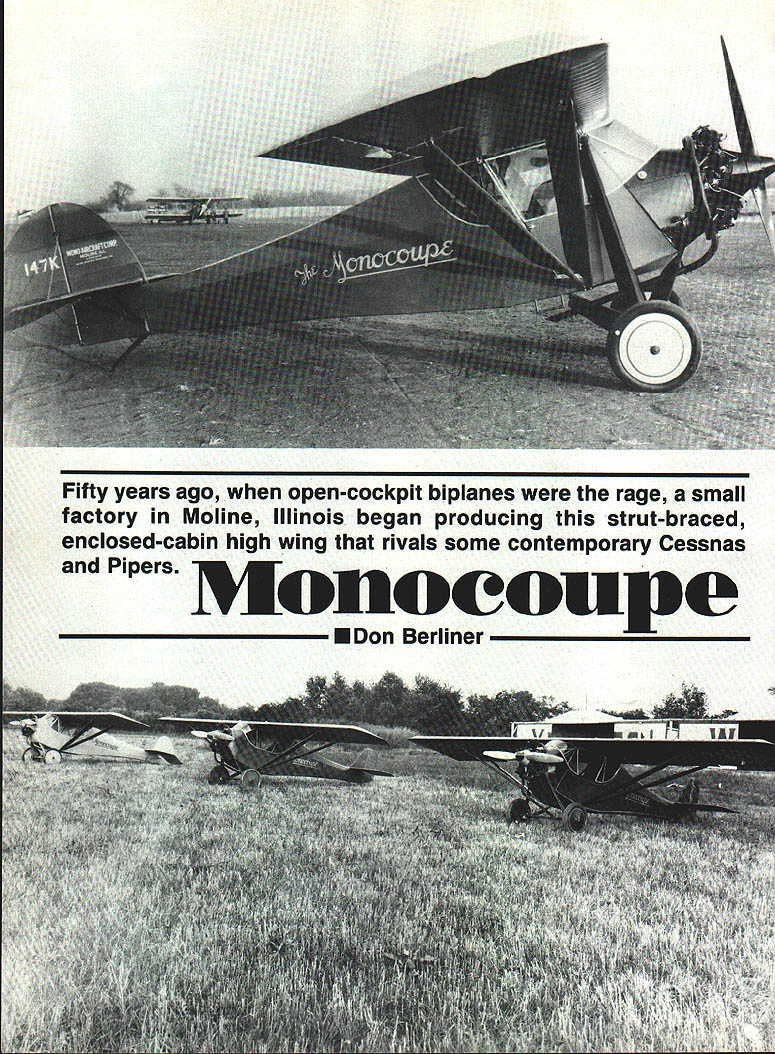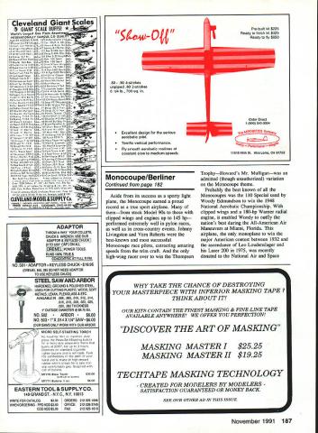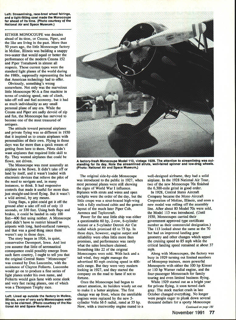 Fifty years ago open-cockpit biplanes rage small factory Moline Illinois began producing strut-braced enclosed-cabin high wing rivals some contemporary Cessnas Pipers ____ipe EDon Berliner Left Streamlining race-bred wheel fairings tight-fitting cowl made Monocoupe far ahead its time Photo courtesy ci National Air Space Museum EITHER MONOCOUPE decades ahead its time Cessna Piper like living past 50 years ago little Monocoupe factory Moline Illinois building snappy two-seater would equal better performance modem Cessna 152 Piper Tomahawk almost respects current types standard light planes world during 1980s supposedly representing best American technology offer Obviously somethings wrong somewhere oaly marvelous little Monocoupe 90-A fine machine terms cruising speed rate climb take-off roll fuel economy much individuality small personal plane era Cessna Piper sadly devoid zip fun Monocoupe has survived become treasured antiques attitude toward personal airplanes private flying different 1930 inspired us create airplanes personalities own Flying days far quick means getting Pilots didnt want airplanes required little skill fly wanted airplanes could flown driven Monocoupe assuredly airplane flown didnt take off land itself wasnt loaded electronic devices relieve pilot need navigate instances think responsive controls made useful just straight-and-level flying wasnt wild animal means Using flaps pilot could get off ground after take off roll 10 seconds 330 feet Using both flaps brakes could landed oaly 100 feet400 feet using neither Monocoupe pilot didnt have restrict himself airports long hard-surfaced runways good thing since werent days story began 1926 quiet conservative Davenport Iowa lest assume little aeronautical consequence could possibly emerge such farm country ought tell original Central States Monocoupe created Don Luscombe assistance Clayton Folkerts Luscombe would go produce fine series light planes under own name Folkerts would gain fame some sleek very fast racing planes won Thompson Trophy race original side-by-side Monocoupe introduced public 1927 personal planes still showing signs World War influence Biplanes struts wires open cockpits order day little coupe strut-braced high-wing fully enclosed cabin general layout much later Piper Cub Aeronca Taylorcraft Power neat little ship either questionable 60 hp 2-row 6-cylinder Anzani 5-cylinder Detroit Air Cat radial promised 65 75 hp days however engine output reliability often little promises performance rarely what sales brochure claimed Something like 22 original Monocoupes sold luck tail wind might manage advertised 80 mph cruising speed 400mile range very modem looking 1927 started company road fame fortune Once Monocoupe begun attract attention its builders wisely set out make better airplane first change up front unreliable engines replaced new 5cylinder Velie M-5 radial rated 55 hp Now trustworthy engine mated well-designed airframe solid airplane 1928 National Air Tour two new Monocoupe 70s finished 6300-mile grind good order 1928 Central States Aircraft Company became Mono Aircraft Corporation Moline Illinois soon new model rolling off assembly line After about 80 Model 70s sold Model 113 introduced Until 1930 Monocoupes carried government approved type certificate number commercial designation 113 looked about same 70 improved landing gear geometry other changes upped cruising speed 85 mph critical landing speed remained about 37 mph Along Monocoupes factory busy 1929 turning out limited numbers Monoprep trainers powerful Monosports either 100 hp Kinner 110 hp Warner radial engine four-passenger Monocoach family touring nd limited business flying 1929 started out bright year private flying soon turned dark gray stock market crash late October changed everything No longer people eager plunk down several thousand dollars sporty Monocoupe Continued page 181 November 1991 77 factory-fresh Monocoupe Model 113 vIntage 1929 attention streamlining out standing Its day Note streamlined struts well-faired spinner low-drag wheels Photo National Air Space Museum Left Lined up outside factory Moline Illinois row very early Monocoupes wait ing claimed Photo courtesy Na tional Air Space Museum Box 1063 Lorain Ohio 44055 MICRO Ph 216 282-8354 PA 16 Clipper rcraft Big Flying Scale Kits Over Two Foot Span *Piper Cub1495 *Stinson 1251495 *Piper PA-161495 Semi-Scale Kits 002 Rubber Power 22 Span * Taylorcraft 1095 * Stinson Voyager .. 1095 * P0-6 Porter 1095 Contest-Sport Kits * Hornet Embryo 995 * Hornet P-30 1495 Fits F-30 & Fee Wee Roles Outdoor Peanut Scale Kits t3Spas *Cub895 *Stinson 125895 *Vagabond995 *Farman895 *Jodel995 *Fike995 1/2 R/C Gas Electric Kits Fits Astro 035 Taylorcraft..... 3995 Stinson 125... 3995 HARD TO FIND ITEMS Brown CO Motors Accessories Over 20 Sizes Rubber Stripl Japanese Tissue Super Fine Balsa Sheets & Strips Add 10% Shipping $250 Minimum Shipping CATALOG $200 AT APPLIED DESIGN iunrunuu PO Box 3384 Torrance CA 90510 MINI w SANDER ADJUSTABLE TENSION HAND BELT SANDER FIRMLY HOLDS PAPER FOR EASIER SANDING Padded flits curves HayH Ensue Use $285 MINI-STRIPS PRECISION DIE-CUT Medium Garnet REPLACEMENTFine Garnet Si 90 SANDING B AND E F FORT ELTSAmId Watar Preal Mliv $315 TEE 43M Precision Sander Level Finishing & Corner Sanding PACKAGE COMPLETE WITH 3 SHEETS PEEL & STICK SANDPAPER MINI - GLUE TIPS MAKES ANY GLUE TUBE INSTANT GLUE GUN PUT THE GLUE WHERE YOU WANT IT Sails wIth pIn Ne lass Ia III Nameintaclean 4Ier$lO5 BA ich SAWS ANYTHING ANYWHERE Saw has rugged die-cast tram camlertable chip-preat plastic sert handle RecedIng ease ad lestable B blade given geed mark access Cuts weed plastic metal HARDENED MUSIC WIRE K WzWzWxi- 4 Cmplfe 4 null less assuMer buffery pawpeller GAS New Generation 20 Cubic Inch A&M Aircraft SaChs says bigger better applications easily interchange 20 Cubic Inch engine A&M Aircraft torthe size power get phenomenal 5x5x5 3 lbs little guy puts out 4 8000 horsepower tor mere $300 Gas