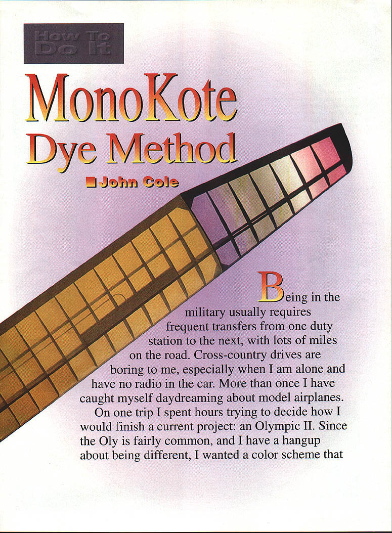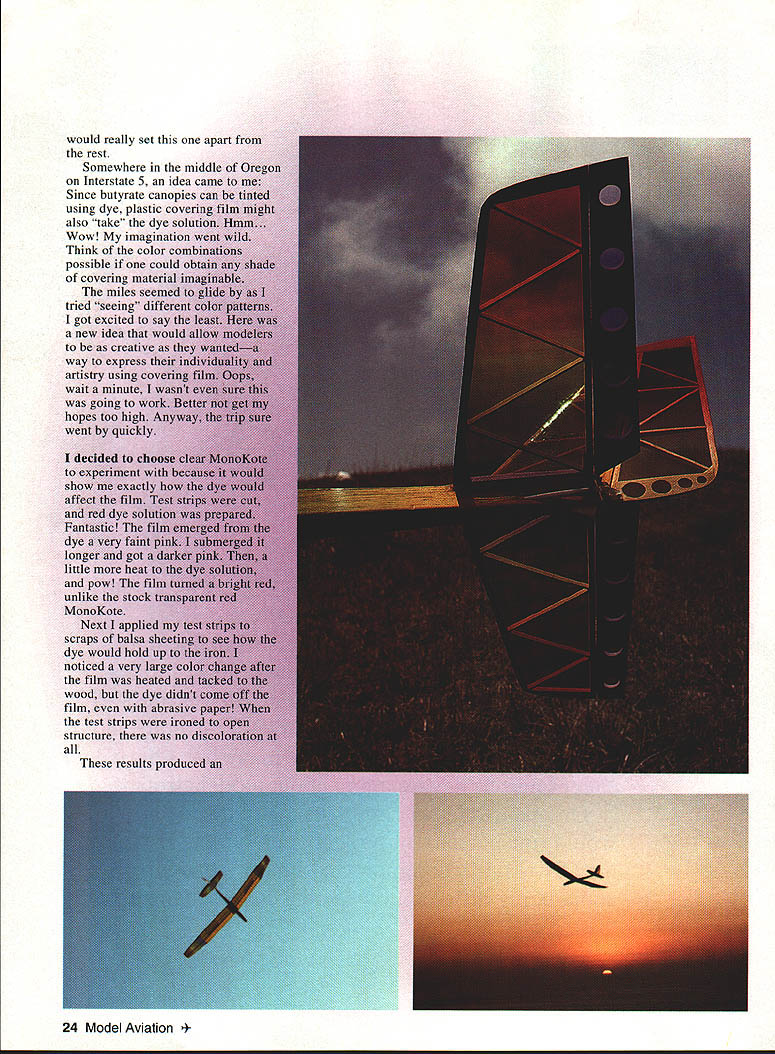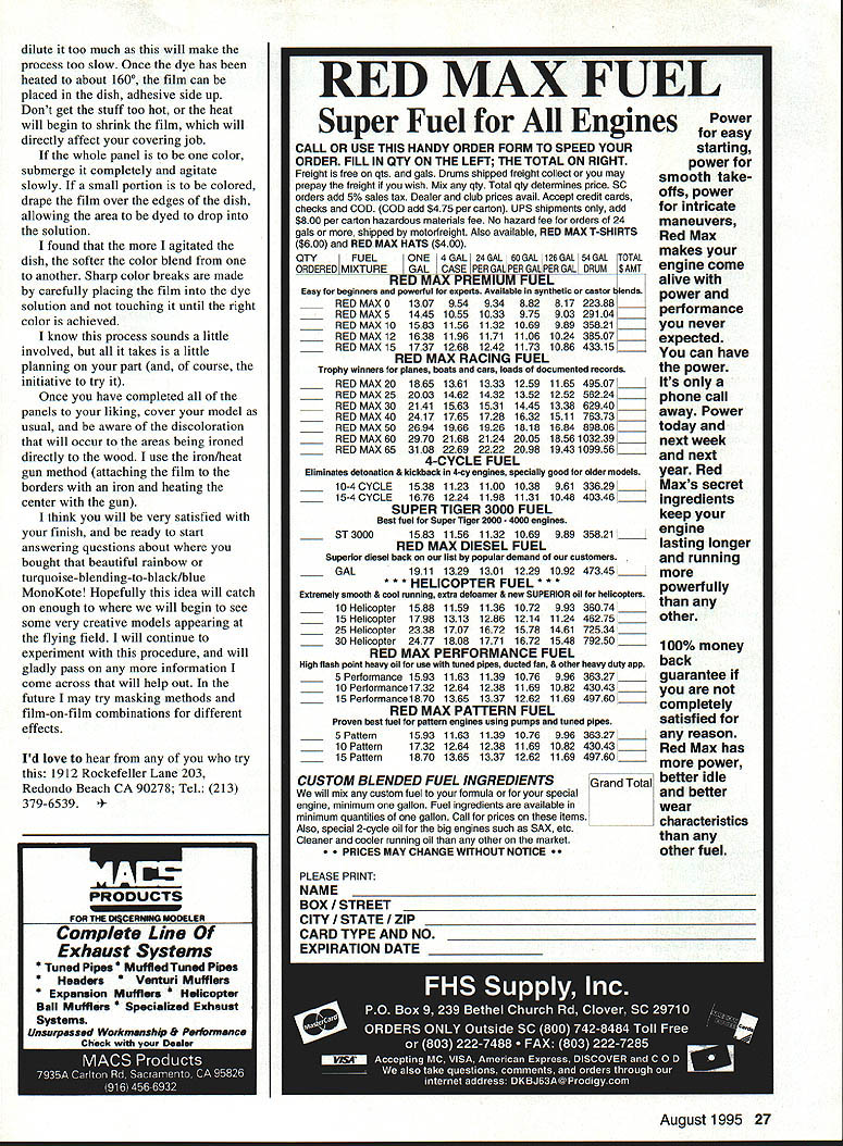 in duty Cmi1es alone haveonce have caughtmodel airplanes trip spent hours trying decide would finish current project Olympic II Since Oly fairly common have hangup about being different wanted color scheme would really set apart rest Somewhere middle Interstate 5 idea came tn Since butyrate canopies can using dye plastic coveril also take dye soluti Wow imagination w Think color com1 possible could ol covering material jim miles seemed tried seeing different got excited say new idea would creative th way express artistry using coverin wait minute wasn going work B hopes too high An went quickly decided choose experiment show exactly hr affect film T red dye Fantastic Tne ii dye very faint longer got little heat pow film unlike stock trai MonoKote Next applied scraps balsa shee dye would hold up noticed very laige cc film heated wood dye didn film abrasive test strips irone structure no results produce 24 Model Aviation resting discovery dye didnt adhere film adhesive backside explained dye took much faster heated higher temperature probably began activating adhesive film film ironed directly wood adhesive activated made dye appear darker direct contact wood surface have decided try technique next model procedure along some dos donts have tried transparent MonoKote line have something else will experimenting own Opaque colors dont show dye course Crystal clear MonoKote can hard find times dont wait until last minute get Rit dye used available myriad colors sure use liquid rather powder found out hard way powder will cause spots irregular color blotches Read warnings bottle watch stuff Its Primary use cloth wear old T-shirt couple old bath towels very handy have hand well two Pyrex rectangular baking dishes large enough accomodate piece film preparing Assure wife will come back unharmed heat source needed dye food hotplate would ideal used microwave oven required continuous reheating dye little inconvenient made job timeconsuming Once model properly prepared covering decide color scheme will arranged panels cut roll film plastic backing removed small pieces masking tape affixed panel film identify also good reminder side has adhesive Prepare dye solution dish Thin dye hot water dont rough characters want smooth out project 5- next bunch y Dealers Nationwide POBox 1247 StCharles IL 60174 708-584-7616 August 1995 25 Robart Ruff-N-Tuff Carbide Cutters nasty work quickly no complaints Cut through grind off clear out rough up sand down rip off smooth out guys carbide-quick cool never load up Wood fiberglass lexan plastic ceramics no modeling material scares Theyre quite abrasive bunch available variety shapes two different grits Robart Carbide Cutters rough bunch characters right can sure theyll never rub wrong way dilute too much will make process too slow Once dye has heated about 1600 film can placed dish adhesive side up Dont get stuff too hot heat will begin shrink film will directly affect covering job whole panel color submerge completely agitate slowly small portion colored drape film over edges dish allowing area dyed drop solution found agitated dish softer color blend another Sharp color breaks made carefully placing film dye solution touching until right color achieved know process sounds little involved takes little planning part course initiative try Once have completed panels liking cover model usual aware discoloration will occur areas being ironed directly wood use iron/heat gun method attaching film borders iron heating center gun think will very satisfied finish ready start answering questions about bought beautiful rainbow turquoise-blending-to-black/blue MonoKote Hopefully idea will catch enough will begin see some very creative models appearing flying field will continue experiment procedure will gladly pass information come across will help out future may try masking methods film-on-film combinations different effects Id love hear try 1912 Rockefeller Lane 203 Redondo Beach CA 90278 Tel 213 379-6539 PRODUCTS en rue ners.u.n earn RED MAX hnEmum FUEL Easy beginners powerful experts Available synthetic castor blends RED MAX 0130795493488281722388 RED MAX514451055103397590329104 REDMAX1O158311561132106998935821 RED MAX 121638119611711106102438507 RED MAX 151737126812421173108643315 RED MAX RACING FUEL Trophy winners planes boats cars loads documented records RED MAX 201865136113331259116549507 RED MAX 252003146214321352125256224 RED MAX 302141156315311445133862940 MAX 402417176517281632151176373 RED MAX 502694196619261818168489806 RED MAX 6029702168212420051856103239 RED MAX 6531082269222220981943109956 4-CYCLE FUEL Eliminates detonation & kickback 4-cy engines specially good older models 10-4 CYCLE 1538 1123 1100 1038 961 33629 15-4 CYCLE 1676 1224 1198 1131 1048 40346 SUPER TIGER 3000 FUEL Best fuel Super Tiger 2000 4000 engines 5T30001583 1156 1132 1069 989 35821 RED MAX DIESEL FUEL Superior diesel beck list popular demand customers GAL1911 1329 1301 1229 1092 47345 *** HELICOPTER FUEL *** Extremely smooth & cool running extrs defoamer & new SUPERIOR oil helicopters 10 Helicopter158811591136107299336074 15 Helicopter1798131312861214112446275 25 Helicopter2338170716721578146172534 30 Helicopter2477180817711672154879250 RED MAX PERFORMANCE FUEL High flash point heavy oil use tuned pipes ducted fan & other heavy duty app 5 Performance 159311631139107699636327 10 Performancel732126412381169108243043 15 Performancel870136513371262116949760 REDMAXPATTERNFUEL Proven best fuel pattern engines using pumps tuned pipes 5 Pattern159311631139107699636327 .....4 10 Pattern1732126412381169108243043 15 Pattern18701365133712621169 49760 Power easy starting power smooth take offs power intricate maneuvers Red Max makes engine come alive power performance never expected can have power Its phone call away Power today next week next year Red Maxs secret ingredients keep engine lasting longer running powerfully other 100% money back guarantee ____ completely satisfied reason Red Max has power C