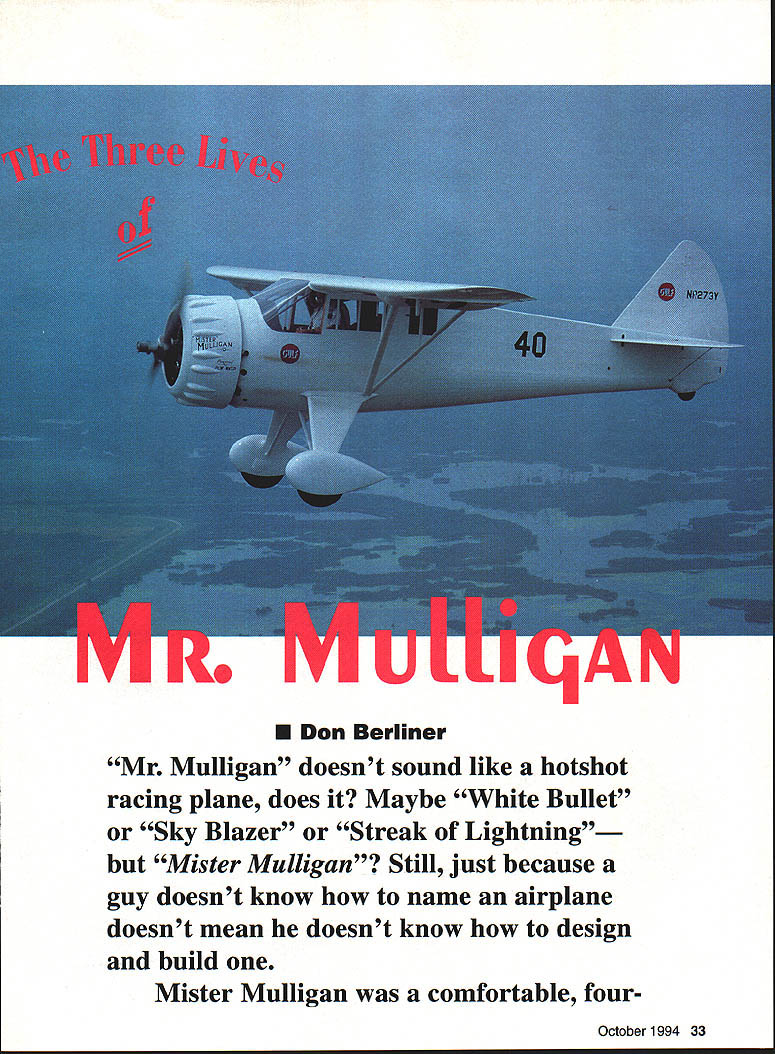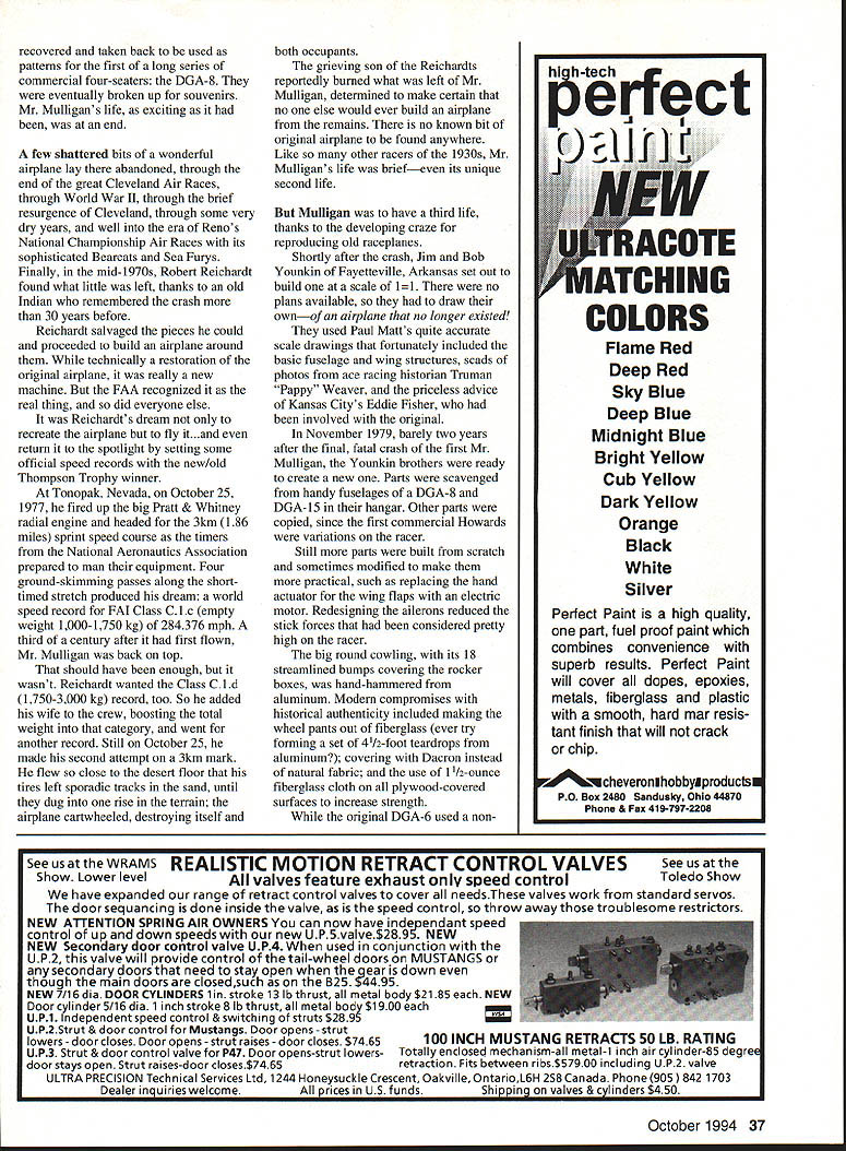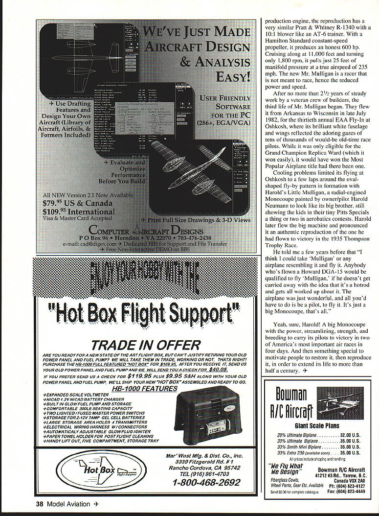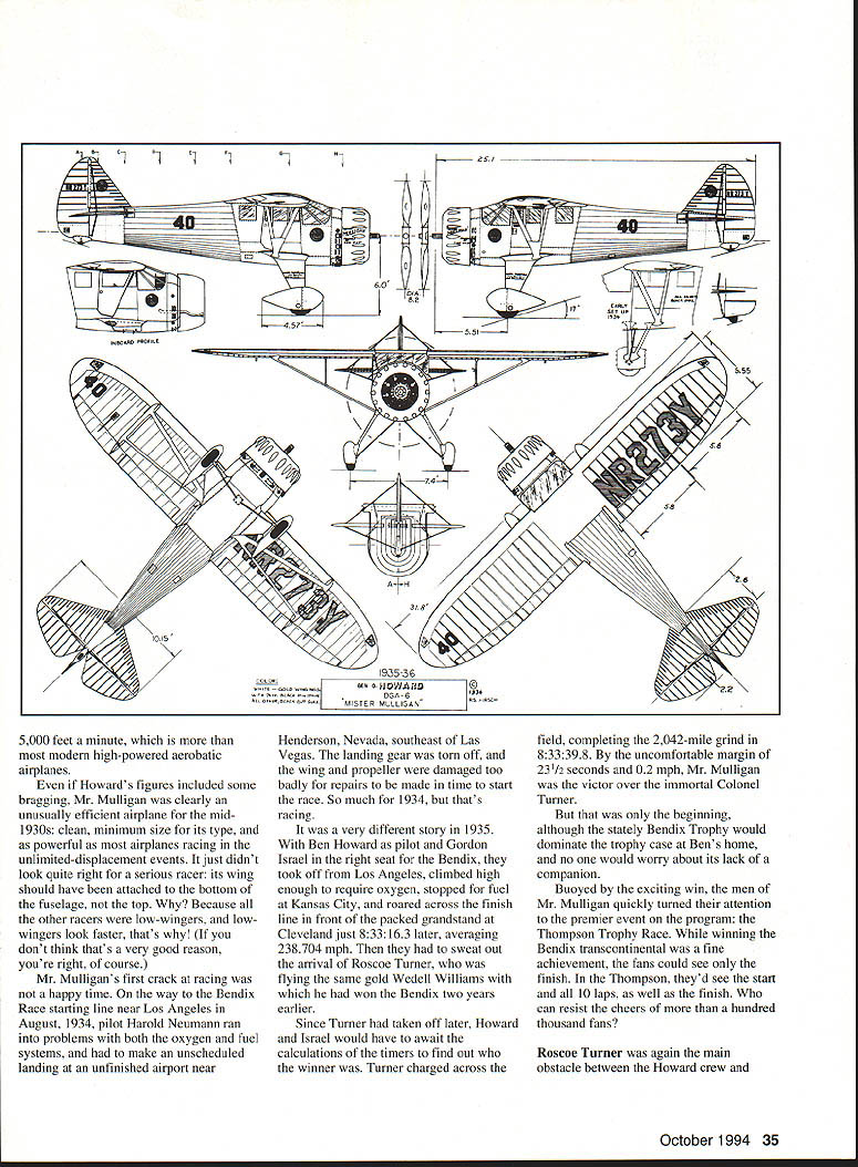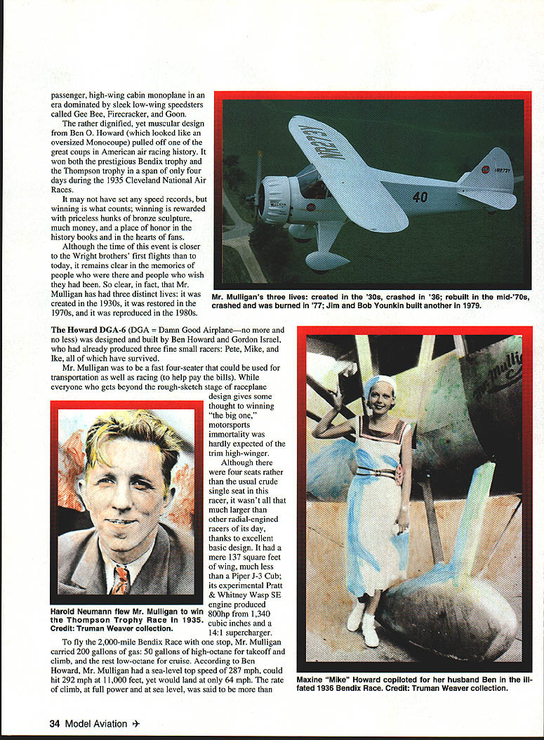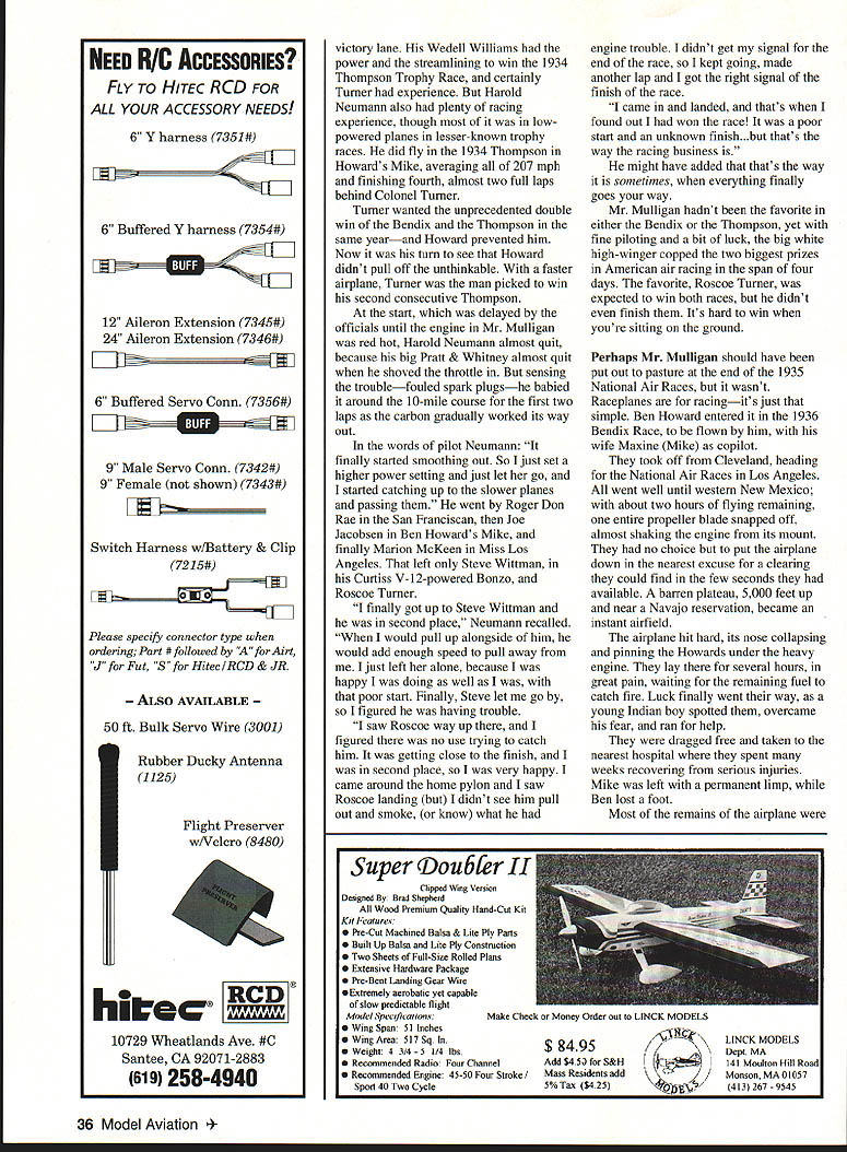 I U Don Berliner Mr Mulligan doesnt sound like hotshot racing plane does Maybe White Bullet Sky Blazer~ Streak Lightning Mister Mulligan Still just because guy doesnt know name airplane doesnt mean doesnt know design build Mister Mulligan comfortable fourOctober 1994 33 passenger high-wing cabin monoplane era dominated sleek low-wing speedsters called Gee Bee Firecracker Goon rather dignified yet muscular design Ben 0 Howard looked like oversized Monocoupe pulled off great coups American air racing history won both prestigious Bendix trophy Thompson trophy span four days during 1935 Cleveland National Air Races may have set speed records winning what counts winning rewarded priceless hunks bronze sculpture much money place honor history books hearts fans Although time event closer Wright brothers first flights today remains clear memories people people wish So clear fact Mr Mulligan has three distinct lives created 1930s restored 1970s reproduced 1980s Howard DGA-6 DGA Good Airplaneno no less designed built Ben Howard Gordon Israel already produced three fine small racers Pete Mike Ike have survived Mr Mulligan fast four-seater could used transportation well racing help pay bills everyone gets beyond rough-sketch stage raceplane design gives some thought winning big motorsports immortality hardly expected trim high-winger Although four seats rather usual crude single seat racer wasnt much larger other radial-engined racers its day thanks excellent basic design mere 137 square feet wing much less Piper 1-3 Cub its experimental Pratt & Whitney Wasp SE engine produced 800hp 1340 cubic inches 141 supercharger fly 2000-mile Bendix Race stop Mr Mulligan carried 200 gallons gas 50 gallons high-octane takeoff climb rest low-octane cruise According Ben Howard Mr Mulligan sea-level top speed 287 mph could hit 292 mph 11000 feet yet would land 64 mph rate climb full power sea level said 34 Model Aviation uiilgans inree lives createa ius crasneo ilt into- US crashed burned 77 Jim Bob Vounkin built another 1979 Harold Neumann flew Mr Mulligan win Thompson Trophy Race 1935 Credit Truman Weaver collection Maxine Mike Howard copiloted husband Ben illfated 1936 Bendix Race Credit Truman Weaver collection 5000 feet minute modern high-powered aerobatic airplanes Howards figures included some bragging Mr Mulligan clearly unusually efficient airplane mid 1930s clean minimum size its type powerful airplanes racing unlimited-displacement events just didnt look quite right serious racer its wing should have attached bottom fuselage top Because other racers low-wingers low wingers look faster thats dont think thats very good reason youre right course Mr Mulligans first crack racing happy time way Bendix Race starting line near Los Angeles August 1934 pilot Harold Neumann ran problems both oxygen fuel systems make unscheduled landing unfinished airport near Henderson Nevada southeast Las Vegas landing gear torn off wing propeller damaged too badly repairs made time start race So much 1934 thats racing very different story 1935 Ben Howard pilot Gordon Israel right seat Bendix took off Los Angeles climbed high enough require oxygen stopped fuel Kansas City roared across finish line front packed grandstand Cleveland just 833163 later averaging 238704 mph sweat out arrival Roscoe Turner flying same gold Wedell Williams won Bendix two years earlier Since Turner taken off later Howard Israel would have await calculations timers find out winner Turner charged across field completing 2042-mile grind 833398 uncomfortable margin 23/2 seconds 02 mph Mr Mulligan victor over immortal Colonel Turner beginning although stately Bendix Trophy would dominate trophy case Bens home no would worry about its lack companion Buoyed exciting win men Mr Mulligan quickly turned attention premier event program Thompson Trophy Race winning Bendix transcontinental fine achievement fans could see finish Thompson theyd see start 10 laps well finish can resist cheers hundred thousand fans Roscoe Turner again main obstacle between Howard crew October 1994 35 -60 iNBOARD PROFILE 55S ____BE O-kiOjAitD DGA-6 MISTER MLLLIGAN RE NEED RIC ACCESSORIES FLY TO HITEC RCD FOR ALL YOUR ACCESSORY NEEDS 6 Y harness 7351# ILi 6 Buffered Y harness 7354# Li 12 Aileron Extension 7345# 24 Aileron Extension 7346# 6 Buffered Servo Conn 7356# LZLi 9 Male Servo Conn 7342# 9 Female shown 7343# Switch Harness w/Battery & Clip 72 15# Please specify connector type orderi ng Part #followed Airt J Fut S HitecIRCD & JR ALSO AVAILABLE 50 ft Bulk Servo Wire 3001 Rubber Ducky Antenna 1125 Flight Preserver w/Velcro 8480 RCD 10729 Wheatlands Ave #C Santee CA 92071-2883 619 258-4940 victory lane Wedell Williams power streamlining win 1934 Thompson Trophy Race certainly Turner experience Harold Neumann also plenty racing experience though lowpowered planes lesser-known trophy races did fly 1934 Thompson Howards Mike averaging 207 mph finishing fourth almost two full laps behind Colonel Turner Turner wanted unprecedented double win Bendix Thompson same yearand Howard prevented him Now turn see Howard didnt pull off unthinkable faster airplane Turner man picked win second consecutive Thompson start delayed officials until engine Mr Mulligan red hot Harold Neumann almost quit because big Pratt & Whitney almost quit shoved throttle sensing troublefouled spark plugshe babied around 10-mile course first two laps carbon gradually worked its way out words pilot Neumann finally started smoothing out So just set higher power setting just let go started catching up slower planes passing went Roger Don Rae San Franciscan Joe Jacobsen Ben Howards Mike finally Marion Mc Keen Miss Los Angeles left Steve Wittman Curtiss V-I 2-powered Bonzo Roscoe Turner finally got up Steve Wittman second place Neumann recalled would pull up alongside him would add enough speed pull away just left alone because happy doing well poor start Finally Steve let go figured having trouble saw Roscoe way up figured no use 
