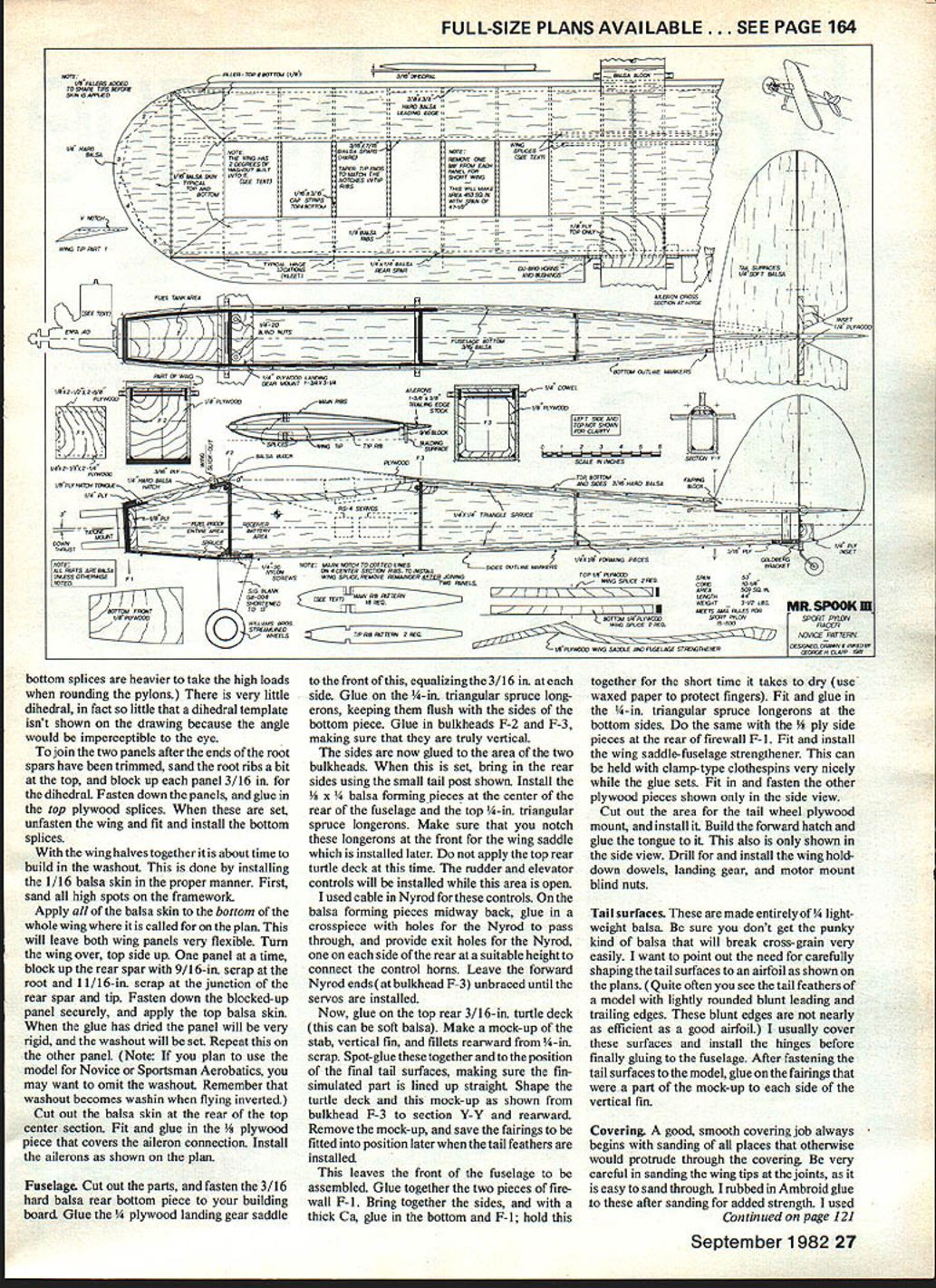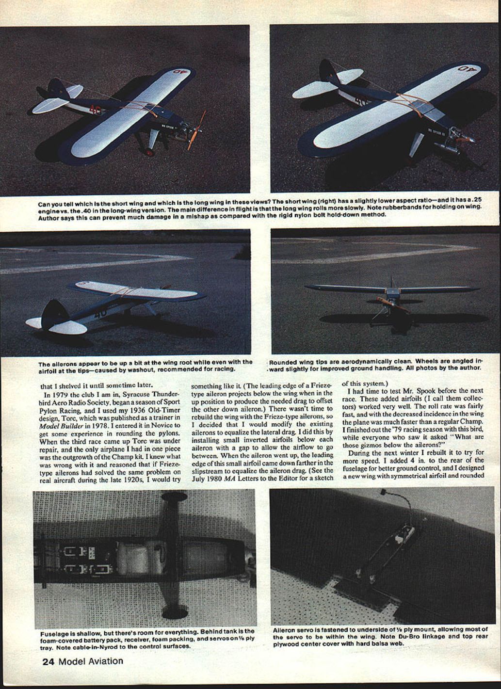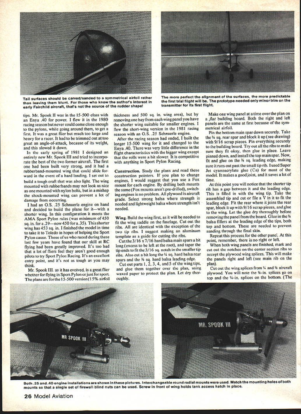 George H ciapp NO OCR TEXT Can tell lathe short wing long wing views short wing right has slightly lower aspect ratioand has 25 engine vs 40 long-wing version main difference flight isthatthe long wing rolls slowly Note rubberbandsfor holding wing Author says can prevent much damage mishap compared rigid nylon bolt hold-down method Rounded wing tips aerodynamically clean Wheels angled ward slightly improved ground handling photos author shelved until sometime later 1979 club am Syracuse Thunder bird Aero Radio Society began season Sport Pylon Racing used 1936 Old-Timer design Torc published trainer Model Builder 19781 entered Novice get some experience rounding pylons third race came up Torc under repair airplane piece outgrowth Champ kit knew what wrong reasoned Friezetype ailerons solved same problem real aircraft during late 1920s would try something like leading edge Friezetype aileron projects below wing up position produce needed drag offset other down aileron wasnt time rebuild wing Frieze-type ailerons decided would modify existing ailerons equalize lateral drag did installing small inverted airfoils below aileron gap allow aifflow go between aileron went up leading edge small airfoil came down farther slipstream equalize aileron drag See July 1980 MA Letters Editor sketch system time test Mr Spook before next race added airfoils call collec tors worked very well roll rate fairly fast decreased incidence wing plane much faster regular Champ finished out 79 racing season bird everyone saw asked What gizmos below ailerons During next winter rebuilt try speed added 4 rear fuselage better ground control designed new wing symmetrical airfoil rounded 24 Model Aviation ailerons appear up bit wing root airfoil tipscaused washout recommended racing ru~gC shallow theres room everytning uenina T5flK ins foam-covered battery pack receiver foam packing servos on1/a ply tray Note cable-in-Nyrod control surfaces ,, fastened underside OP/s ply mount allowing ins servo within wing Note Du-Bro linkage top rear plywood center cover hard balsa web HEY CHUCK-HOWHES TAPEDHE ALSO WORKS FEET ON WHENDO YOUGET DONT BE DENSE COME THISANDI-4ETURNSTHE 5TICKAJD RUDDER TIME TODO THIS ThE CITATIONGOES GUY TALKS WITHTHROTTLE TOOPEDALS THOrYOU HAD ON AUTO -I GO ON p THE FAR OUT7 TOGIRDLE THE R/C DESIGN-OVER LSA FAIRING BLOCK/4 BALSA SHEET FOR ~TAILV ObETO iSTANBUL ANDBAOALL TAIL SURFACES -Us R/C TYPES DONTI/4x /4 SPRUCE TRIANGLEISANDED TO STREAMLINE ~~ SLEEPLII-EYOULAZY ,,ARTISTS ALONG FUSELAGE CORNERS DONTTHAT\pQ~CHEEZELEVATOR 4 PLYWOOD - oo AILERUN SERVOBUSHING TO GUIDE INTO C/S RIBSAILERON RODS BALSA FAIRING BLOCKFROM SERVOS 3/16 PLYVOD OVER I/4DOWEL V4 PLYVOOD HORN MOUT GOLDBERG BRACKET ON 3/16 PLYnOD BASE 3/IS HARD BALSA FUSELAGE TOP SIDES AND BOTTOM BALSA HATCHI/B X 1/4 FORMERS MID BODY ONLY 1/8 PLY TONGUE i/8 PL WCOD WING SADDLE UP TO FIREWAj 1/4 SQ BALSA REAR SPAR NOSE 8x 3/8 BALSA AILEROIJ T EDGE STOCK ENGINE SERVO 1/16 SHEET BAJ5A SKIN TOP AND BOTfl /8 X 7/16PLYWOD TOPF 3 SPAR SPLLE FRONT ANDSACKI/B PLGA/CflD I/4x 7/16 PLYWOD BOTTOMI/4HARD BALSA SPAR SPUCE FRONT AND BACK AP STRIPS 1/4 X 3/4x 3 4 PYVcGL G MOUNTTOP AND BOTTOM F 11/8SPRUCE510 6B 008 ALUMInUM BLANK3/6 K 3/B HARD3/16K 7/16 HARD BALSA SPARS TATONE MOUNTPLYWOOD DOL8LEDTRIANGLE i/~\-IORTEN TO 13BALSA L EDGEItP AND BOTTOM TO j I/4-2ONYUYJ SCREW INTO TNUThIN LIACOD2W ILLIAMS WHEELI/16SHEETBALSA L EDGETOPAND BOTTOMI/B BALSA RIBS SYTMETRICALAND ALL ALIKE tips Mr Spook II 15-500 class Enya 40 power flew 1980 racing season never could come close enough pylons going around get first great flier much too large heavy racer trimmed out too great angle-of-attack because its weight slowed down early spring 1981 designed entirely new Mr Spook III tried incorpo rate best two former aircraft first built very strong rubberband-mounted wing could slide ward event hard landing set out build tough craft also light wing mounted rubberbands may look nice mounted nylon bolts mishap shock-mounted wing can prevent lot damage occurring OS 25 Schnuerle engine hand decided build plane itwith shorter wing configuration meets AMA Sport Pylon rules minimum 450 sq 29now 450 35 shorter wing has 453 sq finished model time take Toledo hopes helping Sport Pylon cause us raced during last few years have found skill RC flying greatly improved Its too bad lot fliers feel arent good enough pilots try Sport Pylon Racing Its excellent entry point its tough may think Mr Spook IlL has evolved great flier whether flying Sport Pylon just sport plans 15-500 version 15% airfoil thickness 500 sq wing area removing bay wing panel have shorter wing suitable smaller engines flew short-wing version 1981 racing season OS 25 Schnuerle engine After racing season ended built longer 15-500 wing changed Enya 40 very little difference flight characteristics bigger wing except rolls bit slower competitive anything Sport Pylon Racing Construction Study plans read construction pointers plan change engines would suggest use Fox mount engine drilling both mounts same Fox mounts arent pre-drilled switch ing engines no problem plywood aircraft grade Select strong balsa strength needed lightweight balsa strength isnt needed Wing Build wing first will needed fit wing saddle fuselage Cut out ribs identical exception two tip ribs suggest making aluminum template guide cutting ribs Cut 3/16 x 7/16 hard balsa main spars bit long excess left root taper tip ends fit 3/16 sq notch smaller tip ribs Also cut bit long ard balsa rear spars i sq hard balsa leading edge Cut out parts 1 2 3 4 5 wing tips glue together over plan using waxed paper protect plan Let dry thor oughly Make wing panel time over plan flat building board Both right left panels same first because sym metrical airfoil Pin bottom main spar down securely Take 1/4 sq rear spar block up see drawing 9/16 scrap pieces Pin everything securely building board Try Out ribs make sure fit okay glue place Leave pinned down install top main spar Now fit glue eading e
