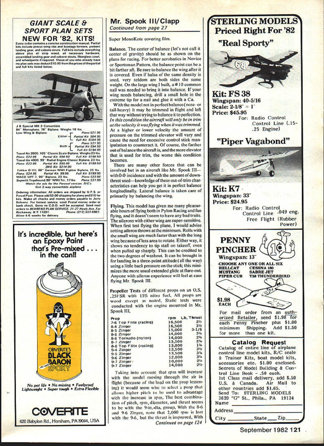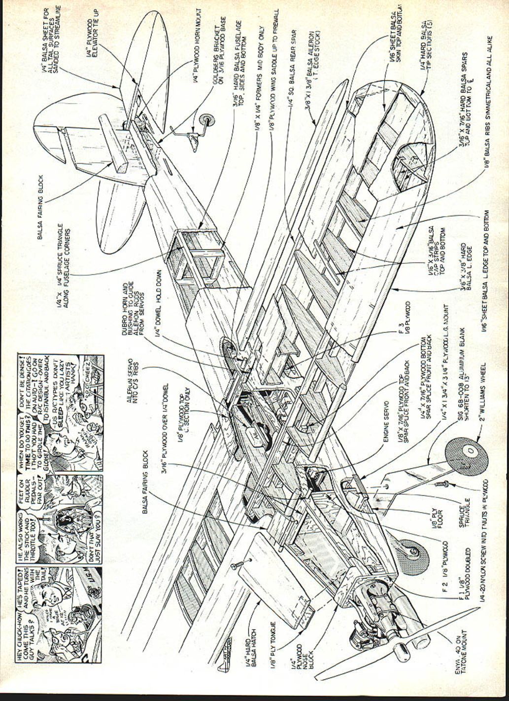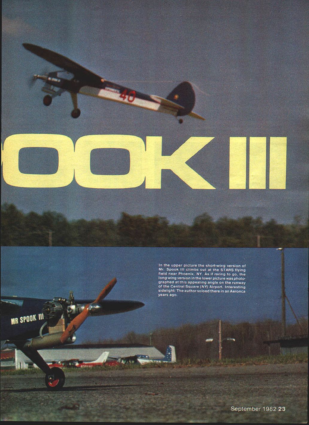 George H ciapp NO OCR TEXT Can tell lathe short wing long wing views short wing right has slightly lower aspect ratioand has 25 engine vs 40 long-wing version main difference flight isthatthe long wing rolls slowly Note rubberbandsfor holding wing Author says can prevent much damage mishap compared rigid nylon bolt hold-down method Rounded wing tips aerodynamically clean Wheels angled ward slightly improved ground handling photos author shelved until sometime later 1979 club am Syracuse Thunder bird Aero Radio Society began season Sport Pylon Racing used 1936 Old-Timer design Torc published trainer Model Builder 19781 entered Novice get some experience rounding pylons third race came up Torc under repair airplane piece outgrowth Champ kit knew what wrong reasoned Friezetype ailerons solved same problem real aircraft during late 1920s would try something like leading edge Friezetype aileron projects below wing up position produce needed drag offset other down aileron wasnt time rebuild wing Frieze-type ailerons decided would modify existing ailerons equalize lateral drag did installing small inverted airfoils below aileron gap allow aifflow go between aileron went up leading edge small airfoil came down farther slipstream equalize aileron drag See July 1980 MA Letters Editor sketch system time test Mr Spook before next race added airfoils call collec tors worked very well roll rate fairly fast decreased incidence wing plane much faster regular Champ finished out 79 racing season bird everyone saw asked What gizmos below ailerons During next winter rebuilt try speed added 4 rear fuselage better ground control designed new wing symmetrical airfoil rounded 24 Model Aviation ailerons appear up bit wing root airfoil tipscaused washout recommended racing ru~gC shallow theres room everytning uenina T5flK ins foam-covered battery pack receiver foam packing servos on1/a ply tray Note cable-in-Nyrod control surfaces ,, fastened underside OP/s ply mount allowing ins servo within wing Note Du-Bro linkage top rear plywood center cover hard balsa web HEY CHUCK-HOWHES TAPEDHE ALSO WORKS FEET ON WHENDO YOUGET DONT BE DENSE COME THISANDI-4ETURNSTHE 5TICKAJD RUDDER TIME TODO THIS ThE CITATIONGOES GUY TALKS WITHTHROTTLE TOOPEDALS THOrYOU HAD ON AUTO -I GO ON p THE FAR OUT7 TOGIRDLE THE R/C DESIGN-OVER LSA FAIRING BLOCK/4 BALSA SHEET FOR ~TAILV ObETO iSTANBUL ANDBAOALL TAIL SURFACES -Us R/C TYPES DONTI/4x /4 SPRUCE TRIANGLEISANDED TO STREAMLINE ~~ SLEEPLII-EYOULAZY ,,ARTISTS ALONG FUSELAGE CORNERS DONTTHAT\pQ~CHEEZELEVATOR 4 PLYWOOD - oo AILERUN SERVOBUSHING TO GUIDE INTO C/S RIBSAILERON RODS BALSA FAIRING BLOCKFROM SERVOS 3/16 PLYVOD OVER I/4DOWEL V4 PLYVOOD HORN MOUT GOLDBERG BRACKET ON 3/16 PLYnOD BASE 3/IS HARD BALSA FUSELAGE TOP SIDES AND BOTTOM BALSA HATCHI/B X 1/4 FORMERS MID BODY ONLY 1/8 PLY TONGUE i/8 PL WCOD WING SADDLE UP TO FIREWAj 1/4 SQ BALSA REAR SPAR NOSE 8x 3/8 BALSA AILEROIJ T EDGE STOCK ENGINE SERVO 1/16 SHEET BAJ5A SKIN TOP AND BOTfl /8 X 7/16PLYWOD TOPF 3 SPAR SPLLE FRONT ANDSACKI/B PLGA/CflD I/4x 7/16 PLYWOD BOTTOMI/4HARD BALSA SPAR SPUCE FRONT AND BACK AP STRIPS 1/4 X 3/4x 3 4 PYVcGL G MOUNTTOP AND BOTTOM F 11/8SPRUCE510 6B 008 ALUMInUM BLANK3/6 K 3/B HARD3/16K 7/16 HARD BALSA SPARS TATONE MOUNTPLYWOOD DOL8LEDTRIANGLE i/~\-IORTEN TO 13BALSA L EDGEItP AND BOTTOM TO j I/4-2ONYUYJ SCREW INTO TNUThIN LIACOD2W ILLIAMS WHEELI/16SHEETBALSA L EDGETOPAND BOTTOMI/B BALSA RIBS SYTMETRICALAND ALL ALIKE tips Mr Spook II 15-500 class Enya 40 power flew 1980 racing season never could come close enough pylons going around get first great flier much too large heavy racer trimmed out too great angle-of-attack because its weight slowed down early spring 1981 designed entirely new Mr Spook III tried incorpo rate best two former aircraft first built very strong rubberband-mounted wing could slide ward event hard landing set out build tough craft also light wing mounted rubberbands may look nice mounted nylon bolts mishap shock-mounted wing can prevent lot damage occurring OS 25 Schnuerle engine hand decided build plane itwith shorter wing configuration meets AMA Sport Pylon rules minimum 450 sq 29now 450 35 shorter wing has 453 sq finished model time take Toledo hopes helping Sport Pylon cause us raced during last few years have found skill RC flying greatly improved Its too bad lot fliers feel arent good enough pilots try Sport Pylon Racing Its excellent entry point its tough may think Mr Spook IlL has evolved great flier whether flying Sport Pylon just sport plans 15-500 version 15% airfoil thickness 500 sq wing area removing bay wing panel have shorter wing suitable smaller engines flew short-wing version 1981 racing season OS 25 Schnuerle engine After racing season ended built longer 15-500 wing changed Enya 40 very little difference flight characteristics bigger wing except rolls bit slower competitive anything Sport Pylon Racing Construction Study plans read construction pointers plan change engines would suggest use Fox mount engine drilling both mounts same Fox mounts arent pre-drilled switch ing engines no problem plywood aircraft grade Select strong balsa strength needed lightweight balsa strength isnt needed Wing Build wing first will needed fit wing saddle fuselage Cut out ribs identical exception two tip ribs suggest making aluminum template guide cutting ribs Cut 3/16 x 7/16 hard balsa main spars bit long excess left root taper tip ends fit 3/16 sq notch smaller tip ribs Also cut bit long ard balsa rear spars i sq hard balsa leading edge Cut out parts 1 2 3 4 5 wing tips glue together over plan using waxed paper protect plan Let dry thor oughly Make wing panel time over plan flat building board Both right left panels same first because sym metrical airfoil Pin bottom main spar down securely Take 1/4 sq rear spar block up see drawing 9/16 scrap pieces Pin everything securely building board Try Out ribs make sure fit okay glue place Leave pinned down install top main spar Now fit glue eading e