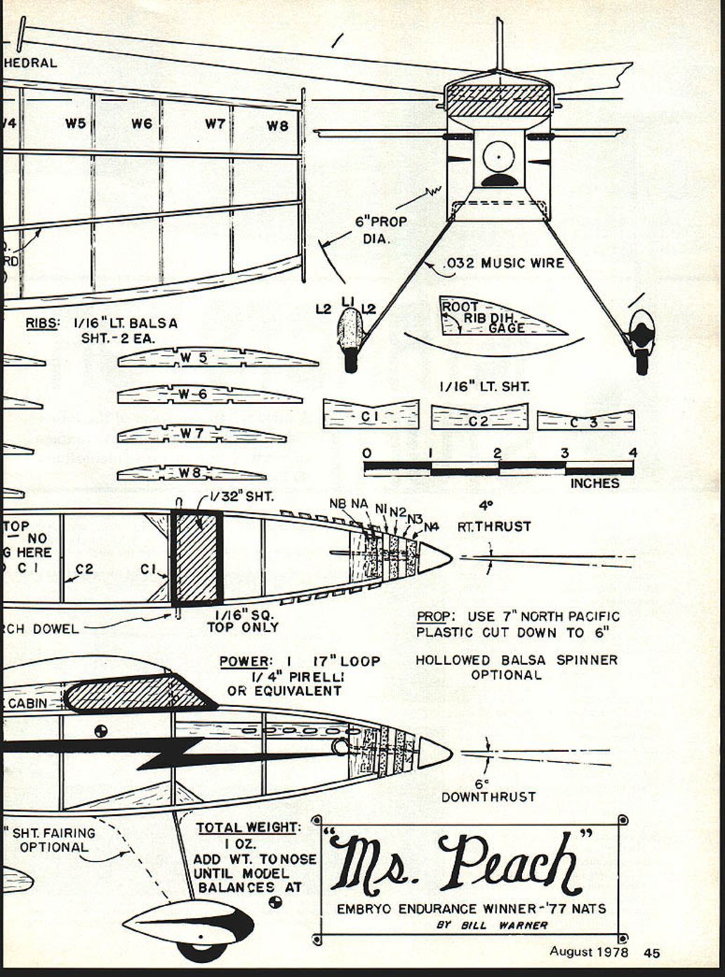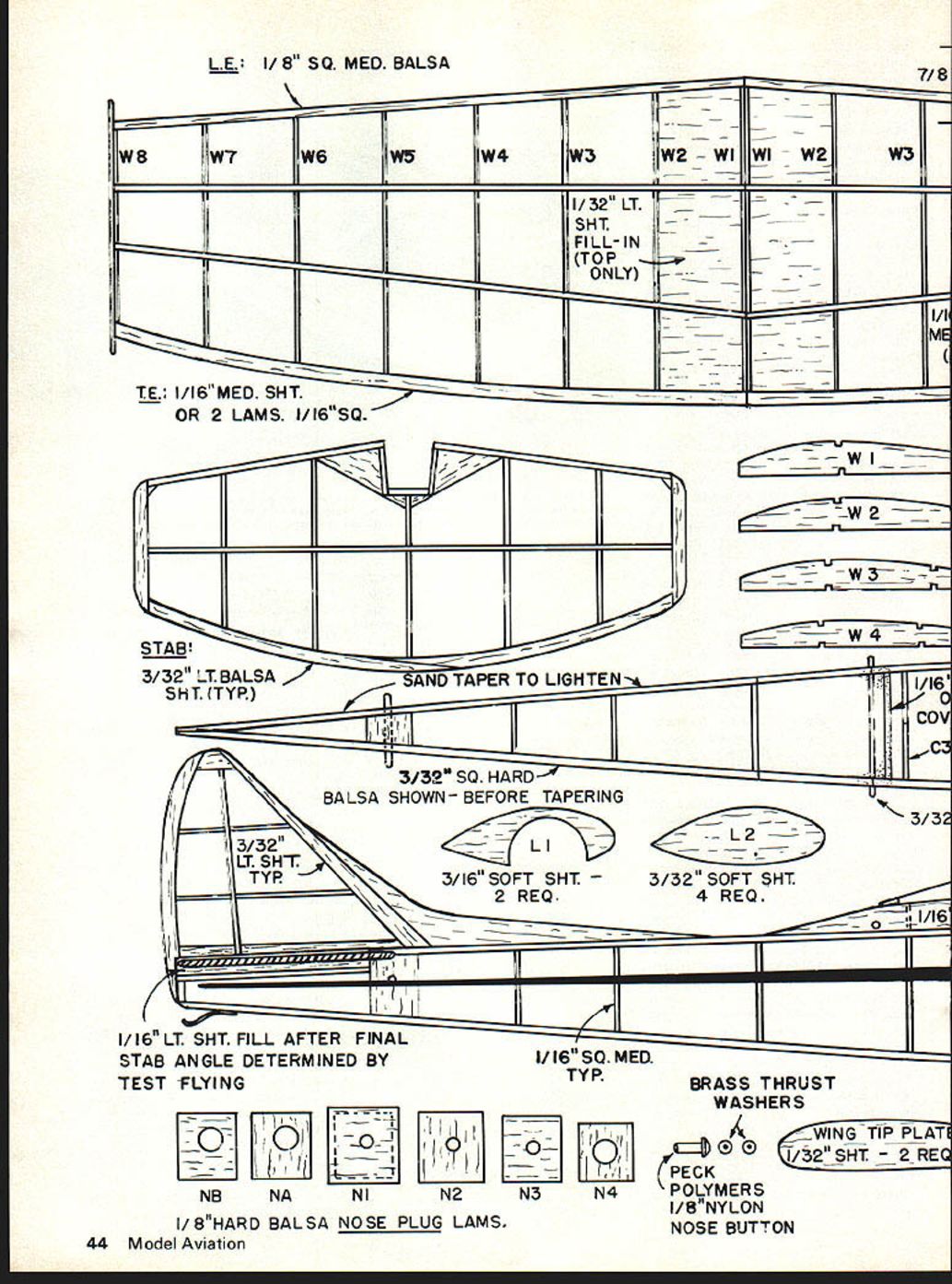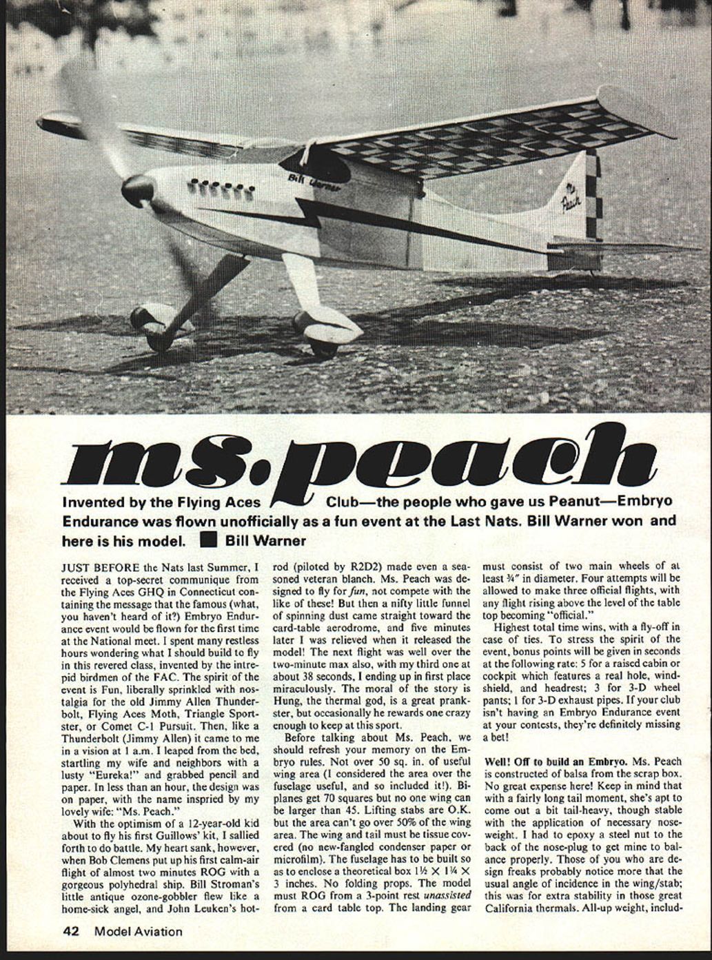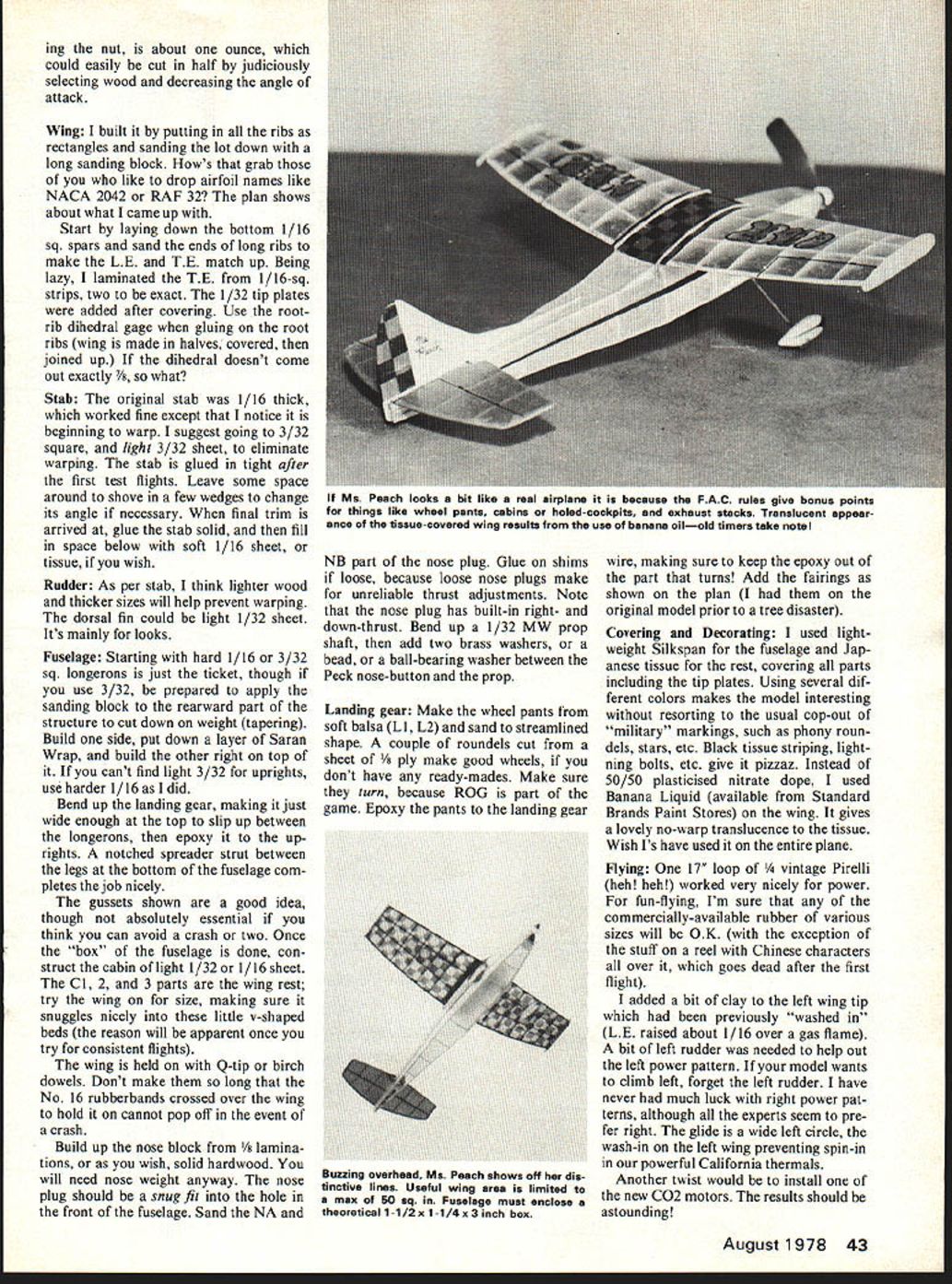 here model U Bill Warner JUST BEFORE Nats last Summer received top-secret communique Flying Aces GHQ Connecticut con taining message famous what havent heard Embryo Endur ance event would flown first time National meet spent restless hours wondering what should build fly revered class invented intre pid birdmen FAC spirit event Fun liberally sprinkled nos talgia old Jimmy Allen Thunder bolt Flying Aces Moth Triangle Sport ster Comet C-I Pursuit like Thunderbolt Jimmy Allen came vision am leaped bed startling wife neighbors lusty Eureka grabbed pencil paper less hour design paper name inspried lovely wife Ms Peach optimism 12-year-old kid about fly first Guillows kit sallied forth battle heart sank however Bob Clemens put up first calm-air flight almost two minutes ROG gorgeous polyhedral ship Bill Stroman s little antique ozone-gobbler flew like home-sick angel John Leukens hotrod piloted R2D2 made sea soned veteran blanch Ms Peach de signed fly fun compete like nifty little funnel spinning dust came straight toward card-table aerodrome five minutes later relieved released model next flight well over two-minute max also third about 38 seconds ending up first place miraculously moral story Hung thermal god great prank ster occasionally rewards crazy enough keep sport Before talking about Ms Peach should refresh memory Em bryo rules over 50 sq useful wing area considered area over fuselage useful included Bi planes get 70 squares no wing can larger 45 Lifting stabs OK area cant go over 50% wing area wing tail must tissue cov ered no new-fangled condenser paper microfilm fuselage has built enclose theoretical box 1 X 1 X 3 inches No folding props model must ROG 3-point rest unassisted card table top landing gear must consist two main wheels least eter Four attempts will allowed make three official flights flight rising above level table top becoming official Highest total time wins fly-off case ties stress spirit event bonus points will given seconds following rate 5 raised cabin cockpit features real hole wind shield headrest 3 3-D wheel pants 1 3-D exhaust pipes club isnt having Embryo Endurance event contests theyre definitely missing abet Well Off build Embryo Ms Peach constructed balsa scrap box No great expense Keep mind fairly long tail moment shes apt come out bit tail-heavy though stable application necessary noseweight epoxy steel nut back nose-plug get bal ance properly de sign freaks probably notice usual angle incidence wing/stab extra stability great California thermals All-up weight includ 42 Model Aviation Invented Flying Aces bthe people gave us PeanutEmbryo Endurance flown unofficially fun event Last Nats Bill Warner won ing nut about ounce could easily cut half judiciously selecting wood decreasing angle attack Wing built putting ribs rectangles sanding lot down long sanding block Hows grab like drop airfoil names like NACA 2042 RAF 32 plan shows about what came up Start laying down bottom 1/16 sq spars sand ends long ribs make LE TE match up Being lazy laminated TE 1/16-sq strips two exact 1/32 tip plates added after covering Use rootrib dihedral gage gluing root ribs wing made halves covered joined up dihedral doesnt come out exactly 7/s what Stab original stab 1/16 thick worked fine except notice beginning warp suggest going 3/32 square light 3/32 sheet eliminate warping stab glued tight after first test flights Leave some space around shove few wedges change its angle necessary final trim arrived glue stab solid fill space below soft 1/16 sheet tissue wish Rudder As per stab think lighter wood thicker sizes will help prevent warping dorsal fin could light 1/32 sheet Its mainly looks Fuselage Starting hard 1/16 3/32 sq longerons just ticket though use 3/32 prepared apply sanding block rearward part structure cut down weight tapering Build side put down layer Saran Wrap build other right top cant find light 3/32 uprights use harder 1/l6asldid Bend up landing gear making just wide enough top slip up between longerons epoxy up rights notched spreader strut between legs bottom fuselage com pletes job nicely gussets shown good idea though absolutely essential think can avoid crash two Once box fuselage done con struct cabin light 1/32 1/16 sheet Cl 2 3 parts wing rest try wing size making sure snuggles nicely little v-shaped beds reason will apparent once try consistent flights wing held Q-tip birch dowels Dont make long No 16 rubberbands crossed over wing hold cannot pop off event crash Build up nose block /s lamina tions wish solid hardwood will need nose weight anyway nose plug should snug fit hole front fuselage Sand NA NB part nose plug Glue shims loose because loose nose plugs make unreliable thrust adjustments Note nose plug has built-in right- down-thrust Bend up 1/32 MW prop shaft add two brass washers bead ball-bearing washer between Peck nose-button prop Landing gear Make wheel pants soft balsa L 1 L2 sand streamlined shape couple roundels cut sheet /s ply make good wheels dont have ready-mades Make sure turn because ROG part game Epoxy pants landing gear wire making sure keep epoxy out part turns Add fairings shown plan original model prior tree disaster Covering Decorating used light weight Silkspan fuselage Jap anese tissue rest covering parts including tip plates Using several dif ferent colors makes model interesting resorting usual cop-out military markings such phony roun dels stars etc Black tissue striping light ning bolts etc give pizzaz Instead 50/50 plasticised nitrate dope used Banana Liquid available Standard Brands Paint Stores wing gives lovely no-warp translucence tissue Wish have used entire plane Flying 17 loop age Pirelli heb heh worked very nicely power fun-flying Im sure commercially-available rubber various sizes will OK exception stuff reel Chinese characters over goes dead after first flight added bit clay left wing tip previously washed LE raised about 1/16 over gas flame bit left rudder needed help out left power pattern model wants cli