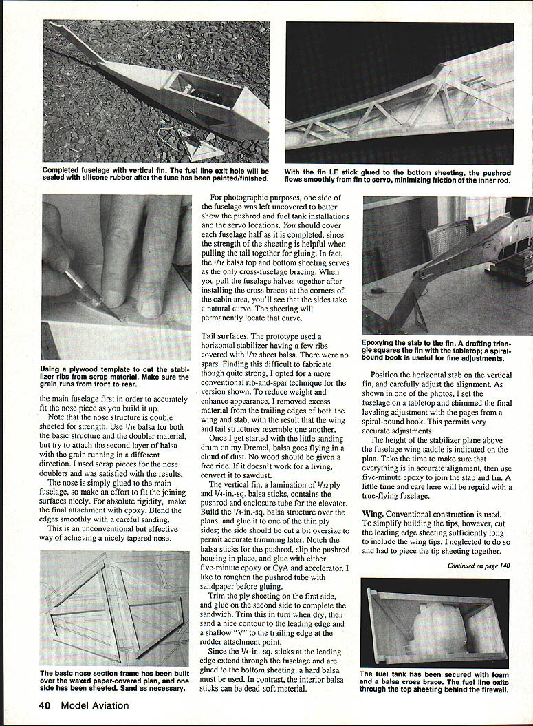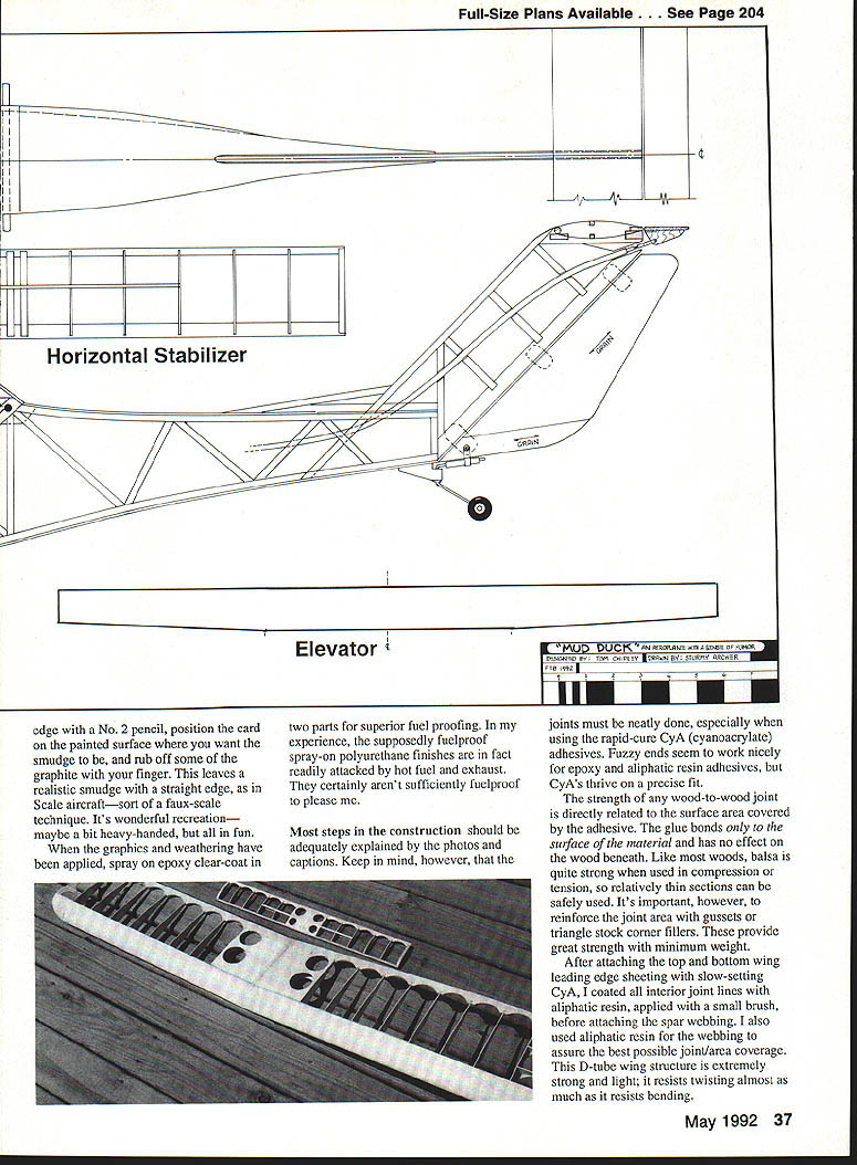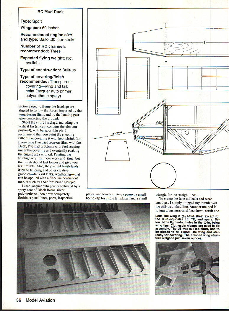 nicture Duck Above winy r sprayed Bla Ic enough beginners its ready burst aerobatics experienced re covered transparent film fuselage painted polyurethane Fictitious panel lines etc faux-scale oil leaks enjoyable r 11 th afti 4 fout dancing sed rockers c completed isnt pc n wir e en o prefe have back SI off thE rig six year lay I felt glue Aviatior fence turning ridiculously tight wing vertical hopping back over lower Duck makes laugh out loud Pylon turns around killer tree field also hoot model aerial clown irreverent puppy sage old Zen master 4fst d tli Just gentle touch stick firm hand throttle Like Old-Timer aircraft characteristically graceful lines mod isnt intended push th4 frontiers aeronautic. science Its airplane bas warmth Mud Duck subtle grace tallenges flight eels ii aesthetically occasions have handed transmitter absolute neophytes proceeded talk through standard turns level flight ant speed beginner has plenty time May 1992 33 n fly qui4 wind Left high I-tall gangly oversize wheels dancing exposed rockers little Salto 30 far cry superolean lines sanitary retracts conventional high-powered designs Right Transparent film wing tall casts interesting shadows ground comprehend react what model does contrast high-performance aircraft can fly entirely reaction time inviting certain destruction Mud Duck its safe fall behind curve hands seasoned pilot though Mud Duck will perform like air-show Super Cublow-altitude loops steep turns hedgehops kamikaze power dives one-wheel touch-and-goes stall characteristics user friendlyshell hang nose up gently drop nose mush way good breeze can pull nose up reduce throttle shell hang air like stringless kite As wind picks up lightness becomes liability ground Mud Duck requires some tie-down security Dont try land model very low altitude turbulence experienced hand controls designed penetrate structure will withstand stress normal flight landing loads wing despite its lightness has proven adequate loads possible Saito 30 four-stroke given frontal area Mud Duck tested known package Changing part requires changing other areas turn insisted attaching larger engine example youd have beef up wing thicker materials leading edge sheeting dont recommend making modifications Construction structure all-balsa except plywood used firewall wing dihedral brace sheeting vertical fin landing gear mounting panel fuselage bottom less conventional construction techniques used Use 1/16-thick sheet balsa wing fuselage additional thickness unnecessary square rectangular 34 Model Aviation Left Close-up pushrod/rudder coupling steerable tall wheel connection Right scratch-built muffler mounted place Left Salto 30 up close Note exposed pushrods open-air valves springs Center Scratch-built muffler uses small aerosol can brass tubing epoxy small section silicone tubing Right author paid serious attention replicating full-scale detail BLR SlEET 6 55 DflLS SFqR FLS YE 4EALSR RS59 4 HRRDWQD DOJEL 4B4LbflRIEBOThEND5 AND iWO CENTD BRLSR SHEET NOTE GRIN DIRECflON i LSR B FINALLY FOUND CfN LANDN ThIN ONCE SPINNER OU N TYISINThEEEOFTEHOLDERPCEU NJ 4SSPRUC TOP 6 RIBS I BLSR\ Q MLSA RILS -7 ADI MUSIC/ IG WHEEL5 3C PIINIMUP4 77 7 7 ELS LE SHEET ORBIN FRflME EILSA SHEET TOP&Eon-j .77 7 7 7zz SHEET SIDE TWO PLY NOSE ONLY NOrE GRRI DIPECnON MRLL EOUR STROKE ENGINE SHEET Th - 5QBPLSR ELEVATOR PUS-I ROD PRAWN 8 lbPi CHIPLa~* QSIGNP & STAB 490WSHEET CABIN 46 E1LSP IEET TOP&aOTlOM SIDES \ \ \ /7 7/ -716I F. SHRME T3 50 UGUI THOUGH RC Mud Duck sections used frame fuselage aligned follow forces imparted wing during flight landing gear upon contacting ground Sheet entire fuselage including vertical fin since contains elevator pushrod balsa thin ply recommend paint sheeting rather covering heat-shrink film time Ive tried iron-on films Duck Ive problems fuel seeping under covering eventually soaking engine area oil Painting fuselage requires work time finish should last longer give less trouble Also painted finish lends itself lettering other creative graphicsfaux oil leaks weatheringthat can applied fine-line permanent marker such Sanford brand Sharpie used lacquer auto primer followed spray coat Black Baron silver polyurethane drew completely fictitious panel lines ports inspection n -I I -xflA S plates louvers using penny small bottle cap circle templates small ______7 __________________ U______ __ 4 777 ii // N NK NNK / 6 [2 triangle straight lines create fake oil leaks wear smudges simply dragged thumb over still-wet inked line Another method turn business card face down scrub Left The wing balsa sheet except A-ln-sq-balsa LE TE spars low Note lightening holes A-in balsa wing tips clothespin clamps used tip assembly LE cut too short pieced fit Right wing stab ready covering finished wing struc ture weighed just seven ounces 36 Model Aviation Type Sport Wingspan 60 inches Recommended engine size type Saito 30 four-stroke Number RC channels recommended Three Expected flying weight available Type construction Built-up Type covering/finish recommended Transparent coveringwing tail paint lacquer auto primer polyurethane spray 0 Full-Size Plans Available . See Page 204 ____________ L __________ ___________ i4___ ___ ___I____I__ Horizontal Stabilizer 7 0 ____________________ Elevator tUC1 RN FROPLRB WB U &S OU HUMOR DRJ&NOO RY rofr COIPLOY BOURN BY UTURW gRCUER TCO 9Z IU3 45B III edge No 2 pencil position card painted surface want smudge rub off some graphite finger leaves realistic smudge straight edge Scale aircraftsort faux-scale technique Its wonderful recreation maybe bit heavy-handed fun graphics weathering have applied spray epoxy clear-coat two parts superior fuel proofing experience supposedly fuelproof spray-on polyurethane finishes fact readily attacked hot fuel exhaust certainly arent sufficiently fuelproof please Most steps construction should adequately explained photos captions Keep mind however joints must neatly done especially using rapid-cure CyA cyanoaciylate adhesives Fuzzy e