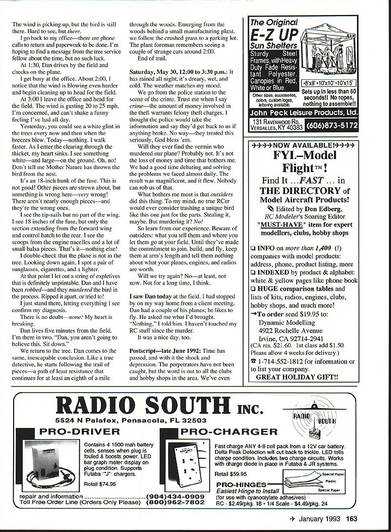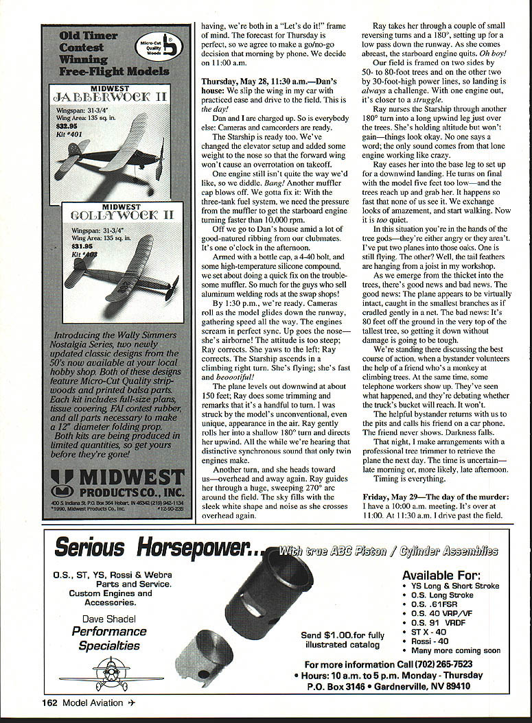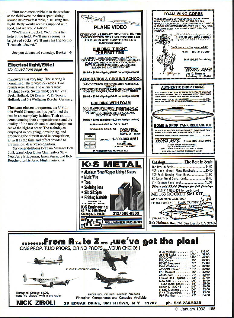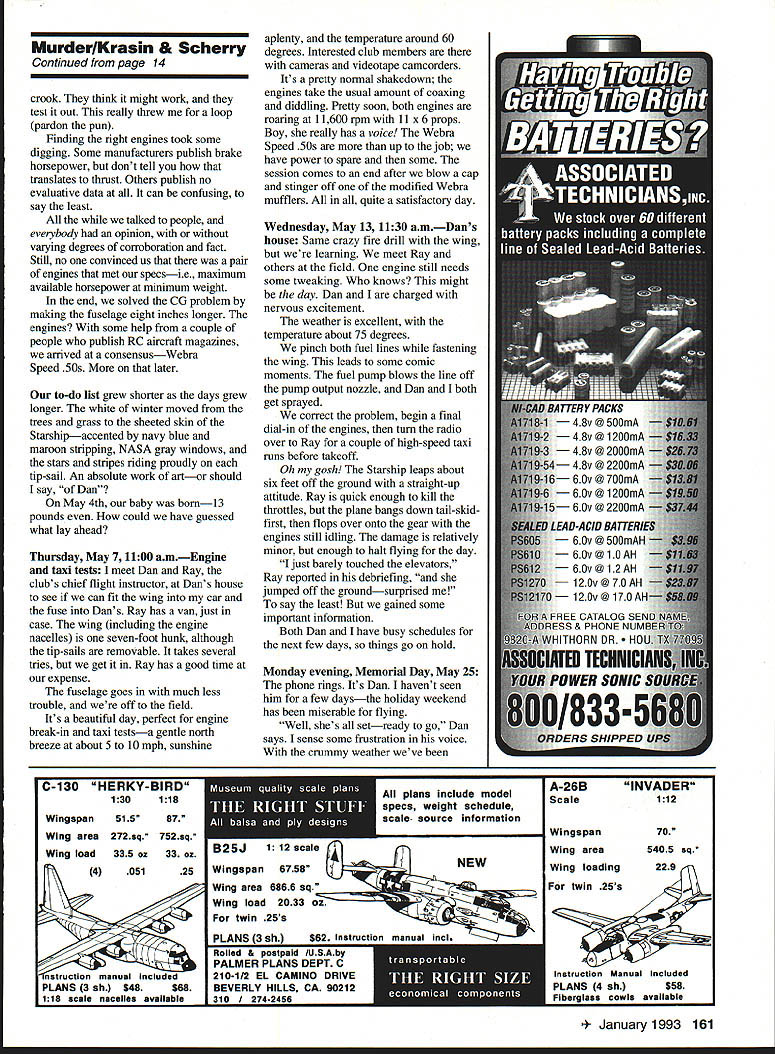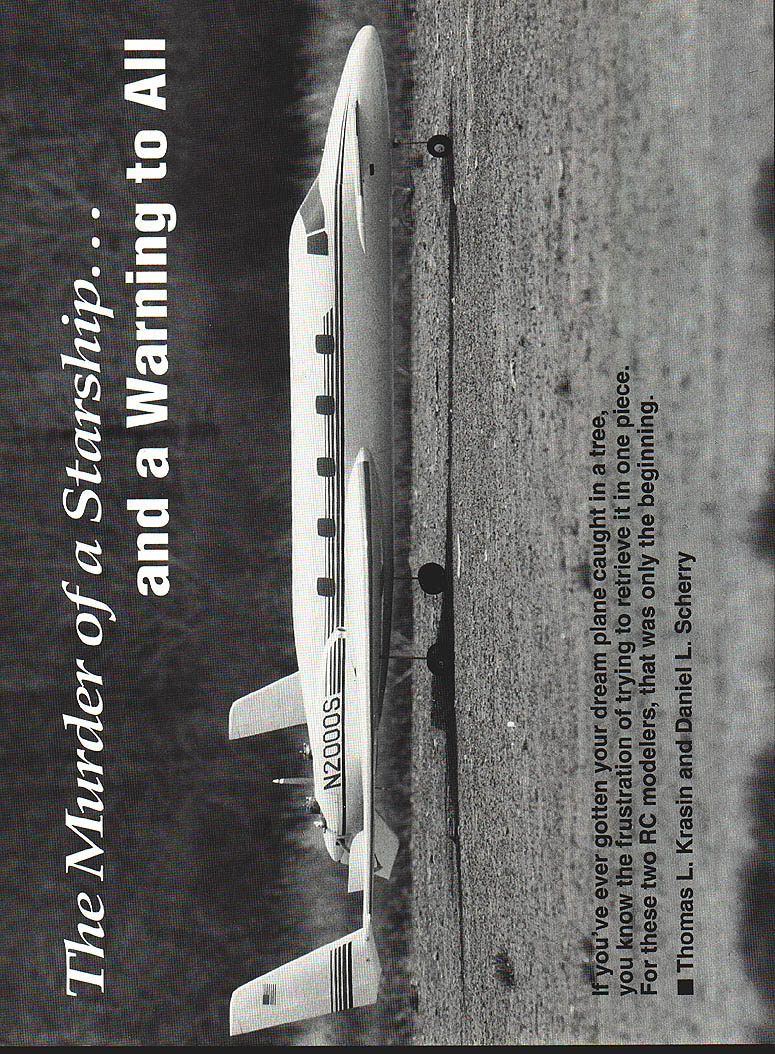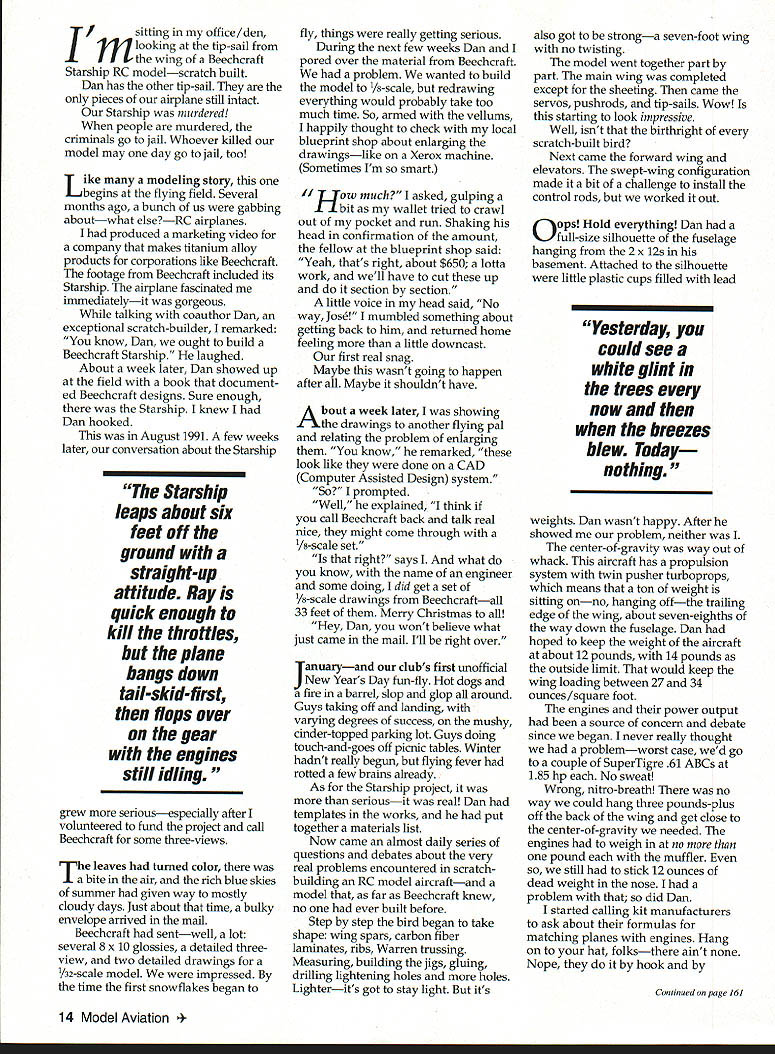 NO OCR TEXT sitting office/den m looking tip-sail wing Beechcraft Starship RC modelscratch built Dan has other tip-sail pieces airplane still intact Starship murdered people murdered criminals go jail Whoever killed model may day go jail too Like modeling story begins flying field Several months ago bunch us gabbing aboutwhat elseRC airplanes produced marketing video company makes titanium alloy products corporations like Beechcraft footage Beechcraft included its Starship airplane fascinated immediatelyit gorgeous talking coauthor Dan exceptional scratch-builder remarked know Dan ought build Beechcraft Starship laughed About week later Dan showed up field book document ed Beechcraft designs Sure enough Starship knew Dan hooked August 1991 few weeks later conversation about Starship Starship leaps about six feet off ground straight-up attitude Ray quick enough kill throttles plane bangs down tail-skid-first flops over gear engines still idling grew seriousespecially after volunteered fund project call Beechcraft some three-views leaves turned color La bite air rich blue skies summer given way mostly cloudy days Just about time bulky envelope arrived mail Beechcraft sentwell lot several 8 x 10 glossies detailed threeview two detailed drawings V32-scale model impressed time first snowflakes began fly things really getting serious During next few weeks Dan pored over material Beechcraft problem wanted build model /8-scale redrawing everything would probably take too much time So armed vellums happily thought check local blueprint shop about enlarging drawingslike Xerox machine Sometimes Im smart Liow much asked gulping Ilbit wallet tried crawl out pocket run Shaking head confirmation amount fellow blueprint shop said Yeah thats right about $650 lotta work well have cut up section section little voice head said No way Jose mumbled something about getting back him returned home feeling little downcast first real snag Maybe wasnt going happen after Maybe shouldnt have About week later showing drawings another flying pal relating problem enlarging know remarked look like done CAD Computer Assisted Design system So prompted Well explained think call Beechcraft back talk real nice might come through /8-scale set right says what know name engineer some doing did get set /8-scale drawings Beechcraftall 33 feet Merry Christmas Hey Dan wont believe what just came mail Ill right over Januaryand clubs first unofficial New Years Day fun-fly Hot dogs fire barrel slop glop around Guys taking off landing varying degrees success mushy cinder-topped parking lot Guys doing touch-and-goes off picnic tables Winter hadnt really begun flying fever rotted few brains already As Starship project seriousit real Dan templates works put together materials list Now came almost daily series questions debates about very real problems encountered scratchbuilding RC model aircraftand model far Beechcraft knew no ever built before Step step bird began take shape wing spars carbon fiber laminates ribs Warren trussing Measuring building jigs gluing drilling lightening holes holes Lighterits got stay light its also got stronga seven-foot wing no twisting model went together part part main wing completed except sheeting came servos pushrods tip-sails Wow starting look impressive Well isnt birthright scratch-built bird Next came forward wing elevators swept-wing configuration made bit challenge install control rods worked out O ops Hold everything Dan full-size silhouette fuselage hanging 2 x 12s basement Attached silhouette little plastic cups filled lead Yesterday could see white glint trees now breezes blew Today nothing weights Dan wasnt happy After showed problem neither center-of-gravity way out whack aircraft has propulsion system twin pusher turboprops means ton weight sitting onno hanging offthe trailing edge wing about seven-eighths way down fuselage Dan hoped keep weight aircraft about 12 pounds 14 pounds outside limit would keep wing loading between 27 34 ounces/square foot engines power output source concern debate since began never really thought problemworst case wed go couple SuperTigre 61 ABCs 185 hp No sweat Wrong nitro-breath no way could hang three pounds-plus off back wing get close center-of-gravity needed engines weigh no pound muffler still stick 12 ounces dead weight nose problem did Dan started calling kit manufacturers ask about formulas matching planes engines Hang hat folksthere aint Nope hook Continued page 161 14 Model Aviation erlKrasin & Scherry Continued page 14 crook think might work test out really threw loop pardon pun Finding right engines took some digging Some manufacturers publish brake horsepower dont tell translates thrust Others publish no evaluative data can confusing say least talked people everybody opinion varying degrees corroboration fact Still no convinced us pair engines met specsie maximum available horsepower minimum weight end solved CG problem making fuselage eight inches longer engines some help couple people publish RC aircraft magazines arrived consensusWebra Speed SOs later to-do list grew shorter days grew longer white winter moved trees grass sheeted skin Starshipaccented navy blue maroon stripping NASA gray windows stars stripes riding proudly tip-sail An absolute work artor should say Dan May 4th baby born13 pounds could have guessed what lay ahead Thursday May 7 1100 amEngine taxi tests meet Dan Ray clubs chief flight instructor Dans house see can fit wing car fuse Dans Ray has van just case wing including engine nacelles seven-foot hunk although tip-sails removable takes several tries get Ray has good time expense fuselage goes much less trouble off field Its beautiful day perfect engine break-in taxi testsa gentle north breeze about 5 10 mph sunshine C-130 HERKY-BIRD 130118 Wingspan515 87 Wing area272sq752sq Wing load335 oz 33 oz 405125 natruction manual included PLANS 3 sh $48 $68 116 scale nacelles available aplenty temperature around 60 degrees Interested club 