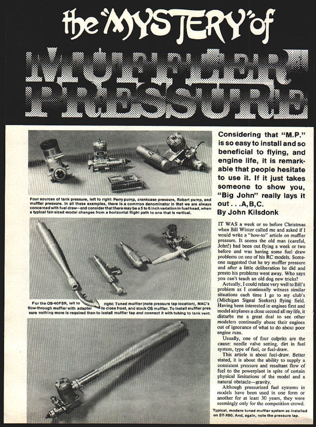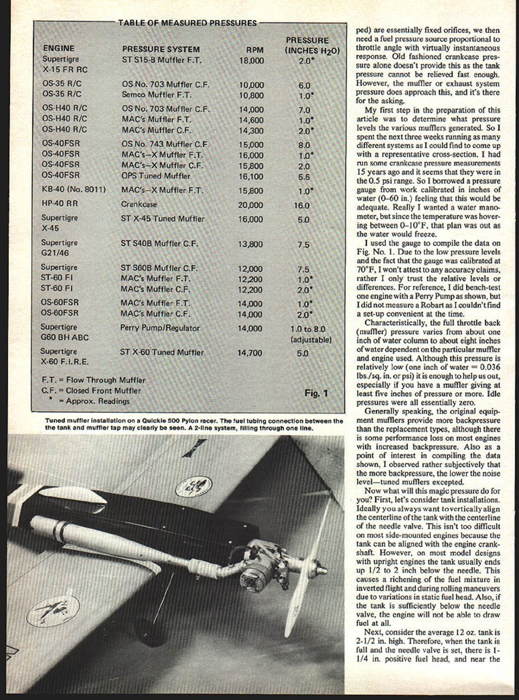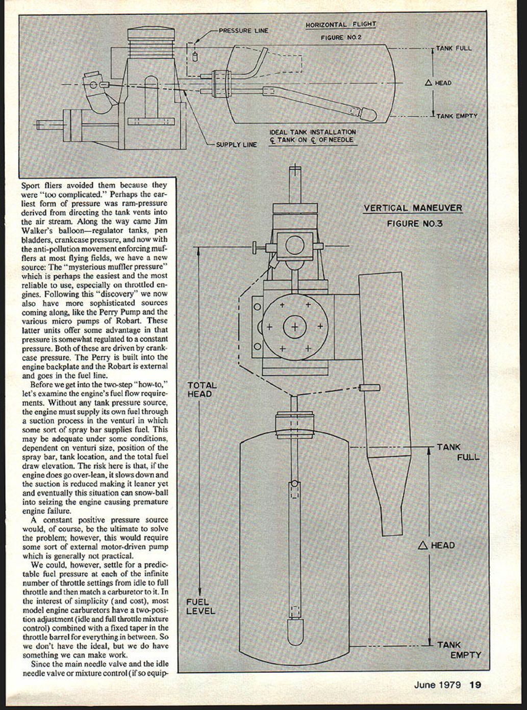 Considering MP easy install beneficial flying engine life remark able people hesitate use it just takes someone show Big John really lays out. ABC John Kilsdonk IT WAS week before Christmas Bill Winter called asked would write how-to article muffler pressure seems old man careful John out flying week two before having some fuel draw problems RC models Some suggested try muffler pressure after little deliberation did presto problems went away says cant teach old dog new tricks Actually could relate very well Bills problem continually witness similar situations time go clubs Michigan Signal Seekers flying field Having interested engines first model airplanes close second life disturbs great deal see other modelers continually abuse engines out ignorance what about poor engine runs Usually four culprits cause needle valve setting dirt fuel system type fuel fuel-draw article about fuel-draw Better stated about ability supply consistent pressure resultant flow fuel powerplant spite certain physical limitations model natural obstaclegravity Although pressurized fuel systems models have used form another least 30 years seemingly competition crowd Typical modern tuned muffler system installed ST-X60 again note pressure tap Four sources tank pressure left right Perry pump crankcase pressure Robart pump muffler pressure examples common denominator always concerned fuel drawand consider thatthere may 5 6 inch variation fuel head typical fair-sized model changes horizontal flight path vertical OS-4OFSR left right Tuned muffler note pressure tap location MACs flow-through muffler close front stock OS muffler install muffler pres sure nothing required install muffler tap connect tubing tank vent Sport fliers avoided because too complicated Perhaps ear liest form pressure ram-pressure derived directing tank vents air stream Along way came Jim Walkers balloonregulator tanks pen bladders crankcase pressure now anti-pollution movement enforcing muf flers flying fields have new source mysterious muffler pressure perhaps easiest reliable use especially throttled en gines Following discovery now also have sophisticated sources coming along like Perry Pump various micro pumps Robart latter units offer some advantage pressure somewhat regulated constant pressure Both driven crank case pressure Perry built engine backplate Robart external goes fuel line Before get two-step how-to lets examine engines fuel flow require ments Without tank pressure source engine must supply its own fuel through suction process venturi some sort spray bar supplies fuel may adequate under some conditions dependent venturi size position spray bar tank location total fuel draw elevation risk engine does go over-lean slows down suction reduced making leaner yet eventually situation can snow-ball seizing engine causing premature engine failure constant positive pressure source would course ultimate solve problem however would require some sort external motor-driven pump generally practical could however settle predic table fuel pressure infinite number throttle settings idle full throttle match carburetor interest simplicity cost model engine carburetors have two-posi tion adjustment idle full throttle mixture control combined fixed taper throttle barrel everything between So dont have ideal have something can make work Since main needle valve idle needle valve mixture control equipJune1979 19 ped essentially fixed orifices need fuel pressure source proportional throttle angle virtually instantaneous response Old fashioned crankcase pres sure alone doesnt provide tank pressure cannot relieved fast enough However muffler exhaust system pressure does approach its asking first step preparation article determine what pressure levels various mufflers generated So spent next three weeks running different systems could find come up representative cross-section run some crankcase pressure measurements 15 years ago seems 05 psi range So borrowed pressure gauge work calibrated inches water 060 feeling would adequate Really wanted water mano meter since temperature hover ing between 0100F plan out water would freeze used gauge compile data Fig No 1 Due low pressure levels fact gauge calibrated 700F wont attest accuracy claims rather trust relative levels differences reference did bench-test engine Perry Pump shown did measure Robart couldnt find set-up convenient time Characteristically full throttle back muffler pressure varies about inch water column about eight inches water dependent particular muffler engine used Although pressure relatively low inch water lbs/sq psi enough help us out especially have muffler giving least five inches pressure Idle pressures essentially zero Generally speaking original equip ment mufflers provide backpressure replacement types although some performance loss engines increased backpressure Also point interest compiling data shown observed rather subjectively backpressure lower noise leveltuned mufflers excepted Now what will magic pressure First lets consider tank installations Ideally always want vertically align centerline tank centerline needle valve isnt too difficult side-mounted engines because tank can aligned engine crank shaft However model designs upright engines tank usually ends up 1/2 2 inch below needle causes richening fuel mixture inverted flight during rolling maneuvers due variations static fuel head Also tank sufficiently below needle valve engine will able draw fuel Next consider average 12 oz tank 2-1/2 high Therefore tank full needle valve set 11/4 positive fuel head near Tuned muffler installation Quickie 500 Pylon racer fuel tubing connection between the tank muffler tan may clearly seen 2-line system filling throuah line bottom tank 1-1/4 negative head 2-1/2 head change during flight noticeable taking off rich side going progressively leaner through flight Refer Fig No 2 vertical maneuvers becomes evident pressure head changes since now have 5 6 head change Refer Fig No 3 may have noticed