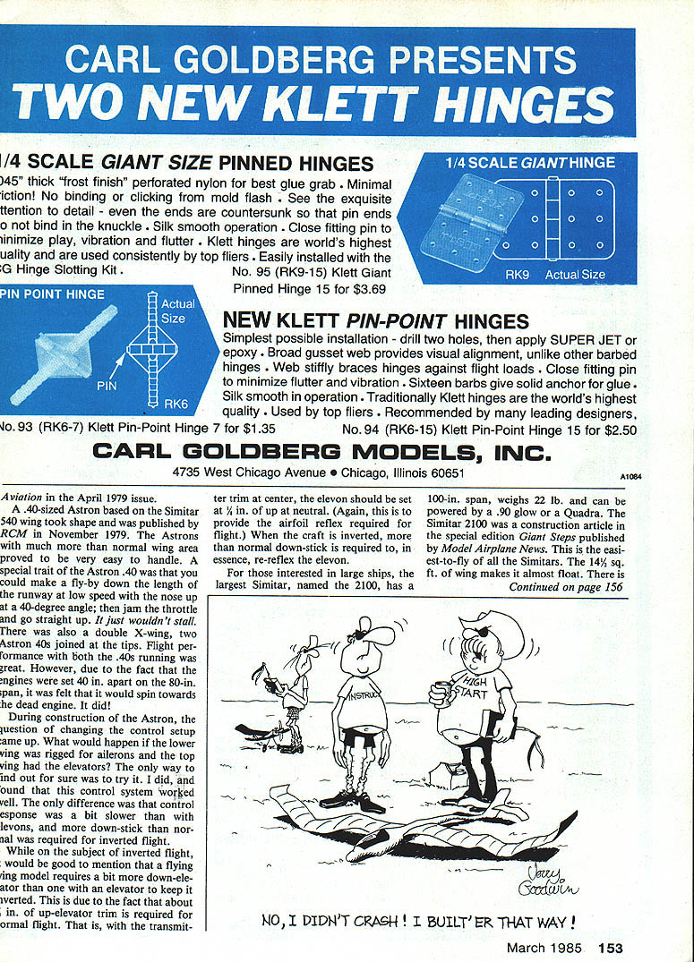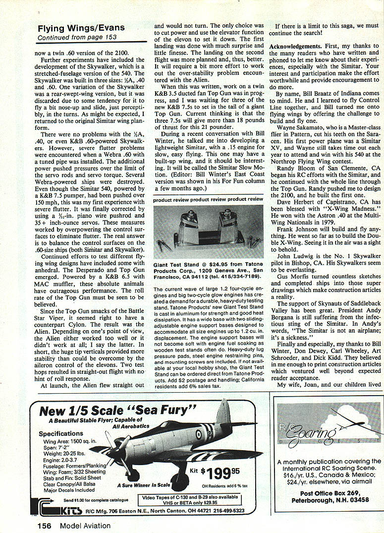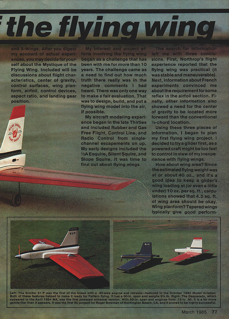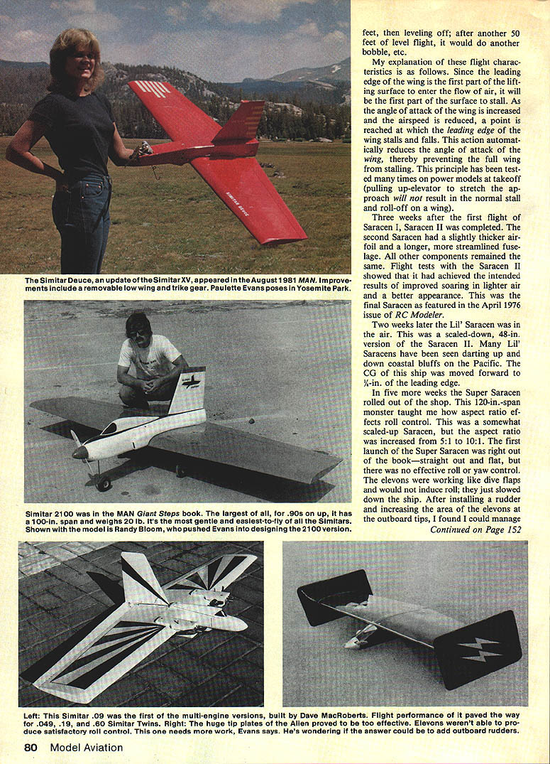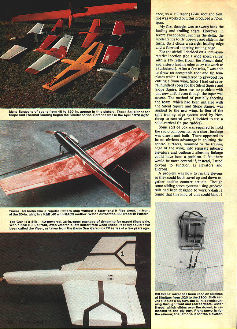 NO OCR TEXT NO OCR TEXT ance 12 taper 12-in root 6-in tip worked out produced 72-in span first thought sweep back leading trailing edges However severe sweepbacks such delta model tends fly nose-up slide turns So chose straight leading edge forward tapering trailing edge airfoil decided semi-sym metrical section wide speed range 1% reflex French data steep leading edge entry work turbulator After few tries able draw acceptable root tip tem plates transferred plywood cutting foam wing Since cut seve ral hundred cores Silent Squire Slope Squire no problem new airfoil though taper severe method partially sheeting foam initiated Silent Squire Slope Squire applied new wing lieu split trailing edge system used Nor throp control yaw decided use solid vertical fin no rudder Some sort box required hold radio components short fuselage drawn built appeared no obvious advantage splitting control surfaces mounted trailing edge wing separate inboard elevators outboard ailerons linkage could have problem felt would control instead used elevons function elevators ailerons problem rig elevons could both travel up down gether and/or counter actuate Though some sliding servo systems using grooved rails designed work V-tails found kind unit could bind Saracens spans 48 120 appear picture Sailpianes Slope Thermal Soaring began Simitar series Saracen April 1976 RCM Tracer 40 looks like regular Pattern ship staband flies great front 50-in wing isa K&B 40 MACS muffler Watch out 60 Tracer Pattern Top Gun 4-lb 40-powered 36-in-span package dynamite expert fliers K&B 65 up front veteran pilots suffer weak knees easily could have called Viper taken Battle Star Galactica TV series few years ago Bill Evans mixer has used sizes Simitars 020 2100 Both ser vos slide ply tray 1/o-ln dowels run ning through front rear formers Outer Nyrod slides over dowel ce mented ply tray Right servo aileron left elevator designed sliding tray system using Nyrod tubing A-in dowel eliminate possibility binding final product became Saracen moment truth hand stood holding Saracen position first launch moderate wind pushing up slope signaled good lift Saracen eased space During first 25 feet traveled felt succeeded flew went out control fell brush below What wrong Maybe wouldnt fly Truth matter Sara cen performed like tail-heavy ship set center gravity CG forward normal 30% far enough So added nose weight until ship balanced 1 behind leading edge computes 10% root chord about 14% average chord After CG adjustment check air frame operation radio control surfaces Saracen again pushed off slope What differ ence What pleasure excellent roll control good pitch stability few easy turns Saracen above hill flying like other good Slope Soaring machine just looking different Successive flights involved observing flight characteristics making movies studying afterwards reached several conclusions First flying wing model use practical Control response fast Turns tight could keep front about 30 feet out hill space no 50 feet left right better other ship slope real plus fact Saracen would stall Gradually feeding up-elevator holding full up would result gen tle bobble nose up down fol lowed nosing down about three Du-Bro Mixer also works well control elevons Top receiver next ele vator servo Aileron servo arms attached elevons Installed Simitar 540 author Centron June 1979 RC Sportsman 6O-ln-span Slope Soarer first designs anhedral Looks like bird prey flight Tnuonu ot mu tirum puwuruu nturu u~uuruu mu Aviauon ana leading plans seller several years picture graced ma ouvur Tanya Herbert poses Bugs Ear tiniest Simitars March 1982 ModelAirplane News Specs O2Oengine 11 oz 24-in span Quick loops turns rolls feet leveling off after another 50 feet level flight would another bobble etc explanation flight charac teristics follows Since leading edge wing first part lift ing surface enter flow air will first part surface stall As angle attack wing increased airspeed reduced point reached leading edge wing stalls falls action automat ically reduces angle attack wing thereby preventing full wing stalling principle has test ed times power models takeoff pulling up-elevator stretch ap proach will result normal stall roll-off wing Three weeks after first flight Saracen Saracen II completed second Saracen slightly thicker air foil longer streamlined fuse lage other components remained same Flight tests Saracen II showed achieved intended results improved soaring lighter air better appearance final Saracen featured April 1976 issue RC Modeler Two weeks later Lil Saracen air scaled-down 48-in version Saracen II Lil Saracens have seen darting up down coastal bluffs Pacific CG ship moved forward A-in leading edge five weeks Super Saracen rolled out shop 120-in-span monster taught aspect ratio ef fects roll control somewhat scaled-up Saracen aspect ratio increased 51 101 first launch Super Saracen right out bookstraight out flat no effective roll yaw control elevons working like dive flaps would induce roll just slowed down ship After installing rudder increasing area elevons outboard tips found could manage Continued Page 152 Left This Simitar 09 first multi-engine versions built Dave MacRoberts Flight performance paved way 049 19 60 Simitar Twins Right huge tip plates Alien proved too effective Elevons werent able pro duce satisfactory roll control needs work Evans says Hes wondering answer could add outboard rudders 80 Model Aviation neimiiar ueuce upuaiuuiina olmilarAY uppuaruu ininuugust 1 Oi IWAIV Improve ments include removable low wing trike gear Paulette Evans poses Yosemite Park Simltar 2100 MAN Giant Steps book largest 90s up has 1 00-in span weighs 20 lb Its gentle easiest-to-fly Simitars Shown model Randy Bloomwho pushed Evans designing 2100 version Bi L66gec Scaajo Coupon Worth 5OO OFF Any order $3000 PLAN N PATTERN SETS See ads listings Send $100 refundable brochure over 30 Plan N Pattern Sets WE Technical Services PO Box 76884-A Atlanta Georgia 30328 tion deve