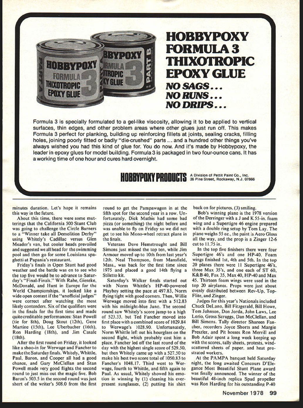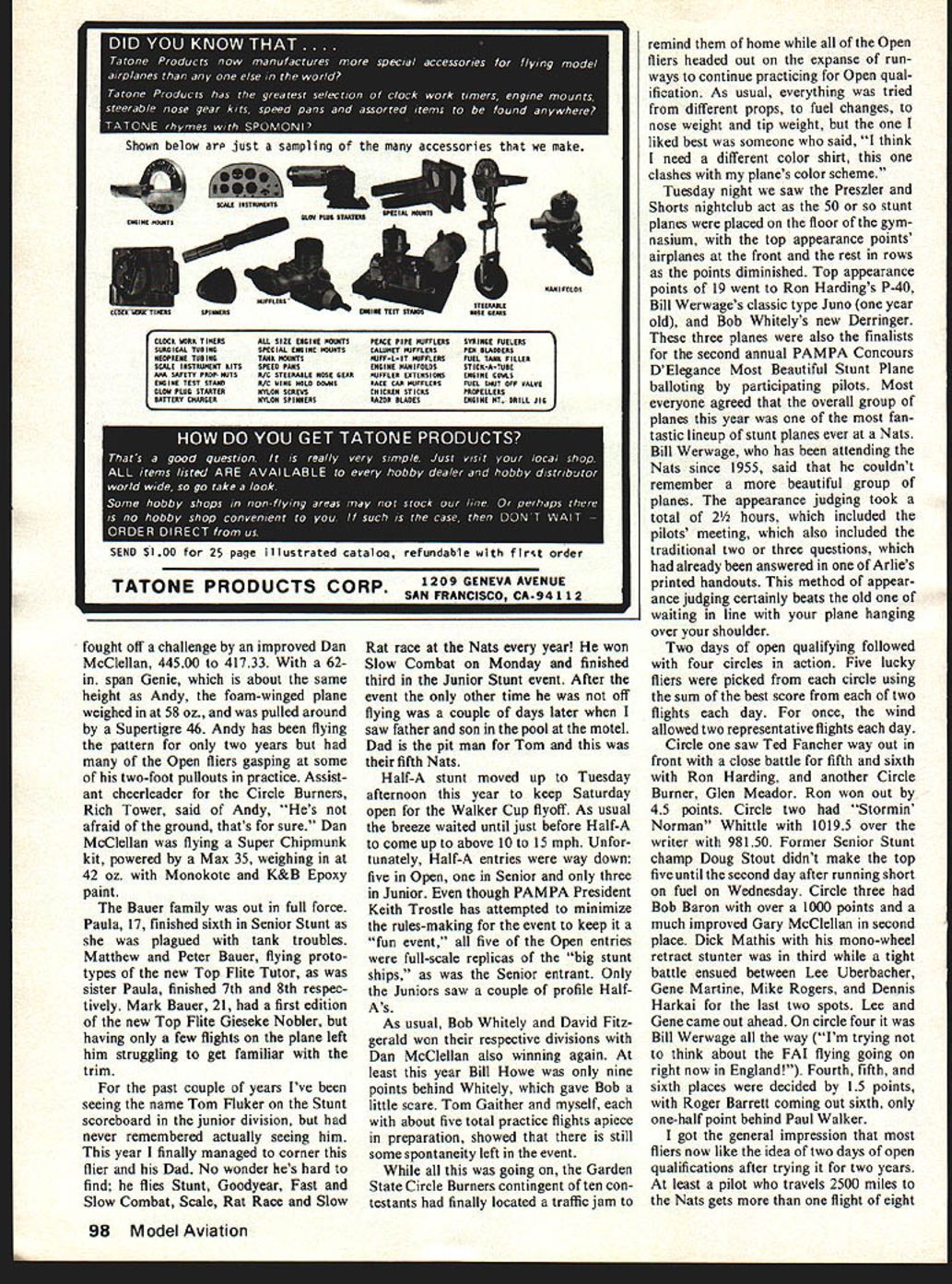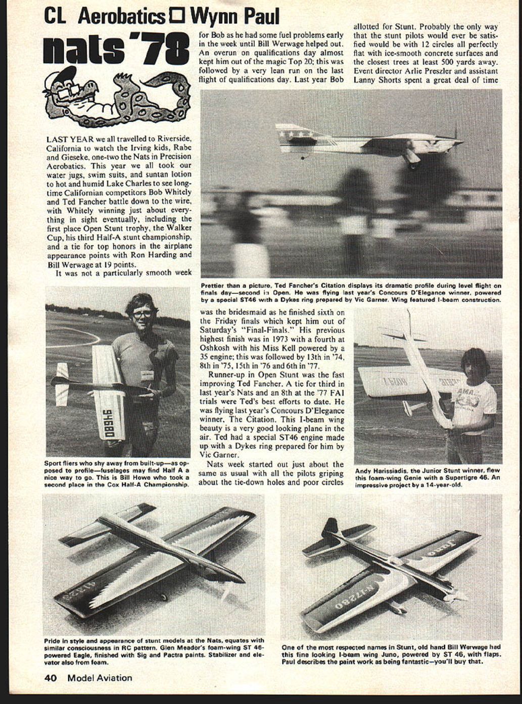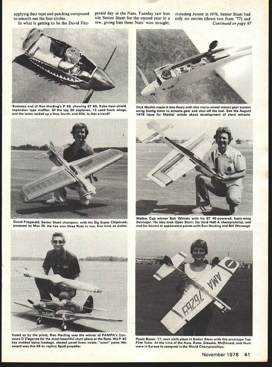CL Aerobatics 0 Wynn Paul Nfor Bob some fuel problems early week until Bill Werwage helped out An overun qualifications day almost kept him out magic Top 20 followed very lean run last flight qualifications day Last year Bob LAST YEAR travelled Riverside California watch Irving kids Rabe Gieseke one-two Nats Precision Aerobatics year took water jugs swim suits suntan lotion hot humid Lake Charles see long time Californian competitors Bob Whitely Ted Fancher battle down wire Whitely winning just about thing sight eventually including first place Open Stunt trophy Walker Cup third Half-A stunt championship tie top honors airplane appearance points Ron Harding Bill Werwage 19 points particularly smooth week bridesmaid finished sixth Friday finals kept him out Saturdays Final-Finals previous highest finish 1973 fourth Oshkosh Miss Kell powered 35 engine followed 13th 74 8th 75 15th 76 6th 77 Runner-up Open Stunt fast improving Ted Fancher tie third last years Nats 8th 77 FAT trials Teds best efforts date flying last years Concours DElegance winner Citation I-beam wing beauty very good looking plane air Ted special 5T46 engine made up Dykes ring prepared him Vic Garner Nats week started out just about same usual pilots griping about tie-down holes poor circles allotted Stunt Probably way stunt pilots would ever satis fied would 12 circles perfectly flat ice-smooth concrete surfaces closest trees least 500 yards away Event director Arlie Preszler assistant Lanny Shorts spent great deal time 40 Model Aviation Prettier picture Ted Fanchers Citation displays its dramatic profile during level flight finals daysecond [i Open flying last years Concours DElegance winner powered special 5T46 Dykes ring prepared Vic Garner Wing featured I-beam construction Sport fliers shy away built-upat tp posed profilefuselages may find Half nice way go Bill Howe took second place Cox Half-A Championship Andy ilarissleals junior Stuni winner flew foam-wing Genie Supertigre 46 An impressive project 14-year-old rrioe smyic anti appuaranca ui stunt ruuuuus urn quarn nuts similar consciousness RC pattern Glen Meadors foam-wing ST 46powered Eagle finished Sig Pactra paints Stabilizer ele vator also foam respected names Stunt old hand Bill Werwage fine looking I-beam wing Juno powered ST 46 flaps Paul describes paint work being fantasticyoull buy applying duct tape patching compound smooth out four circles what getting David Fitz gerald day Nats Tuesday saw him including Junior 1976 Senior Stunt win Senior Stunt second year six entries down two 77 row giving him three Nats wins straight Continued page 97 Walker Cup winner Bob Whitely ST 46-powered foam-wing Derringer also took Open Stunt third Half-A championship tied honors appearance points Ron Harding Bill Werwage Paula Bauer 17 won sixth place Senior Stunt prototype Top Flue Tutor time Nats Rabe Gieseke McDonald Hunt Europe compete World Championships November1978 41 Business end Ron Hardings P-40 showing ST 60 Rabe heat shield expansion type muffler top 20 airplanes 13 used foam wings latter racked up first fourth fifth trend Dick Mathis made finals mono-wheel retract gear system using Seelig timer actuate gear shut off fuel See August 1978 issue Mathis article about development stunt retracts David Fitzgerald Senior Stunt champion Sig Super Chipmunk powered Max 35 has won three Nats row first time Junior Voted pilots Ron Harding winner PAMPAs Con cours DElegance beautiful stunt plane Nats P-40 has molded balsa fuselage shaded panel lines rivets worn paint award 48-in replica Spad propeller Y2A SPORT-SCALE FOR 2 AND 3 CHANNEL R/C SYSTEMS Great trainer capability rb sport performance KIT No 1501ognnd Sam itlor,beg CESSILA 178* beautiful scale model espe cially designed RIG beginner still interest advanced modeler Very stable flight speeds quickly compensates beginner flying errors controls returned neutral Vacuum formed cowl shaped piece spring aluminum landing gear wood plywood used stress areas TECHNICAL DATA Scale 1 1/a Wing span 45 1143cm area 270 sq th 32 8128cm Wing loading 12 oz per sq ft ht 24 oz RIC equipment ne 049 051 IT No1502 kibmem Urulsemainier different low-wing scale model offered other kit manufacturers Like Cessna 170 has forgiving na ture valuable novice flyers will also satisfy average R/O pro its smooth flight handling characteristics Kit contents include vacuum formed cowl windshield plus hardwood plywood beef up construction required TECHNICAL DATA Scale 1 /a 1 0 e Wing span 42 10859 cm area 252 sq th 28 7303 cm loading 12/2 oz per sq ft ht 24 oz RCequipment Engine 049to 051 Kits Contain motors wheels R/C equipment Both models built easy Guillow way r concise planwork usely illustrated building assembly instructions rustrating guesswork See yoor local Hobby Dealer br Goillom kits k Veilow Pages ander HOBBiES Send 25c br compiete kit listing middle next year Horizon helicopter should available Precision Built Helicopters Houston Texas Prototypes flown Joe Pasztos Kirt Krest Helmut Holder first-place Expert winner Hubert Bitner Horizon rugged machine Joe having best luck engine failure put machine about hundred feet opportunity help repair bird can vouch rugged construction excellent serviceability Attractive design simplicity will make Hori zon desirable addition helipad NRCHA years AMA NATS Dale Willoughby arrived poll present helicopter event regarding interest resurrecting NRCHA Dale also offered assistance initiating resurrection Most us wanted NRCHA continue active effort made after contest good news arrived recently Don Chapman Radio Control Modeler magazine reported September issue Walter Knaus Ontario Canada taking positive action bring NRCHA life again havent seen Dons column try get contact Walter Knaus 82 Eldorado Ave London tario Canada N5W155 interest NRCHA prove write Walter today wasnt room write names involved success AMA Helicopter NATS would like thank Jim Osbourne CD Bo Hinch Assistant CD judges helping collect info asked Also