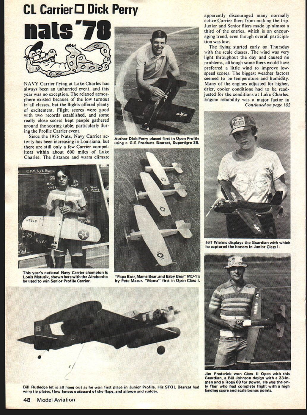 CL CarrierO Dick Perry -73 S NAVY Carrier flying Lake Charles has always unhurried event year no exception relaxed atmos phere existed because low turnout classes flights offered plenty excitement Flight scores good two records established some really close scores kept people gathered around scoring table particularly dur ing Profile Carrier event Since 1975 Nats Navy Carrier ac tivity has increasing Louisiana still few Carrier compet itors within about 600 miles Lake Charles distance warm climate Bill Rutledge let hang Out won first place Junior Profile STOL Bearcat wing tip plates flow fences outboard flaps aileron rudder 48 Model Aviation apparently discouraged normally active Carrier fliers making trip Junior Senior fliers made up almost third entries encour aging trend though overall participa tion low flying started early Thursday scale classes wind very light throughout day caused no problems although some fliers would have preferred little wind improve lowspeed scores biggest weather factors seemed temperature humidity engines adjusted higher drier cooler conditions read justed conditions Lake Charles Engine reliability major factor Continued page 102 Author Dick Perry placed first Open Profile using G-S Products Bearcat Supertigre 35 years national Navy Carrier champion Louis Matusik shown herewith Airabonita used win Senior Profile Carrier Jeff Wielms displays Guardian captured honors Junior Class Papa BearMama Bearand Baby Bear MO-is Pete Mazur Mama first Open Class Jim Frederick won Class II Open Guardian Bill Johnson design 33-in span Rossi 60 power ly flier complete flight high landing score scale bonus points GIANT T7 Scale VINTAGE WHEELS PILOTGOLDEN AGE WHEELS Typical wheels usedEnhance realism ofDisc-type wheels during World War andyour giant model thiswere used extensively through mid 1 930seasy-to-paint pilot moldedthe late 1 920s through Semi-pneumatic tires andfrom high-impact styrenethe 1930s Semi-pneumat brass-bushed wheels 6%Separate goggles in-ic tires brass-bushed diameter $1795 prcluded 4 tall $295wheels 6 diameter $1795 pr OTHER SIZES GNOME ENGINE CYLINDERS Gnome ratory engine among WHEELS AND PILOTS famous powerplants World War era Now ALSO AVAILABLE can make 1/4 size reproductions easily 181 PAWNEE STREET SAN MARCOS CALIPORNIA detailed high-impact styrene cylinders Approximately 3 tall$195 veer deoler wont supply orde direct adding 15% postage nod handling AIJ'wJSend 5O illestroted catalogDEPT MA 92069 semi-scale plane Stan Powell pre sented Roger Barrett Highest Placing Rookie Award finished tie eighth place first Nats Al though actual Walker trophy case time lost transit Dallas conclusion banquet came Smilin Bob Whitely presented first place Open trophy keys trophy case containing Walker Trophy Nats/Shew continued page 43 Snake using HP4ORRs power Editor Article plan Snake appeared June 1977 issue use 5-oz tank swing Bartels prop humidity Lake Charles didnt bother bitIts just like home Equipment-wise looks like several engines capable being competitive right hands Out top five first second HP4ORRs third K&B405 fourth went K&B65 Max 405R finished fifth have poten tial trick extract enough power go fast slipping self destruct mode anatomy winning flight Proto 185 seconds airspeed 122-124 seconds pit times 250/252/255 seconds race time 451 Senior Rat John Wolf Chris Busby terrific finalboth turned Open class times John teamed up Steve Rece won K&B65powered Swamp Rat Theyve flying together about three years dis played some smoothst team work attheNats juniors flying profile rats much surprise least contestant showed up processing pan rat race time converted profile just wasnt enough time get sorted out Tom Fluker won ST G21-40-powered Quickie Rat Toby Busby took time out skateboarding give Tom run money flying Max 405R-powered pro file patterned after Nashville fast rat Slow Rat Senior Slow Rat run off day before Open promised pre view better things come Nash ville Rats have completely dominated event past three years body country out beat potential challengers year Miller/Hoffman team Larry Hoffman senior put super race record what looked unbeatable time 5432 sat back see what Chris Busby could Chris broke prop first pit withdrew later flew traffic another competitor showed Texas boys still fly Slow Rat Nashville Needless say turn events precipitated flurry activity practice circles evening Junior Slow Rat Bob Tony Smedly won Tune/Hill OS Max Bob Cat design using Glass werks 8X7 rat prop burning 10% nitro fuel OS behaved perfectly giving four-flip race last minute effort extract available rpm took its toll number Open class teams including Miller/Hoff man blew connecting rod best K&B58 Harris family developed swelled piston Max Several others just couldnt get equip ment perform time Open quali fying got underway field reduced 18 Paul Tune Larry Hill Marshall Busby better known Nashville Rats wasted no time establishing superi ority qualified 1 2 3 six virtu ally identical 70-lap heats 240s finals same storyconsistent 10-second pit stops 120 mph air speed slowest heat sub 540 claim capable getting 520s flying foam wing ver sion Nashville Rat design powered Tune/Hill OS Max engines swing ing Glasswerks 9X7 Slow Rat props prop worked up give 18500-19000 rpm ground used chickenhopper tank set-up mechanical fast fill valve main tank streamlined faired leading edge inboard wing chicken hopper small rectangular tank located directly behind venturi Flexible fuel line connects main tank chicken-hopper houses uniflow vent fuel pickup line Plans Nashville Rat engines spare parts available Tune/ Hill Racing Engines Box 706 Franklin TN 37064 anatomy winning flight Proto 210 seconds lap times 148/150/ 150 seconds pit times 247/247/243 seconds race time 53375 Class II Mouse Greater Houston Control Line Modelers Association spon sored Class II Mouse informal event Lake Charles Bill Lee organized officiated event little help other Houston area modelers Turn-out little disappo