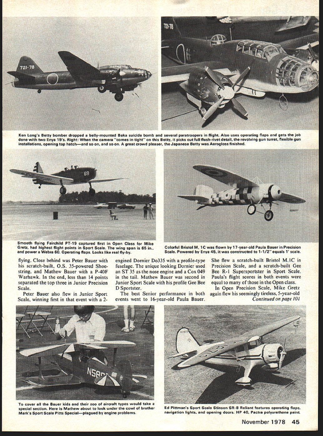 CL ScaleD Mike Gretz N 73 THE control-line scale events Lake Charles interesting combination old new familiar faces well-proven airplanes entered along several new faces fielding models hadnt seen before 17 entries almost evenly divided between Precision Scale Sport Scale As typical Jun ior Senior age contestants again ac counted over 40% total entries Generally quality variety matched NATS recent memory fly ing competition among skill ful varied have ever witnessed entries flew impressively smooth destroyed seriously damaged Scale activities start early week turn-in static judging of FF CL RC scale models display/judging area Wednesday static display visually overwhelming presents vivid presentation selected aviation history steady stream viewers admirers self-appointed judges attests popularity miniature replicas scale builders themselves typically congregate near display area throughout early part week comparing building notes mak ing excuses didnt get last little detail completed telling well model will fly time comes Inside display area judges have unenviable job deciding best did homework didnt add pre-flight excitement static scores revealed until models make official flight later week CL Scale flying activities took place Saturday weather wind ideal Thanks Chuck Dial crew atmosphere site re laxed professional Both Precision Sport Scale models flew intermixed off same circle no rigid flight order ready fly placed flight sheet bottom order scores tabulated posted quickly site provide blow-by-blow record unfolding competition hotly contested Junior class Tom Fluker came out top Precision Scale flying same F8F-2 Bearcat used win Junior Scale 76 Nationals Toms flight score best Junior gave him edge end 44 Model Aviation 93 Static points tops Sport Scale Jeffrey Perez took second Open 1/8-scale Piper Twin Commanche sharp-looking aircraft operating flaps powered pair 05 25s nat may oe iTTeI iower tue oackground Bob Balduss Spirit St Louis nostalgic nevertheless Note aileron setting Dave Falkenhegens OS 40-powered Clipped Wing liub Ia iiazei ig kit throttles down landing Smooth consistent Sport Scale Don Hollfelders 1-1/2 equals 1 Great Lakes Peter Bauers profile Sport Scale Dornier Do335 wait make official flights See text Dornier details tiny rear engine 3-blader prop 049 Ken Longs Betty bomber dropped belly-mounted Baka suicide bomb several paratroopers flight Also uses operating flaps gets job done two Enys 1 9s Right camera comes tight Betty picks out full flush-rivet detail revolving gun turret flexible gun installations opening top hatchand so great crowd pleaser Japanese Betty Aerogloss finished flying Close behind Peter Bauer scratch-built OS 35-powered Shoe string Mathew Bauer P-40F Warhawk end less 14 points separated top three Junior Precision Scale Peter Bauer also flew Junior Sport Scale winning first event 2engined Dornier Do335 profile-type fuselage unique looking Dornier used ST 35 nose engine Cox 049 tail Mathew Bauer second Junior Sport Scale profile Gee Bee D Sportster best Senior performance both events went 16-year-old Paula Bauer flew scratch-built Bristol MlC Precision Scale scratch-built Gee Bee R-l Supersportster Sport Scale Paulas flight scores both events equal Open class Open Precision Scale Mike Gretz again flew seemingly tireless 5-year-old Continued page 101 November1978 45 Smooth flying Fairchild PT-lB captured first Open Class Mike Gretz highest flight points Sport Scale wing span 65 in. power Webra 60 Operating flaps Looks like real fly-by Colorful Bristol M 1 C flown 17-year-old Paula Bauer Precision Scale Powered Enya 45 constructed 1-1/2 equals 1 scale cover Bauer kids zoo aircraft types would take special section Mathew about look under cowl brother Marks Sport Scale Pitts Specialplagued engine problems Ed Pittmans Sport Scale Stinson SR-S Reliant features operating flaps navigation lights opening doors HP 40 Pactra polyurethane paint Weve Got Lot SHOUT ABOUT elliptical surfaces also used left-hand TD 049 ran pressure conclusion think owe Linda Wheeler Vic Garner round ap plause job well done personal thanks Linda Vic running racing events lap counters timers helping make happen N ats/G retz continued page 45 Zlin 526 Akrobat Akrobat posted its third NATS win four years com bination highest static 405 flight 218 scores field equipped Webra 61 operating flaps retractable landing gear engine cut off operated electronically through standard two control lines second place Ken Longs Japanese Betty G4M2 bomber probably popular flight performer twinengined Betty launched belly-mounted Kamikaze dive bomber released three paratroopers left realistic smoke trail flight did smooth touch-and-go taxi maneuvers Ken says five differ ent kinds droppable stores can re leased bomb bay Betty full-size ship model 3/4 ale 63 span Enya 19s power weighs 5 pounds Don Hollfelders outstanding OS 25powered 40 span Great Lakes 2T-lA-2 SUPERSTAR OF STARTERS Sales zooming past 100000 starter thats turned whole world Has higher torque & RPMs heavy duty long life motor instant-on strip switch safety hand guard 2-year guarantee bested Jeff Perezs green white Piper Twin Commanche third point final round flying Also en tered Precision Scale Bob Balduss huge 60-powered Spirit St Louis model inspiring watch fly especially Bob piloting handles very realistically thing missing Lindys face leaning out window Spirit cruised around circle Open Sport Scale produced some very tight competition first three places static scores within five points other Jeff Perez Dave Falkenhagen Mike Gretz took battle flight line Last years NATS Sport Scale Champion Jeffrey Perez held high static score 93 super-looking Piper Twin Commanche Lest seem confusing Jeff actually two Twin Commanches painted identically Sport Scale Precision Close behind Falkenhagens Clipped Wing Cub Gretzs Fairchild PT-19 tied 88 static points PT-19 went up first posted 93 flight score re mained highest day set solidly top After two 